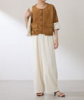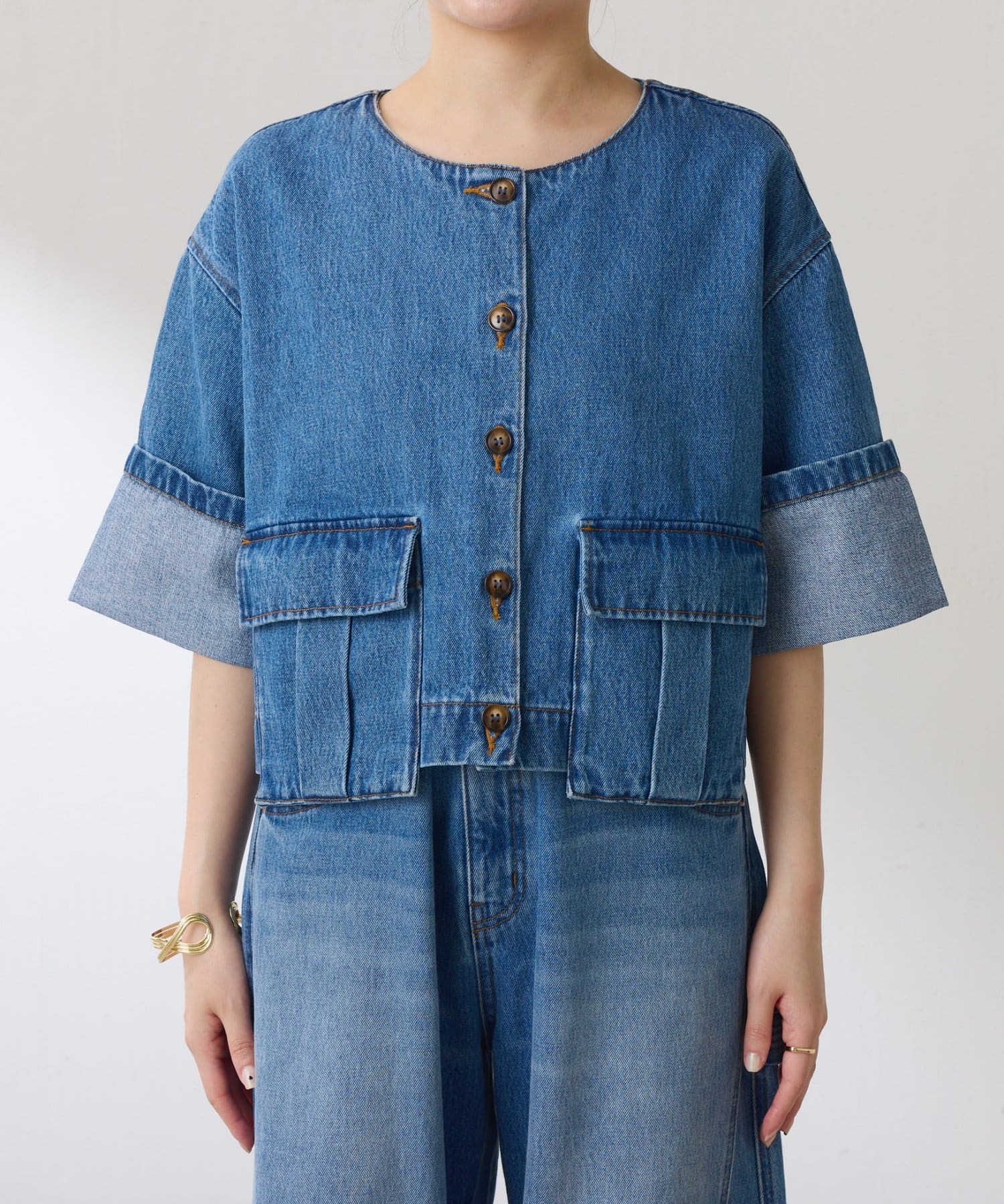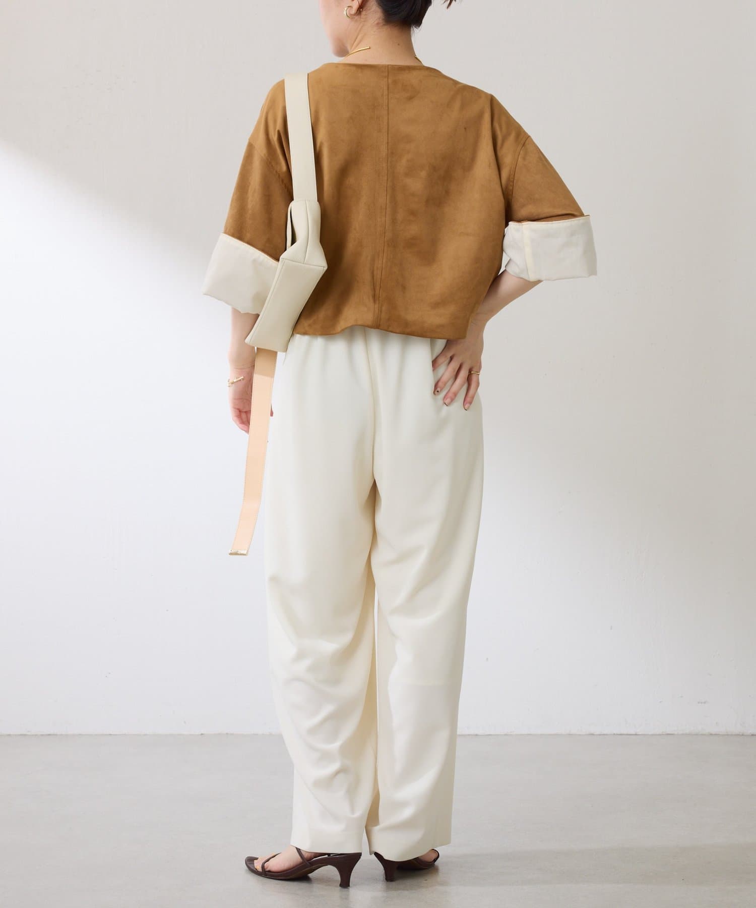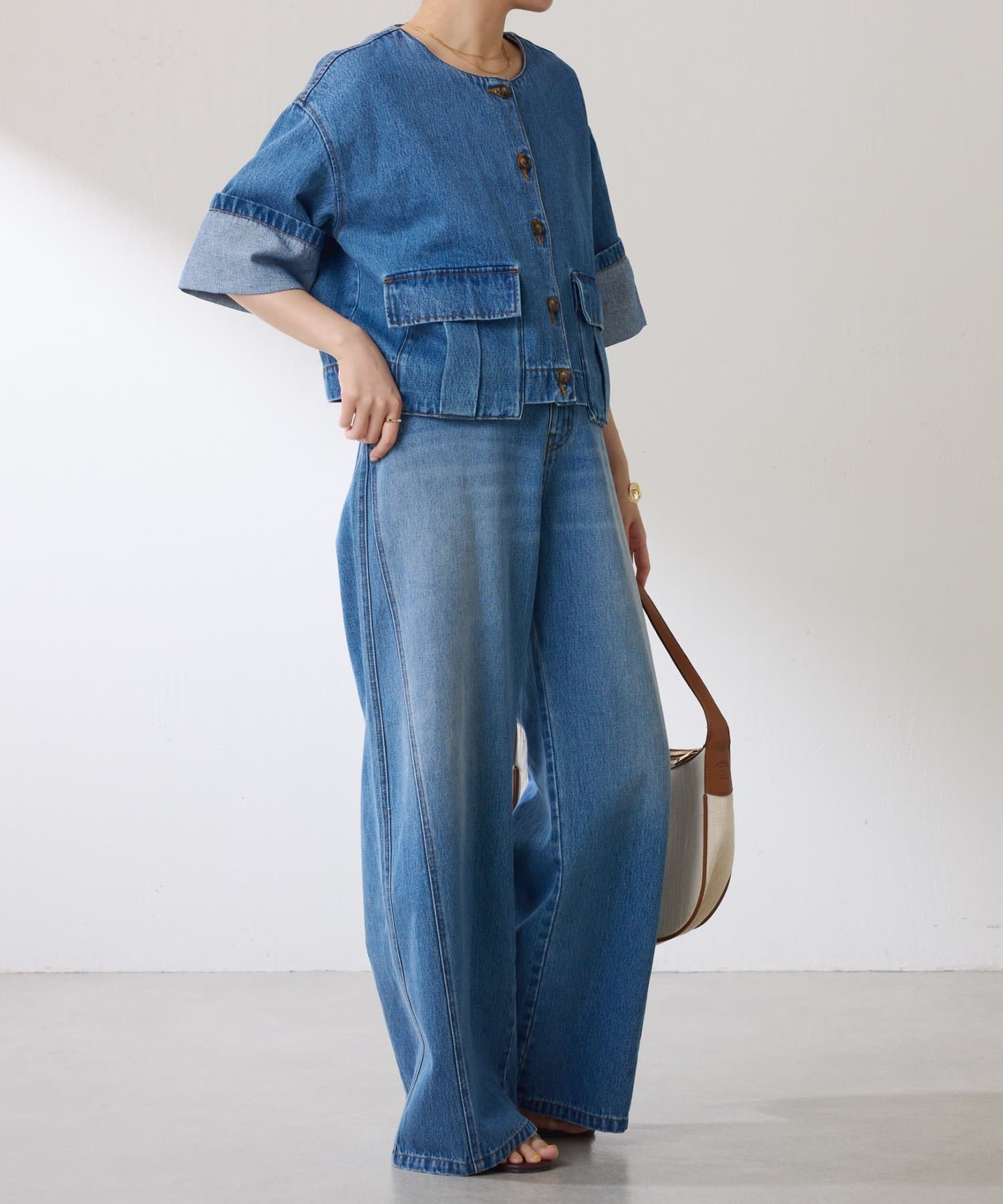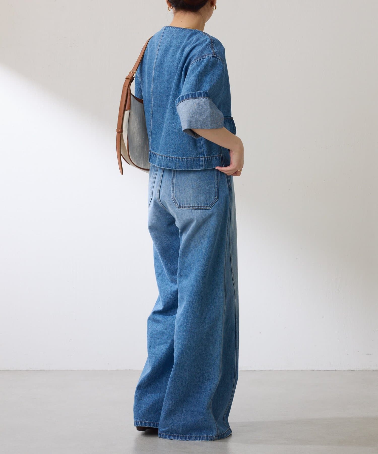ブラウンは、デニムとも相性抜群です。短丈なのでワイドパンツやワンピースとも相性が良いです。