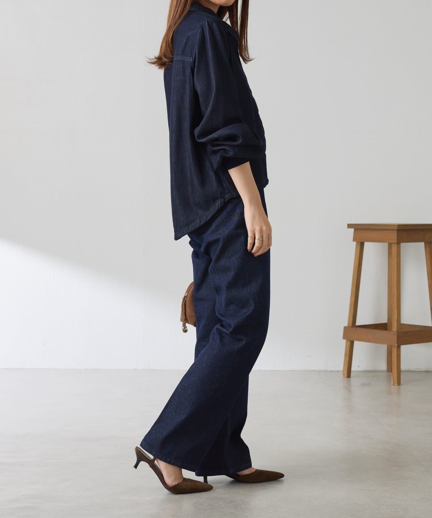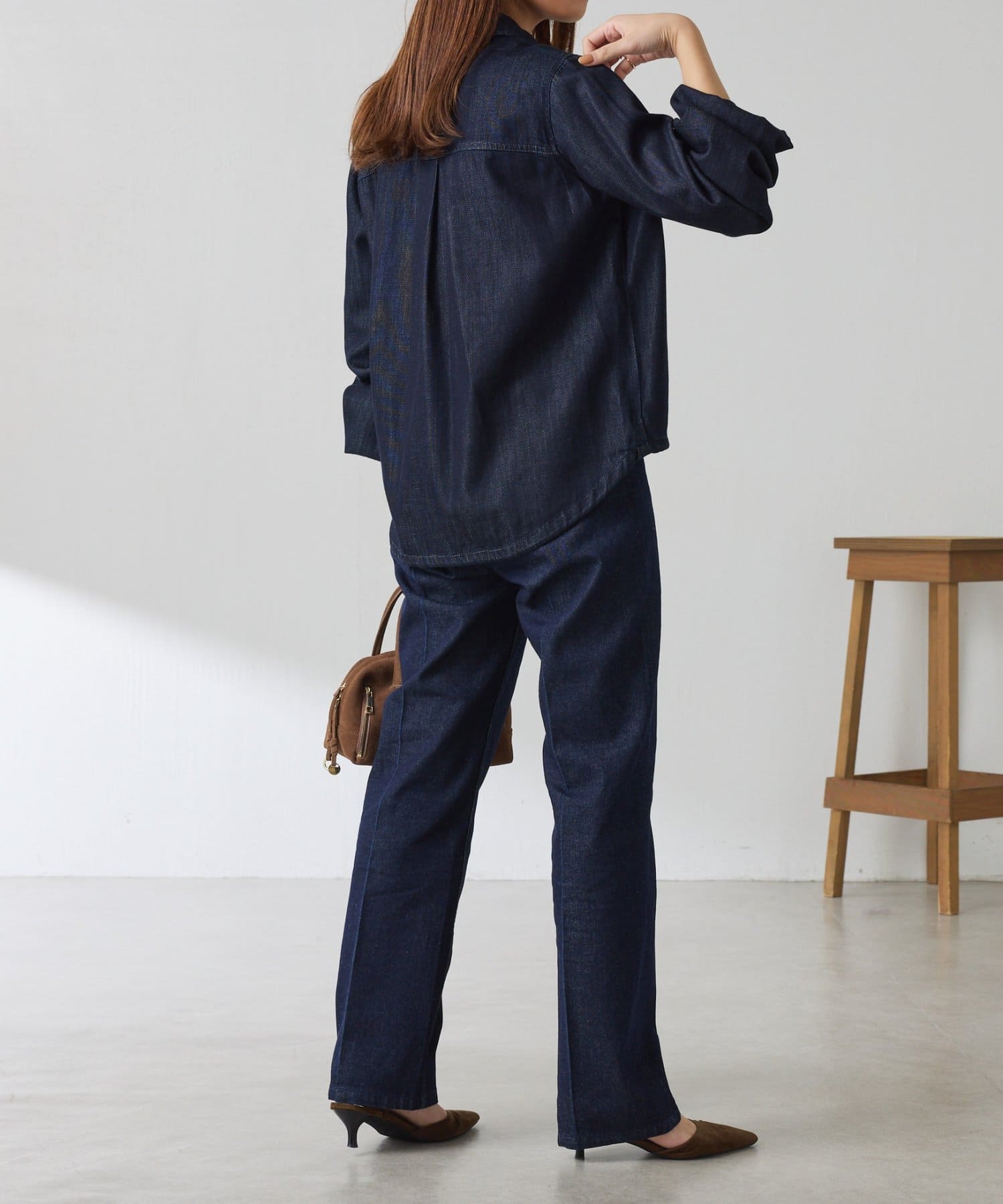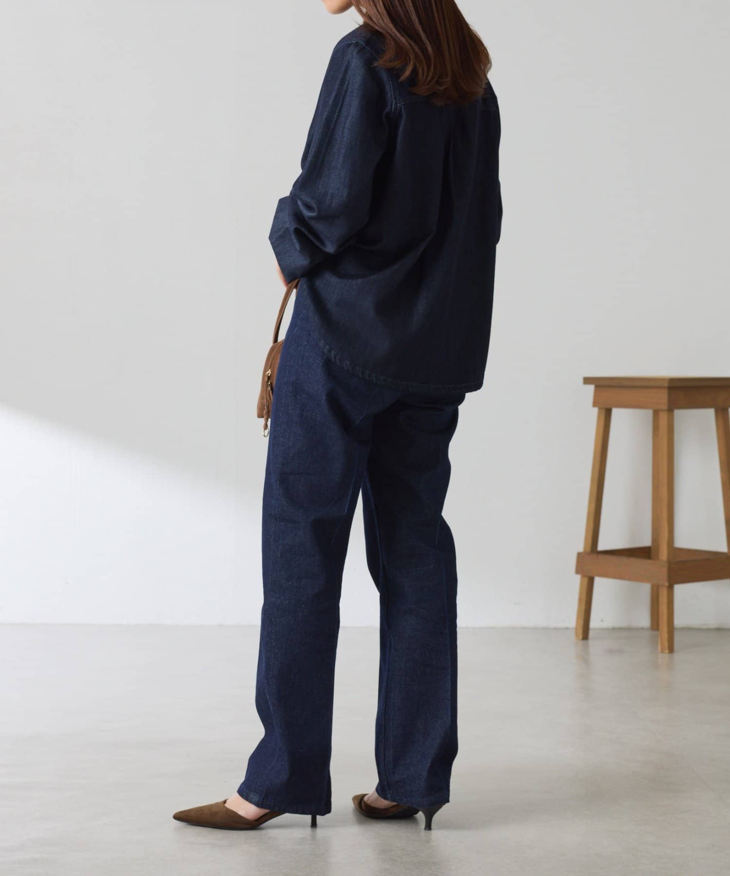 同色のデニムシャツを合わせたセットアップスタイルもおすすめです。