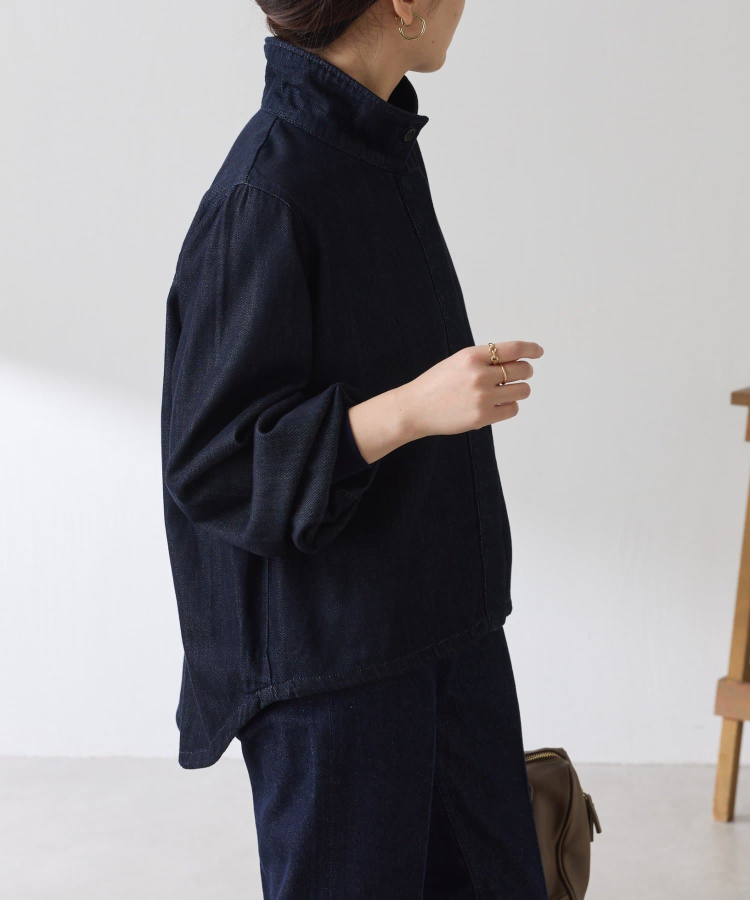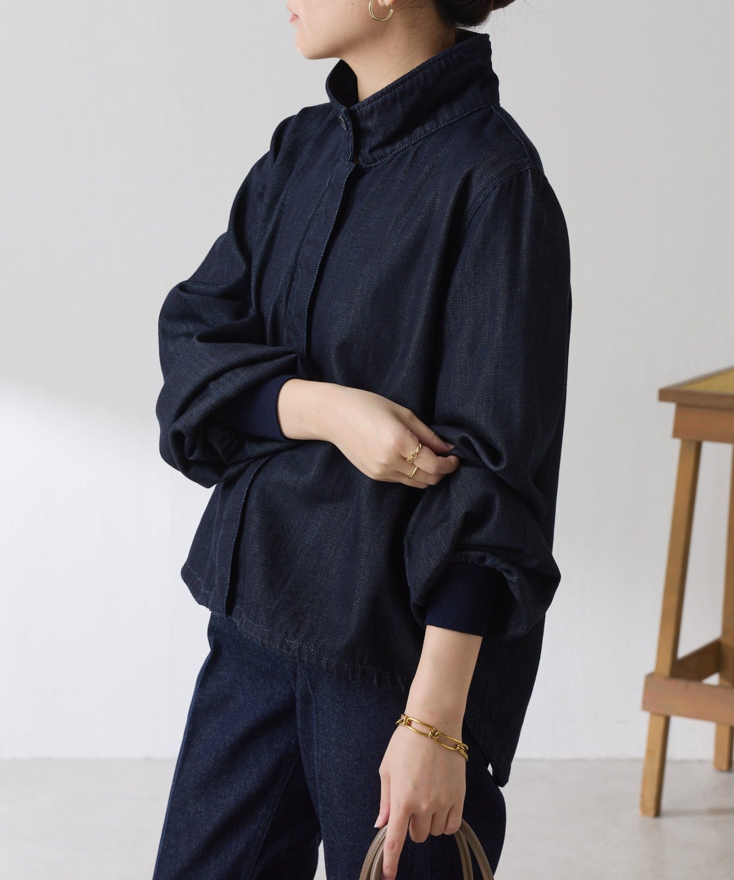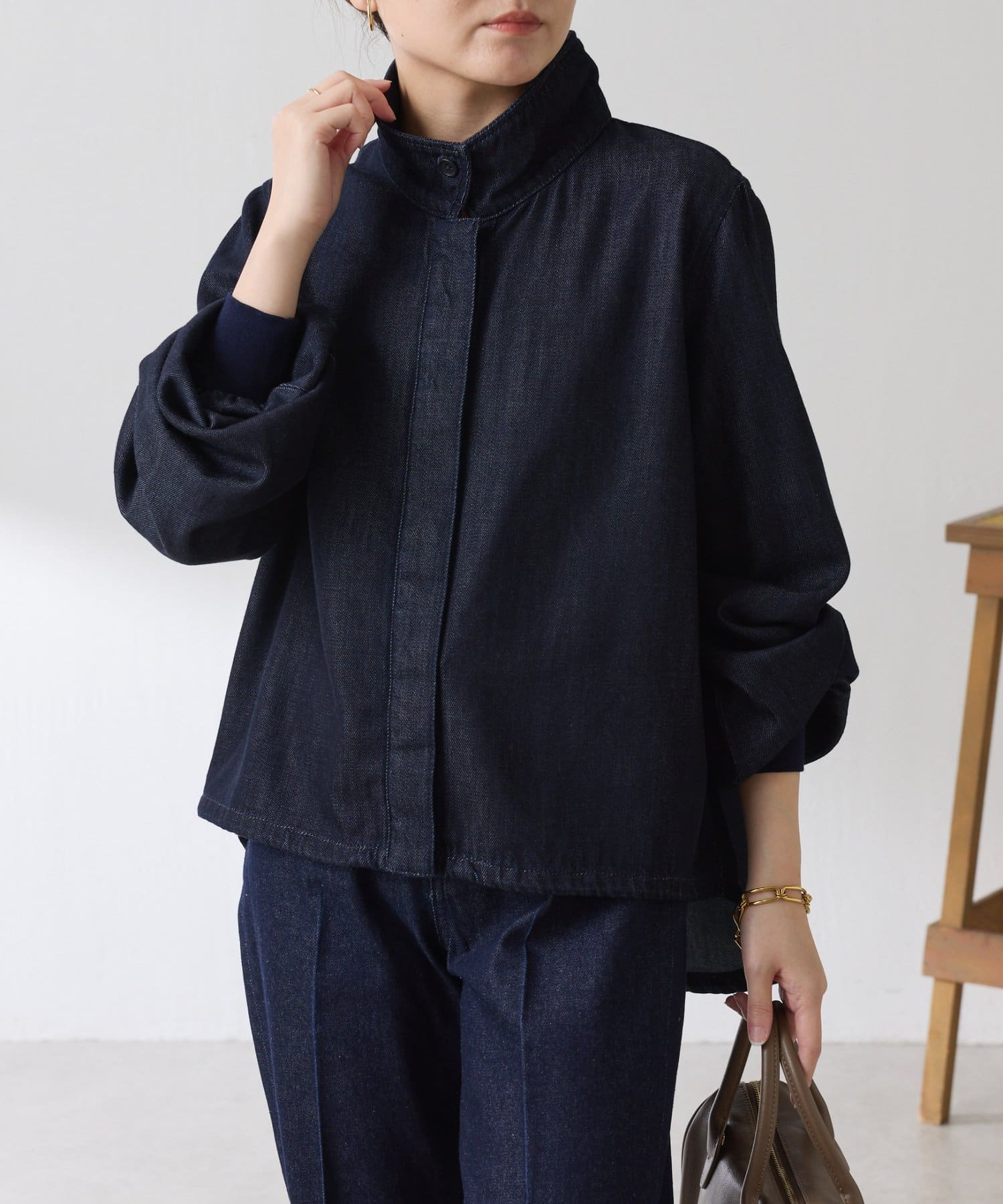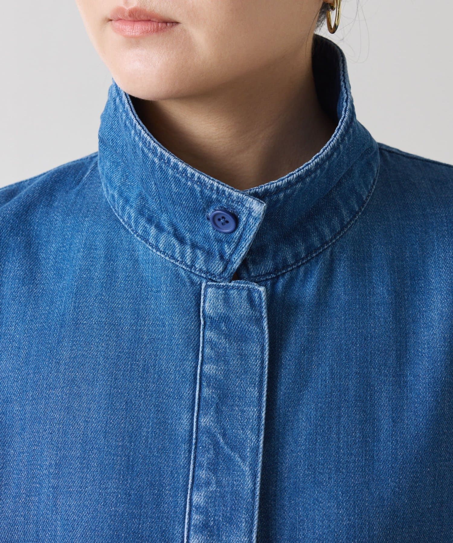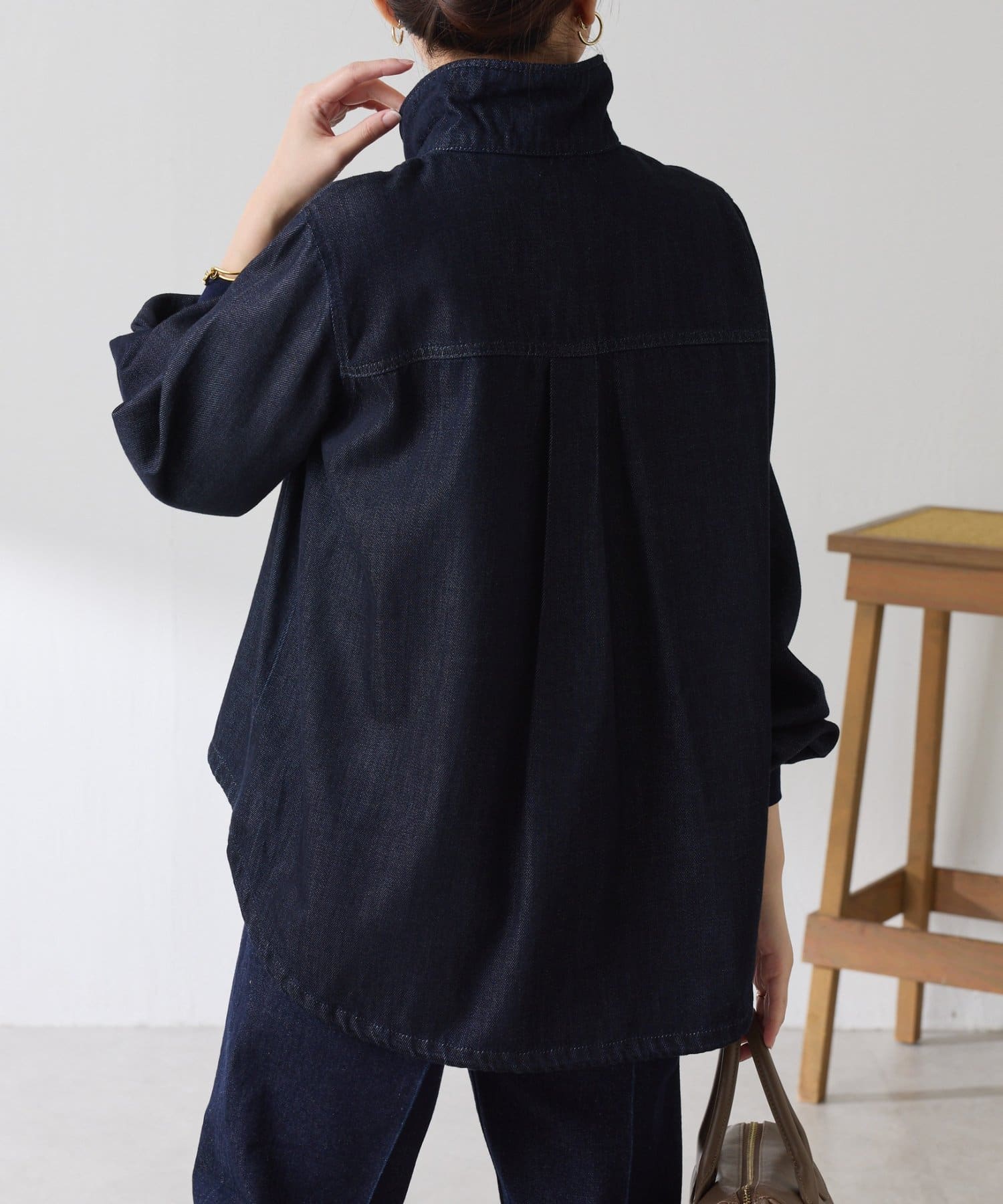 【アレンジを楽しめる】Q.anos ドロストスタンドカラーデニムシャツ