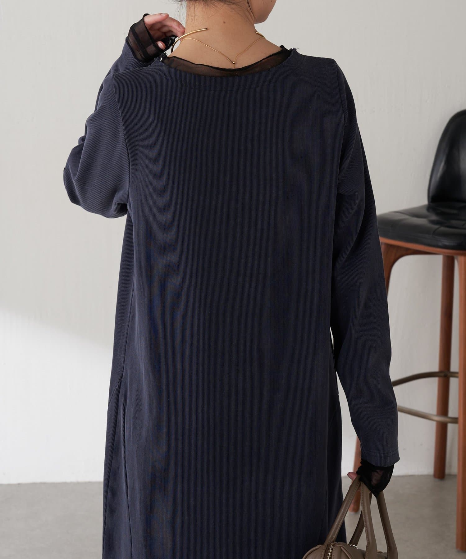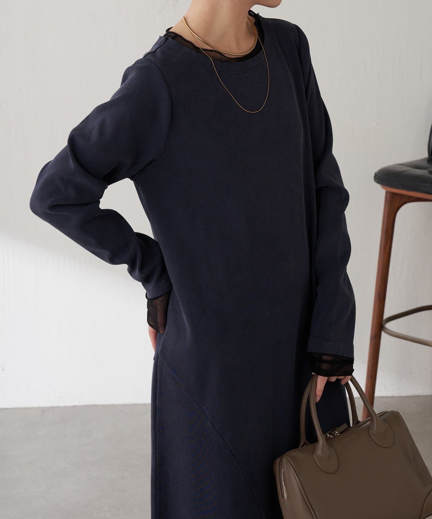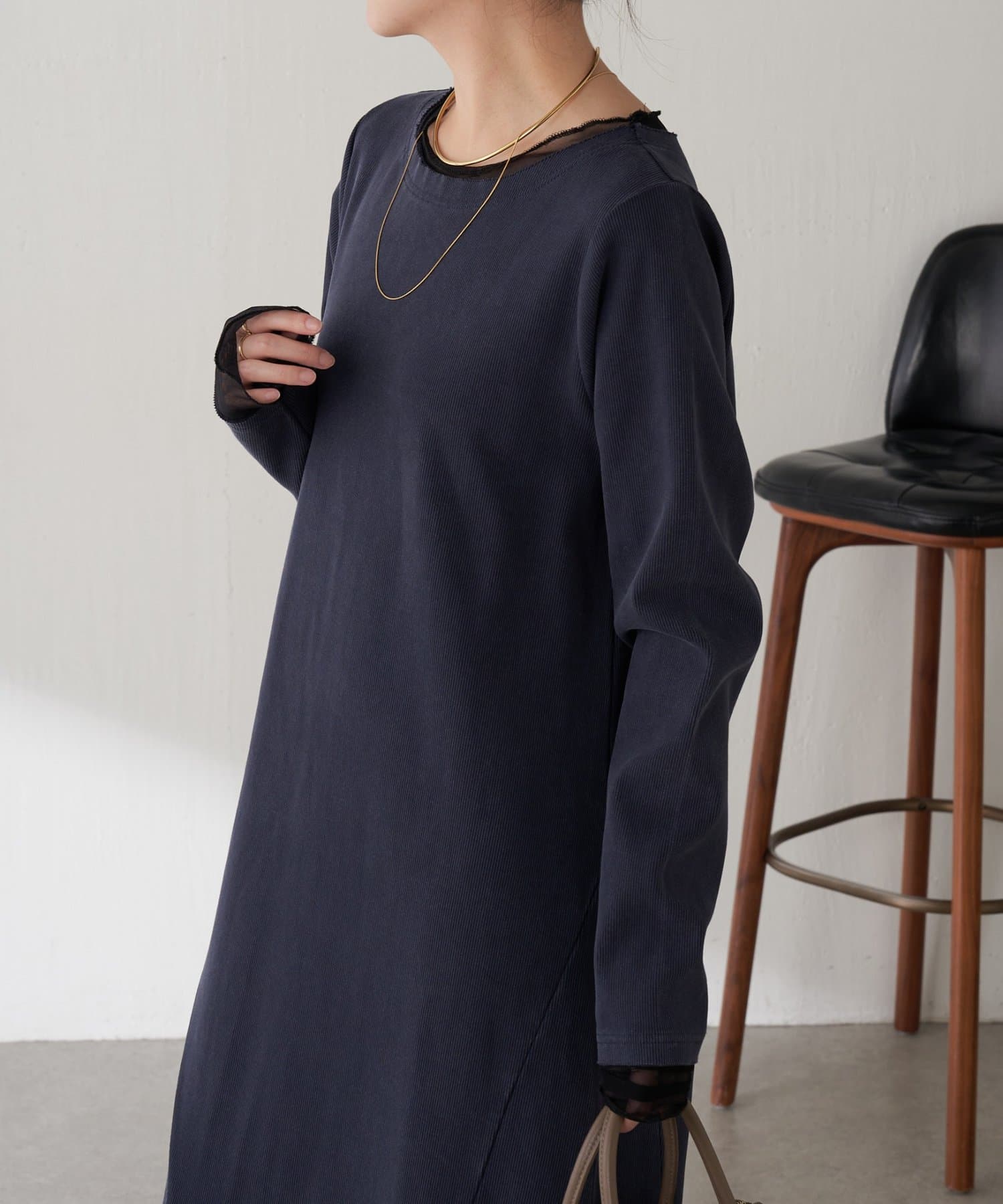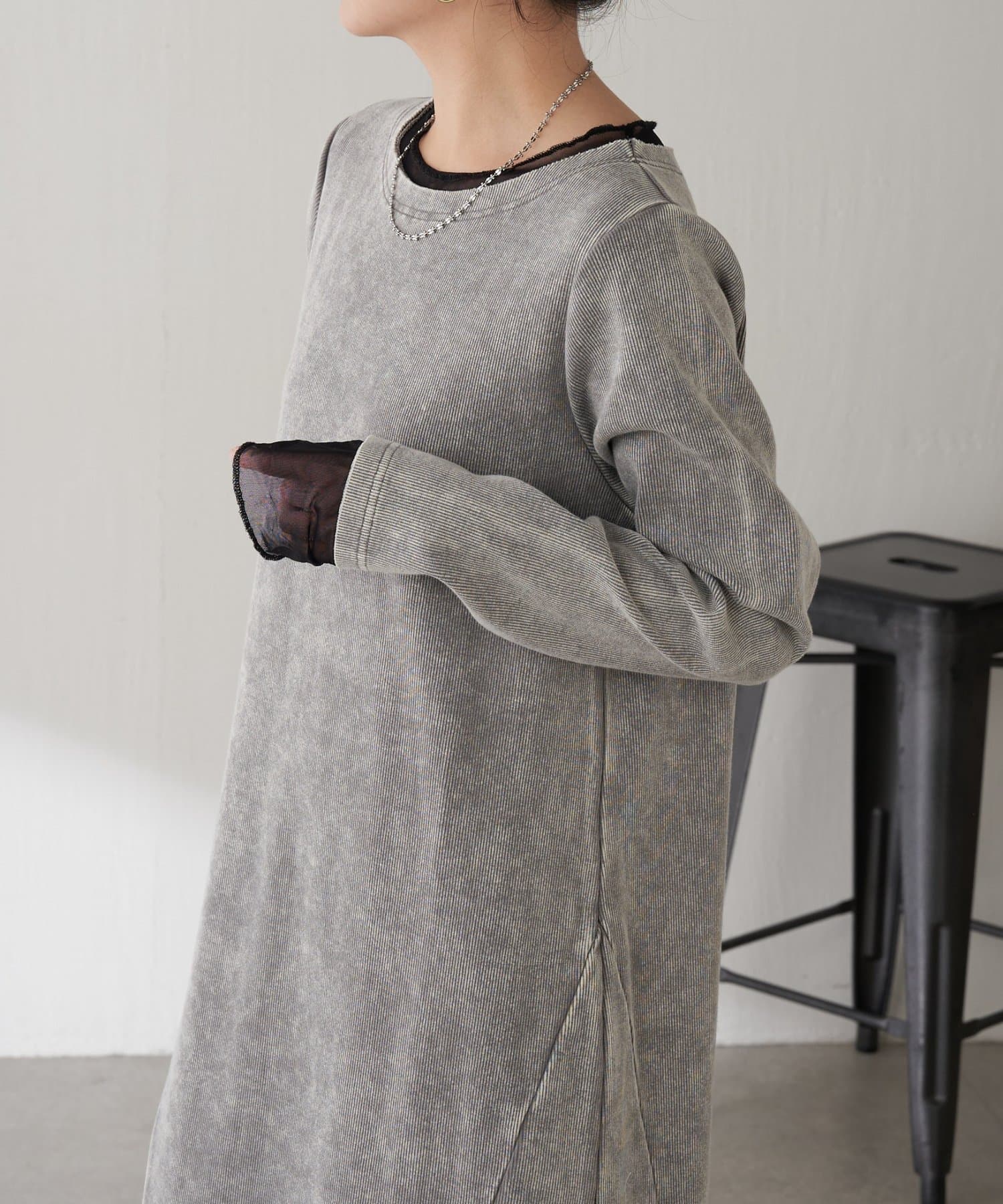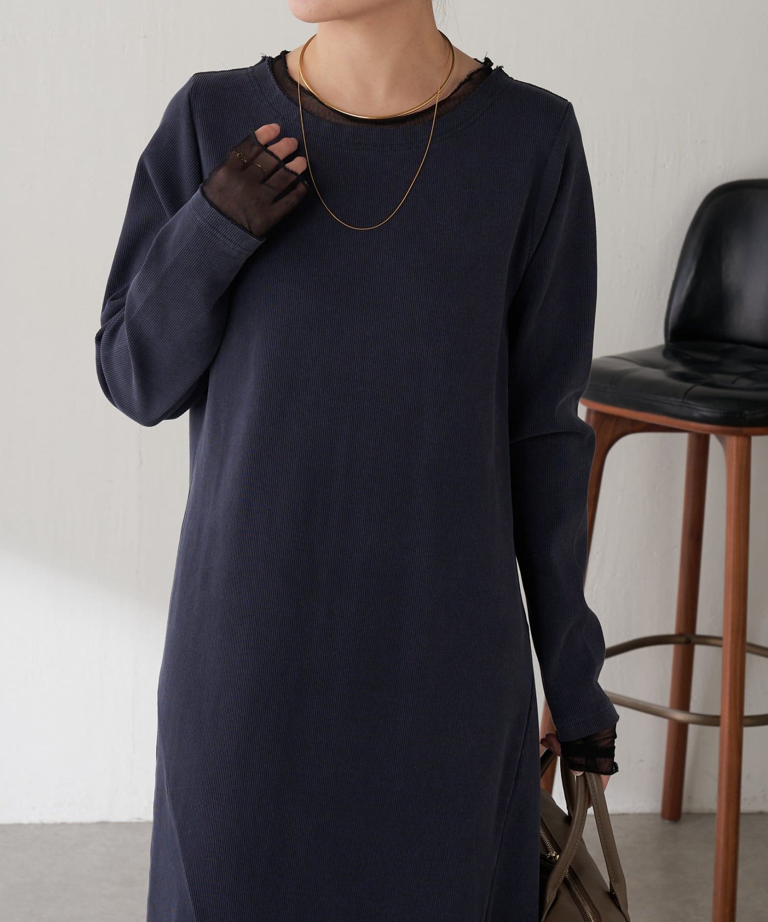・袖口と襟にチュールがレイヤードしているようなデザインで1枚でも気映える楽ちんワンピース。