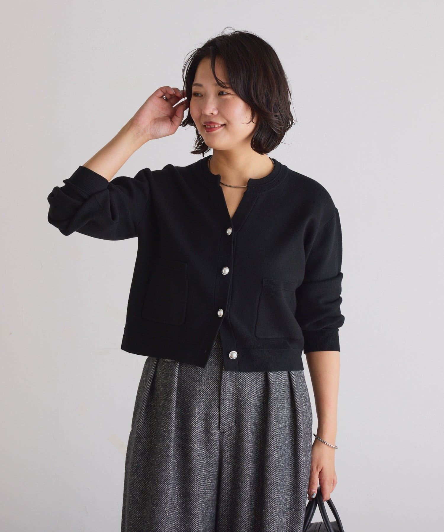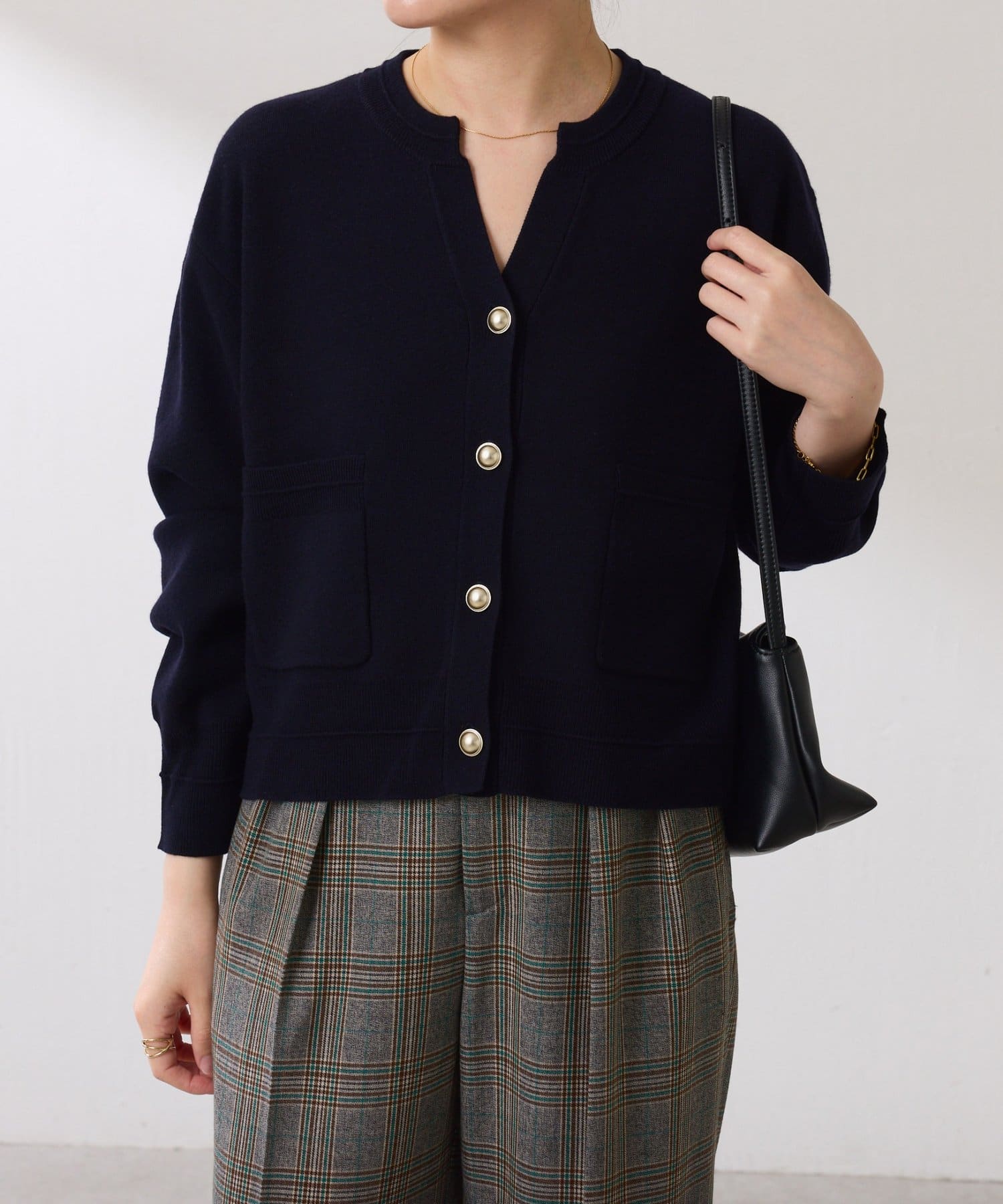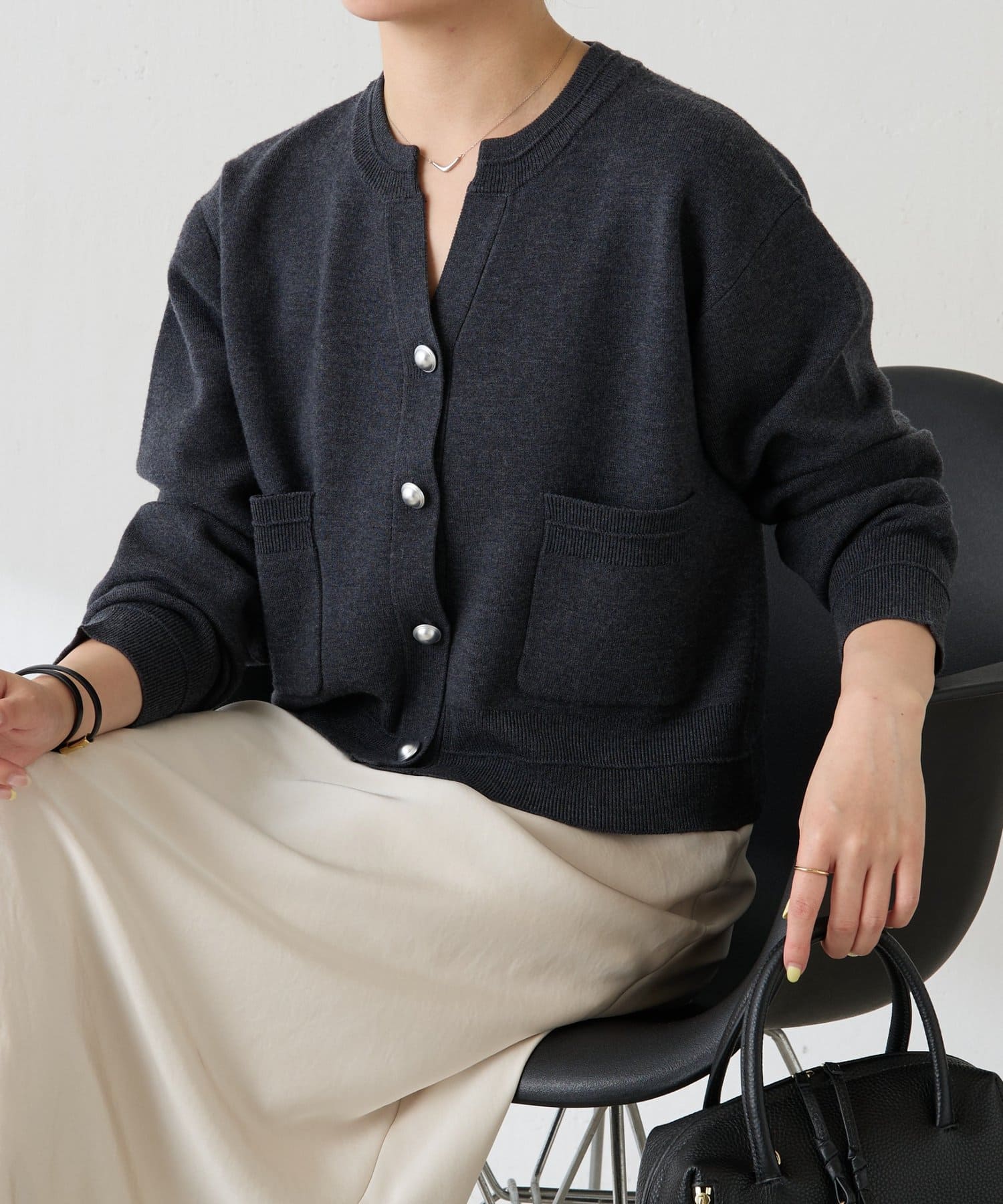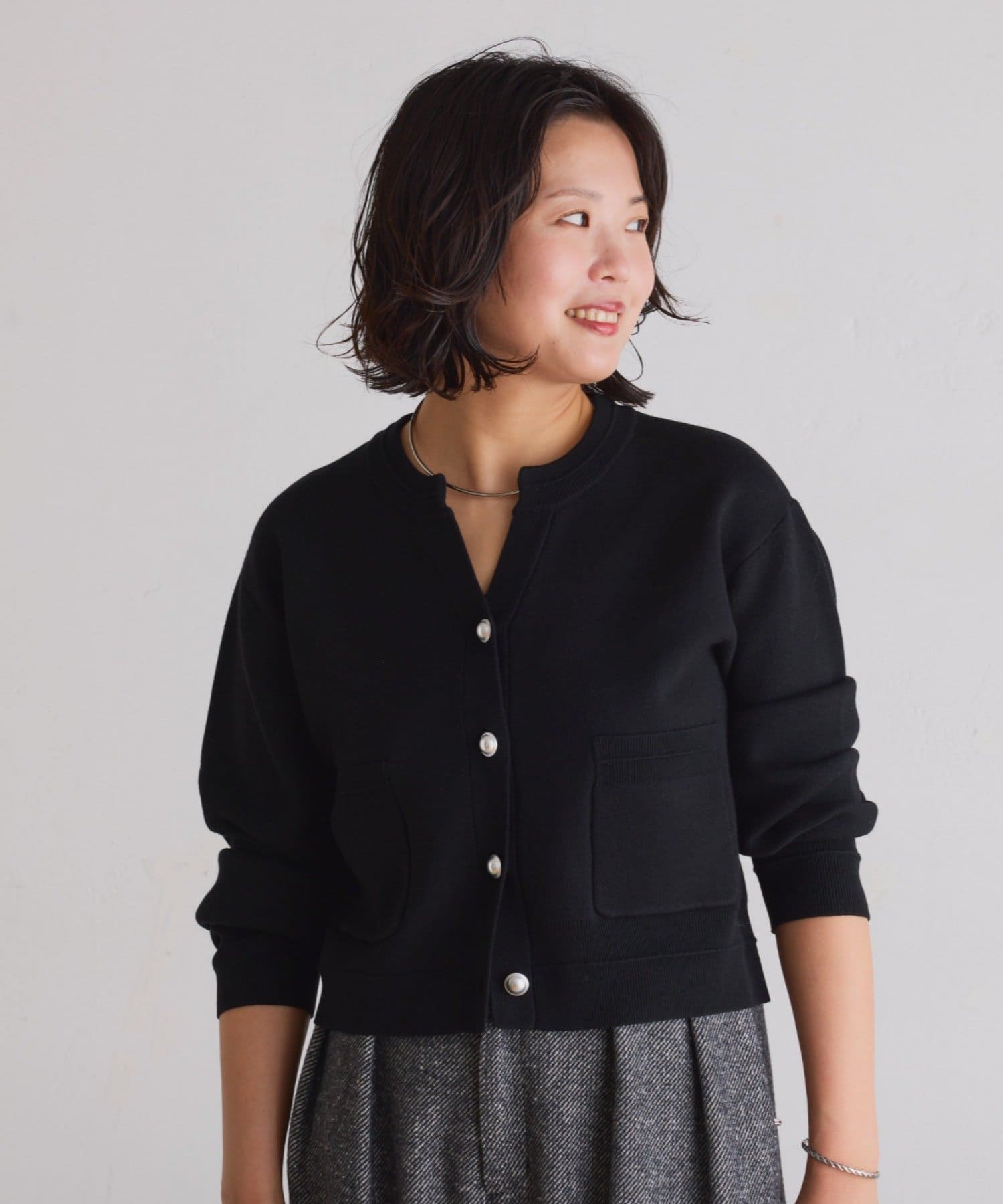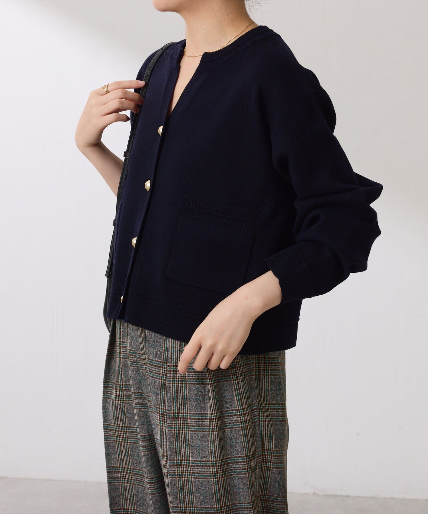 ・ボタンはニットのカラーごとに変えています。どのボタンもマットなお色が上品な印象です。