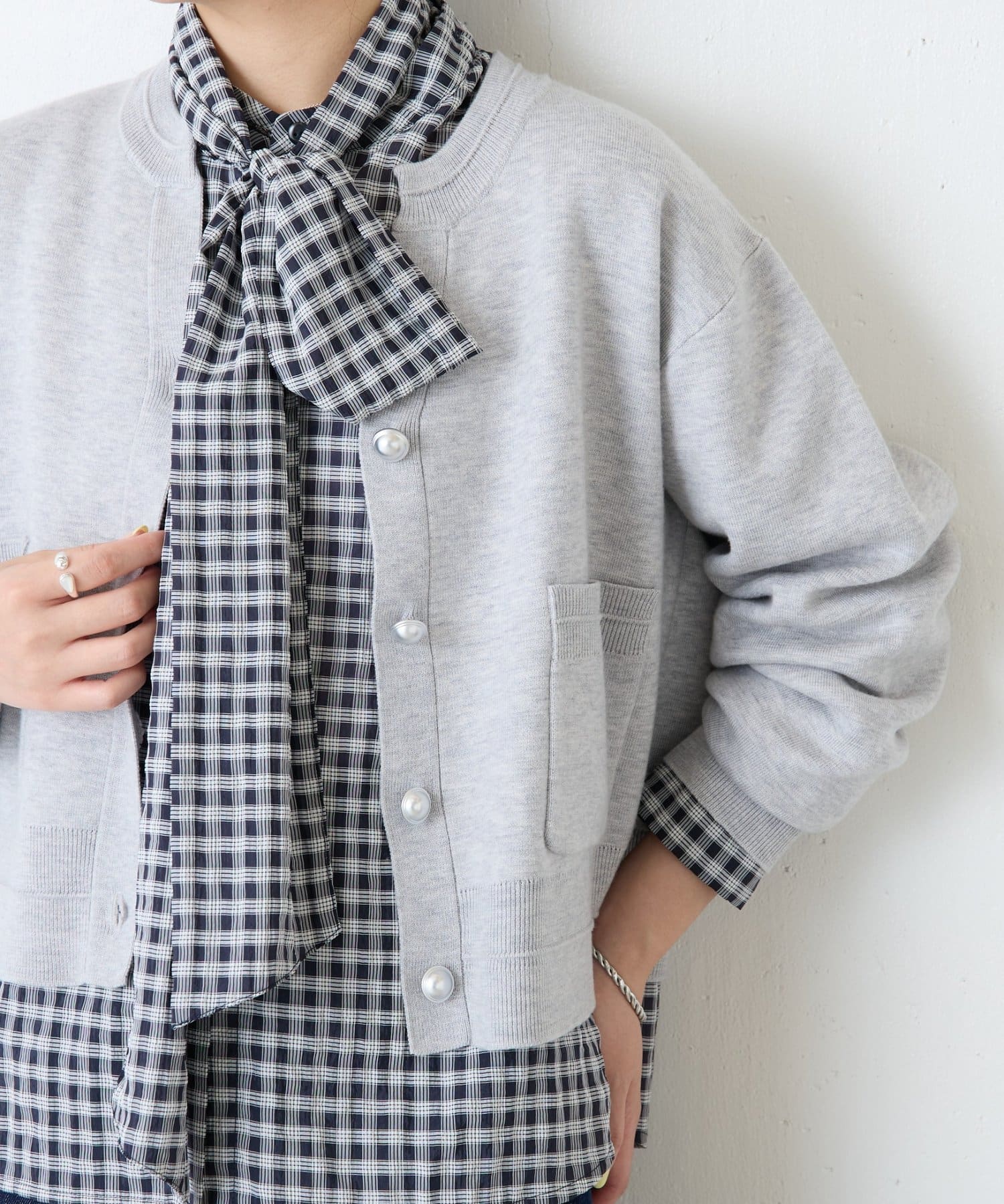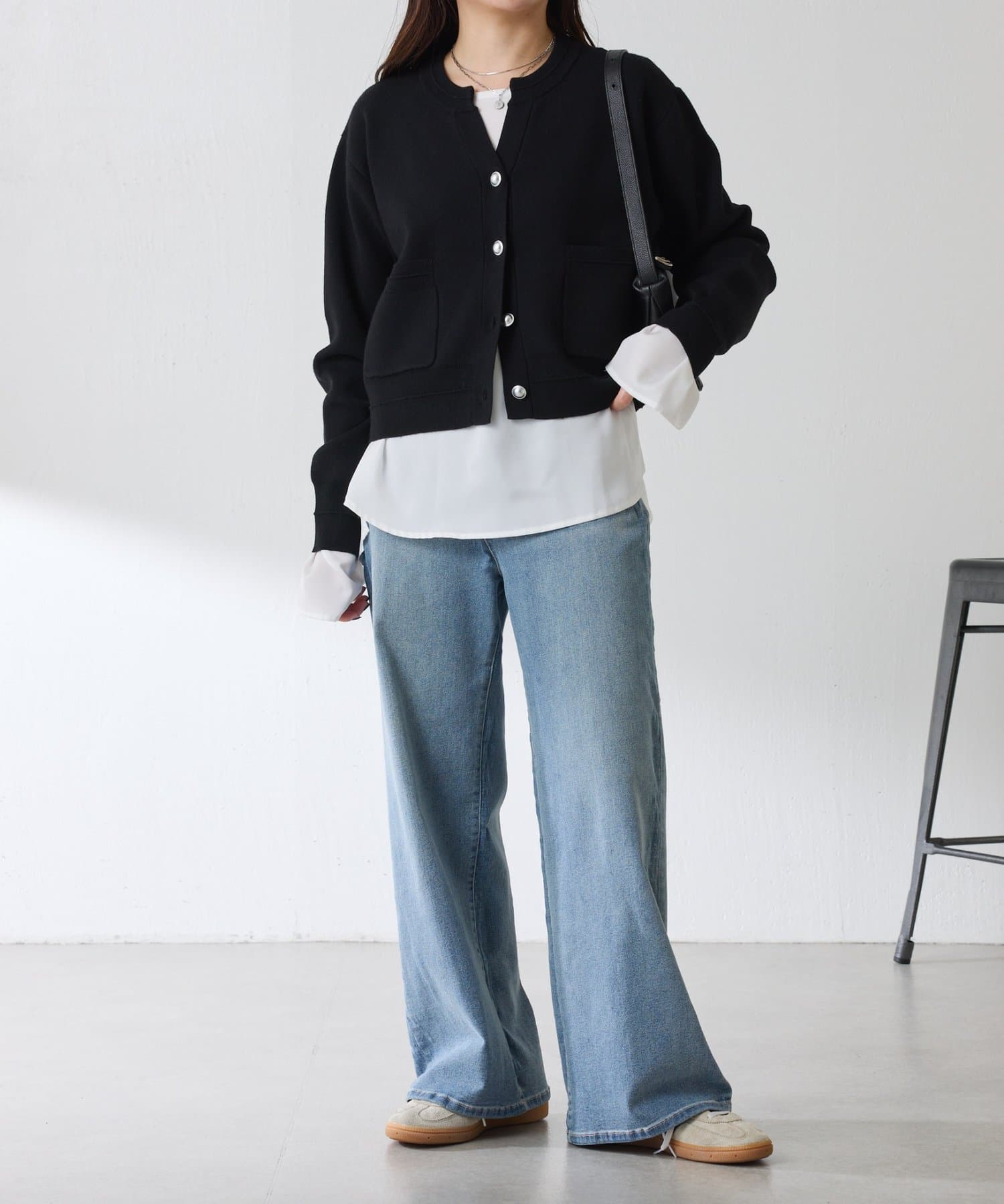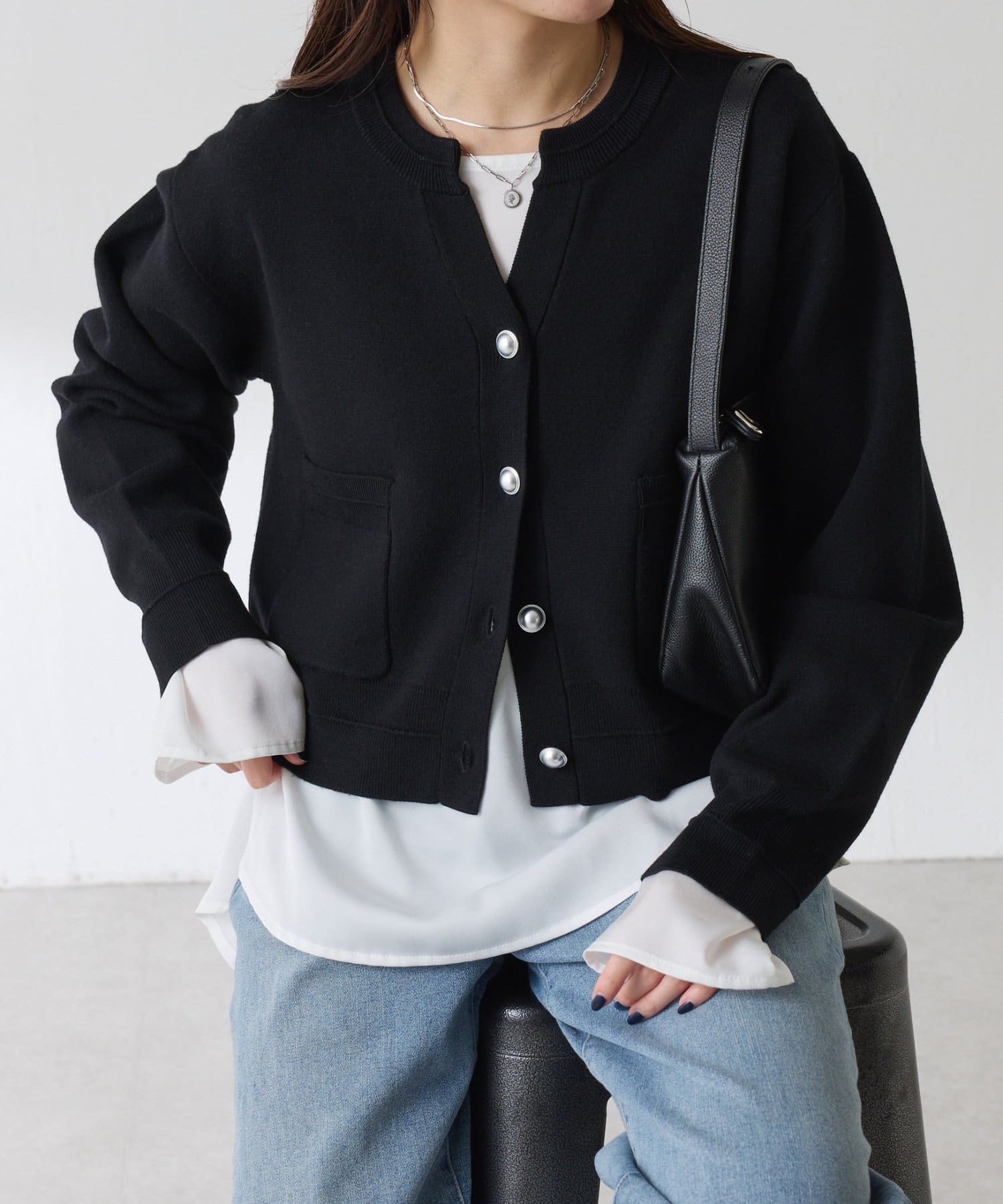 サテンのフリルブラウスやシャツと合わせて襟元や袖を出して、レイヤードスタイルを楽しめます◎