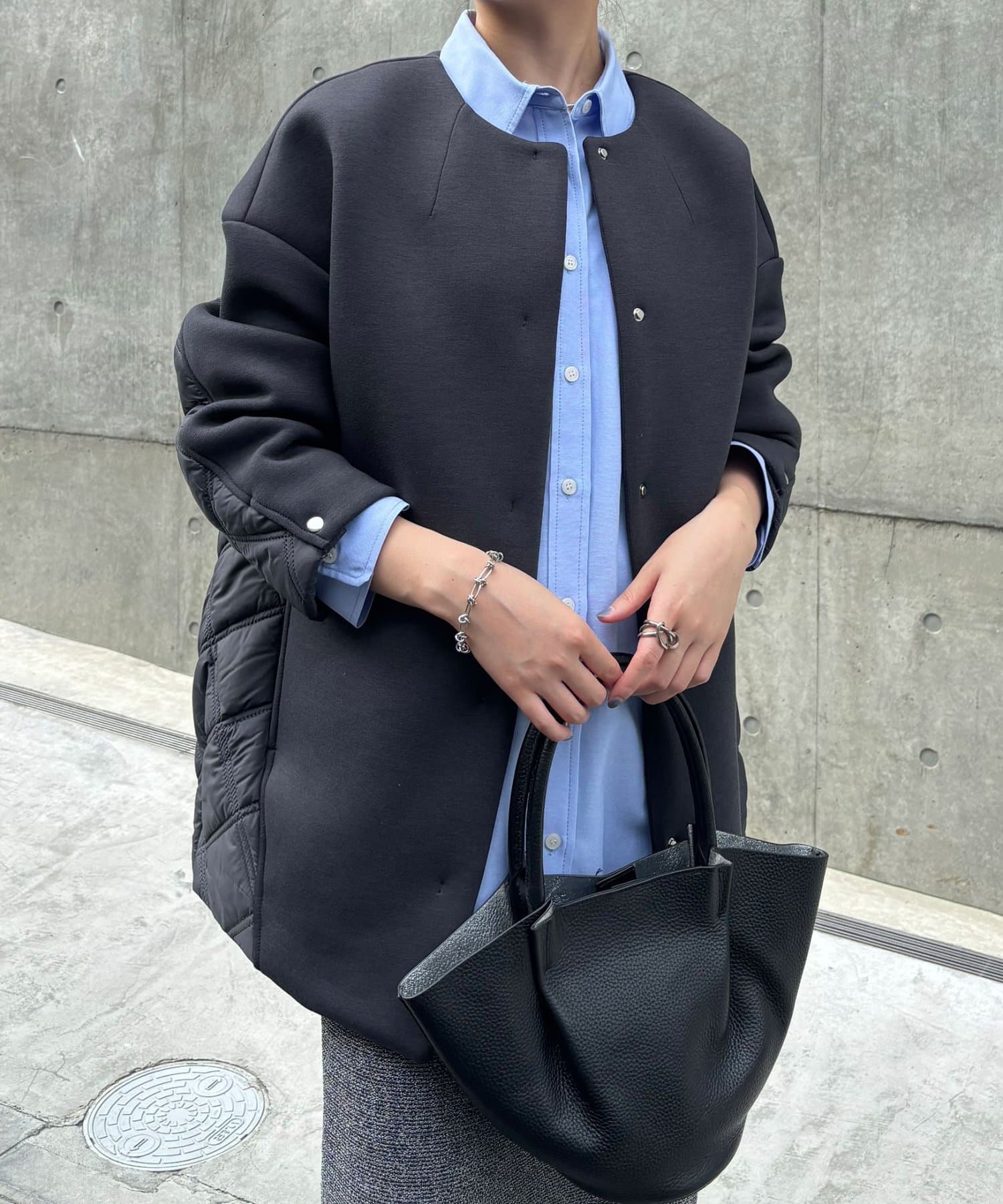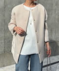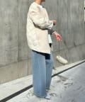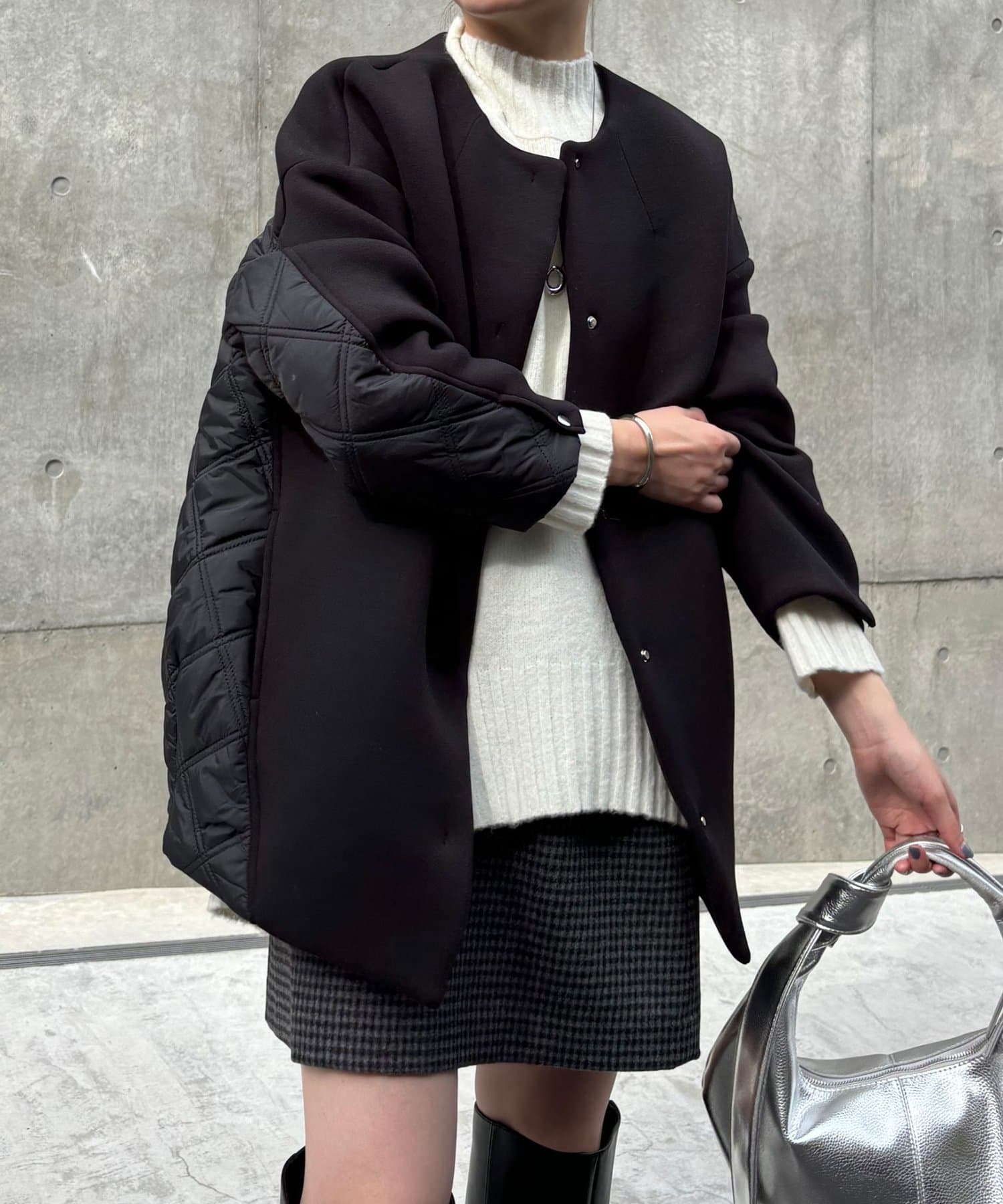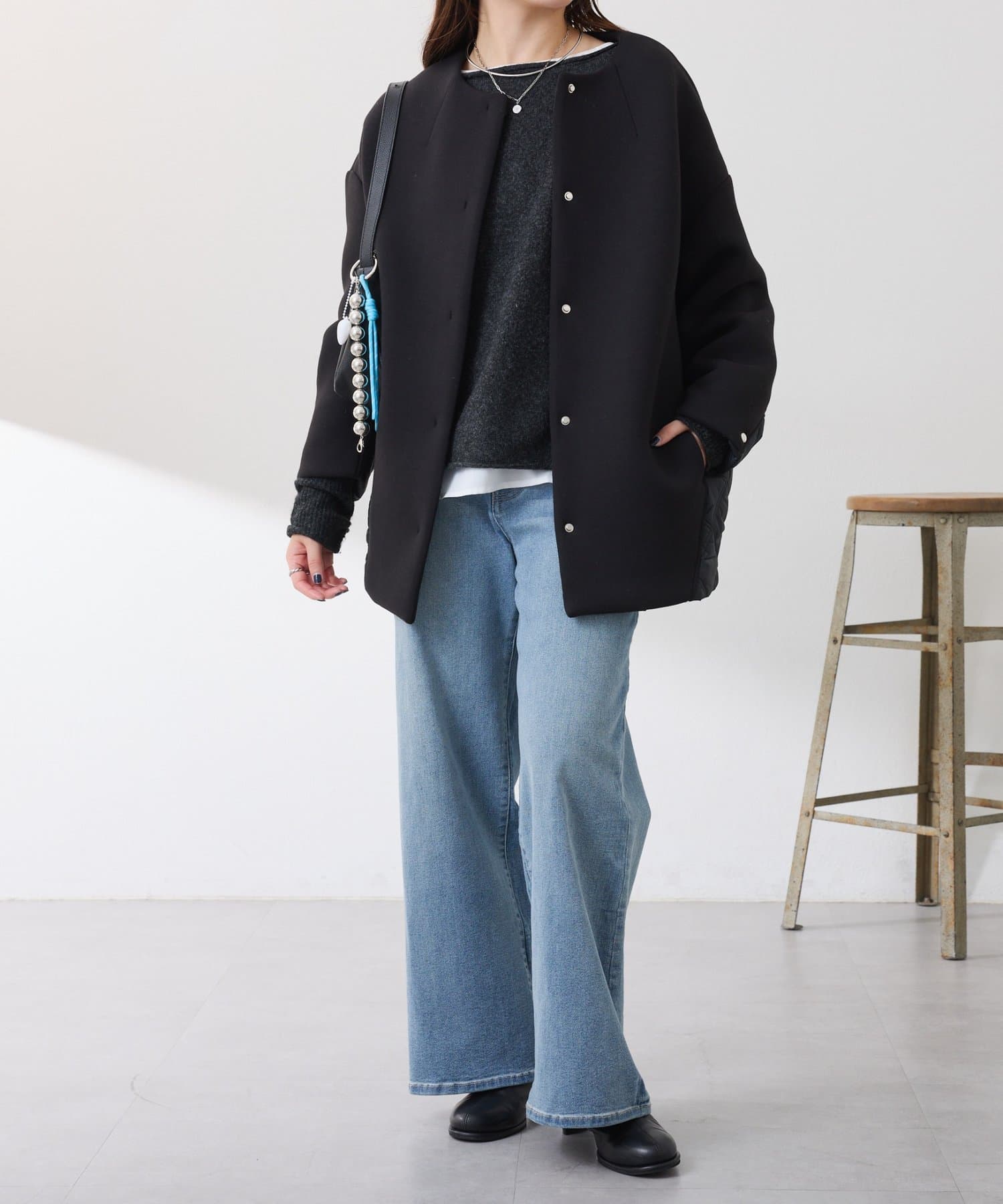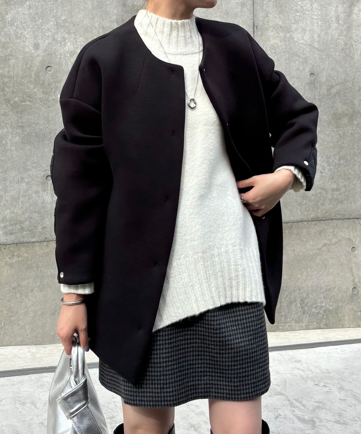 袖も身幅もゆったりとしているので、厚手のニットの上からでも羽織りやすいアイテム。ノーカラーで首回りがすっきりとしているのでタートルネックやフーディーが合わせやすい点も◎