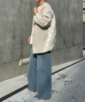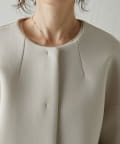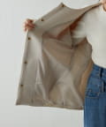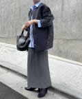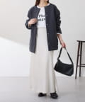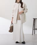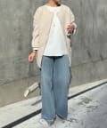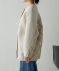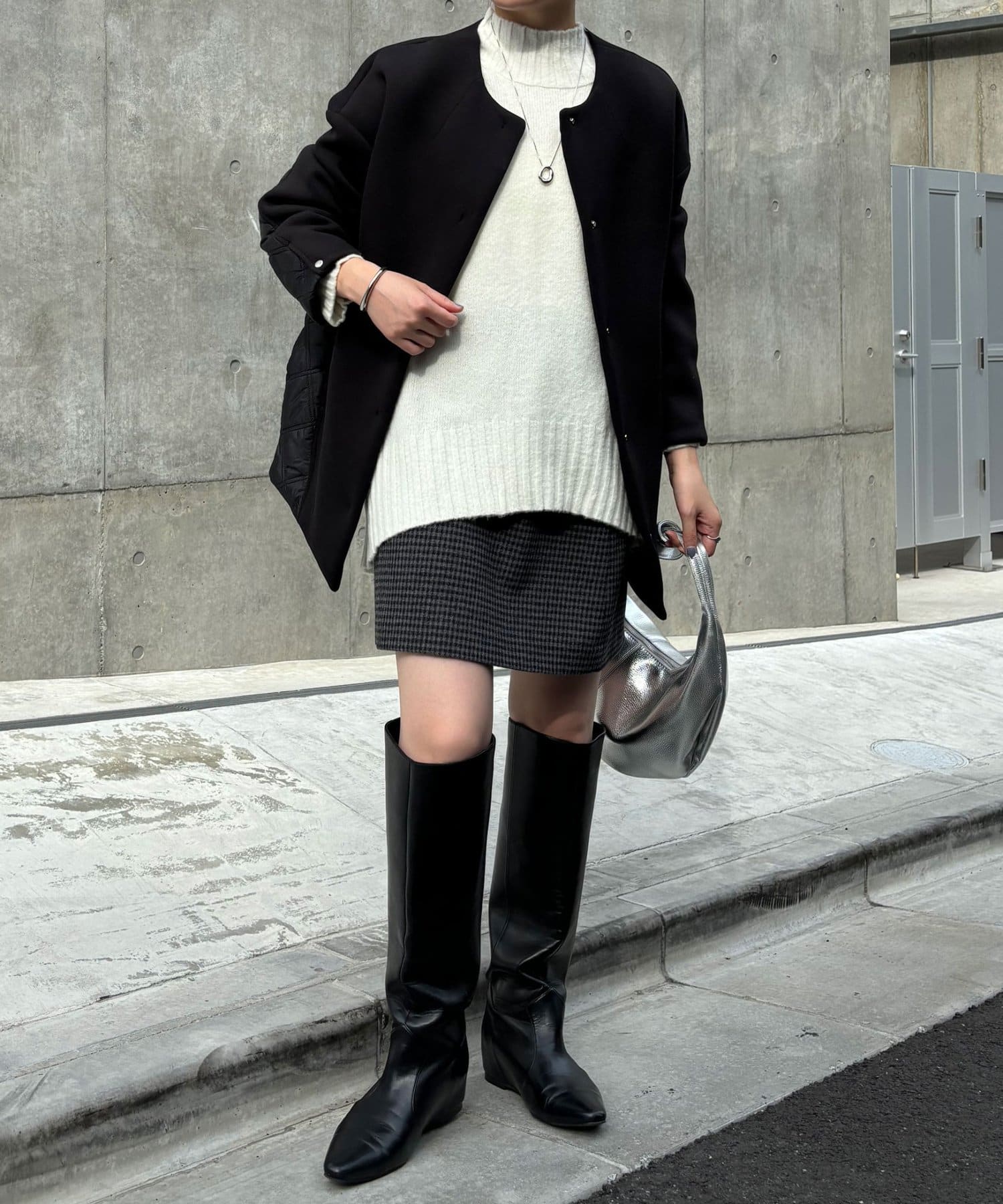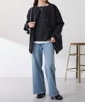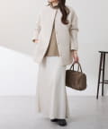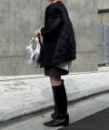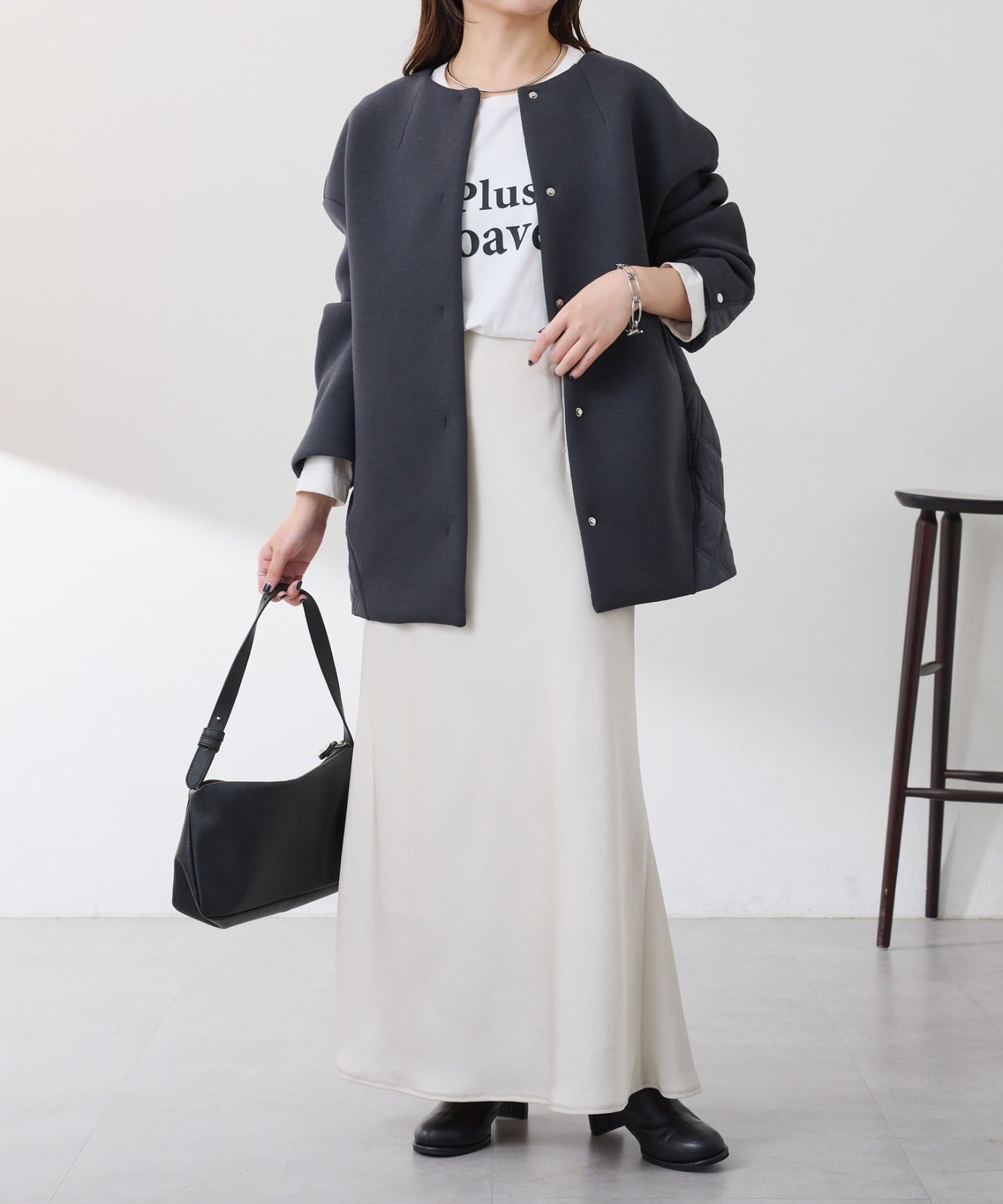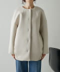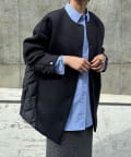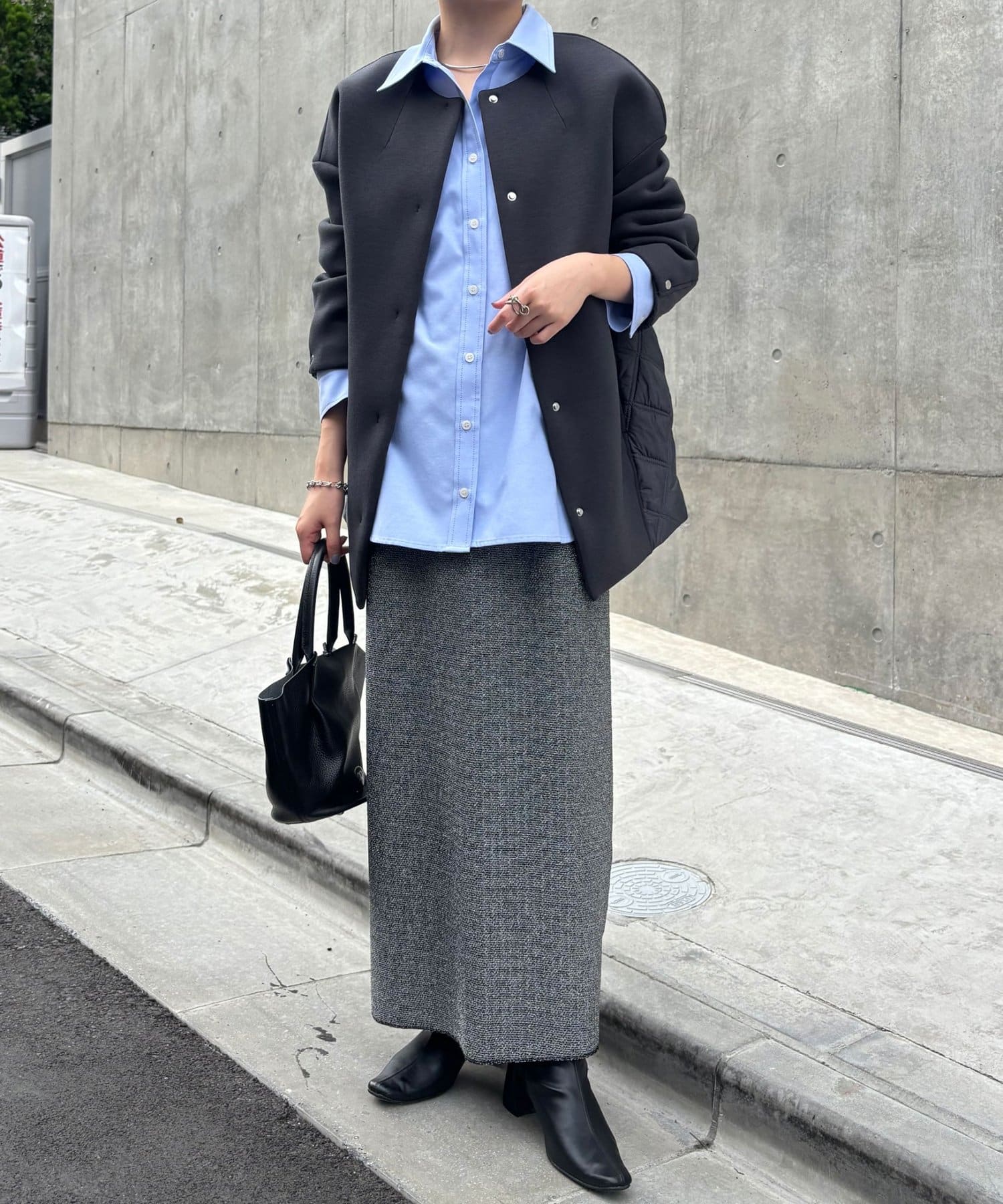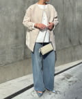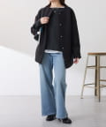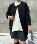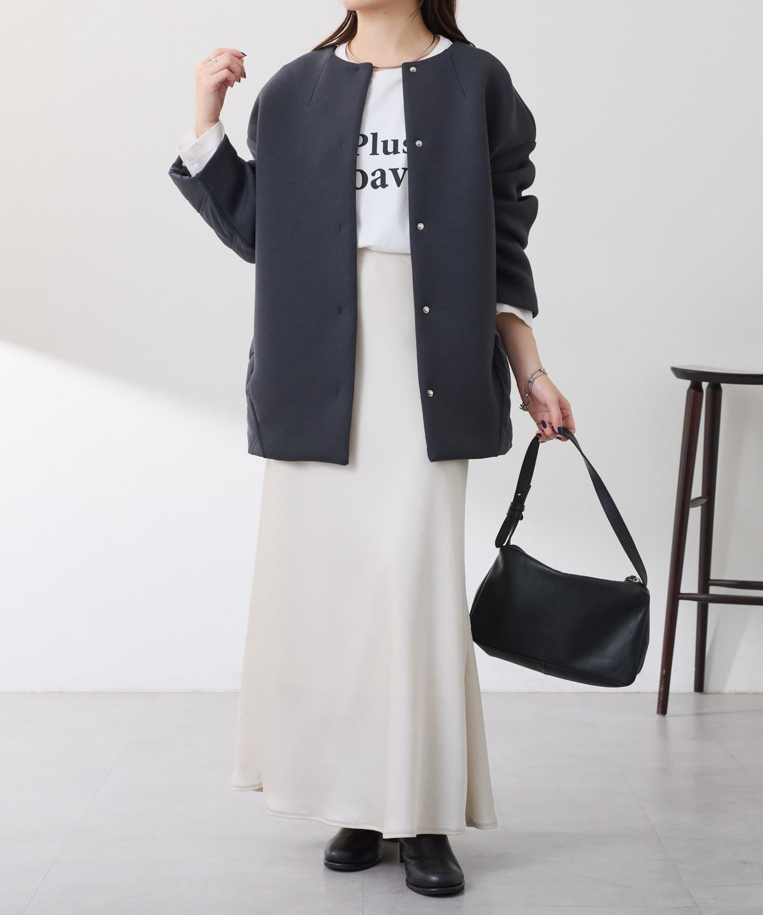 袖も身幅もゆったりとしているので、厚手のニットの上からでも羽織りやすいアイテム。ノーカラーで首回りがすっきりとしているのでタートルネックやフーディーが合わせやすい点も◎