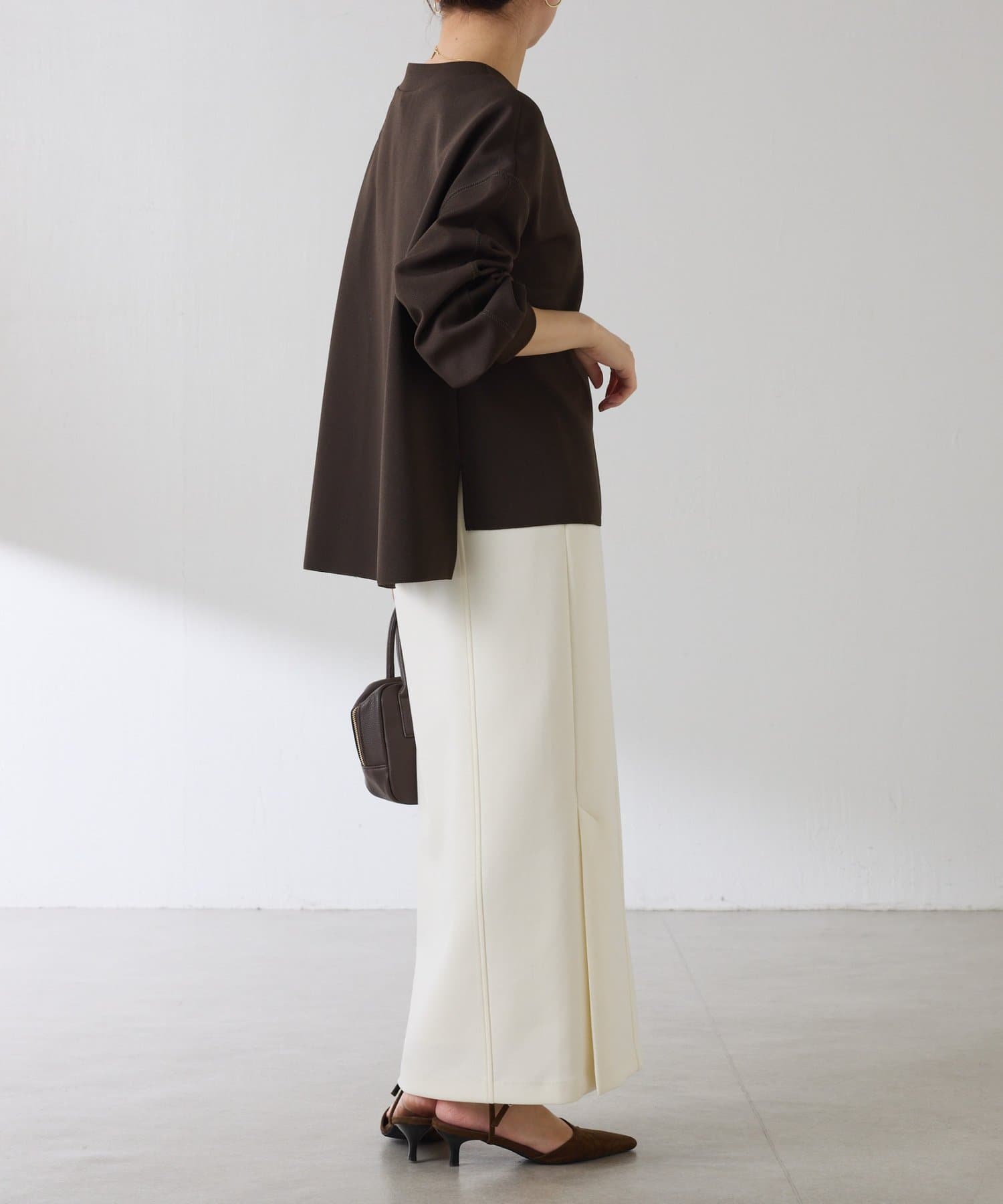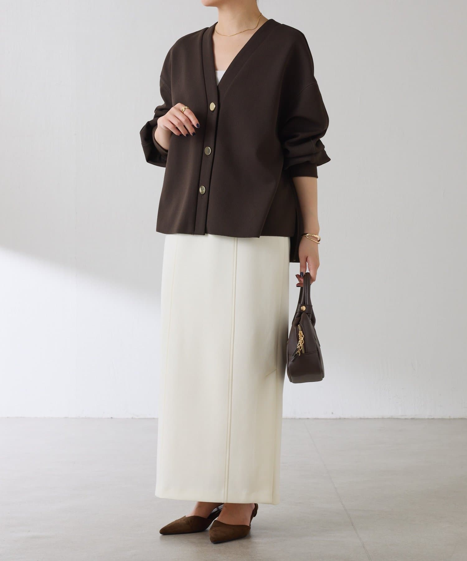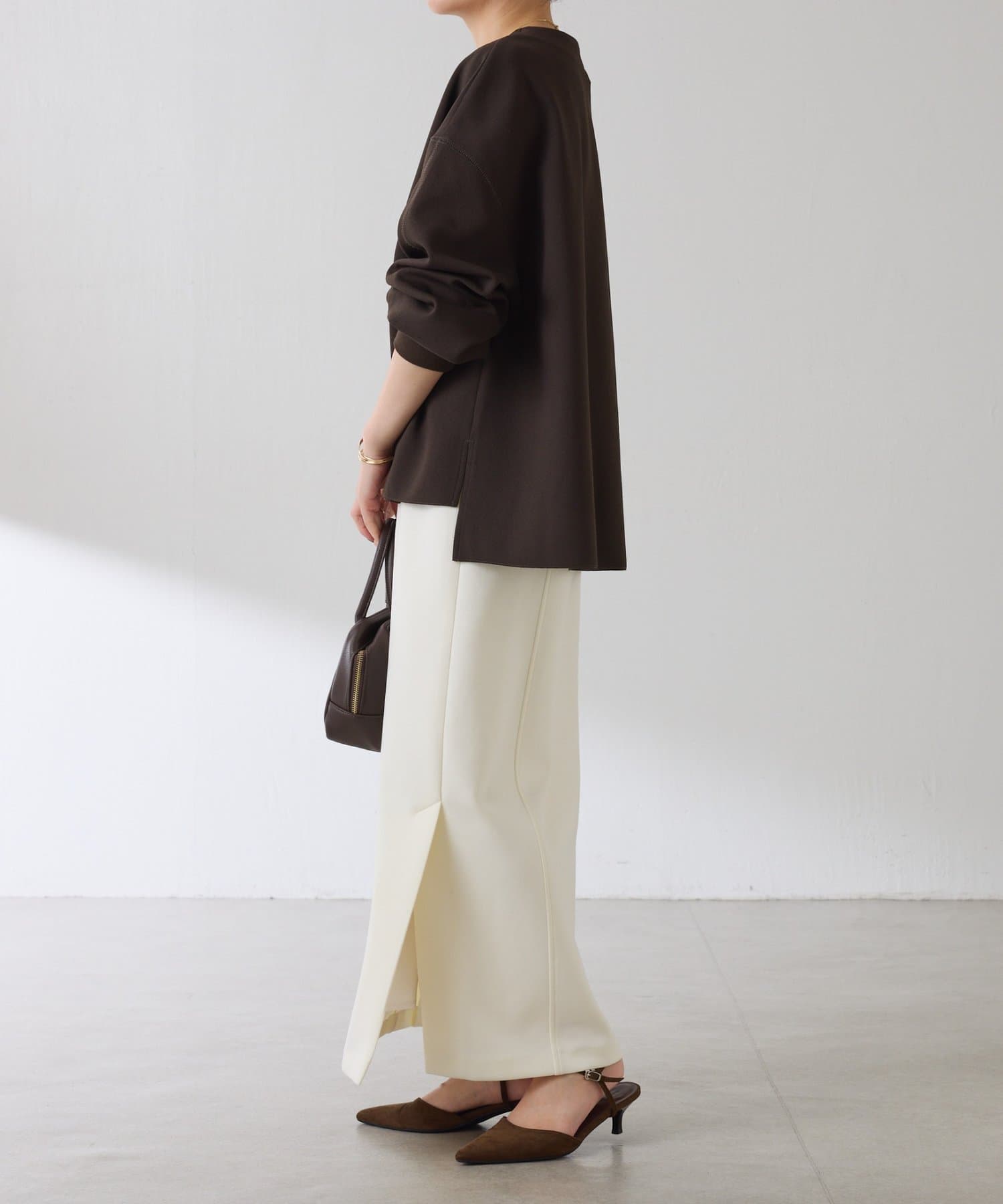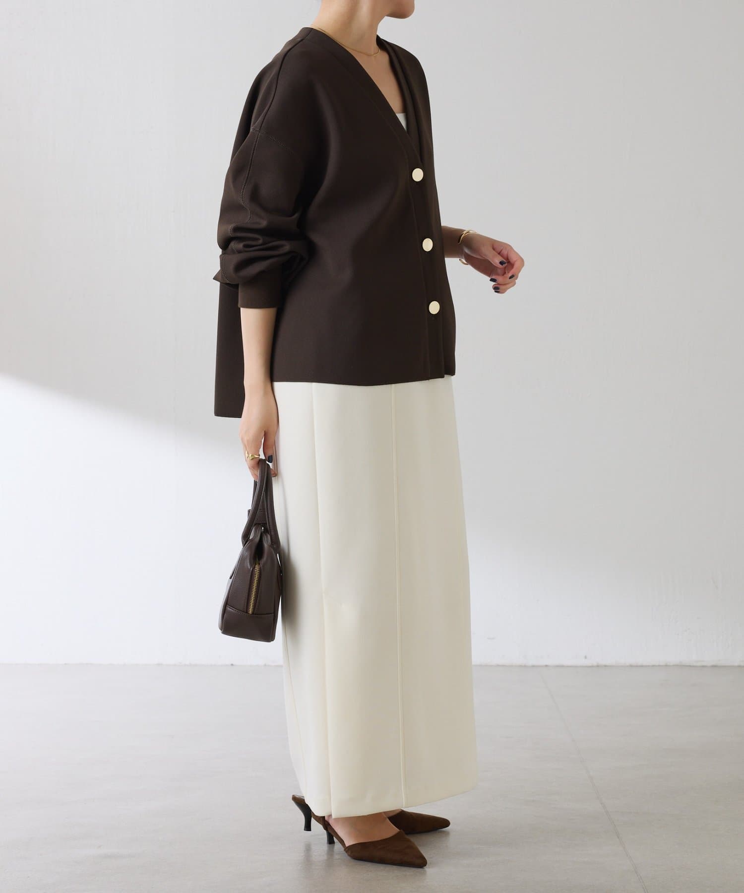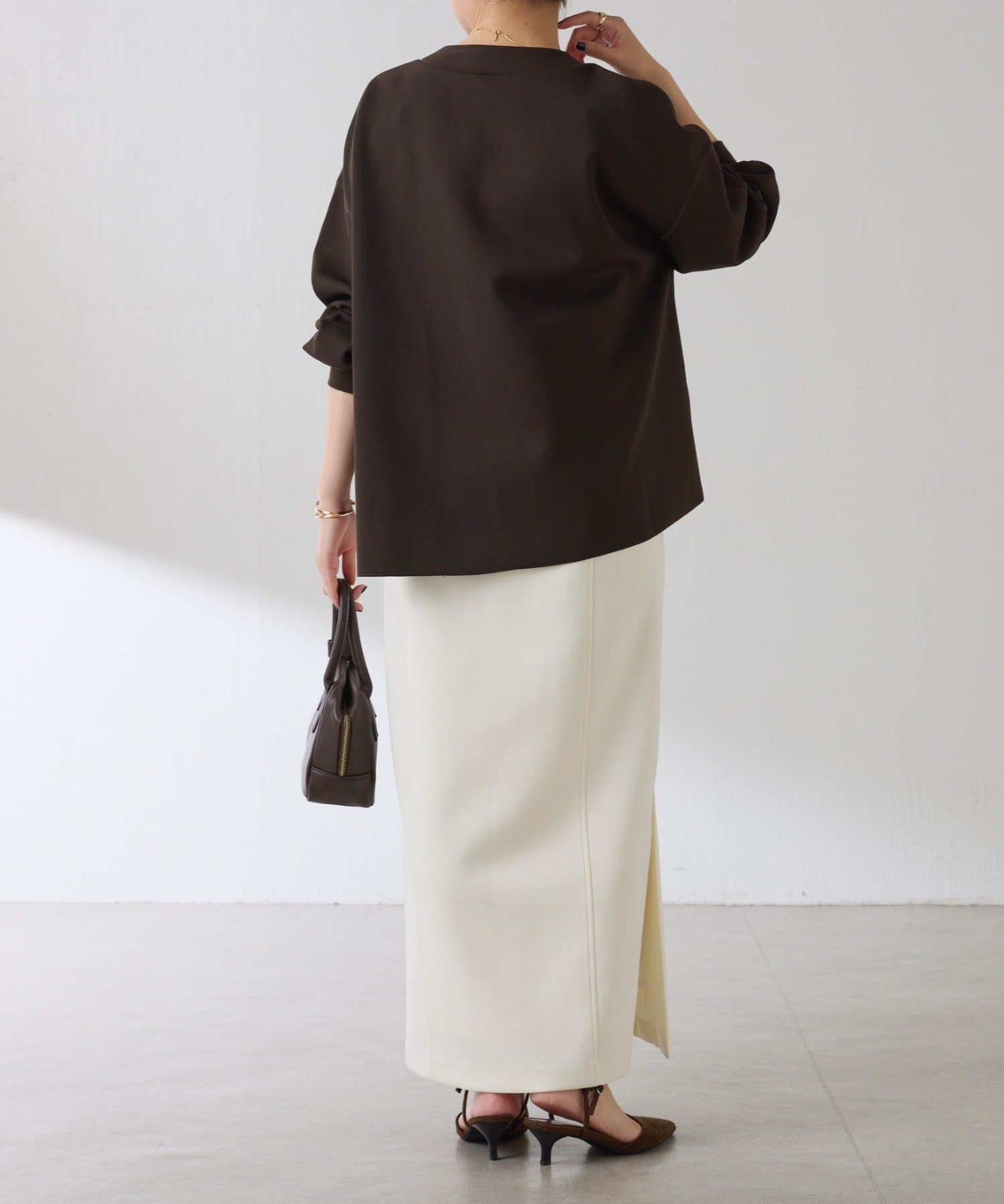 裾にかけて広がるデザインでワイドパンツでもIラインワンピースともバランス良く決まります。