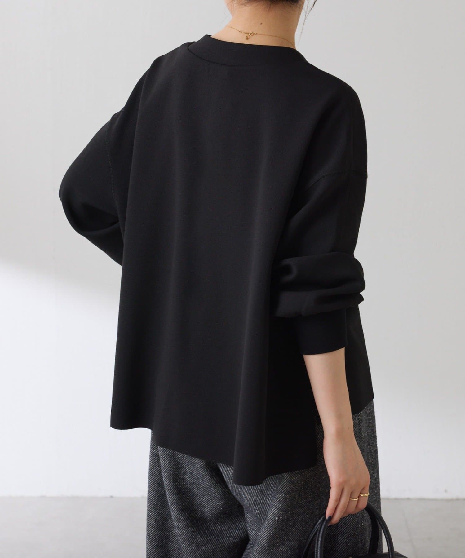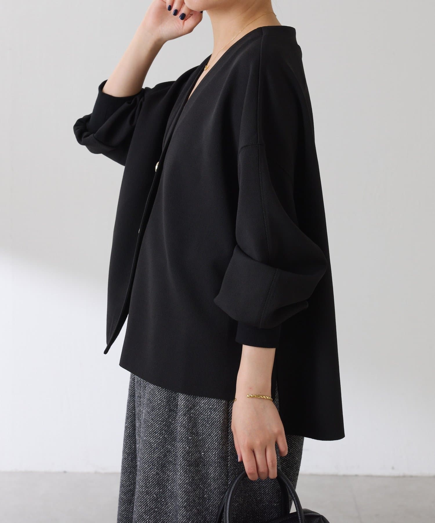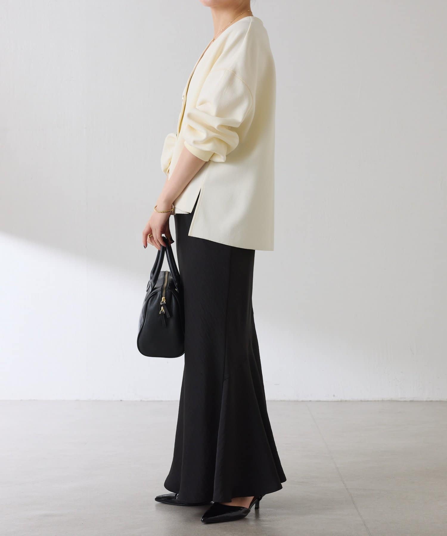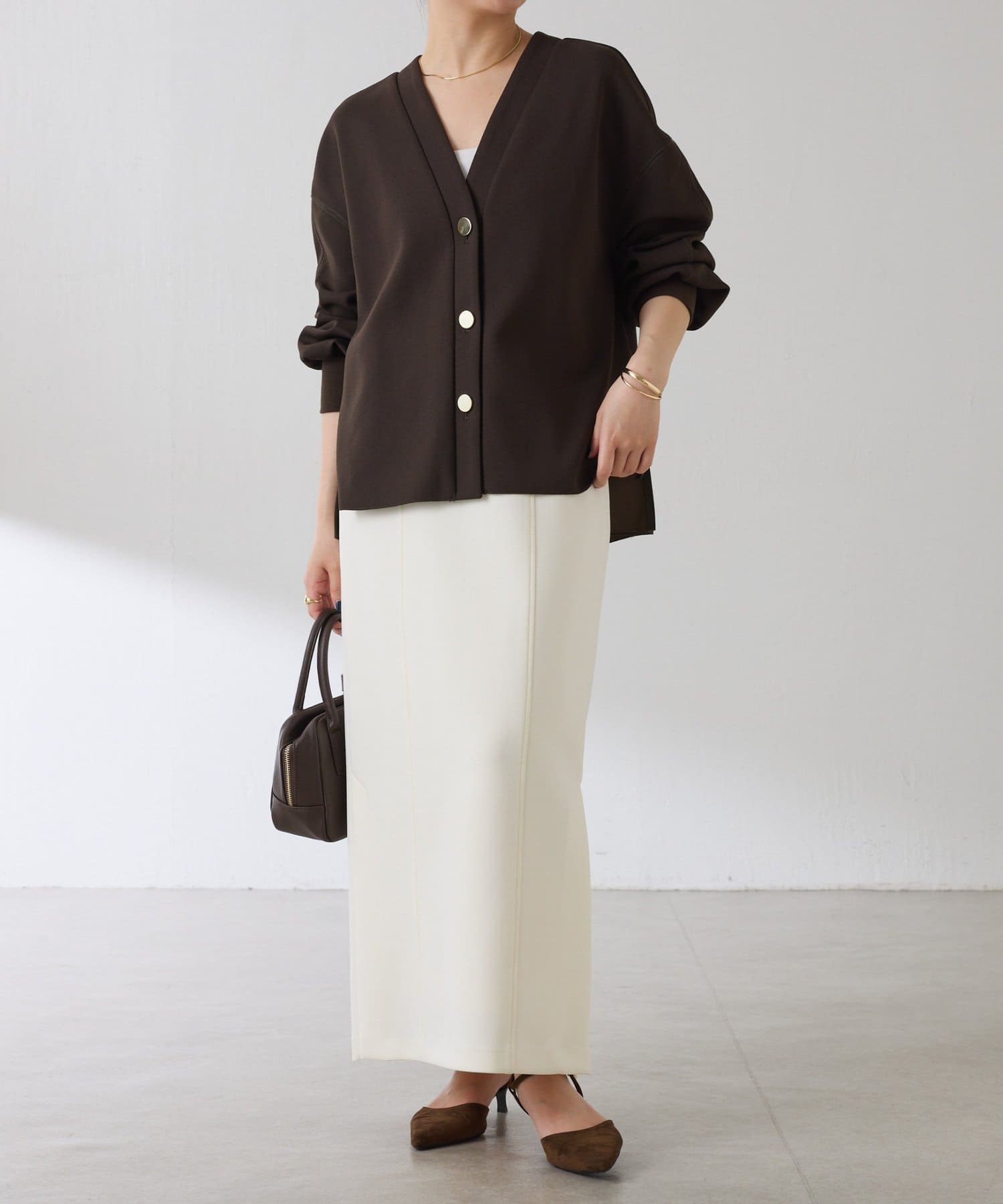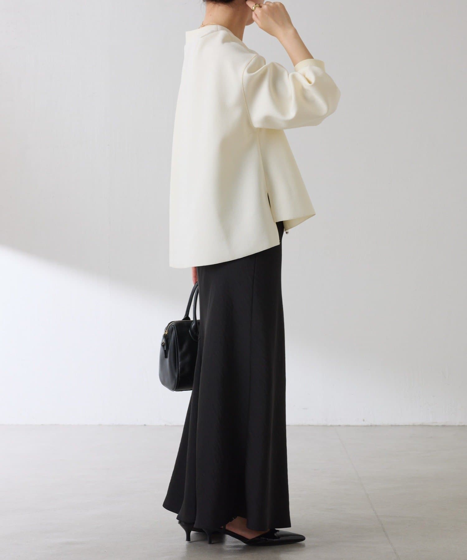 裾にかけて広がるデザインでワイドパンツでもIラインワンピースともバランス良く決まります。