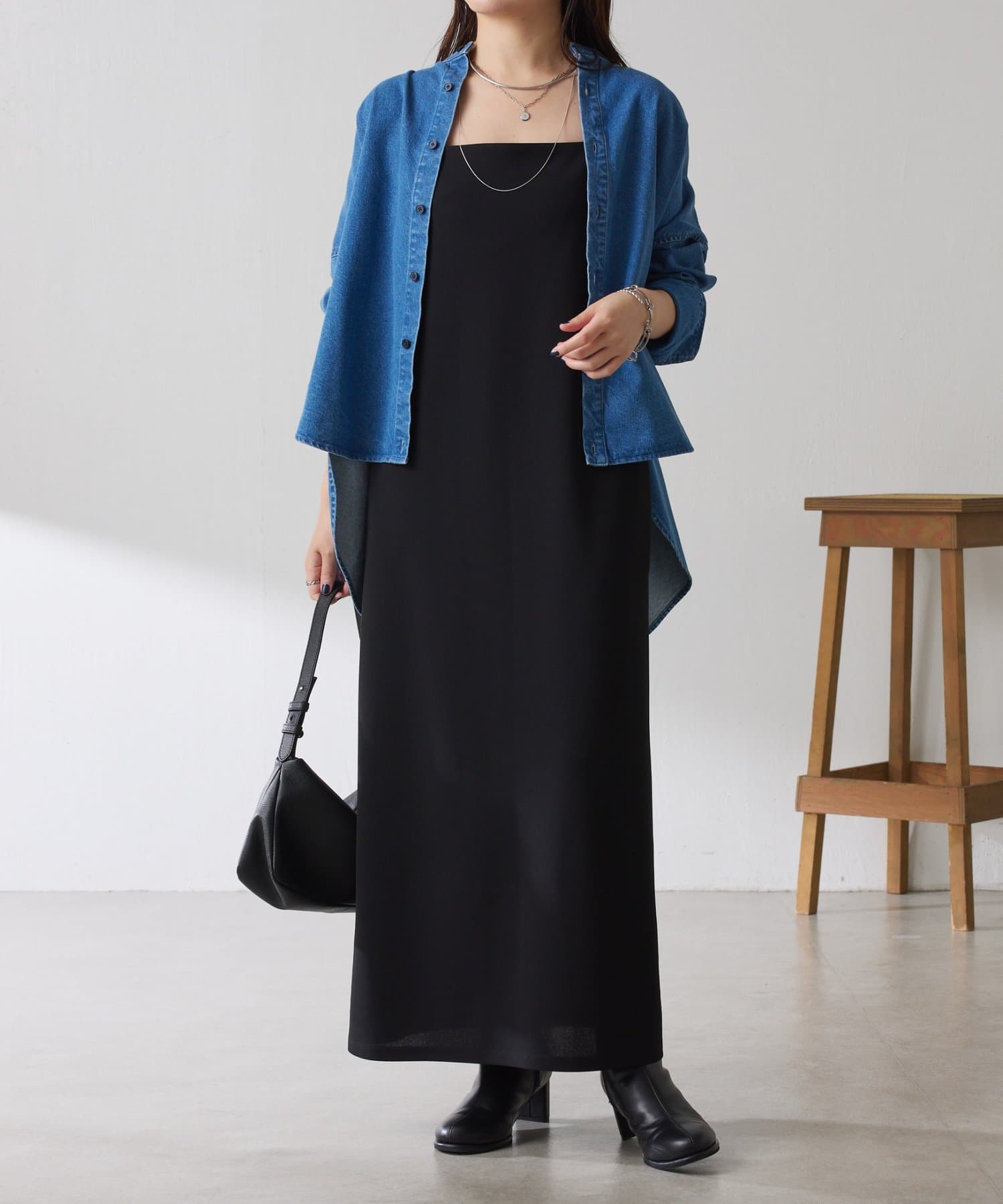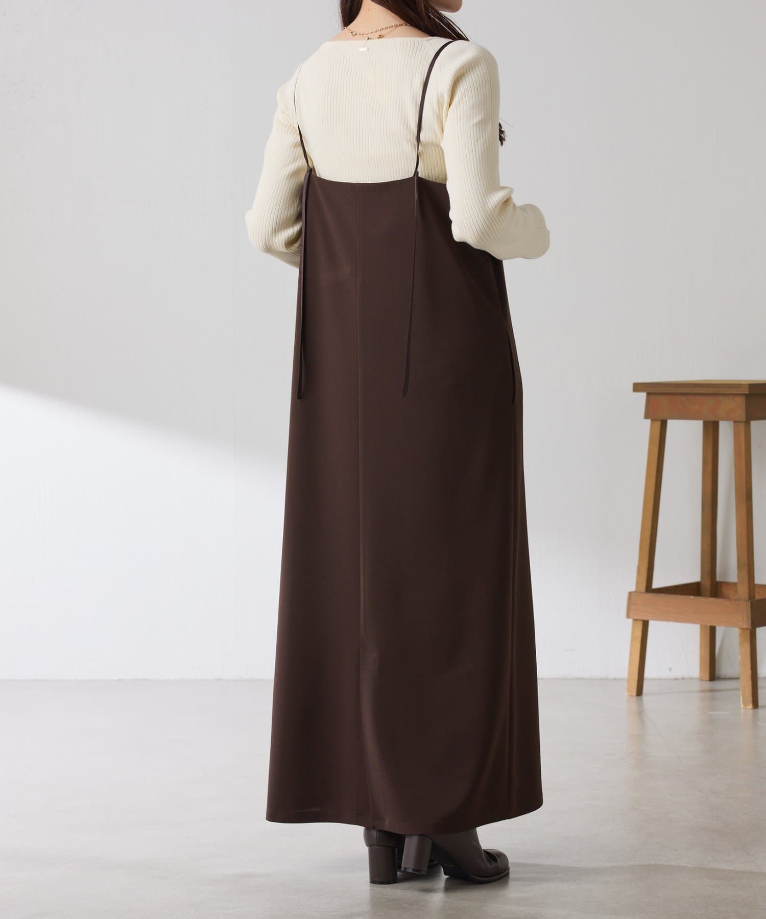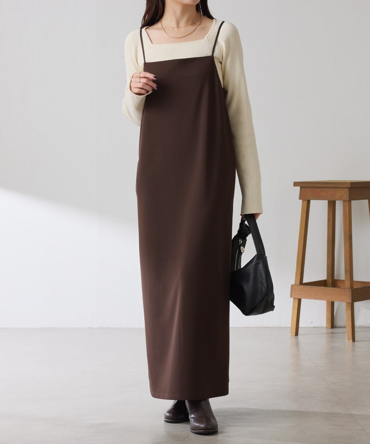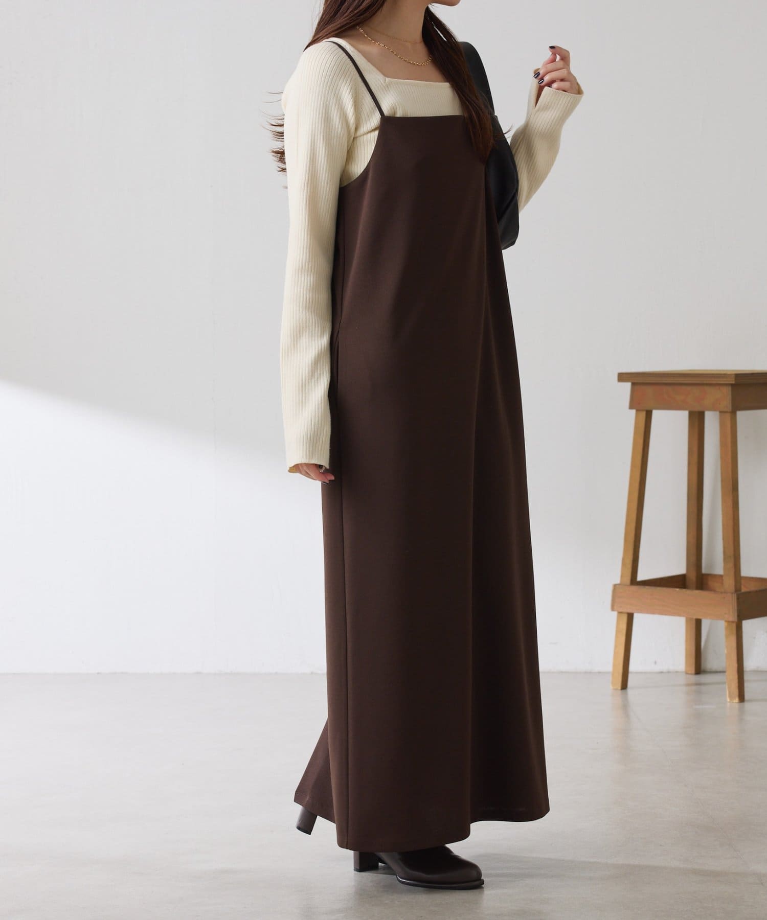 ・すっきり見えするスクエアネックは幅広いインナーと合わせやすいのもポイント◎