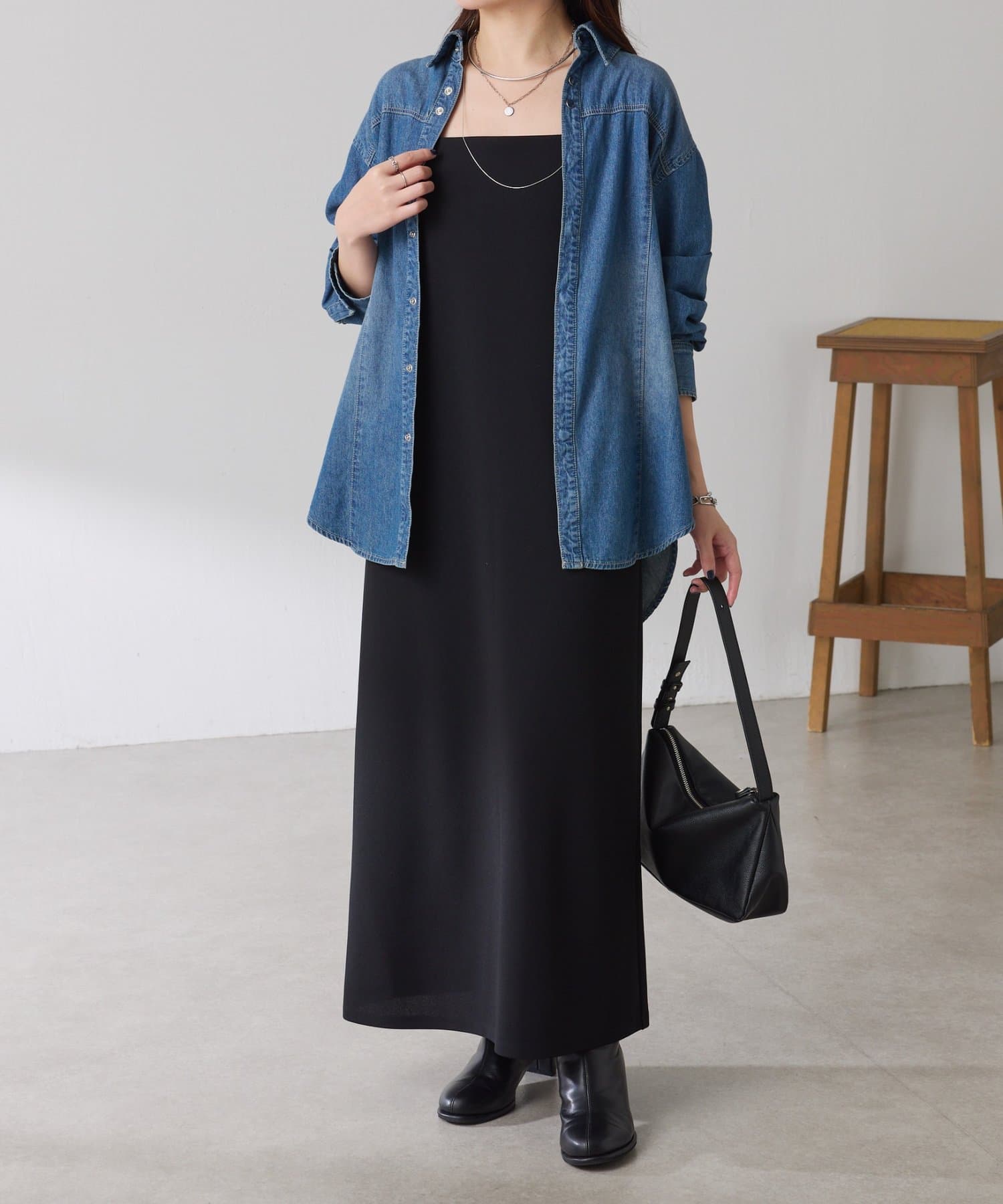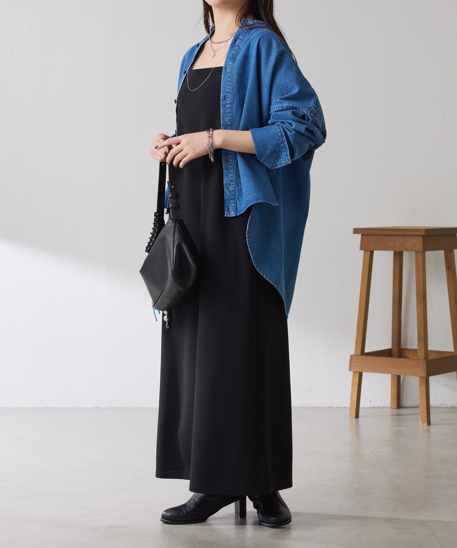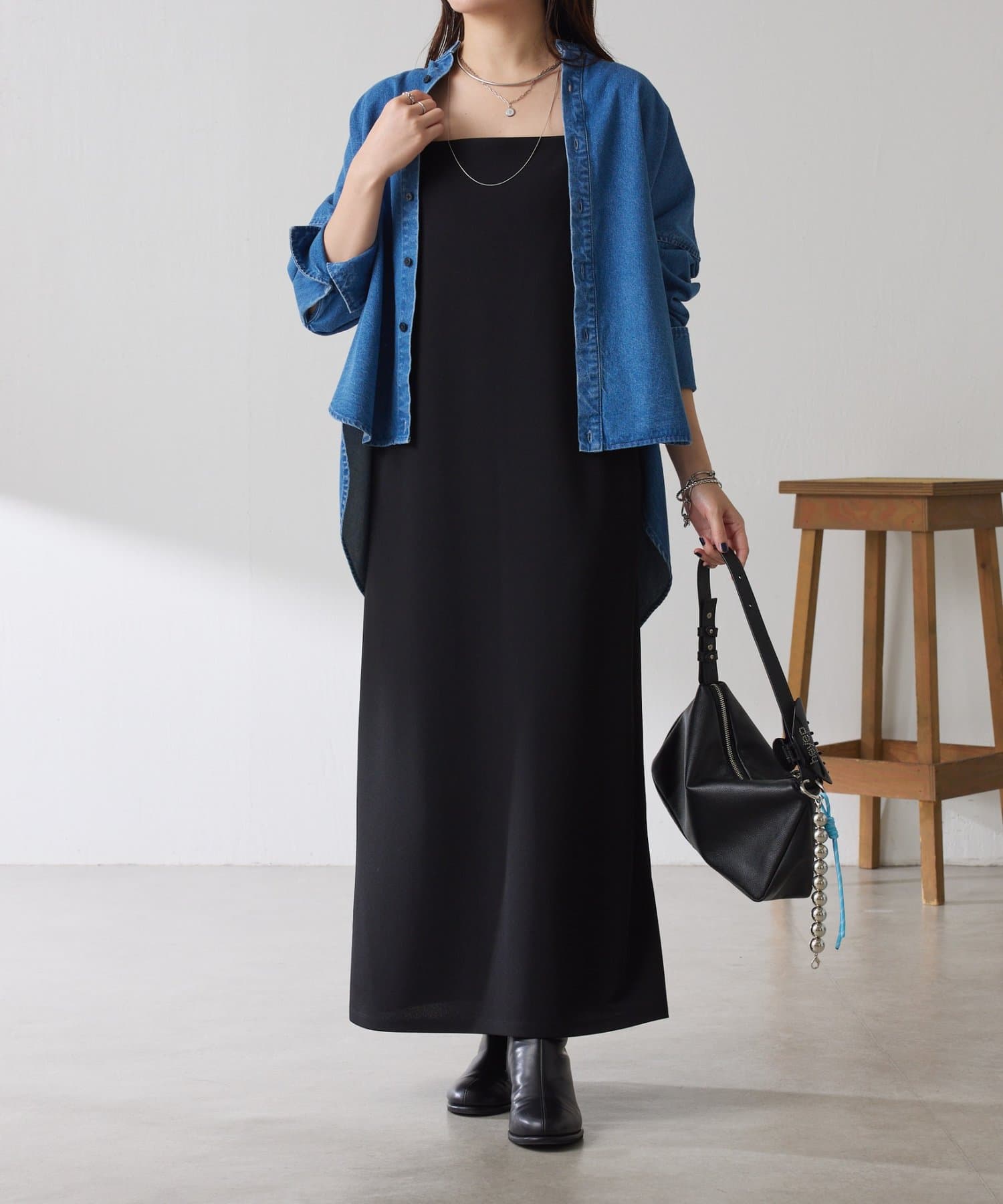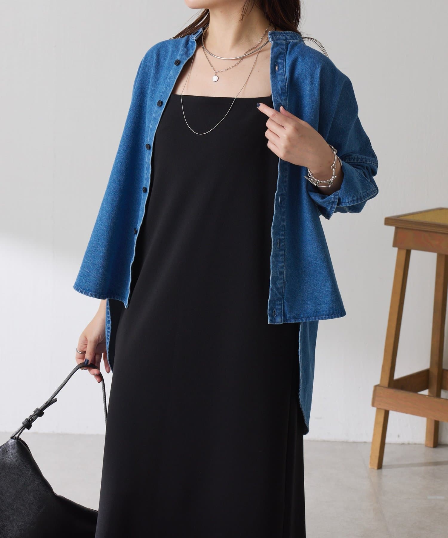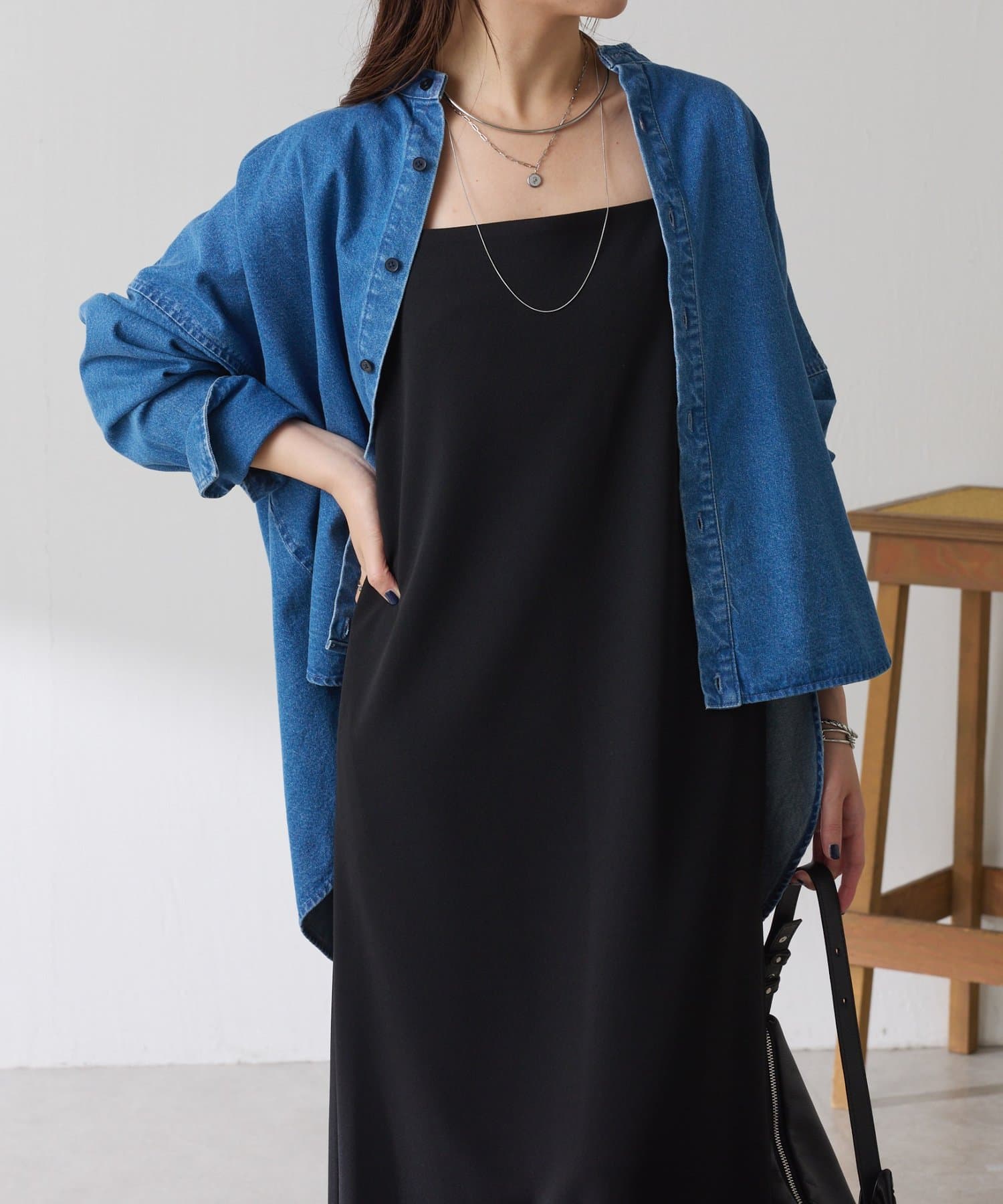 ・すっきり見えするスクエアネックは幅広いインナーと合わせやすいのもポイント◎