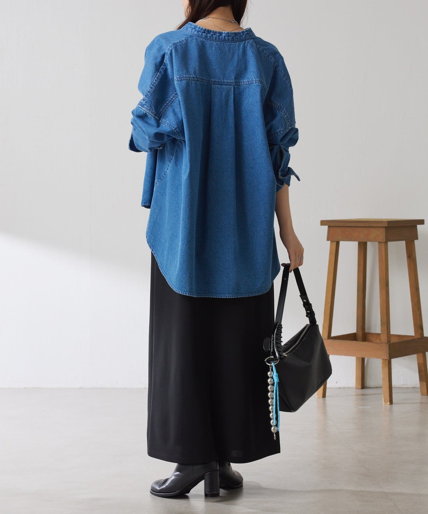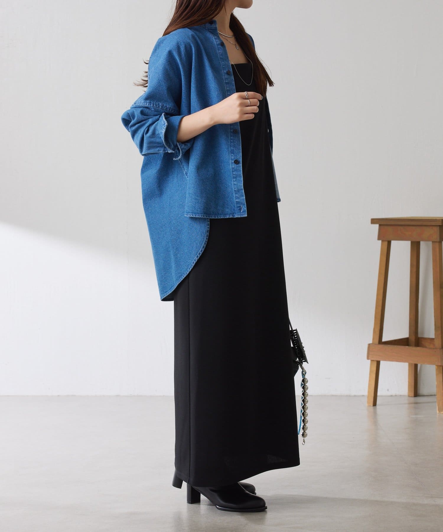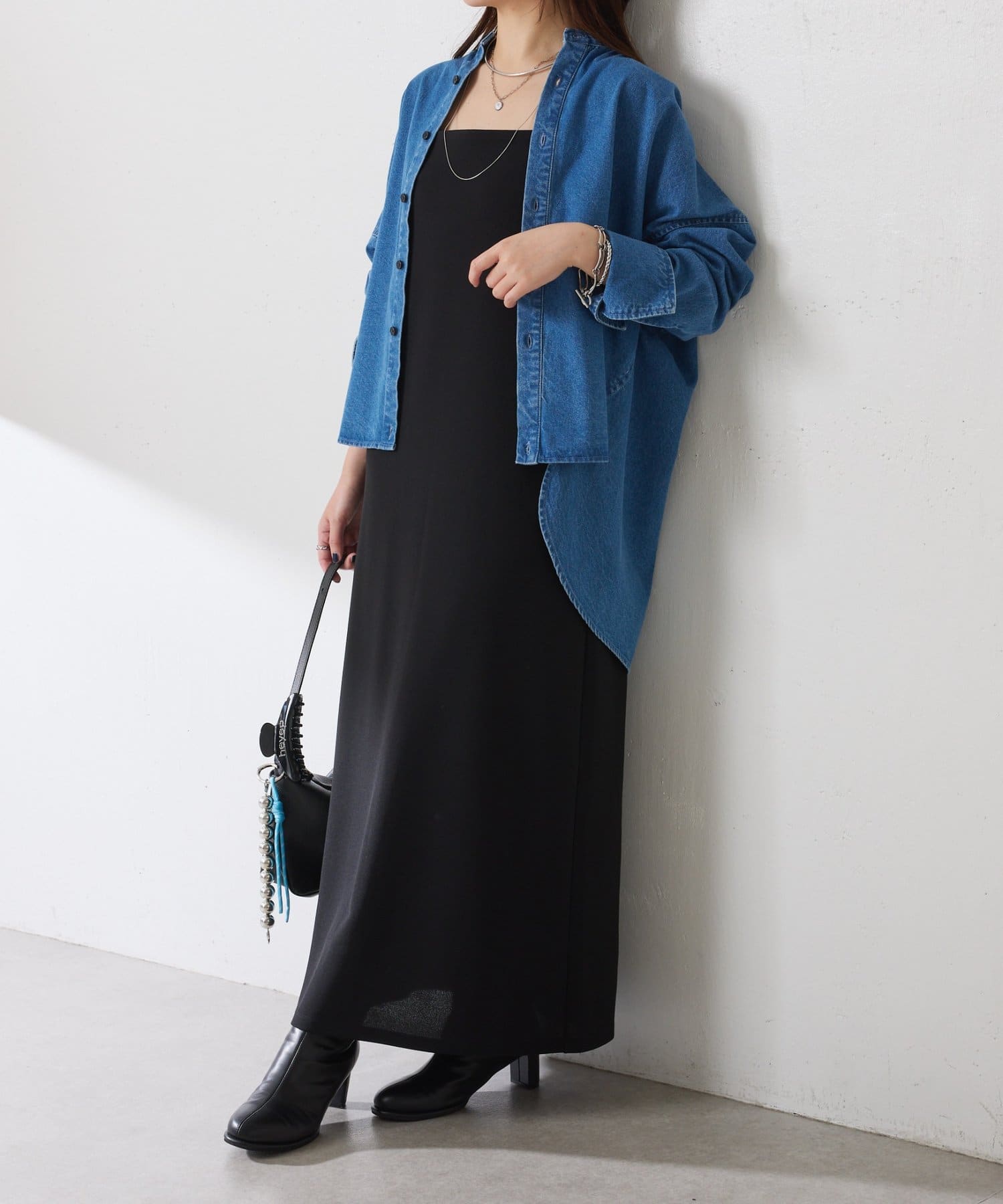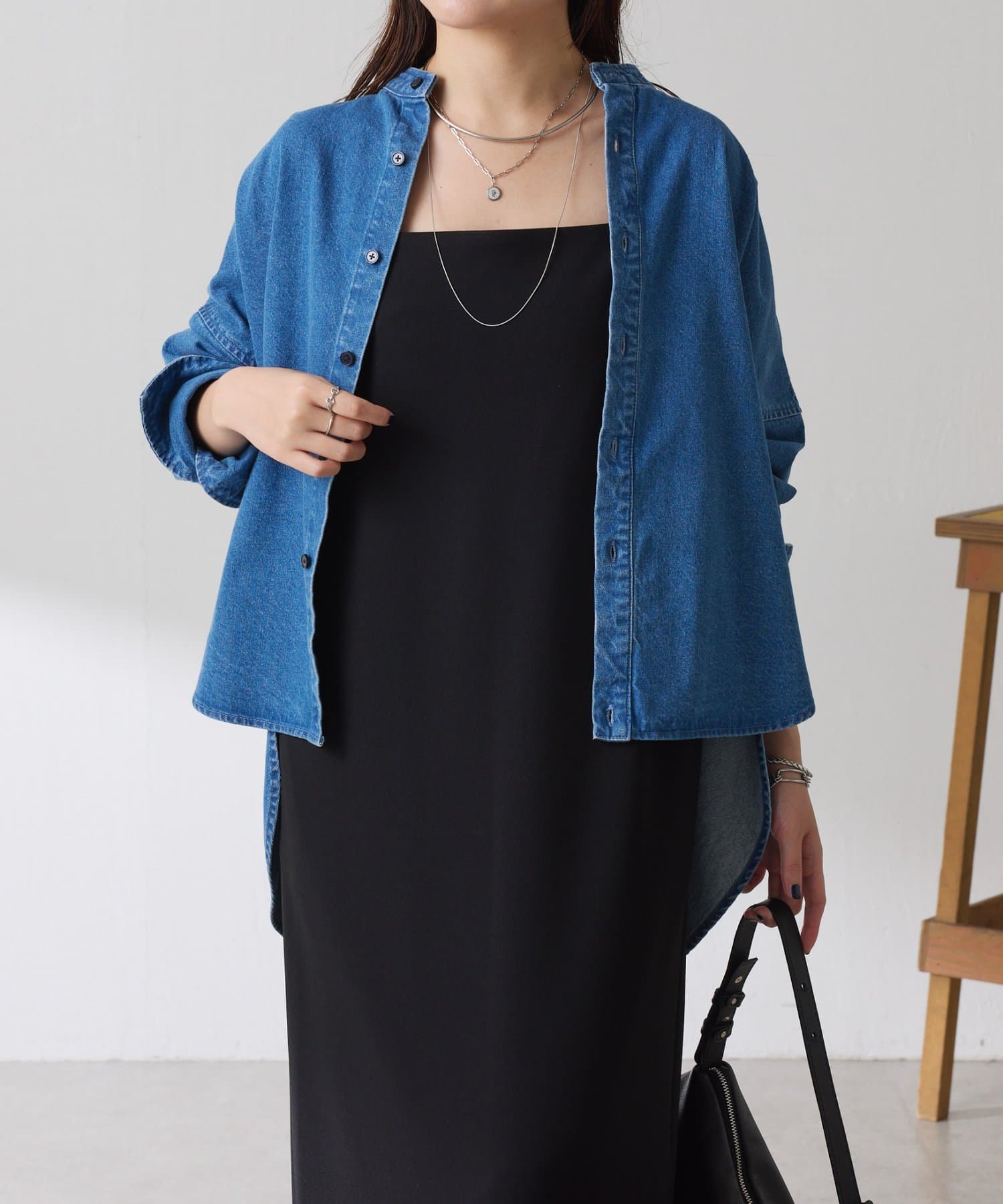 ・すっきり見えするスクエアネックは幅広いインナーと合わせやすいのもポイント◎