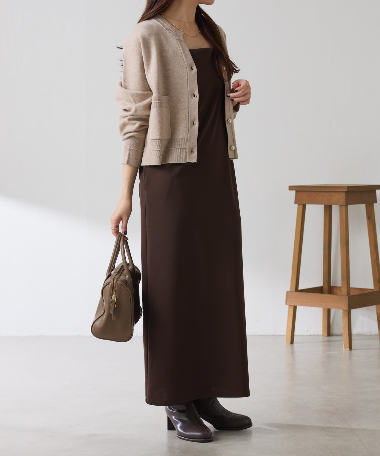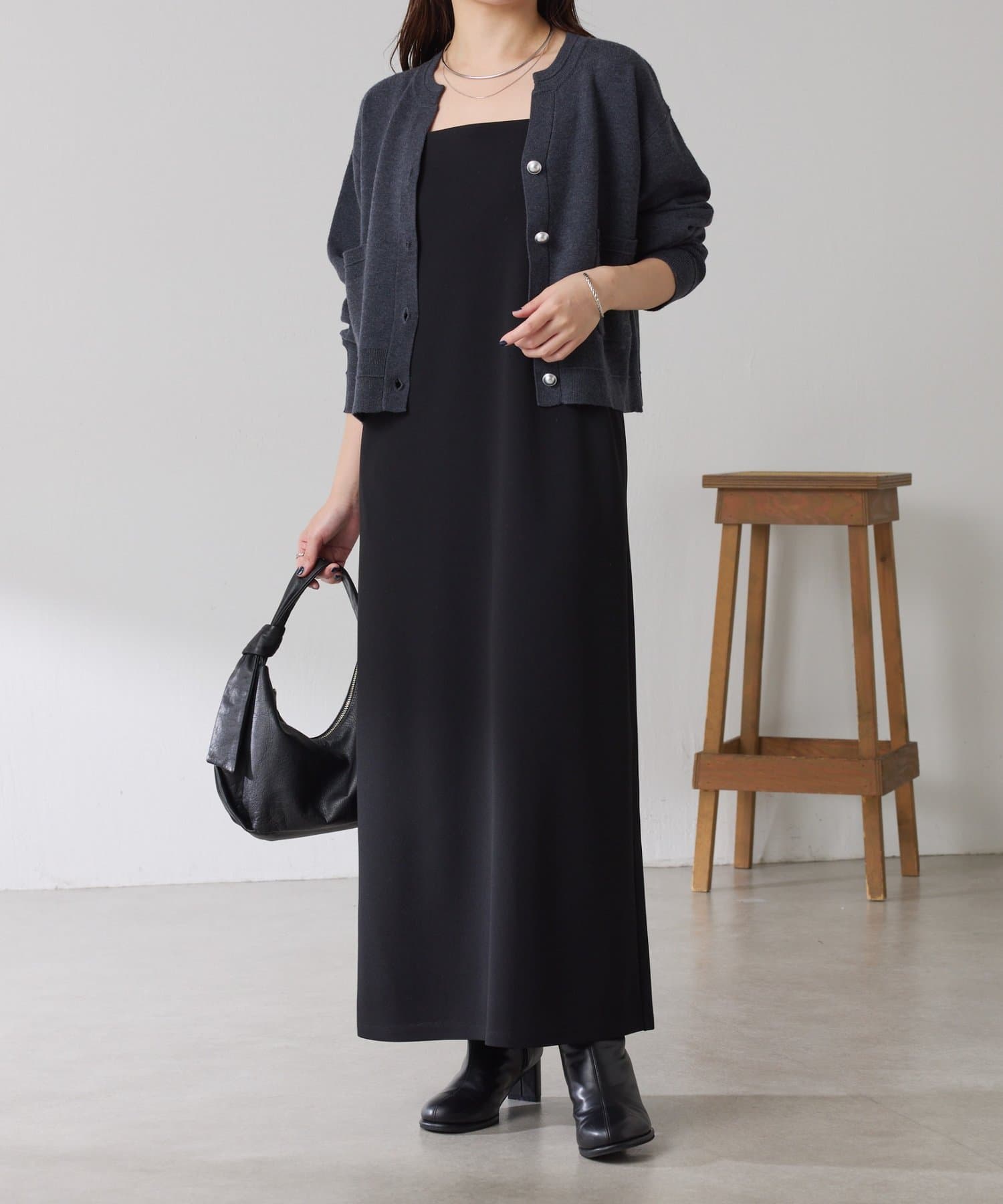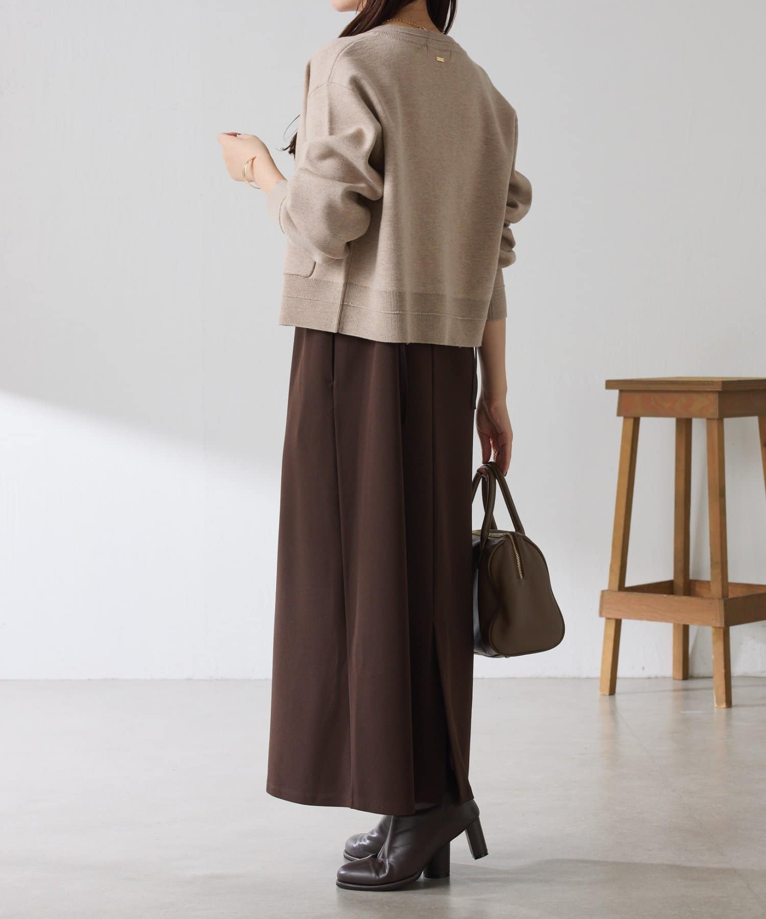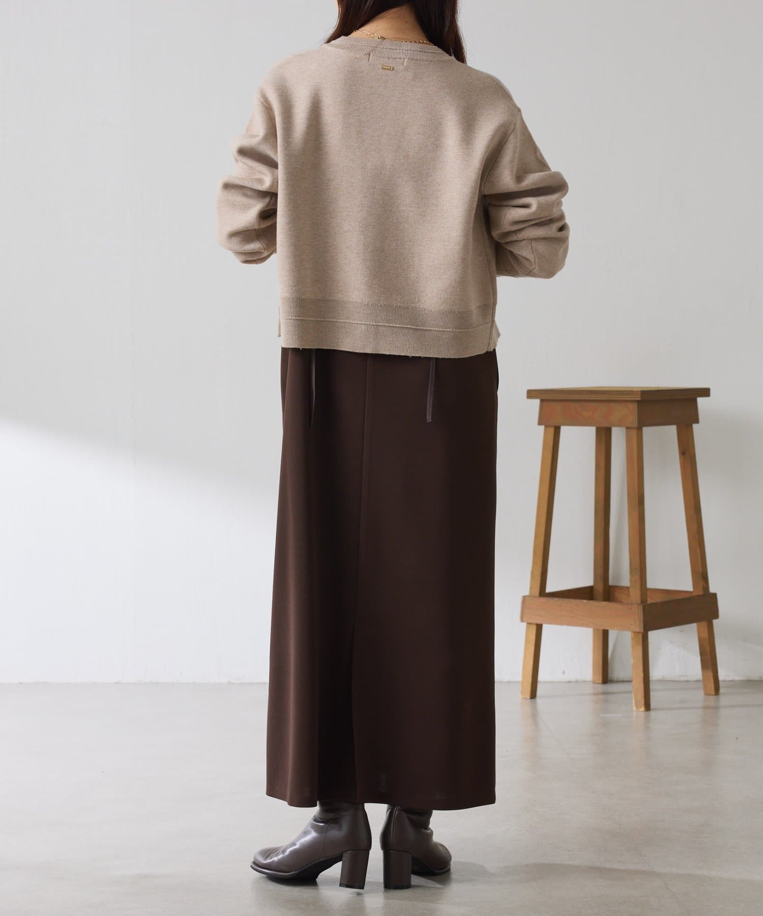 秋冬は、長めのニットを上から合わせてもショートカーディガンを合わせてもバランス良く決まります◎
