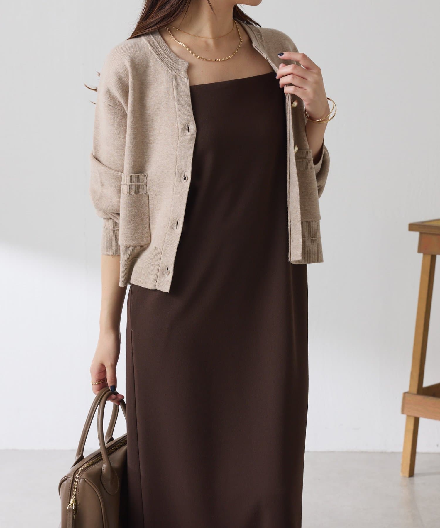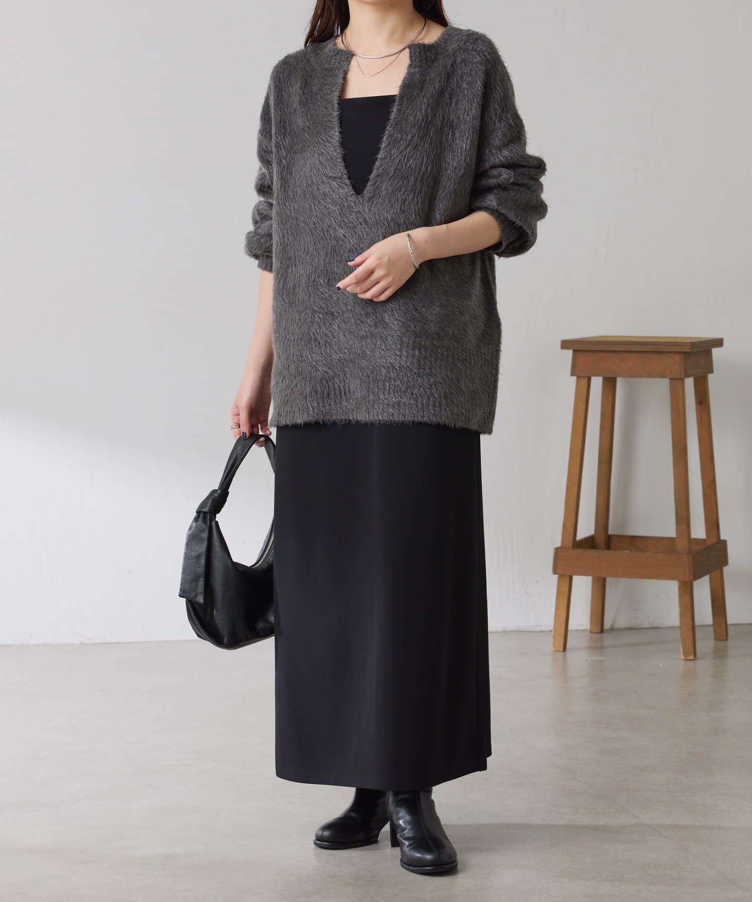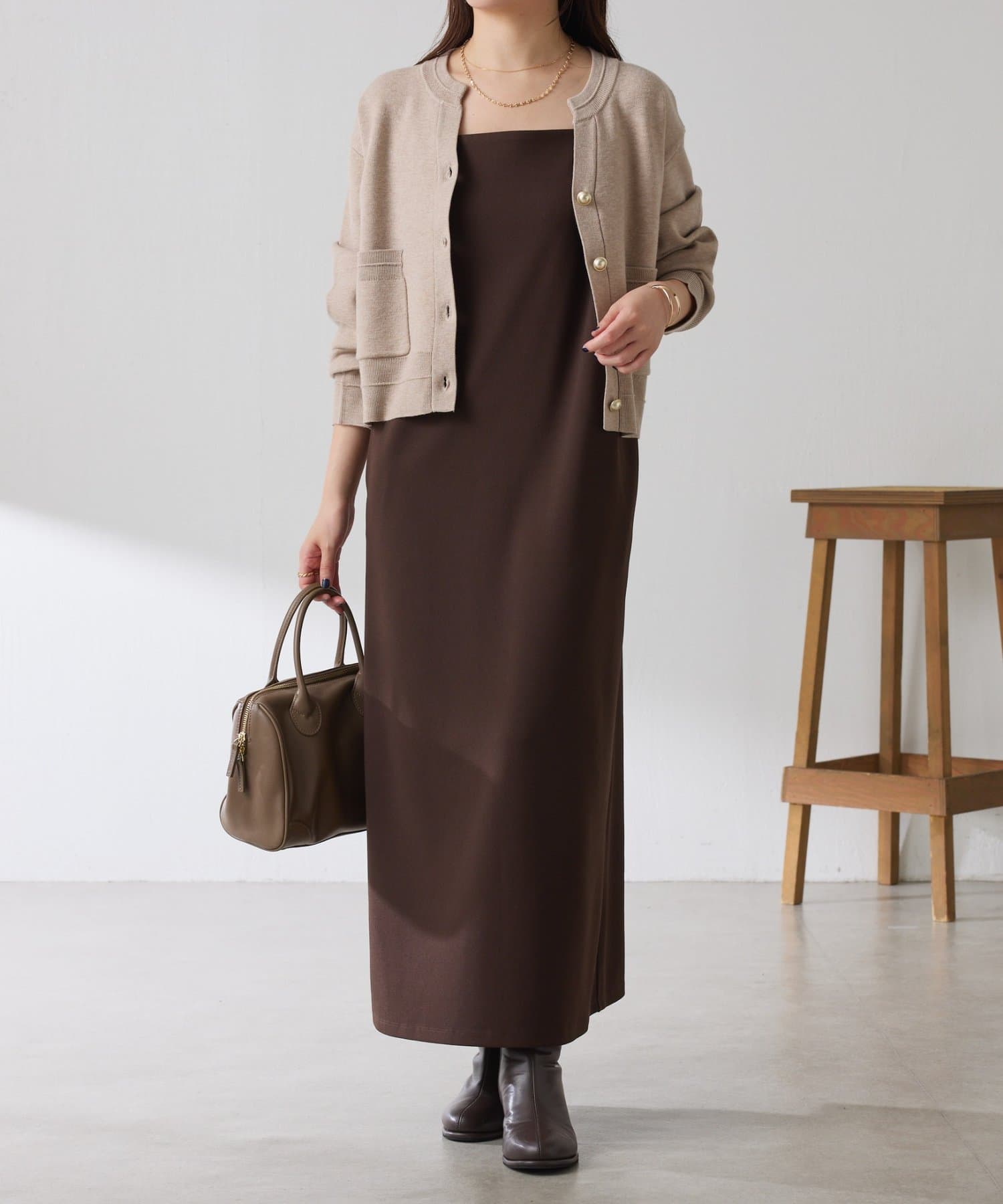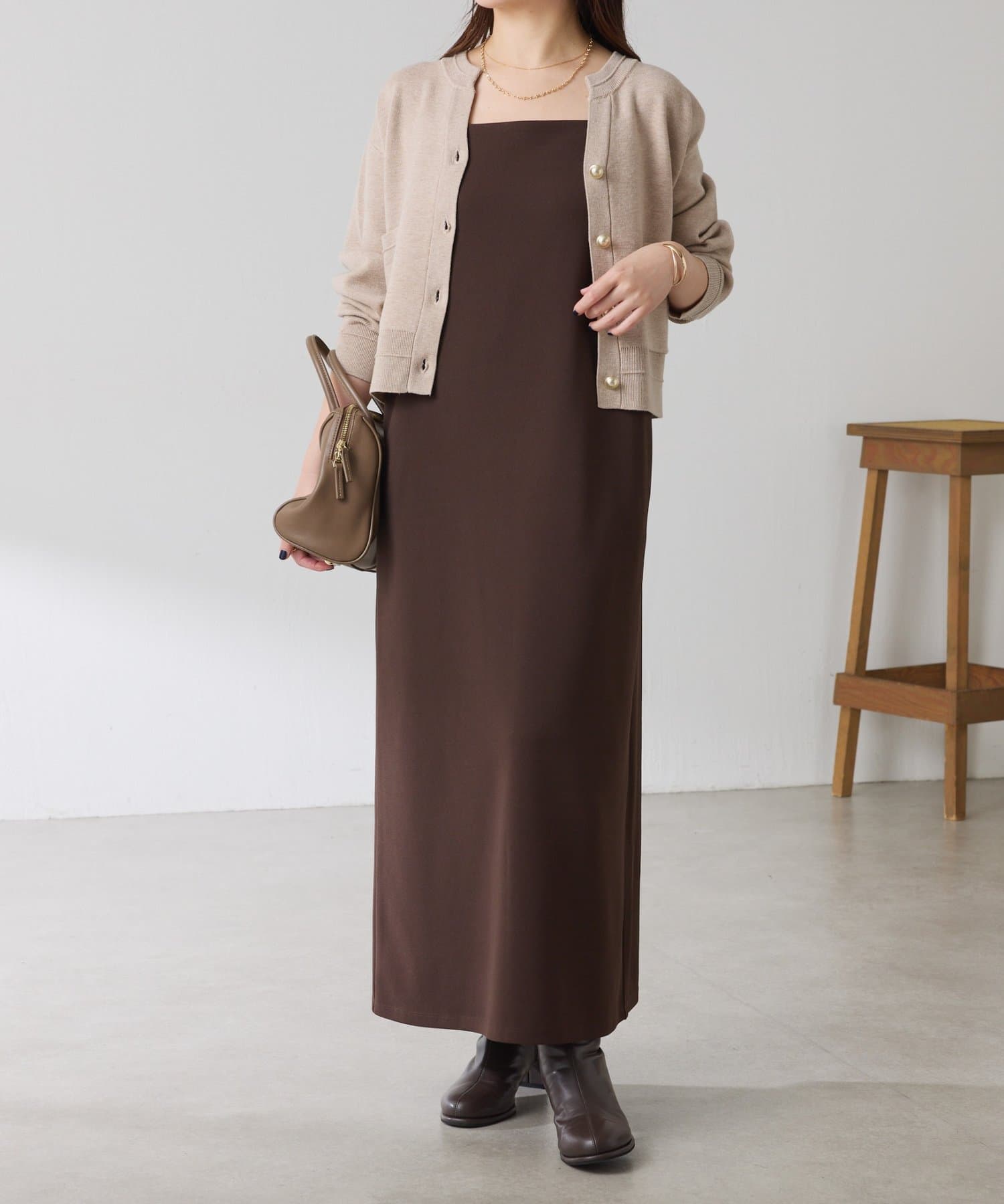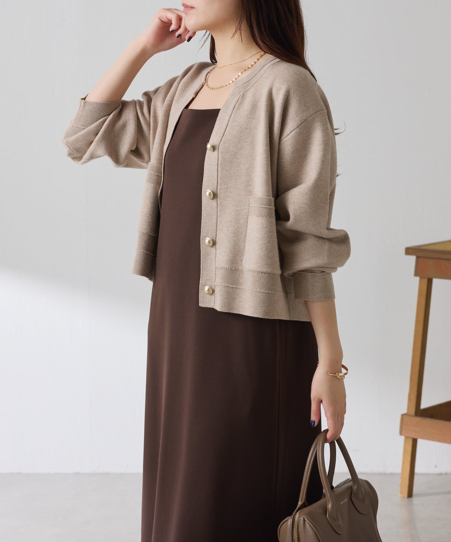 秋冬は、長めのニットを上から合わせてもショートカーディガンを合わせてもバランス良く決まります◎