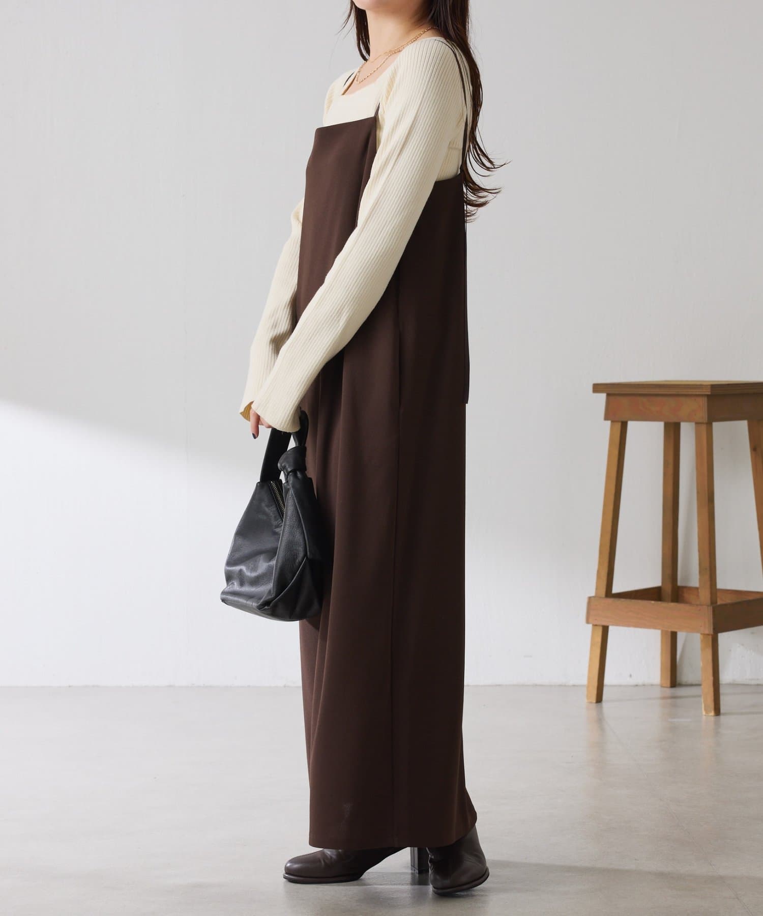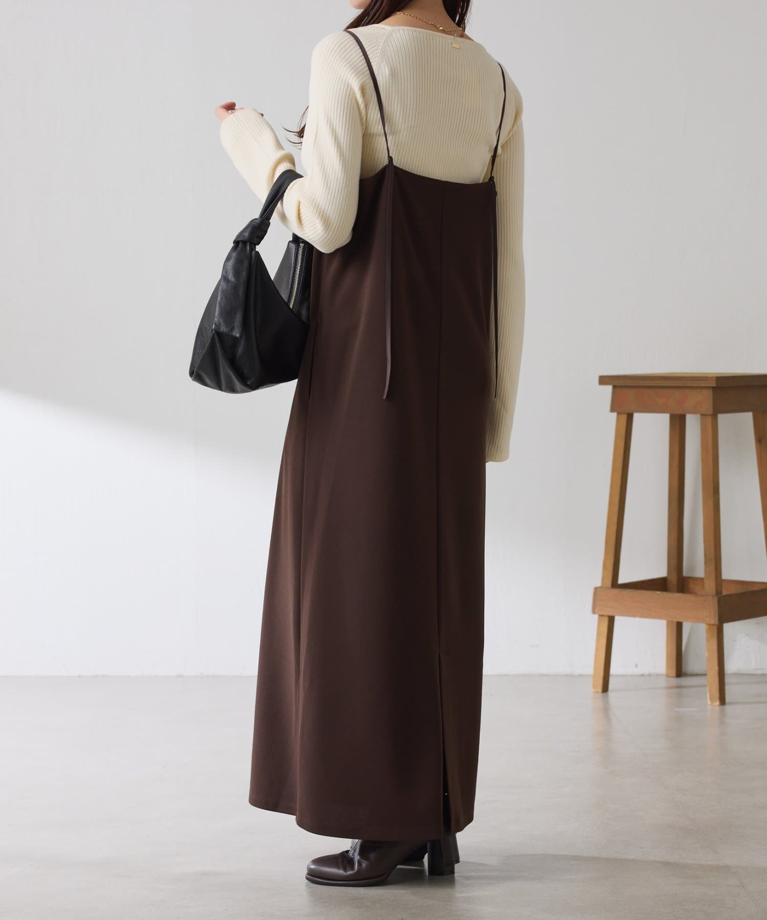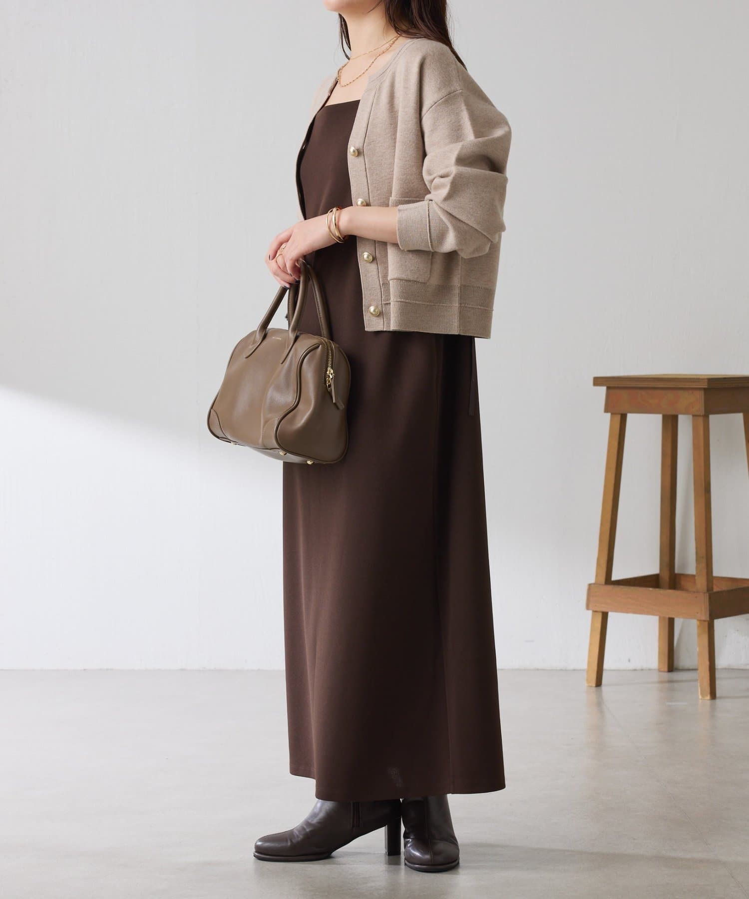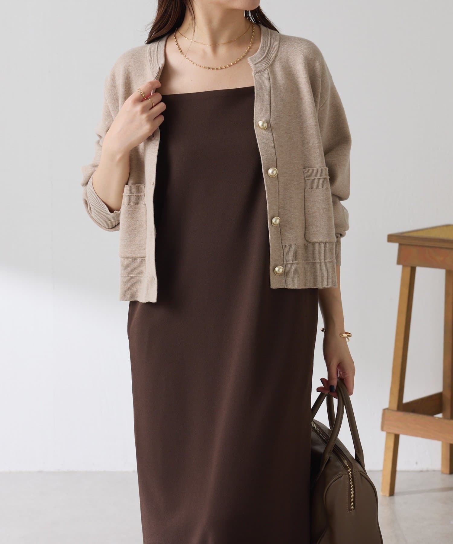 秋冬は、長めのニットを上から合わせてもショートカーディガンを合わせてもバランス良く決まります◎