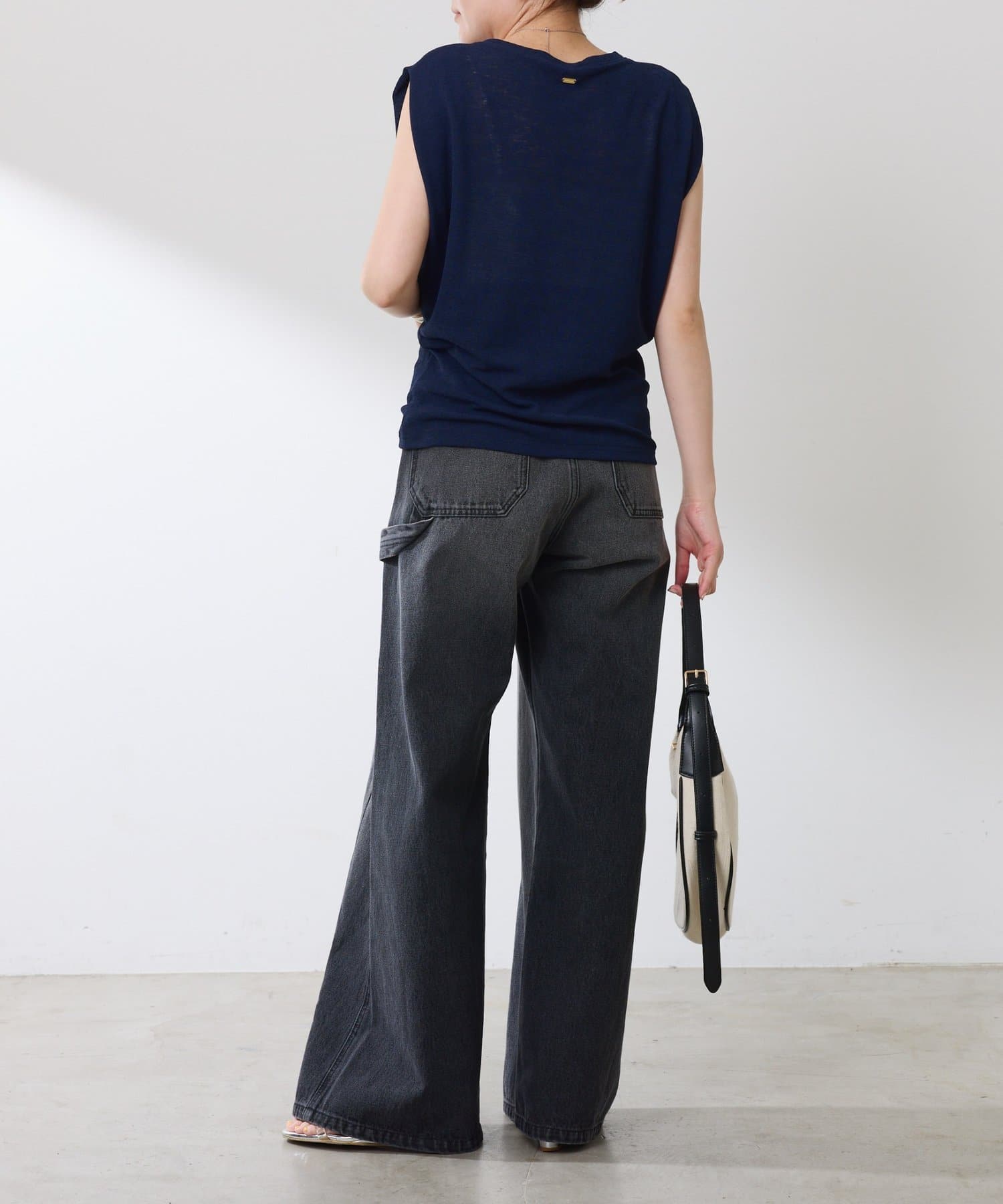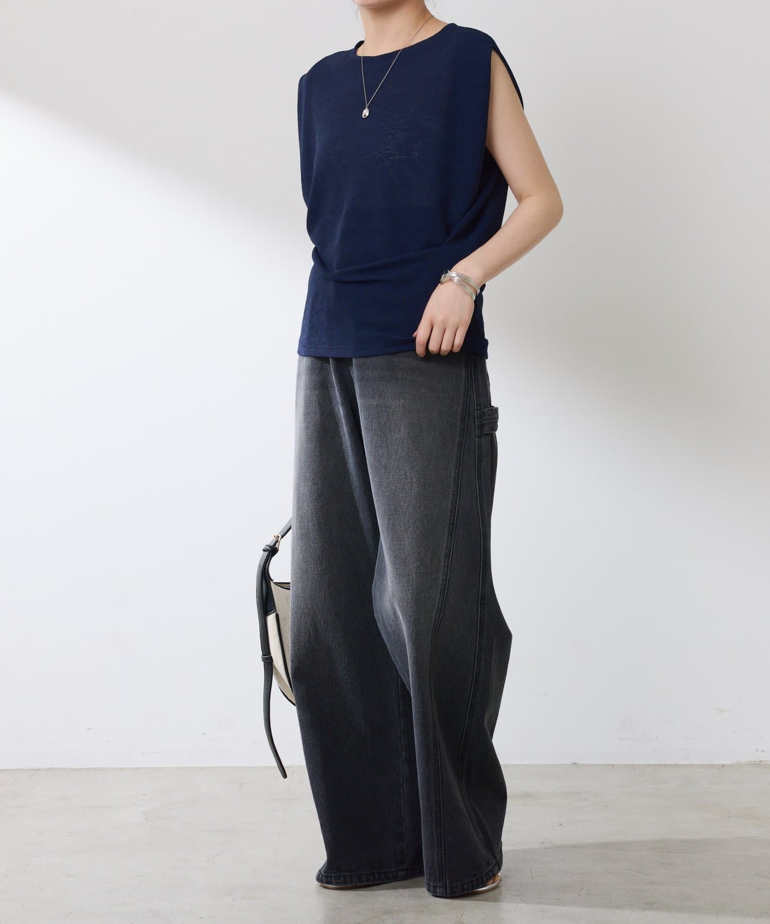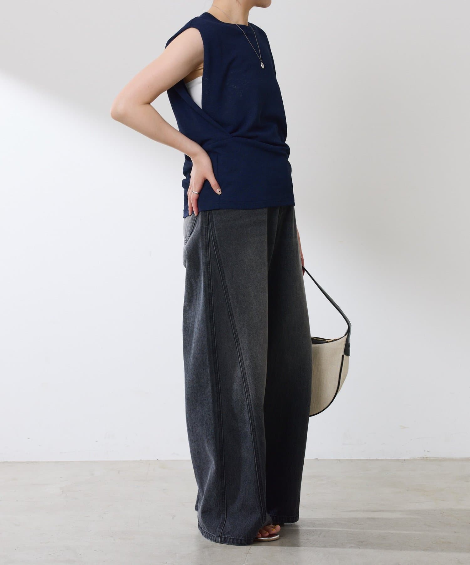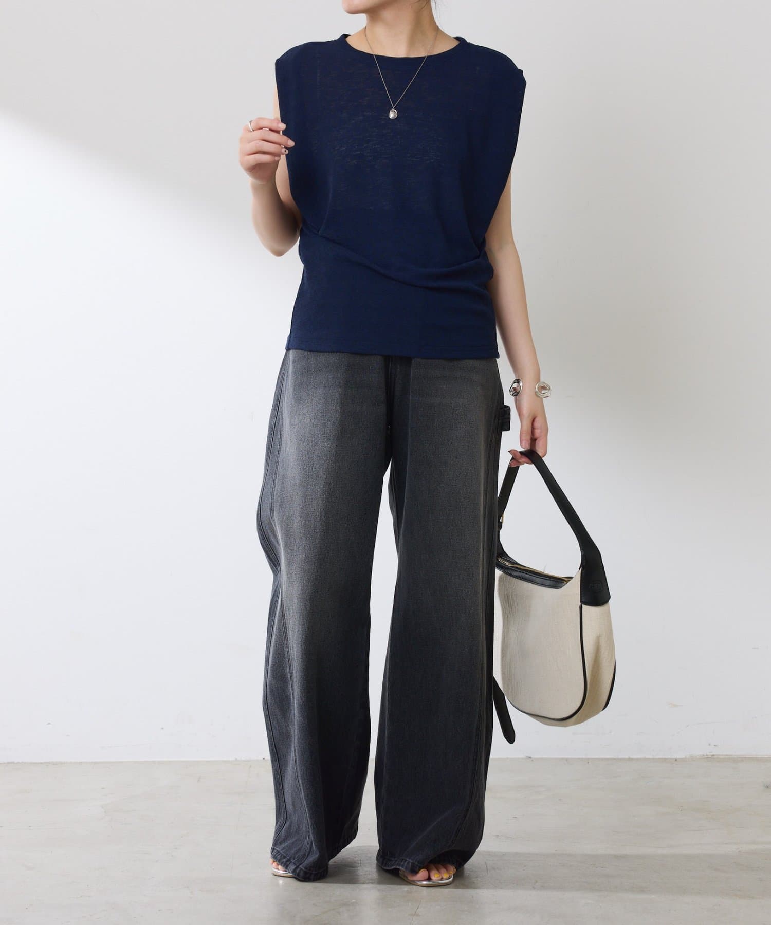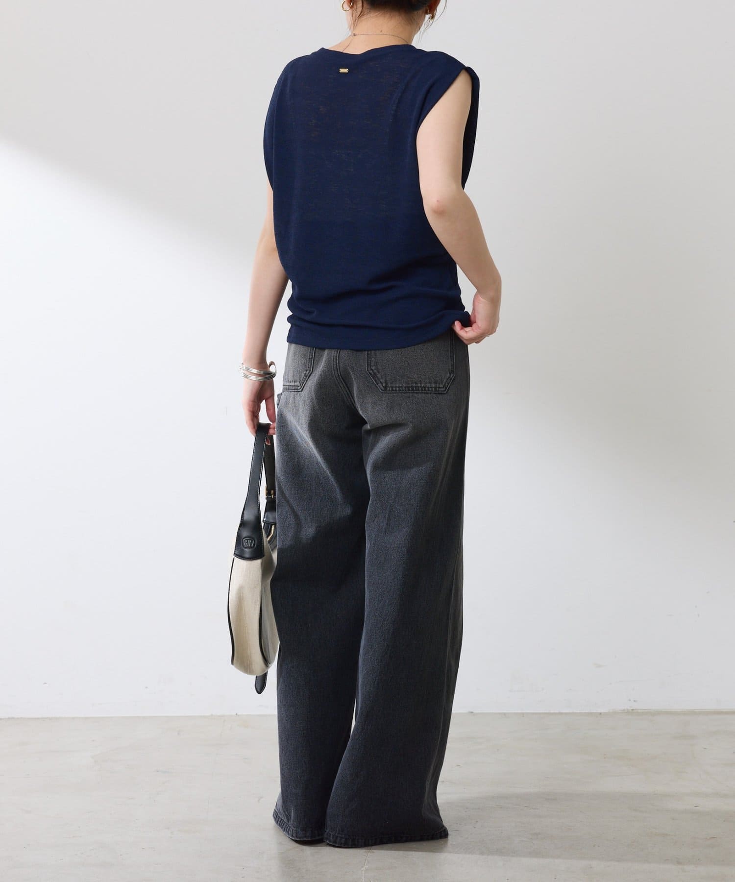 ネイビー:ブラックのワイドデニムと合わせる際は、シルバー系のサンダルやアクセサリーで抜け感を出すのがおすすめです。