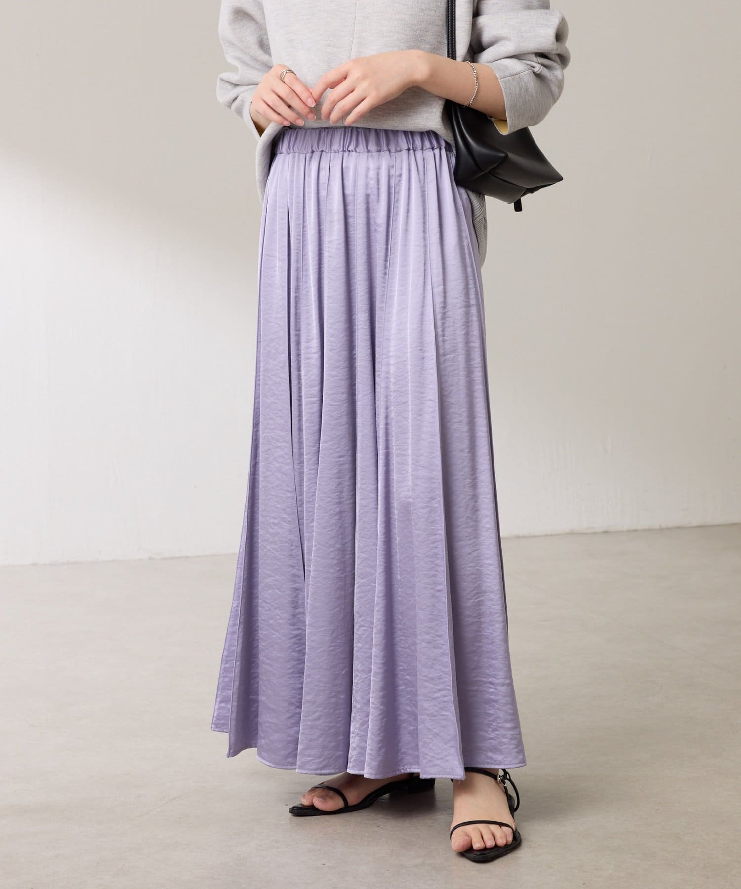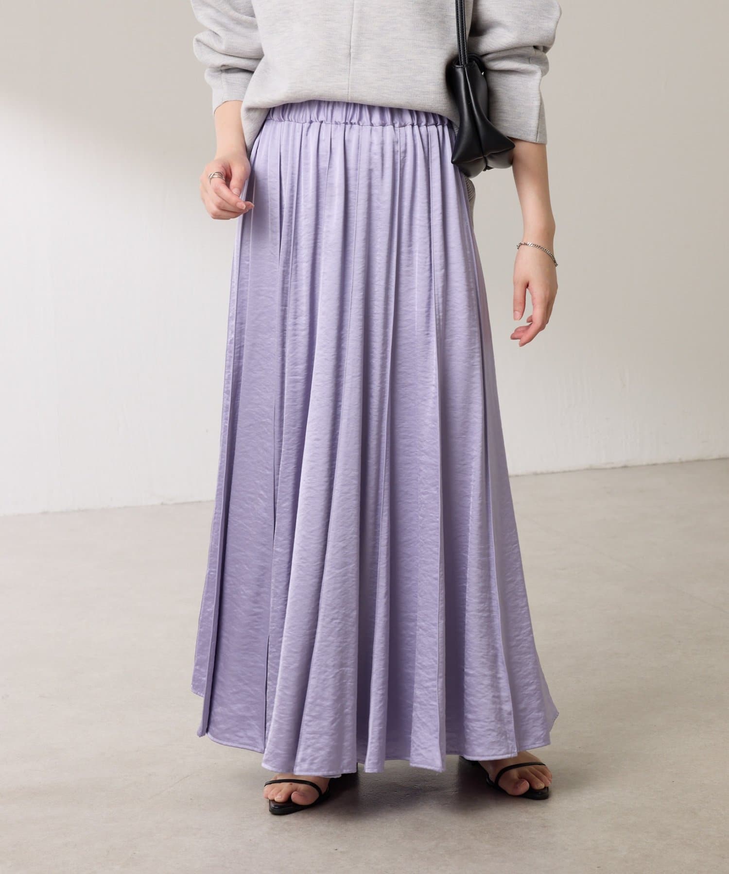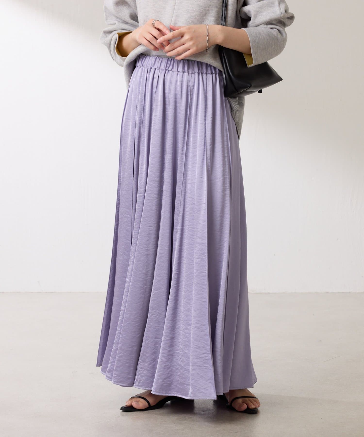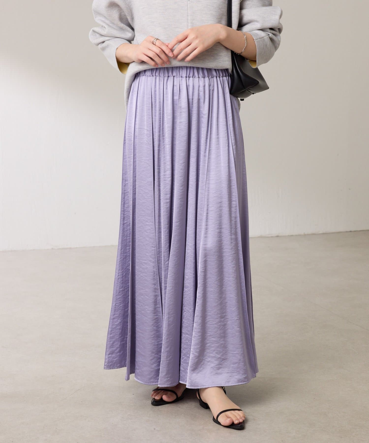 動くたびに優しく揺れるサテンフレアスカート