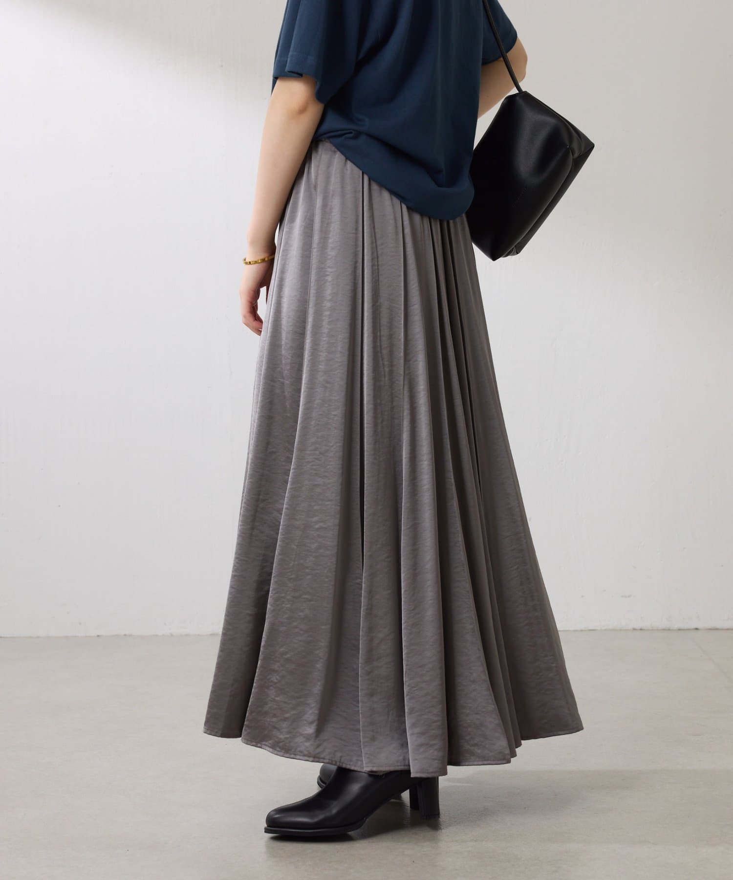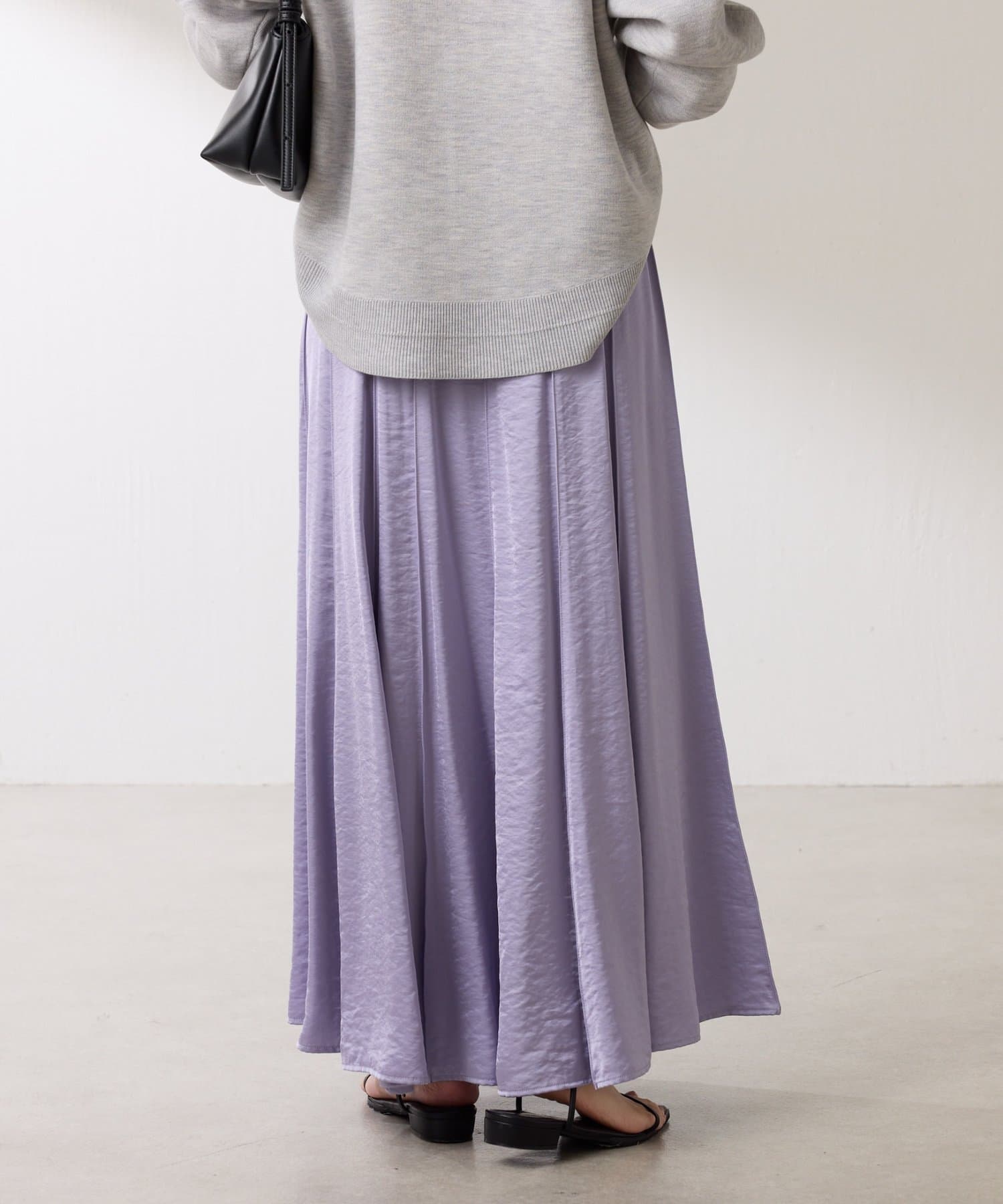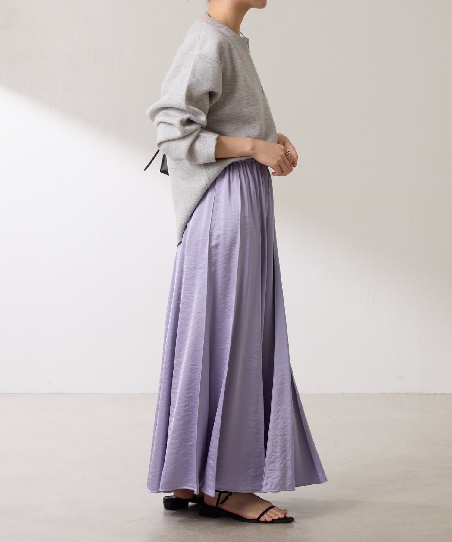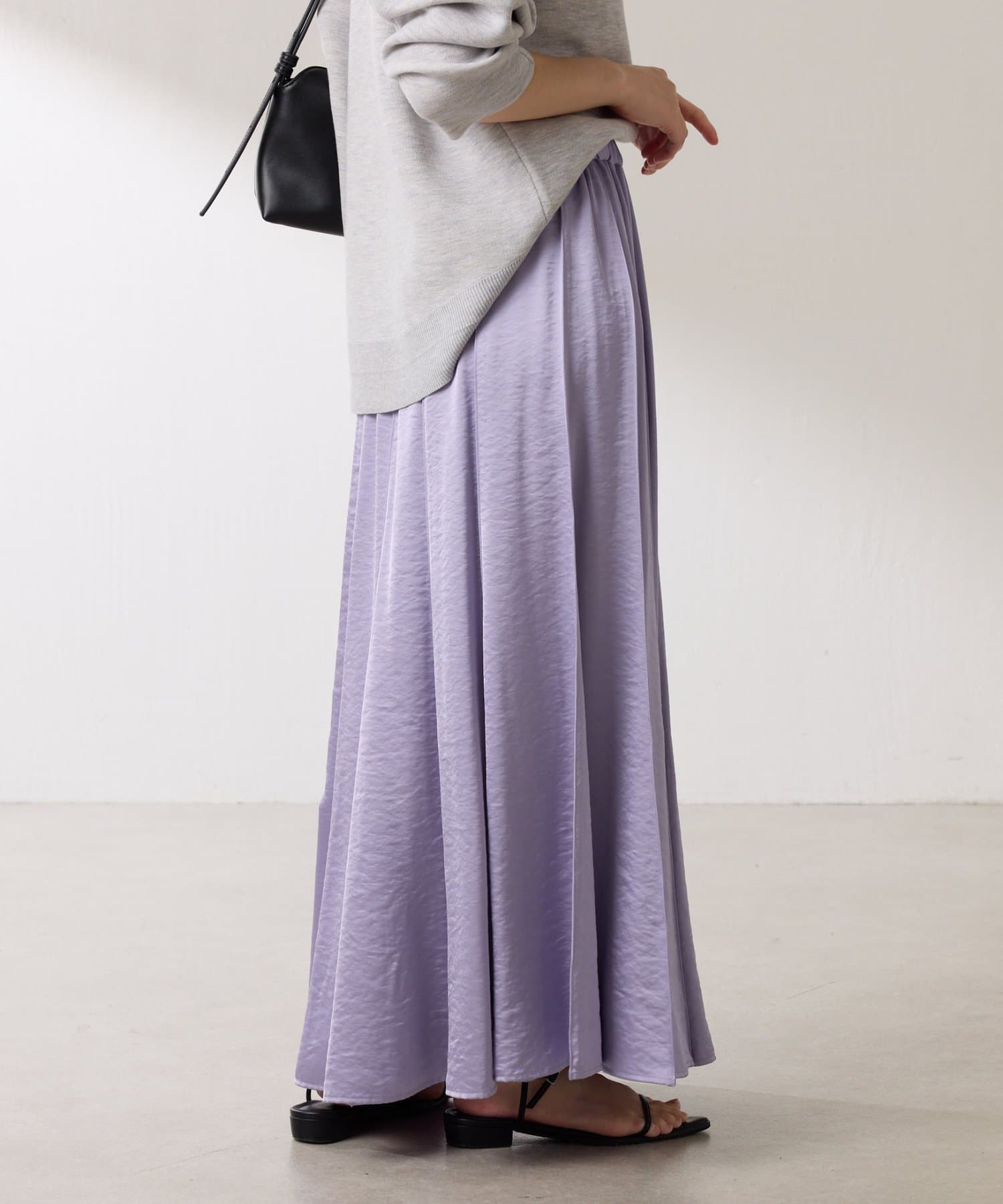 動くたびに優しく揺れるサテンフレアスカート