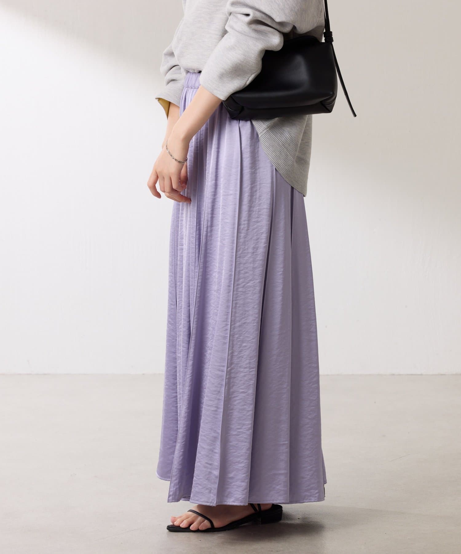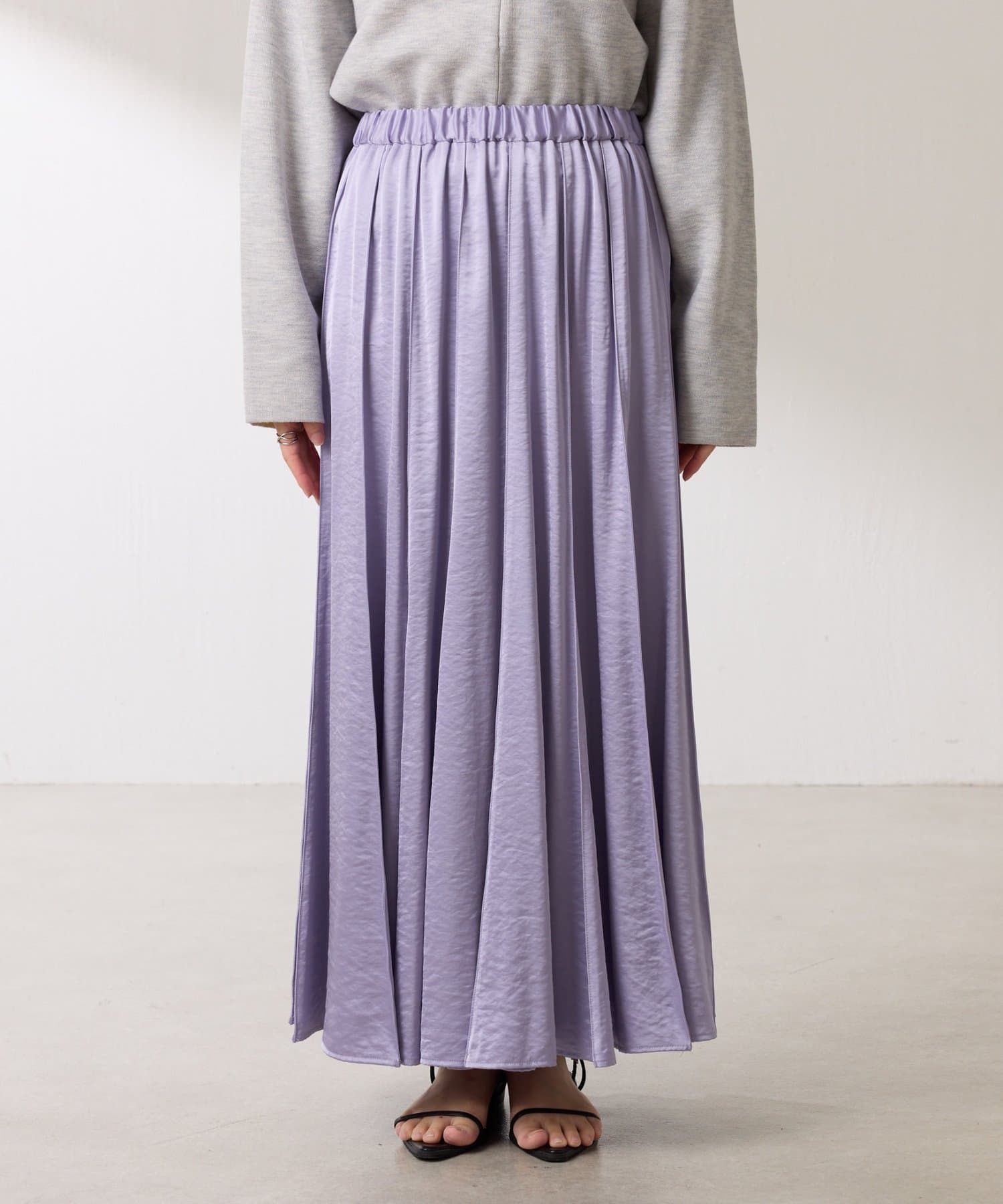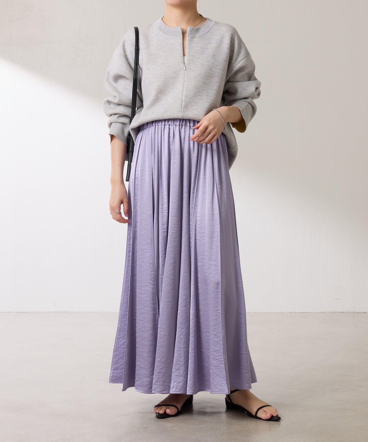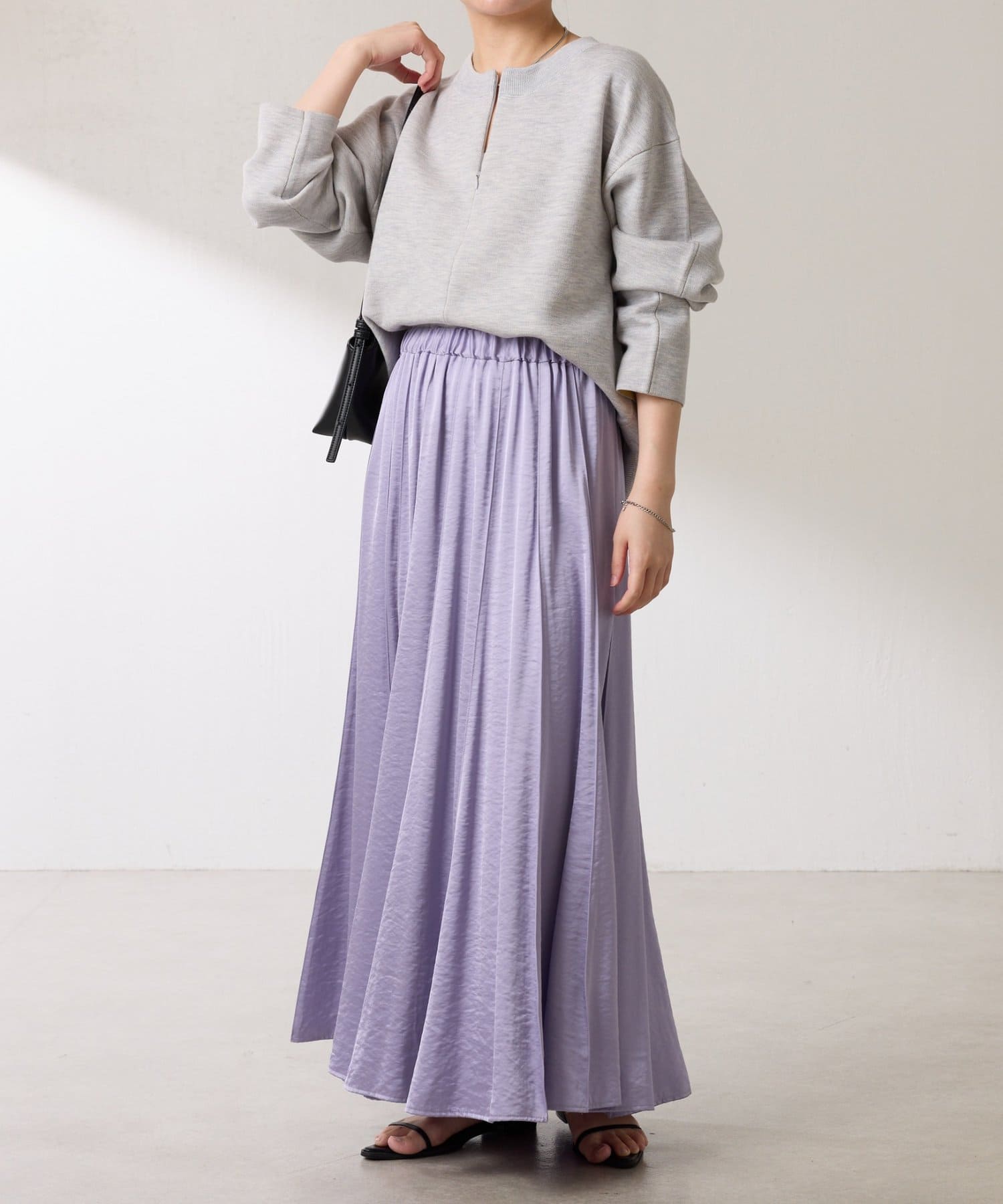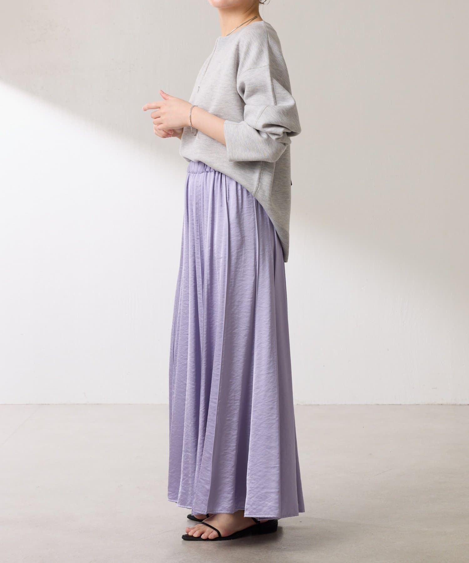 動くたびに優しく揺れるサテンフレアスカート