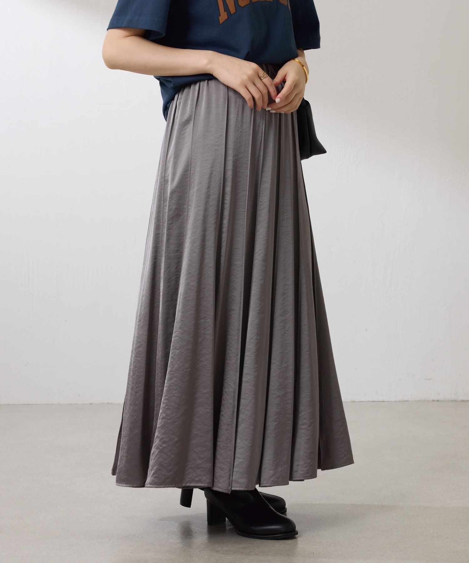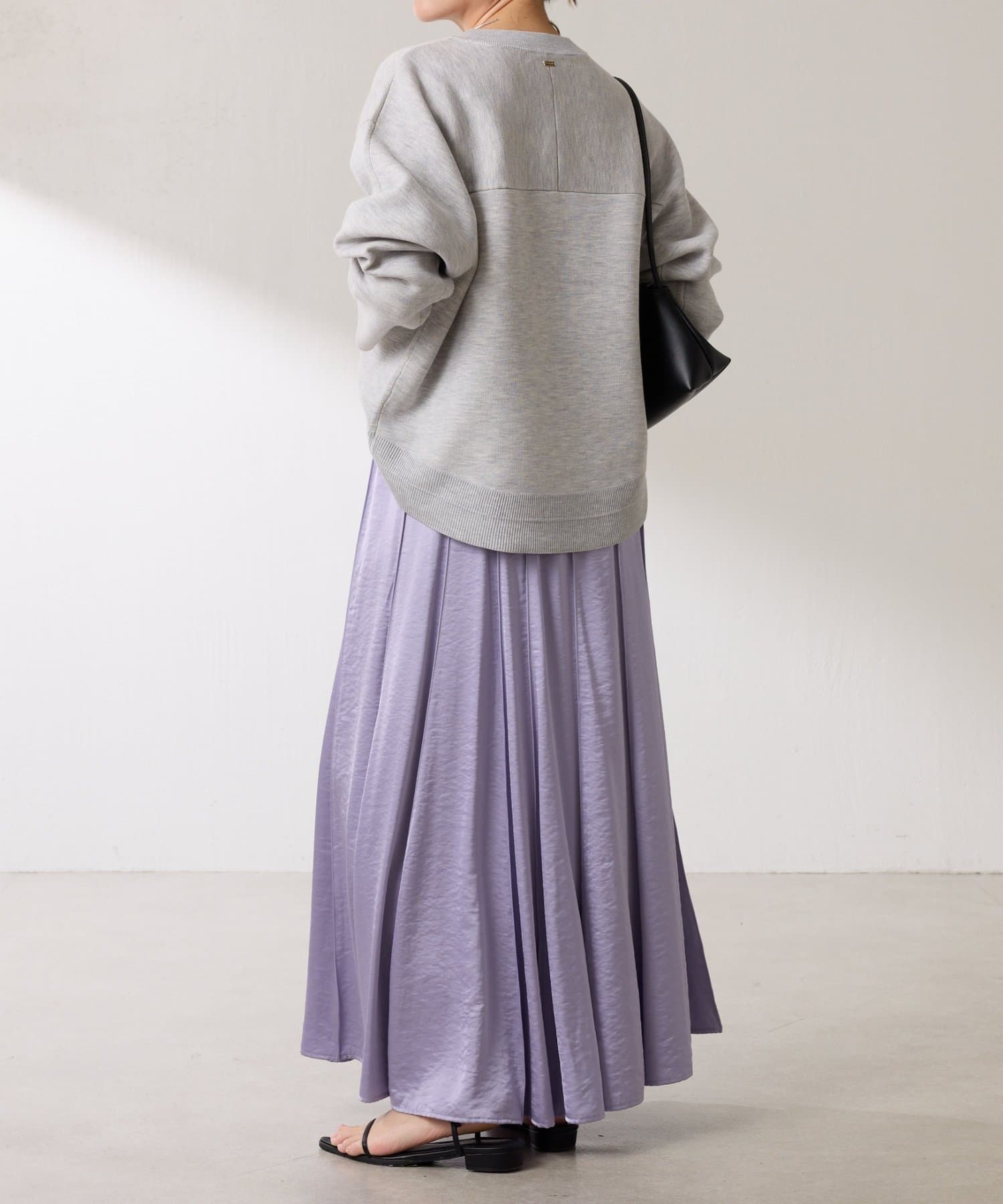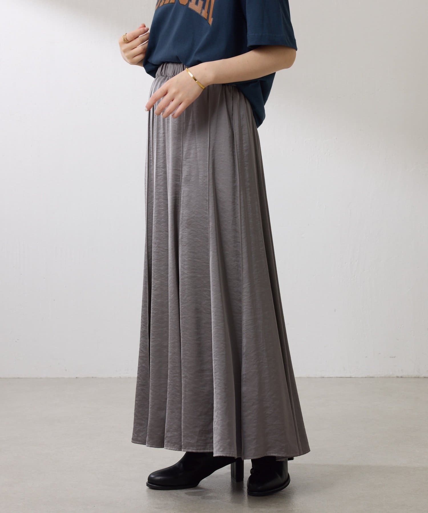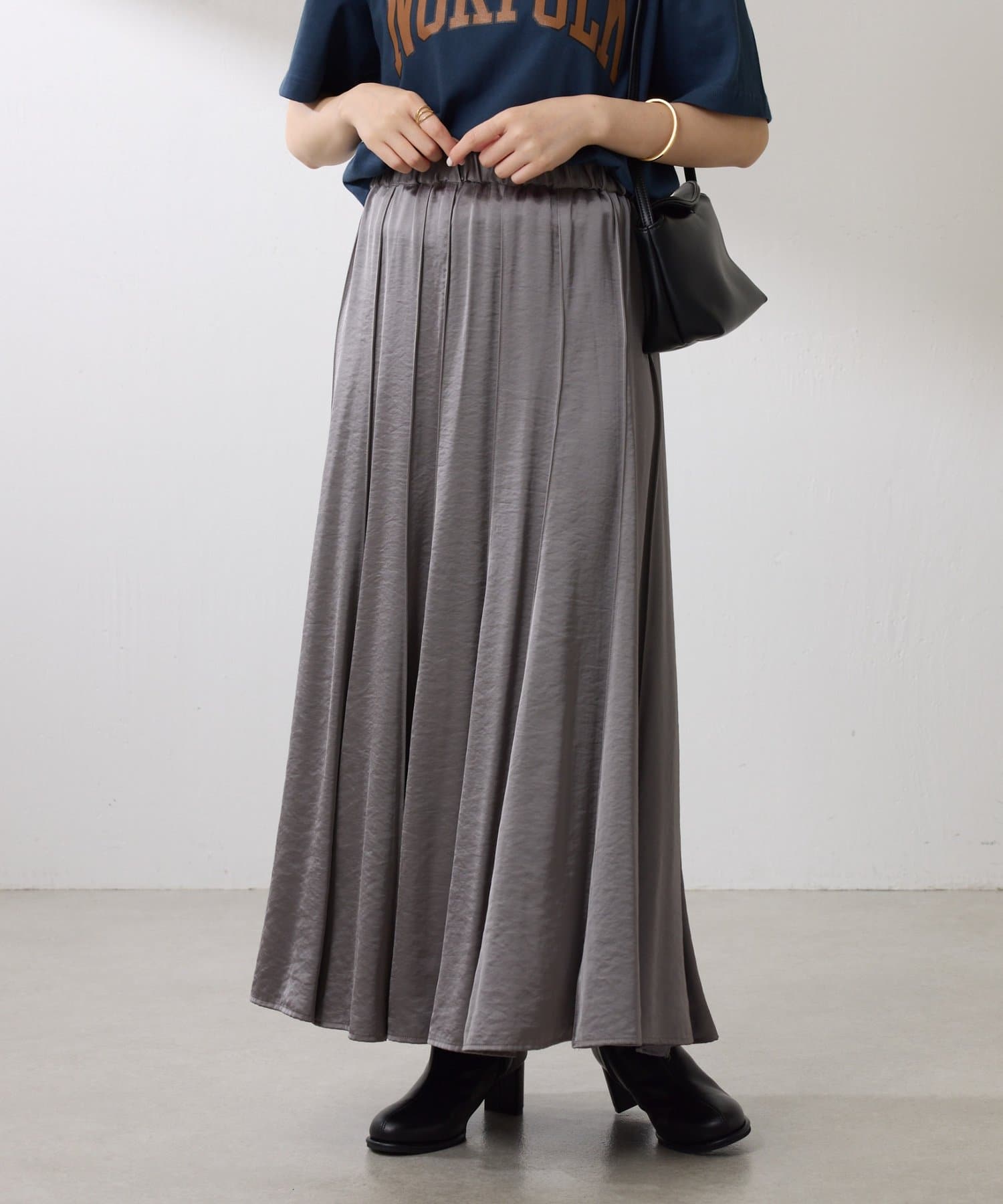 動くたびに優しく揺れるサテンフレアスカート