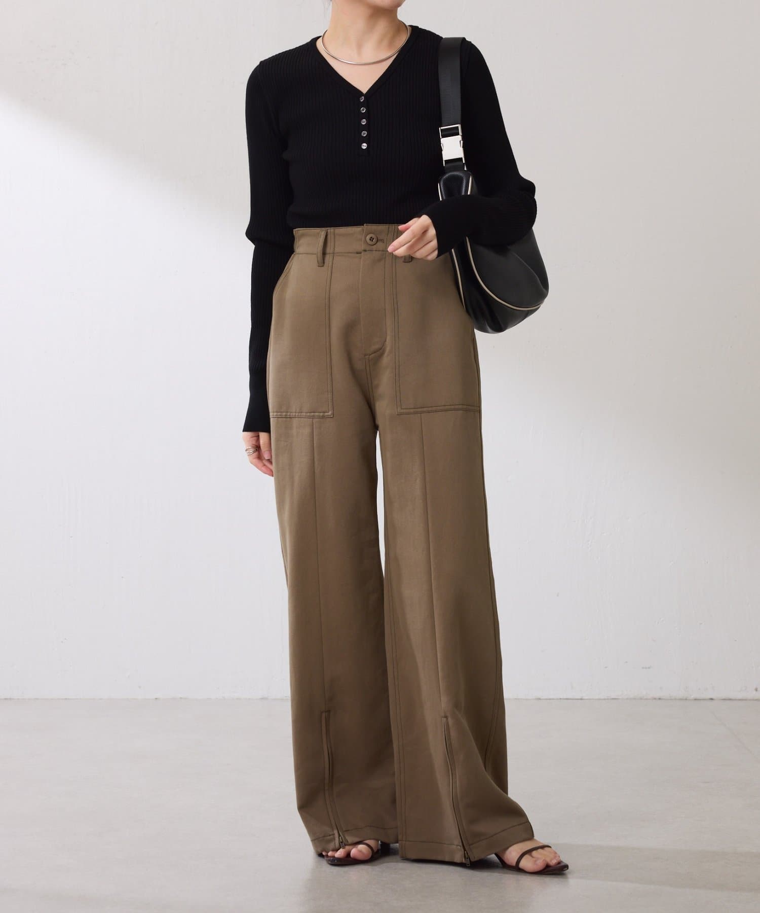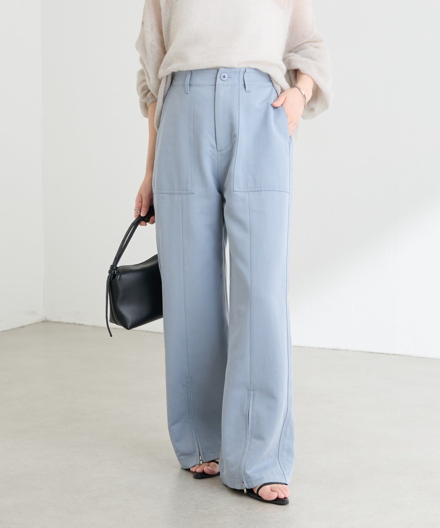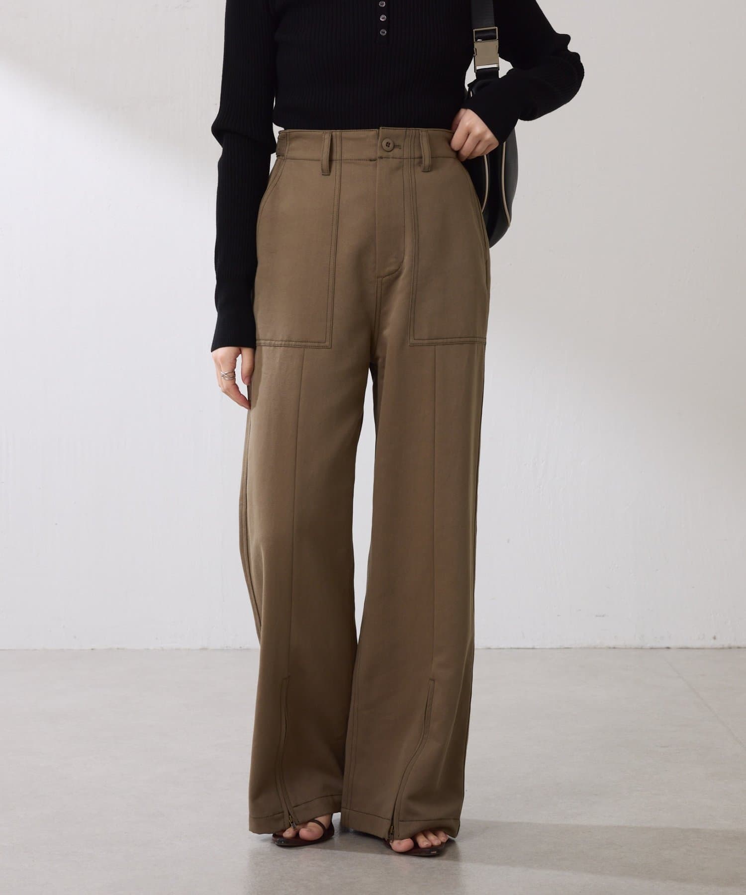 ・ジップを閉めるとストレート、開けるとややフレアシルエットになるので、合わせるシューズや好みによって雰囲気を変えて楽しめます。