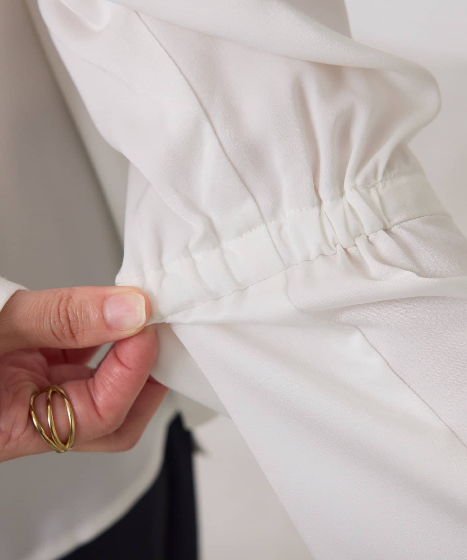 ・袖のフレアの切替部分にゴムを入れており、捲りやすくしました◎ゴムは内側のみに入れており、すっきり見えも叶います