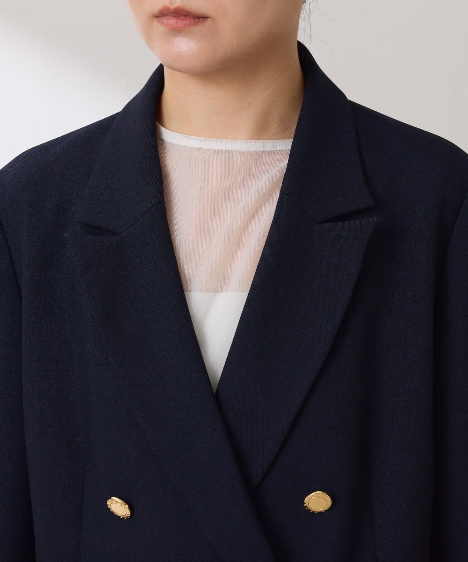 ・襟はセミノッチドラペルのダブルにしており、抜け感がありオンオフ使いやすいです。