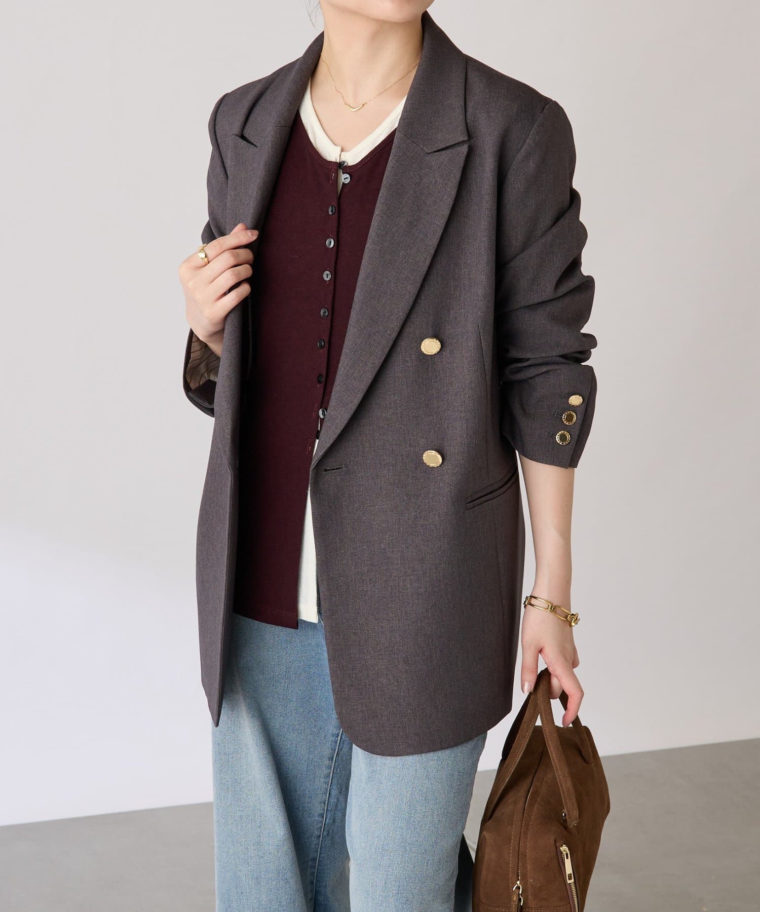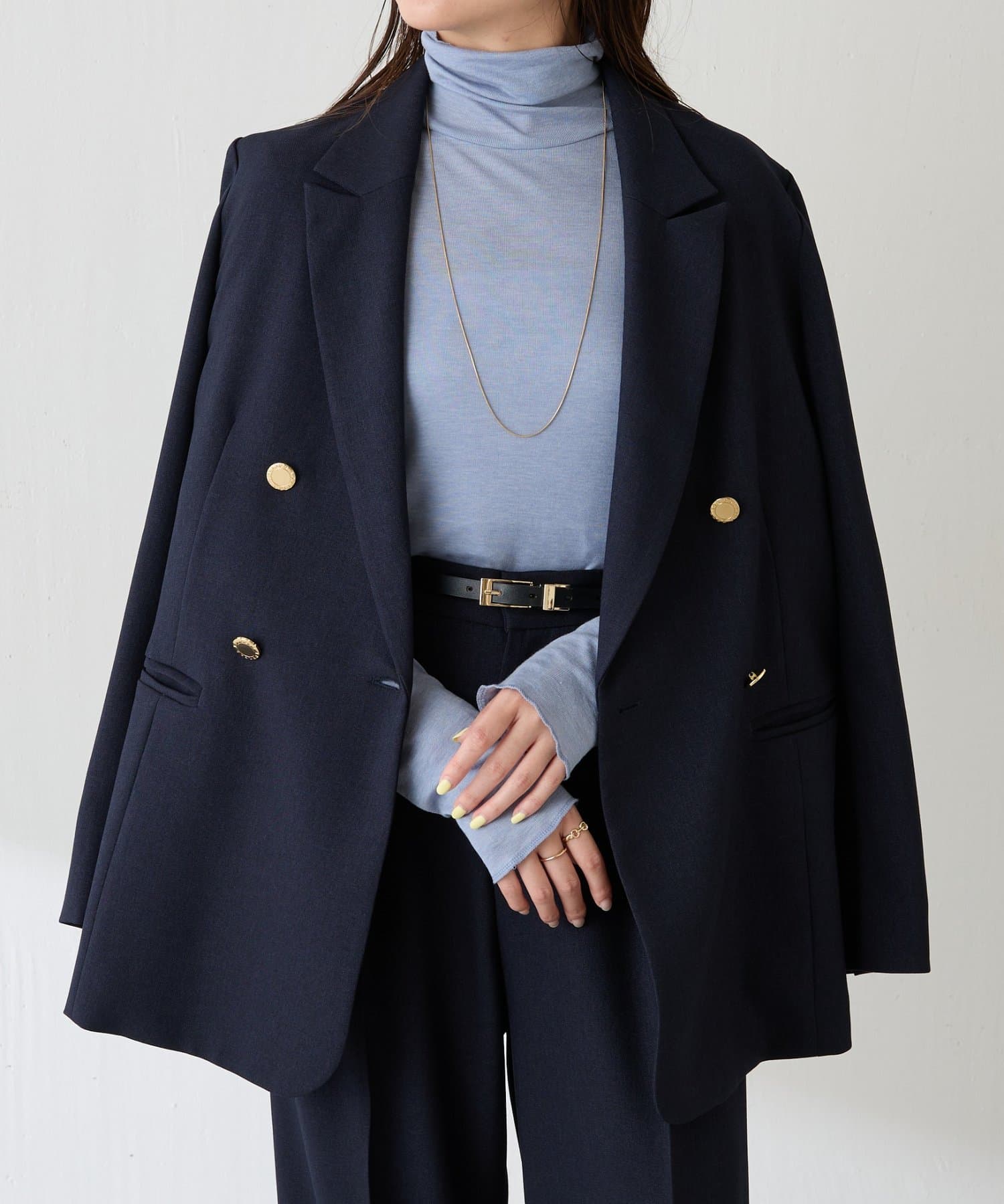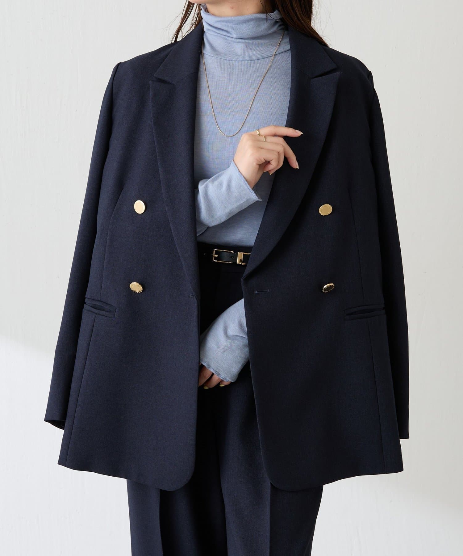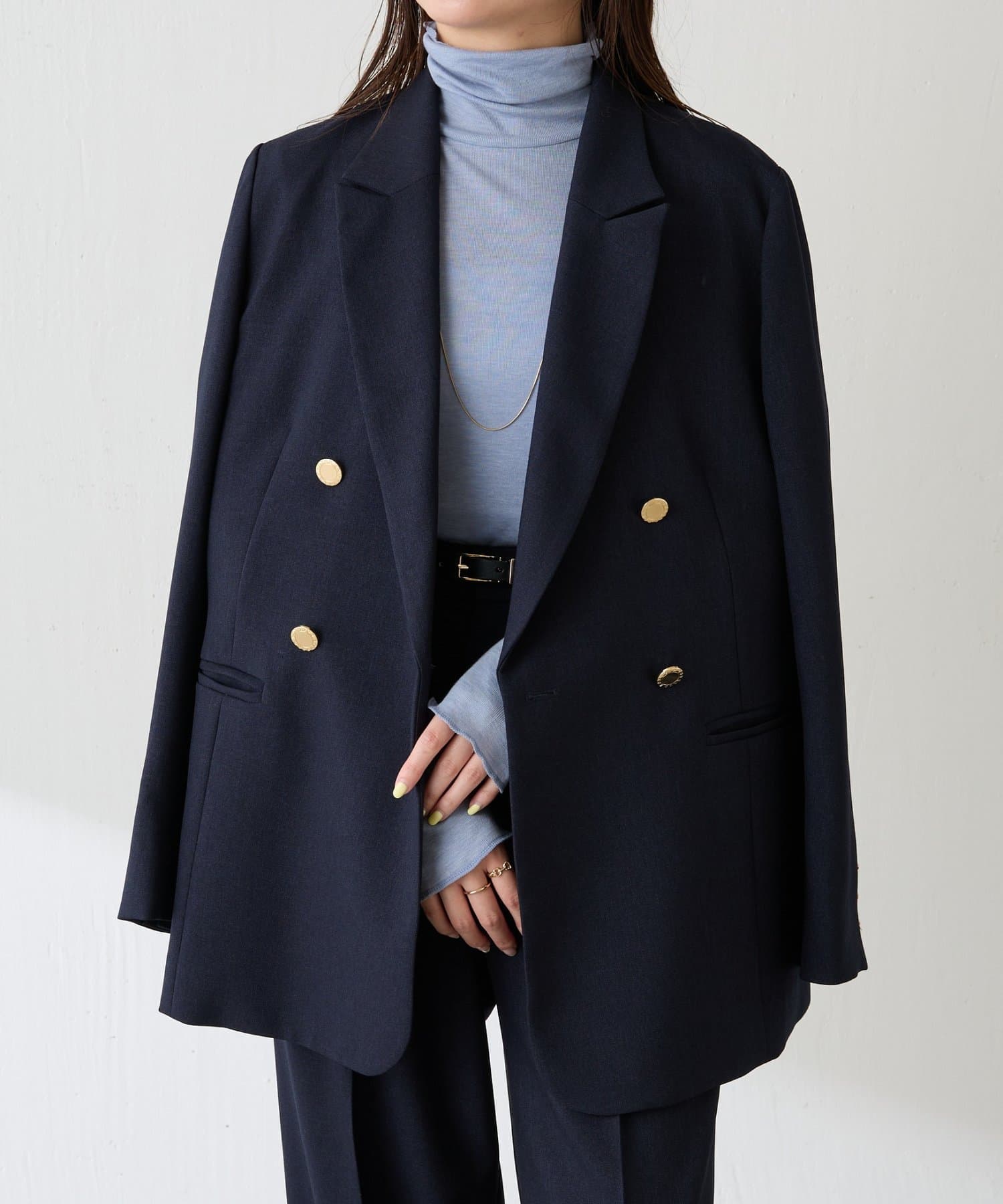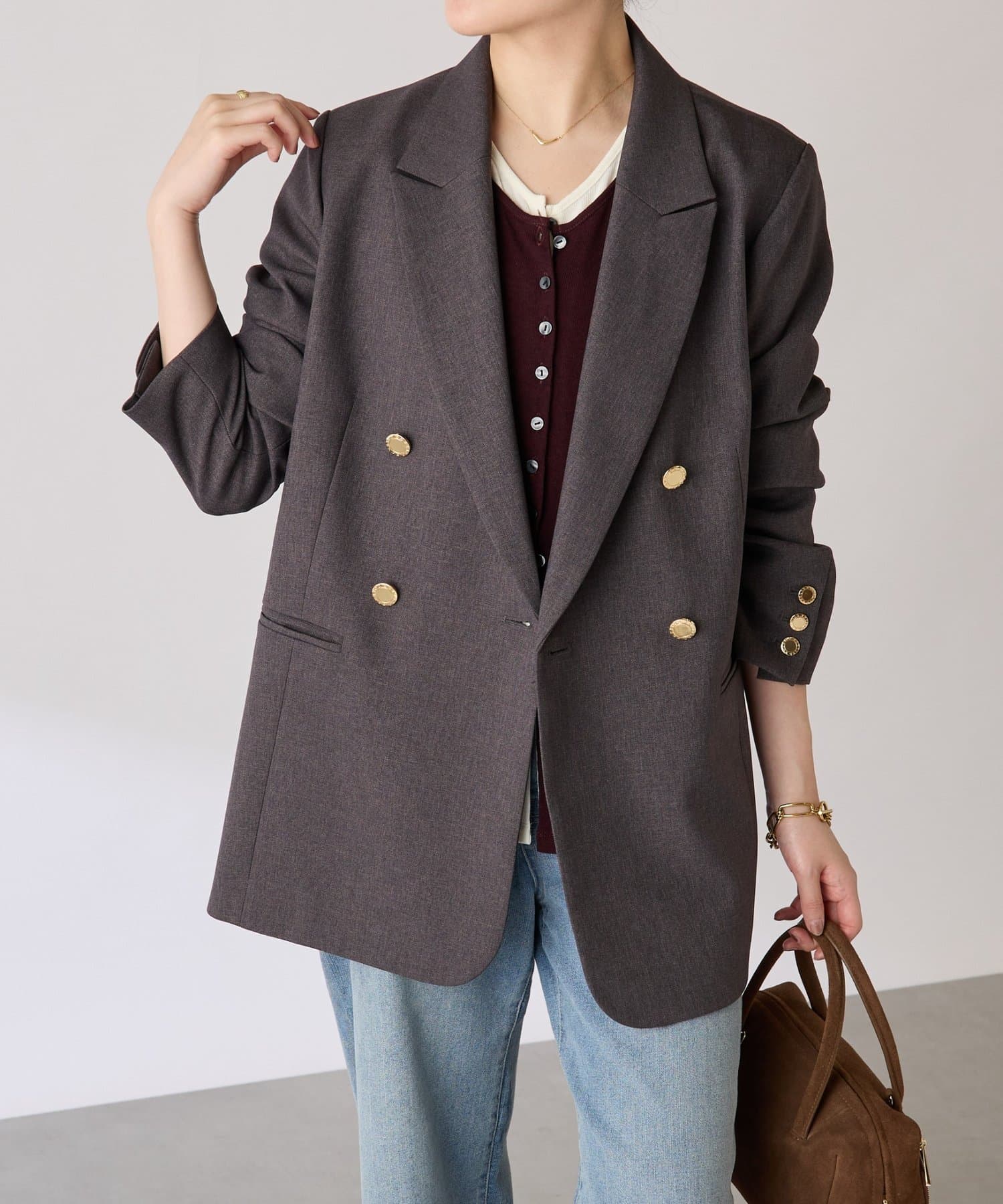 ・襟はセミノッチドラペルのダブルにしており、抜け感がありオンオフ使いやすいです。
