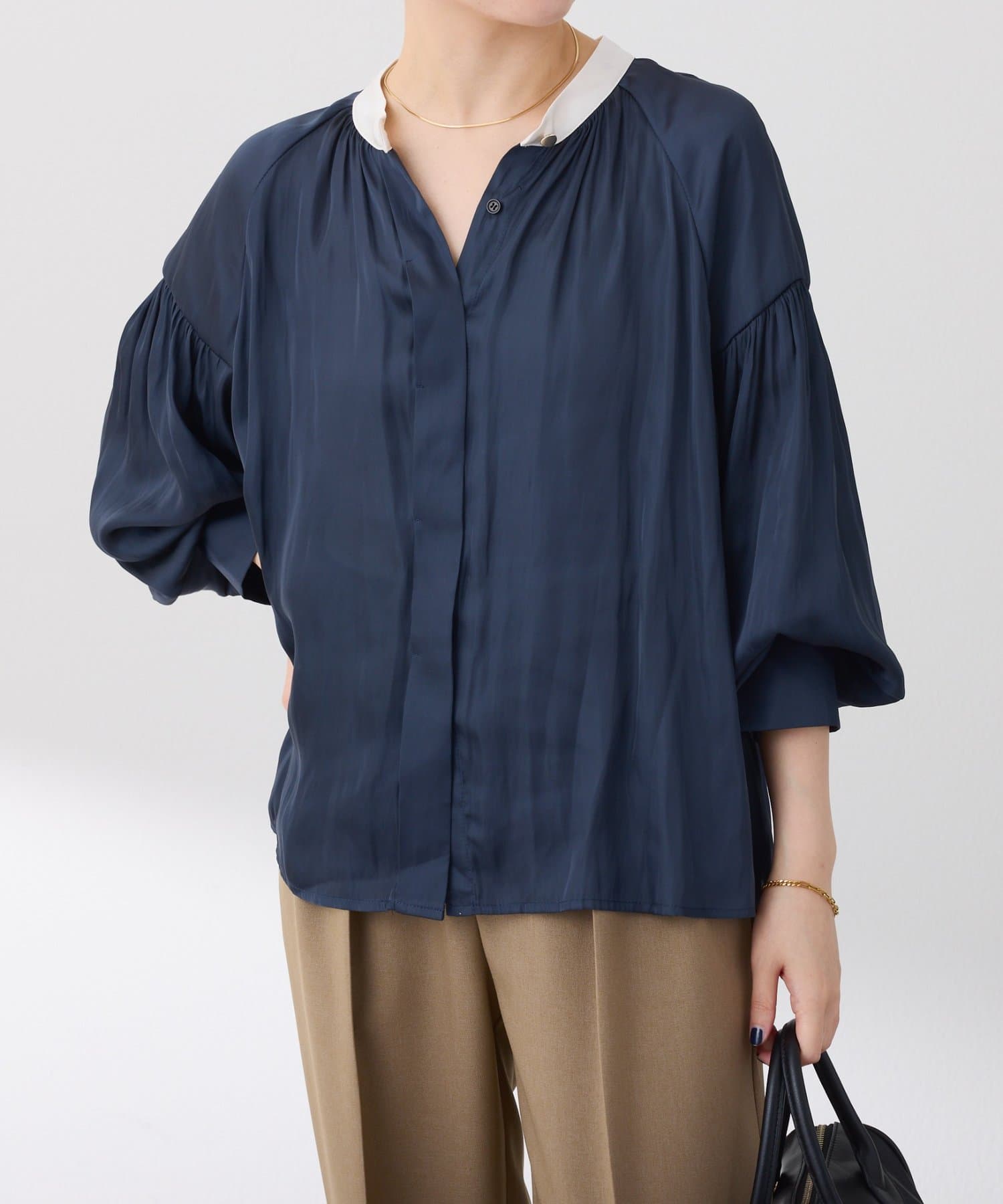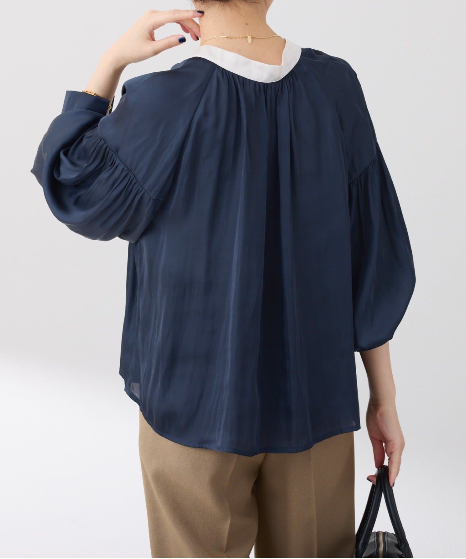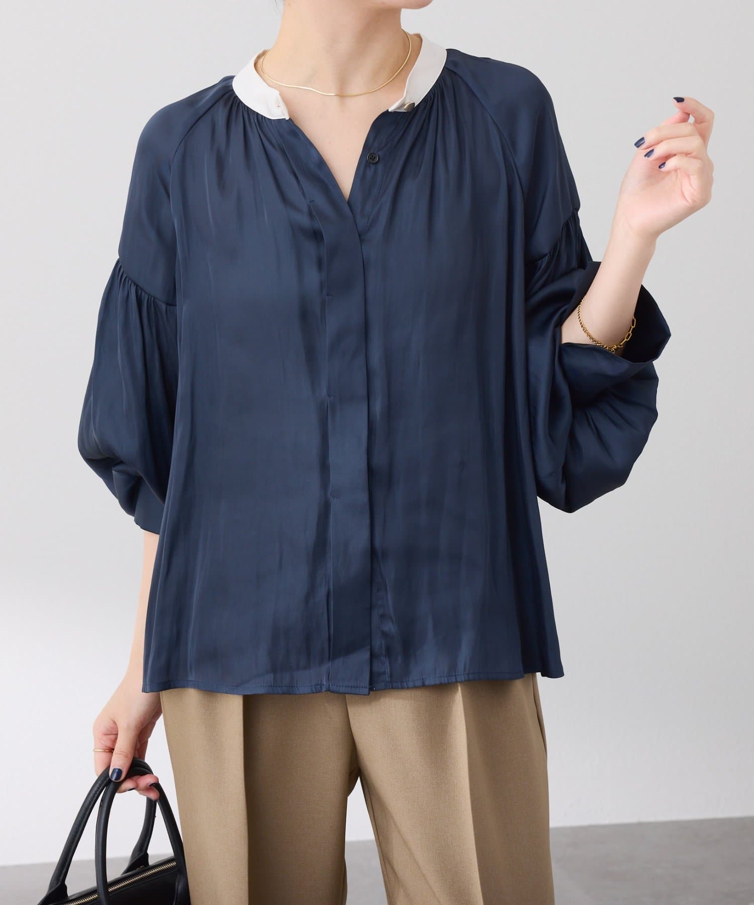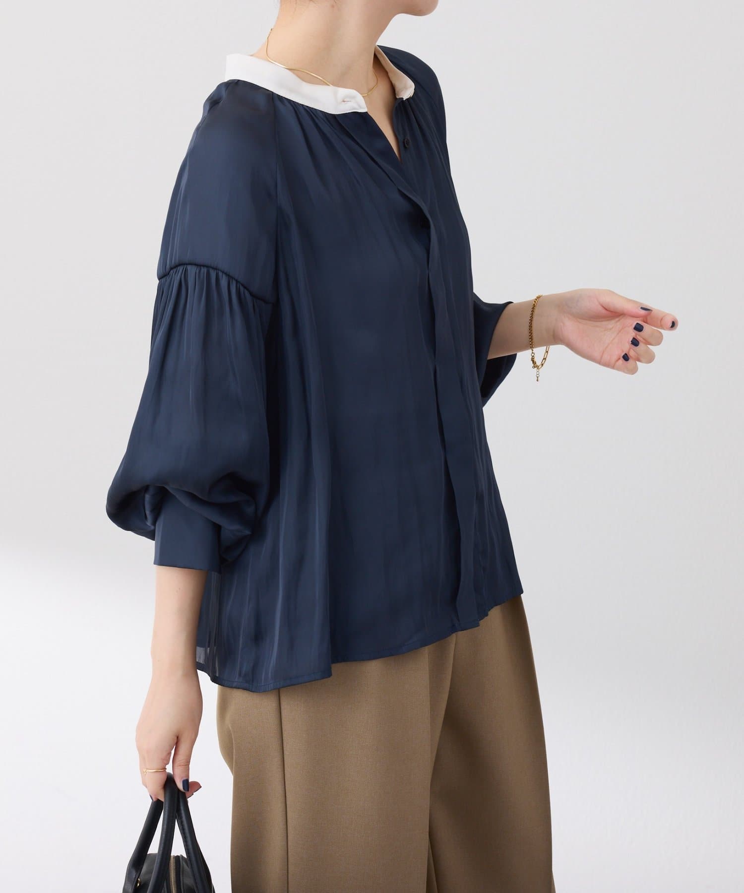 ・身頃と襟の配色のデザインがポイントのサテンブラウス。
