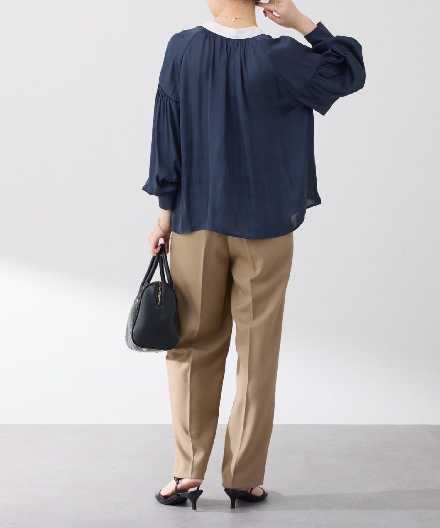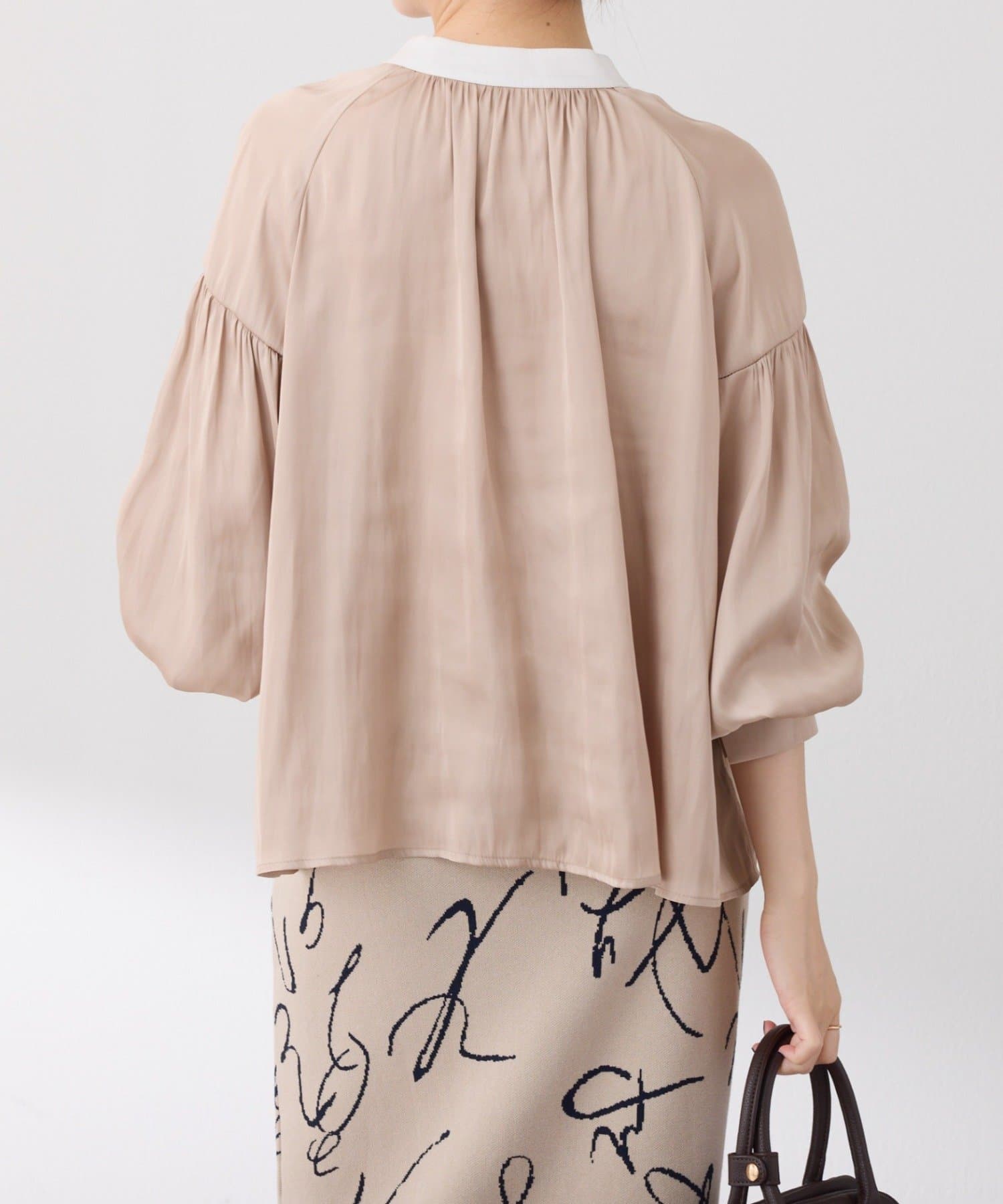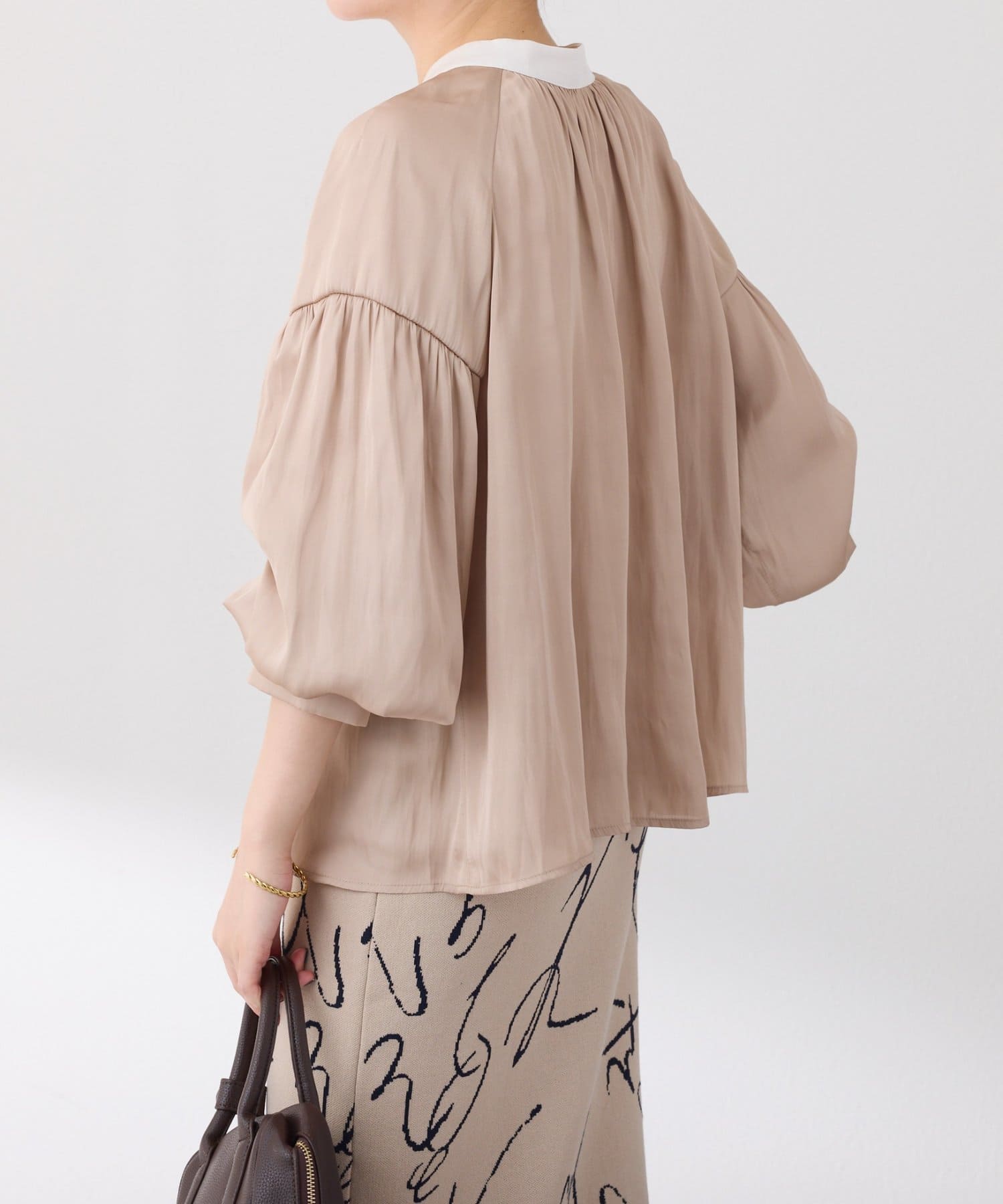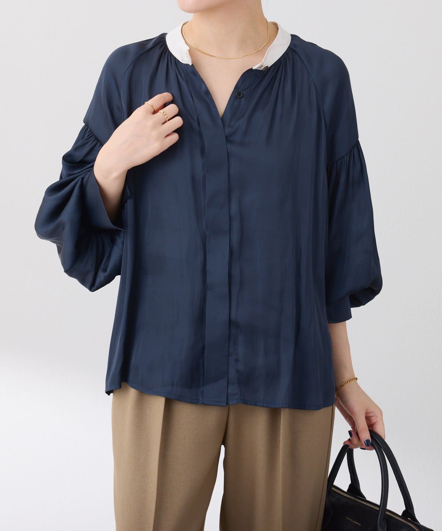 ・身頃と襟の配色のデザインがポイントのサテンブラウス。