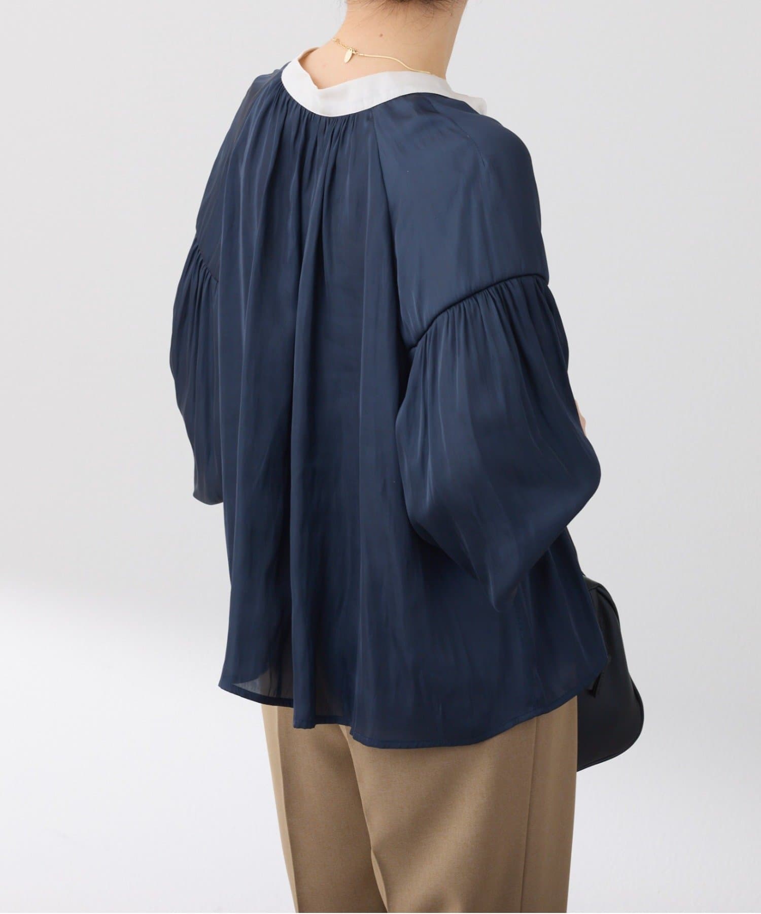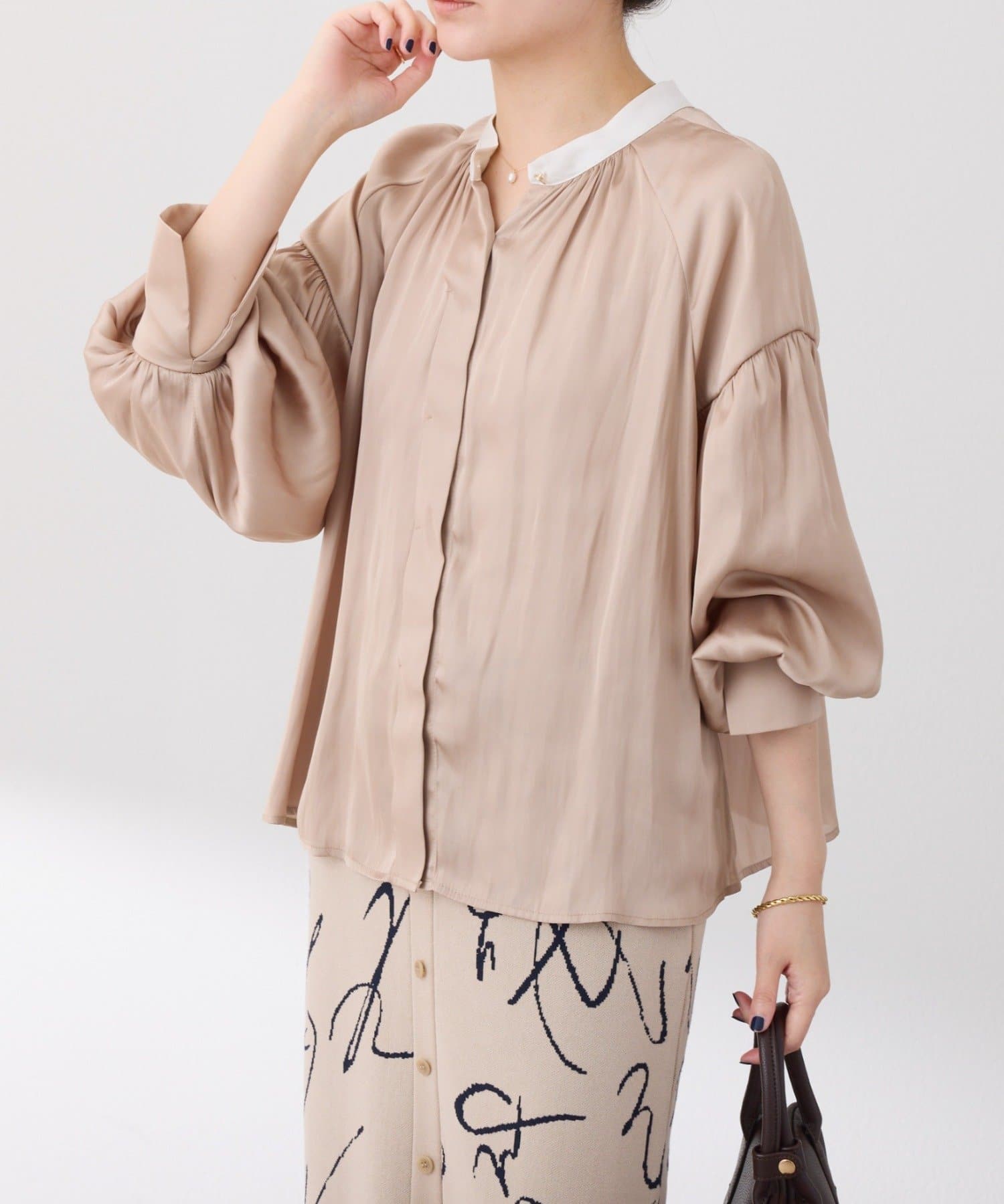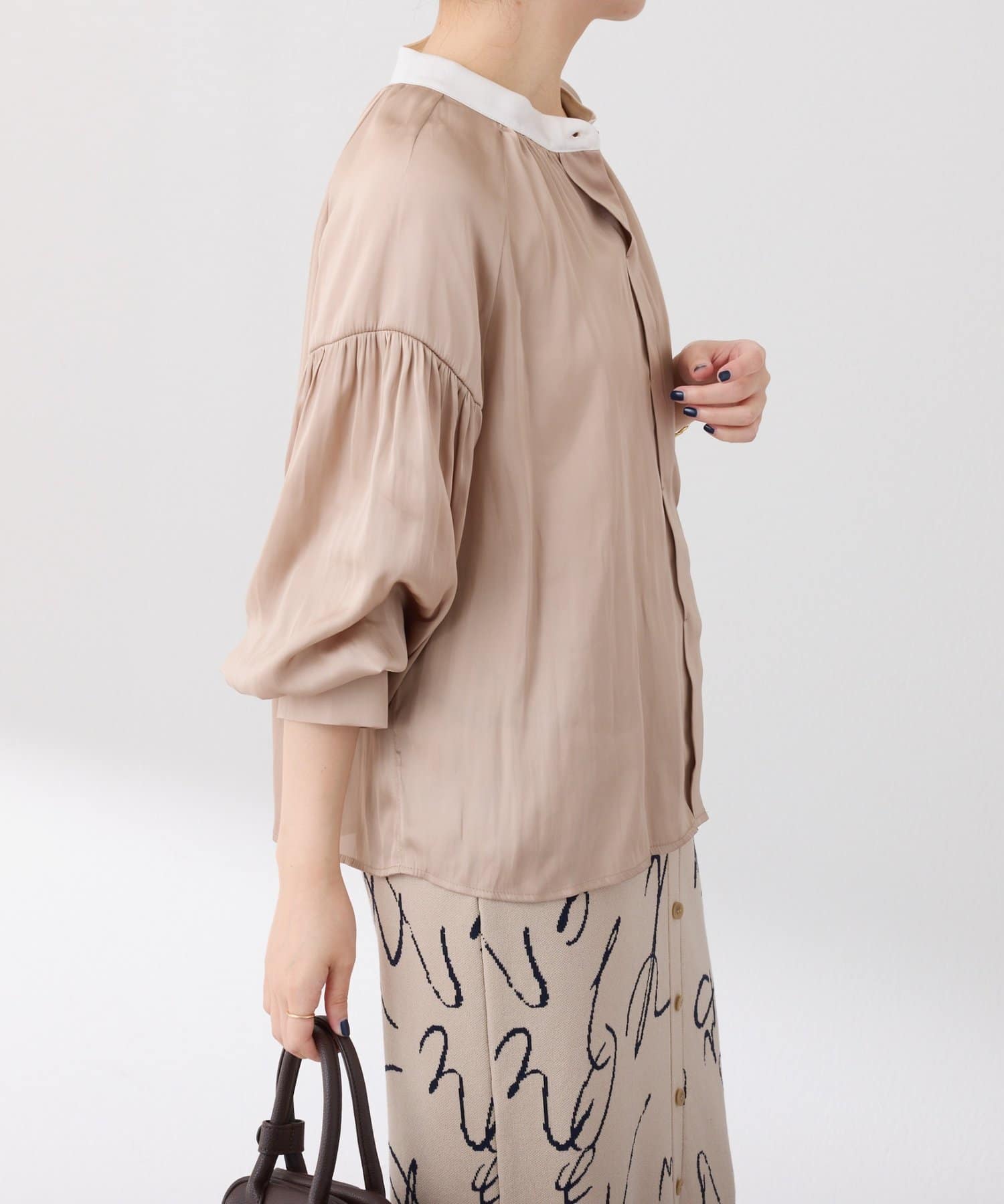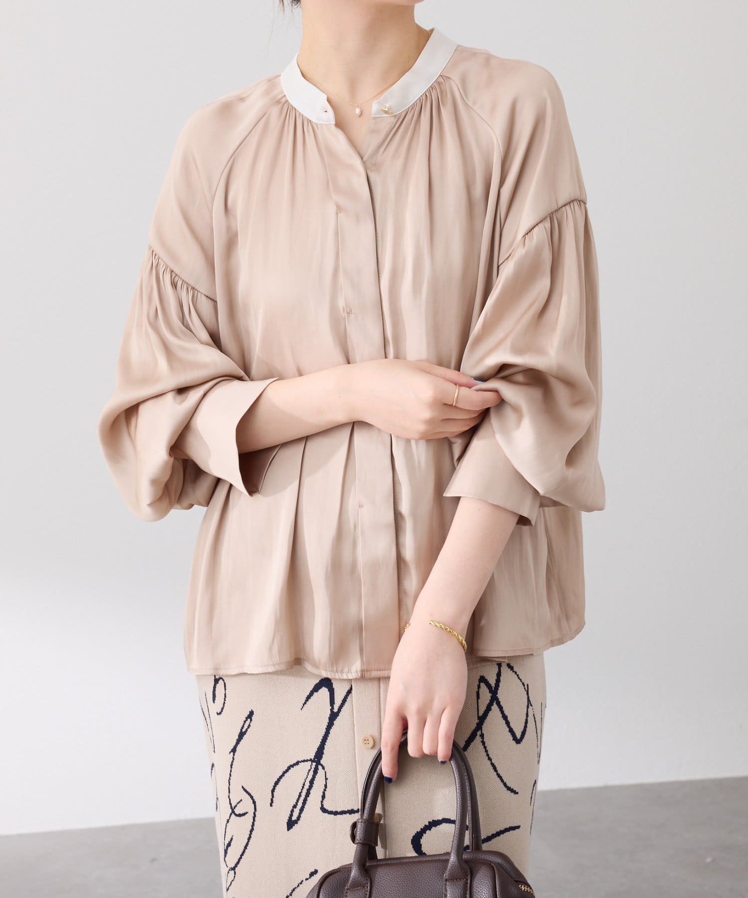 ・身頃と襟の配色のデザインがポイントのサテンブラウス。