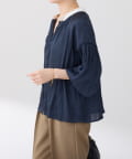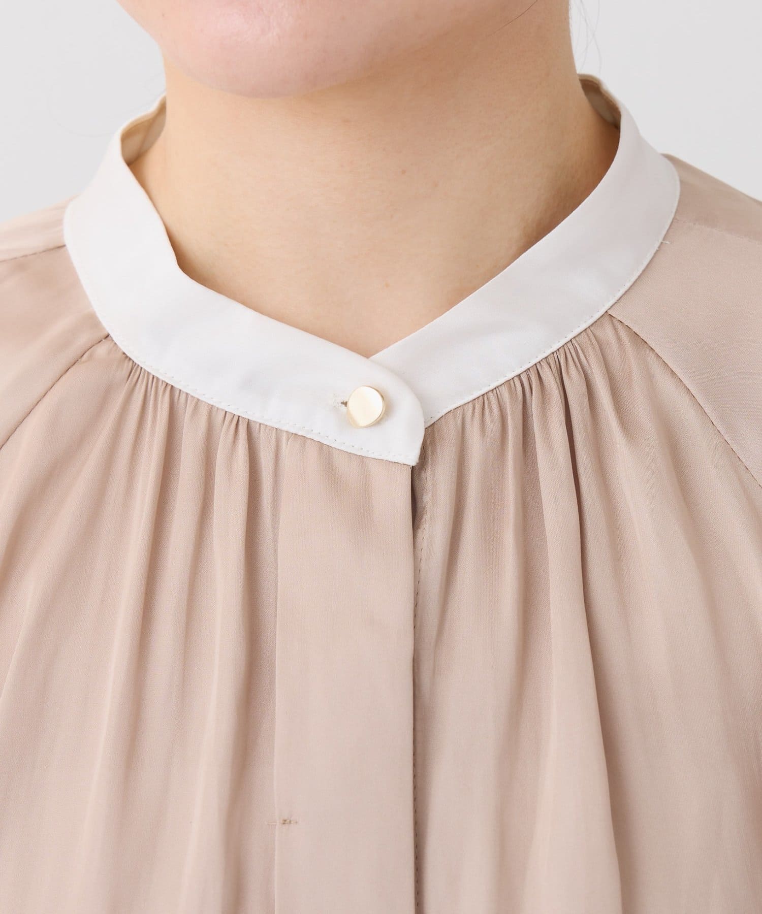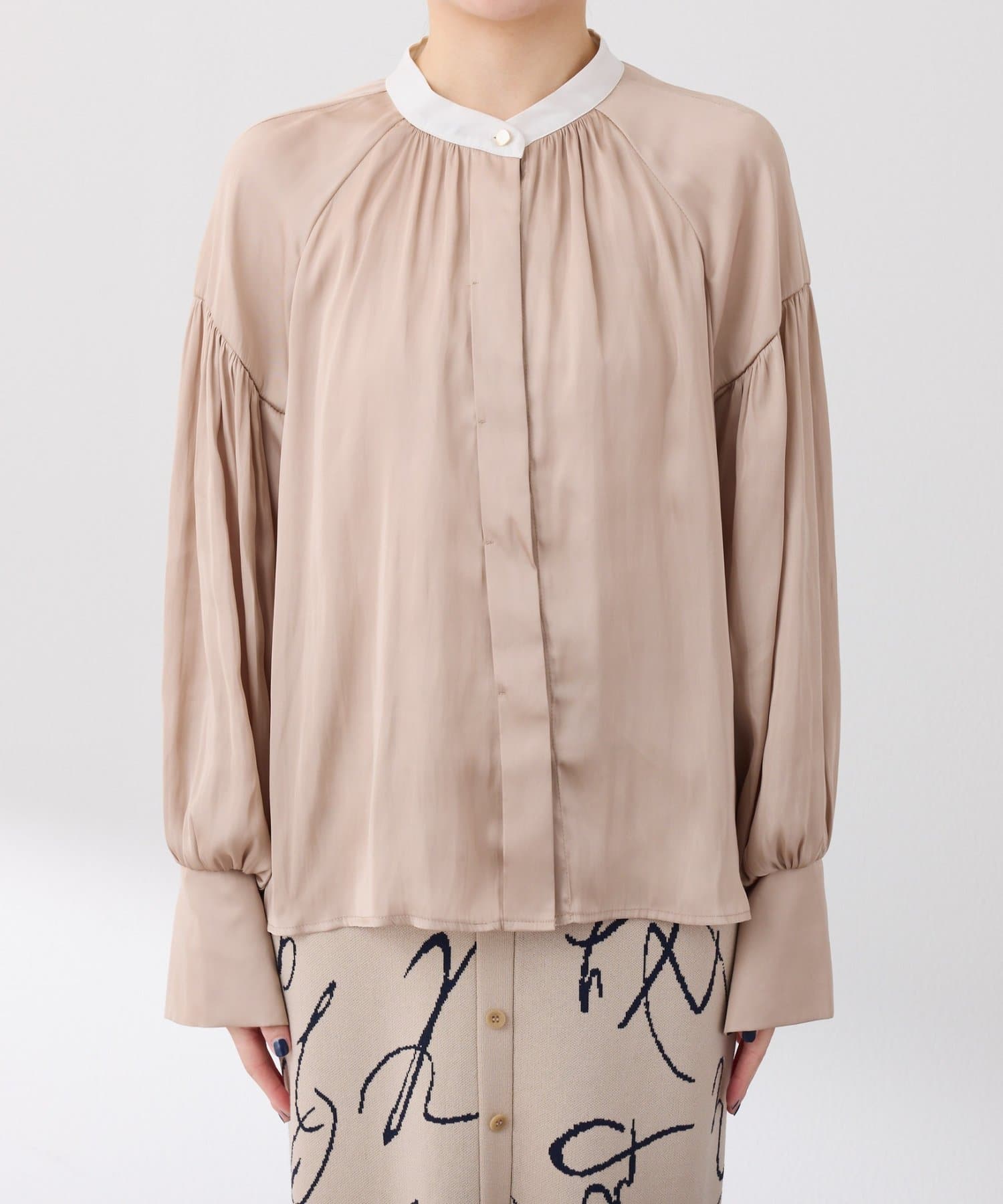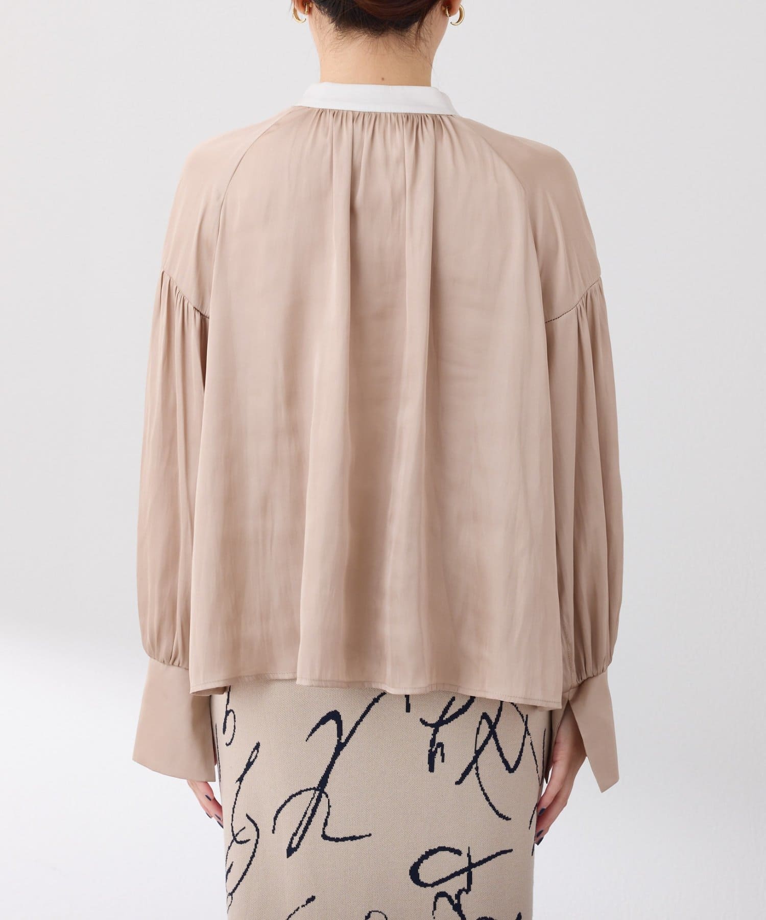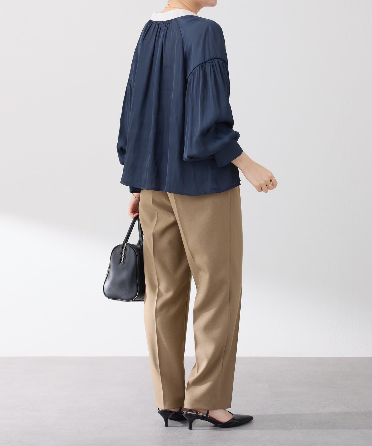 ・身頃と襟の配色のデザインがポイントのサテンブラウス。