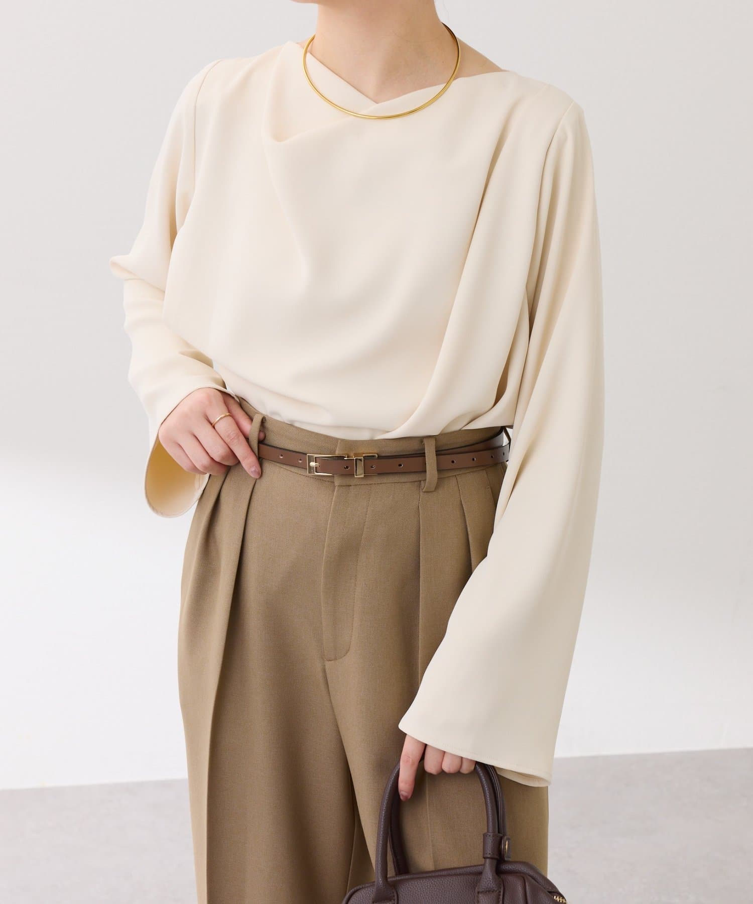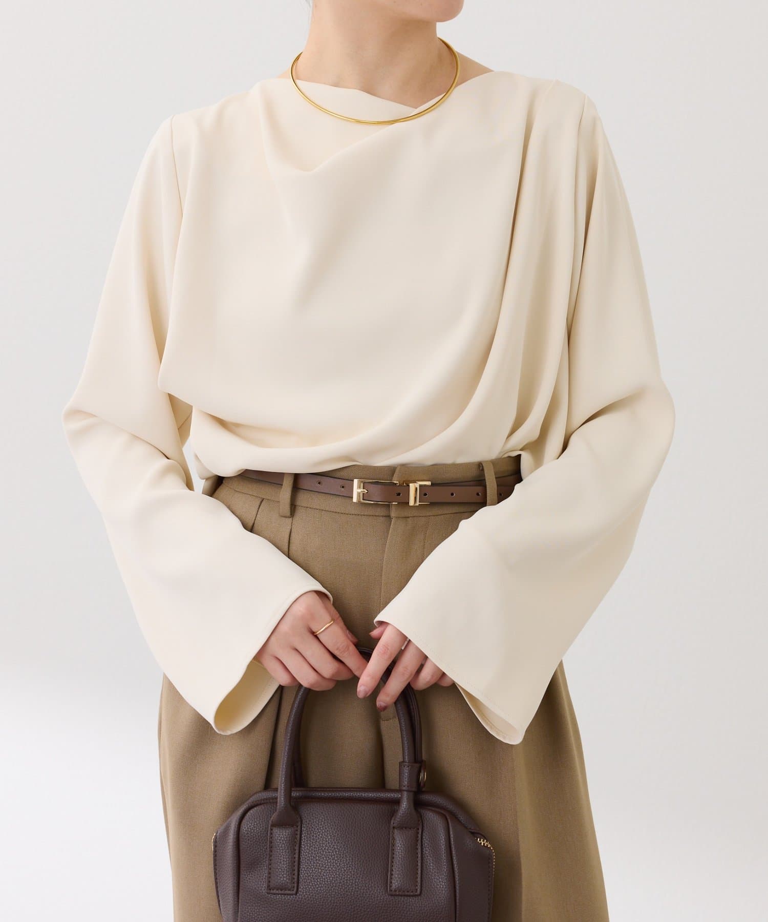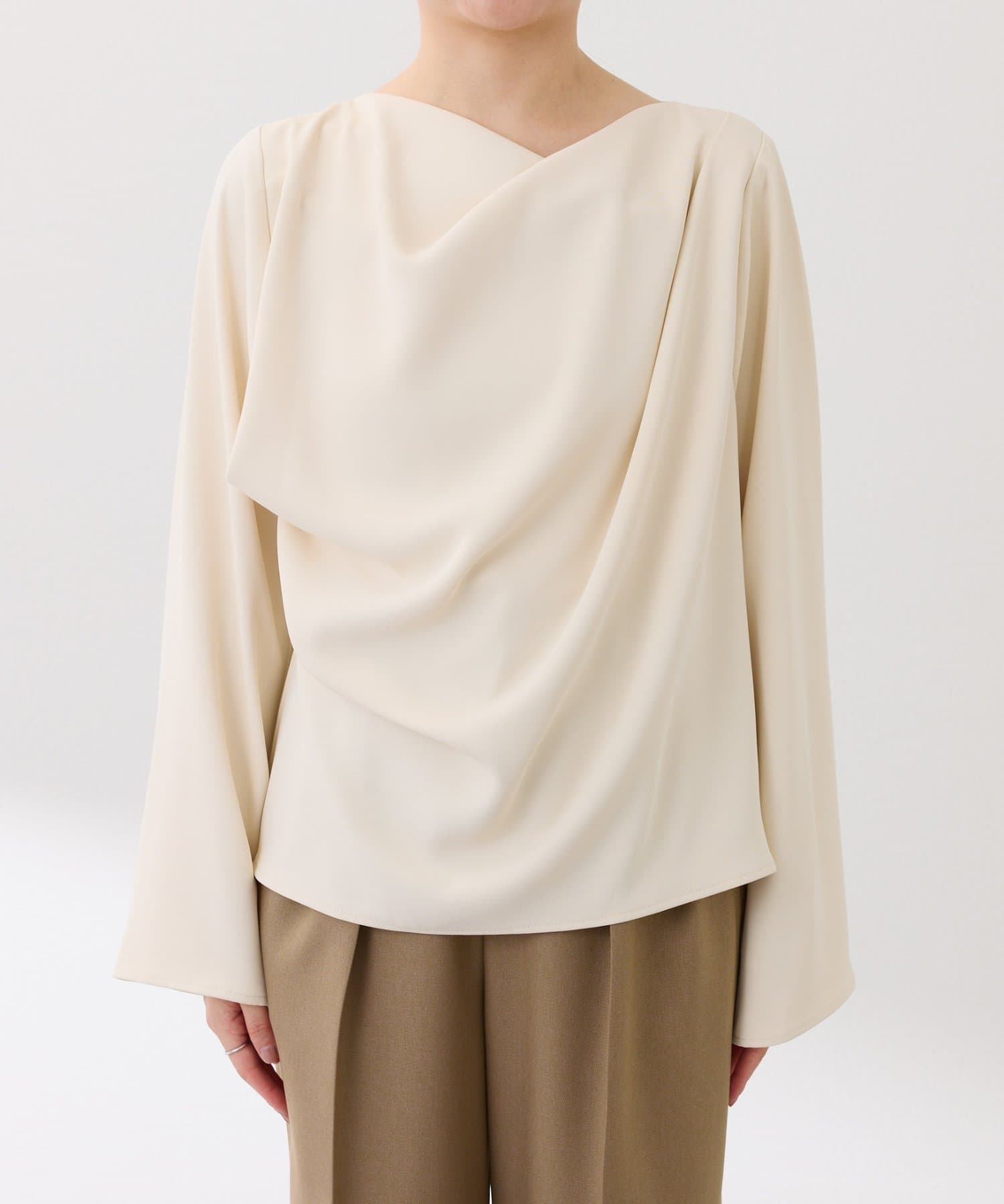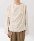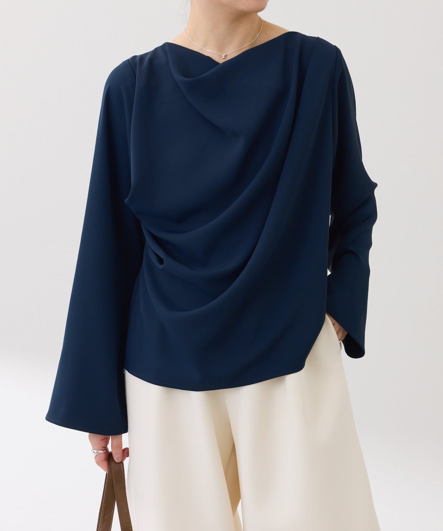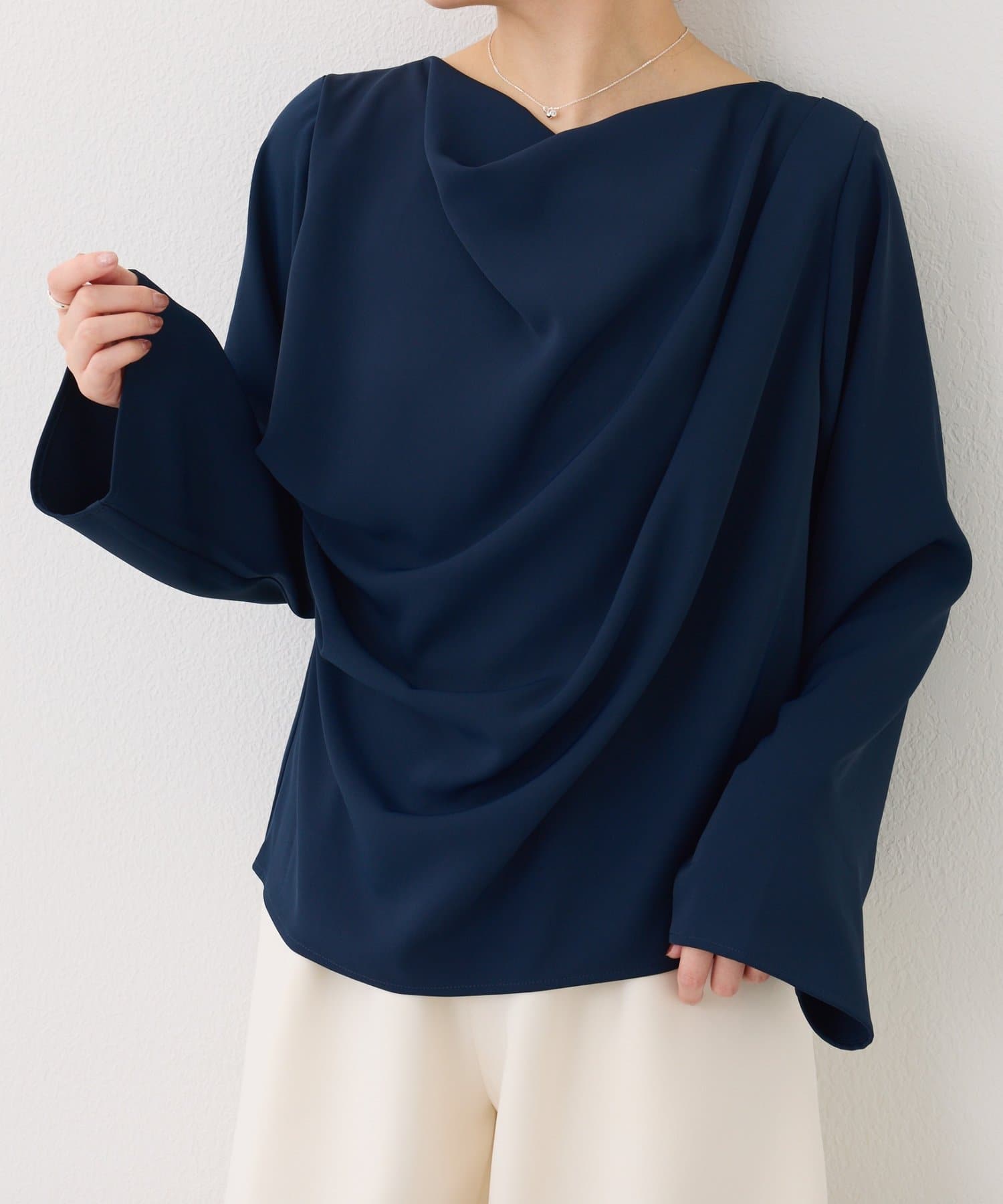 ・柔らかなドレープデザインが女性らしい雰囲気を演出するブラウス。