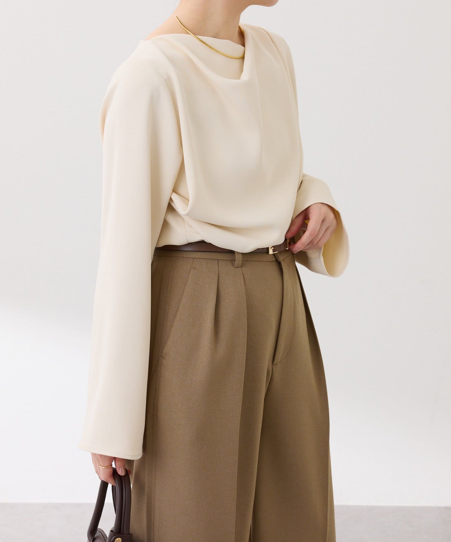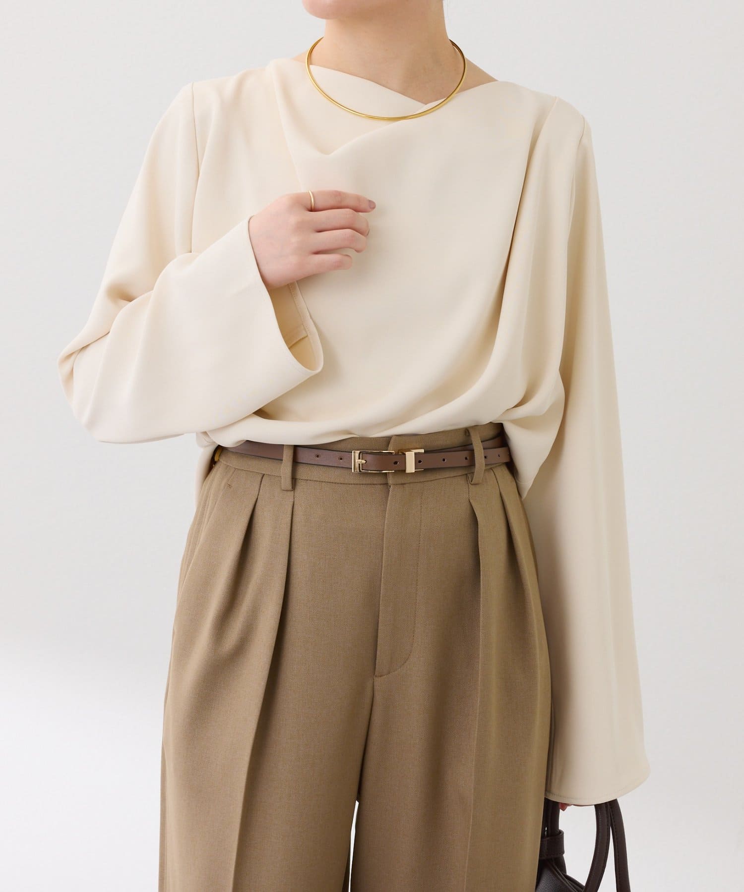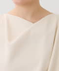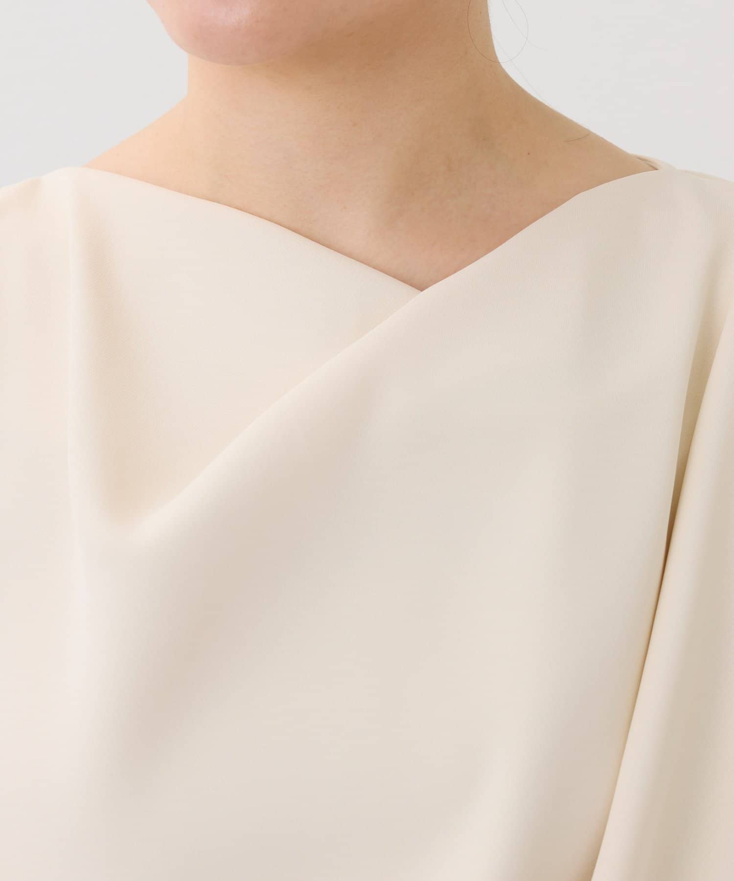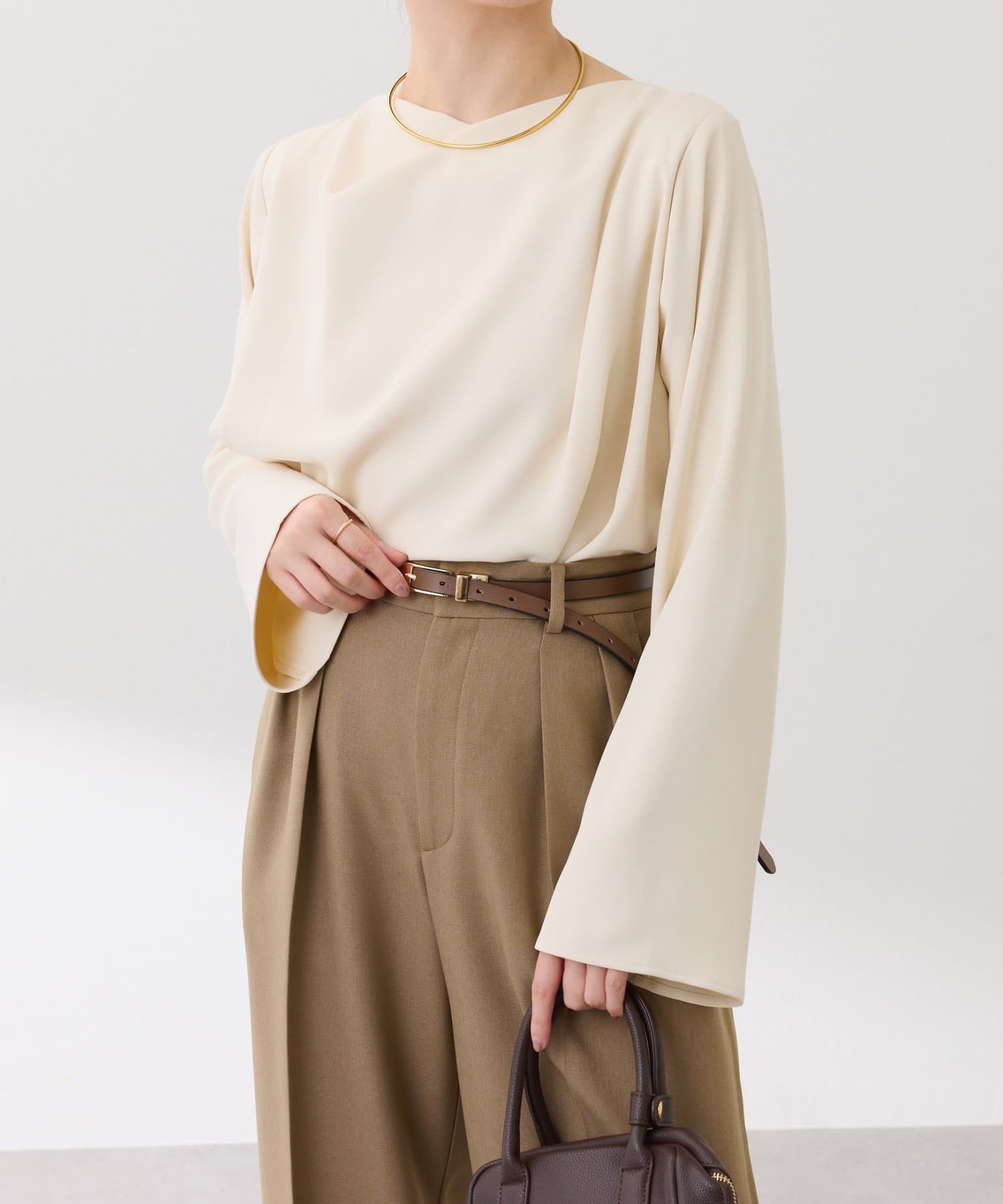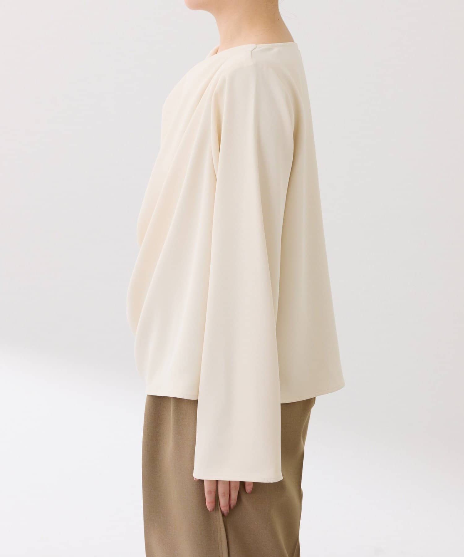 ・柔らかなドレープデザインが女性らしい雰囲気を演出するブラウス。