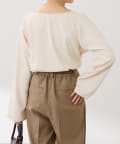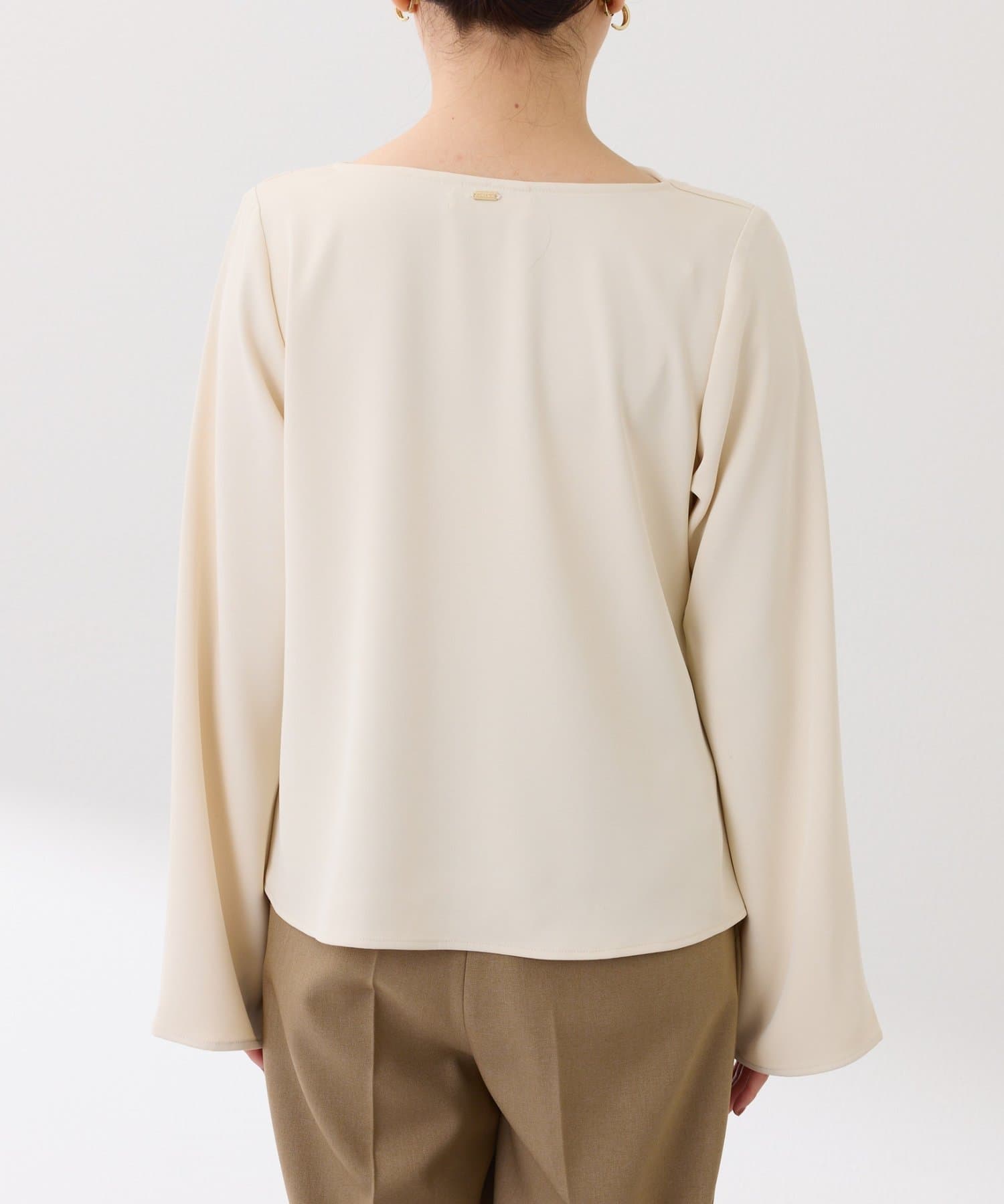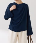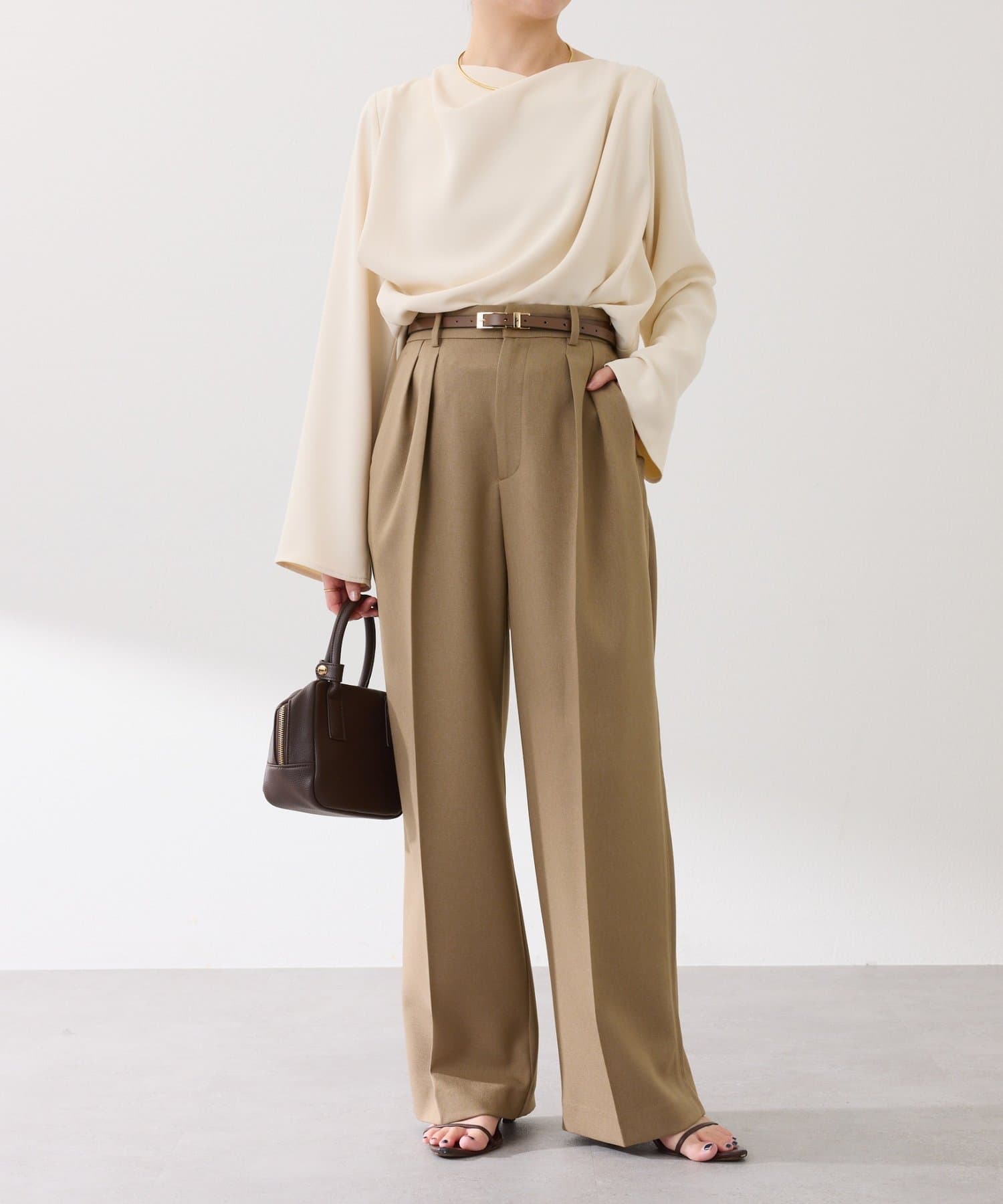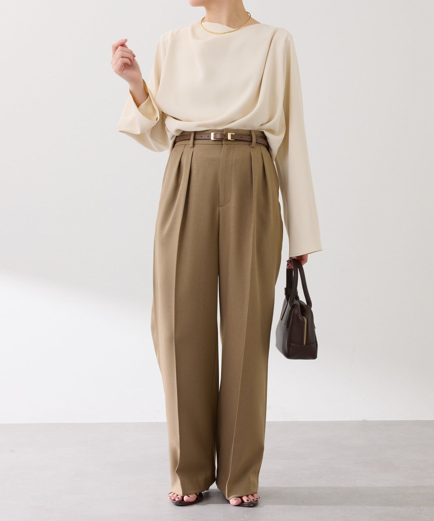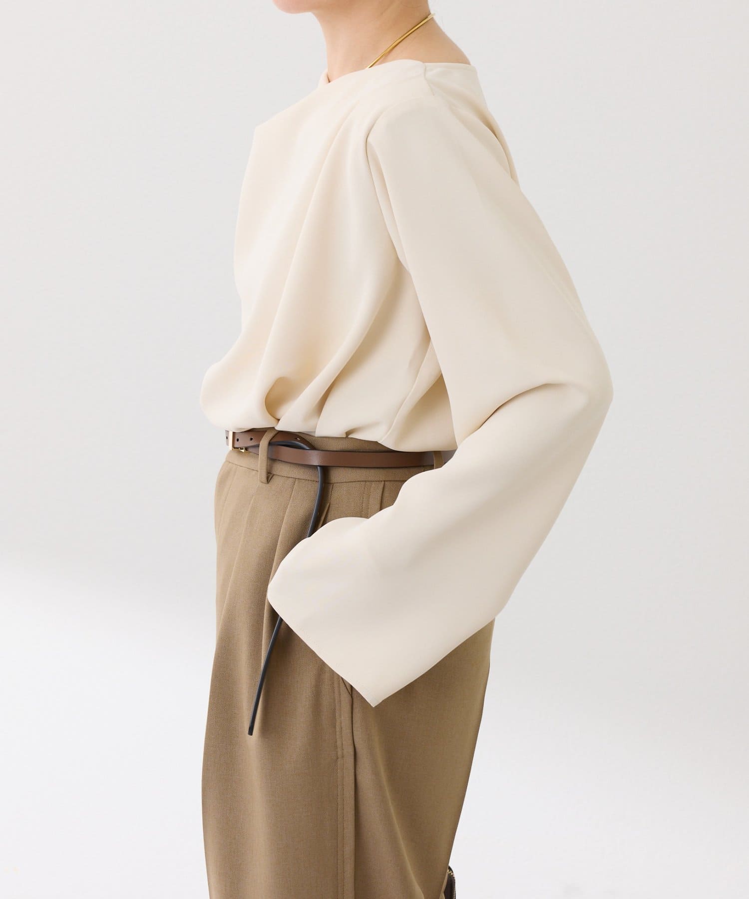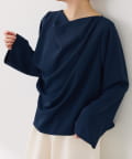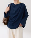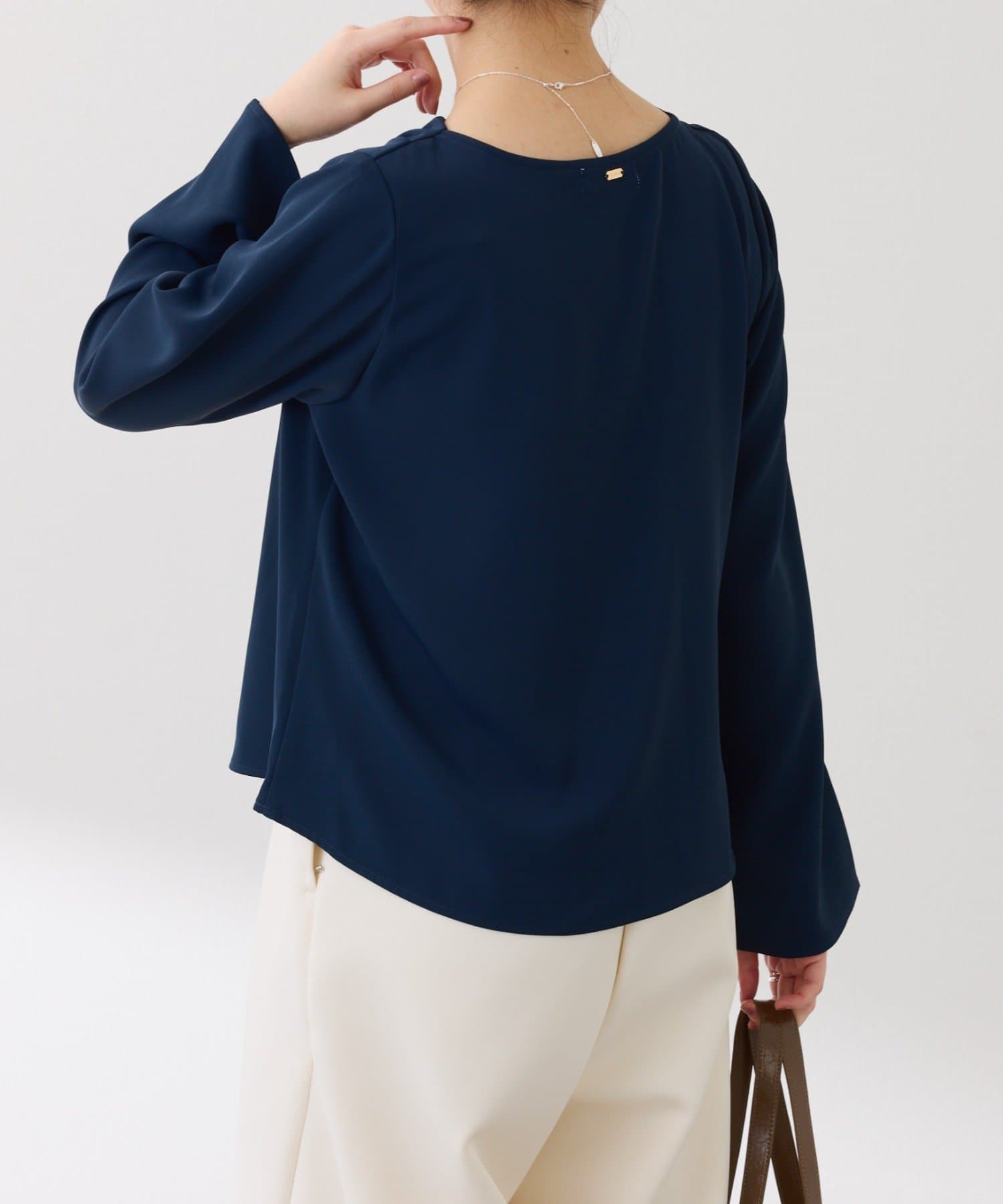 ・柔らかなドレープデザインが女性らしい雰囲気を演出するブラウス。