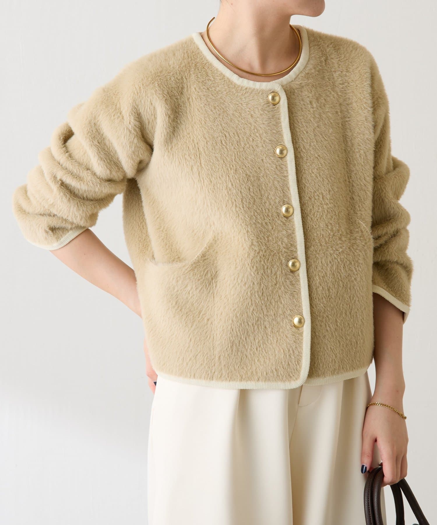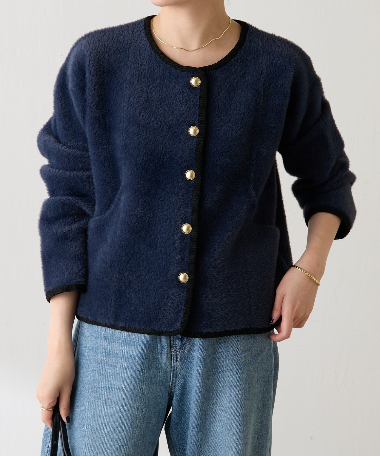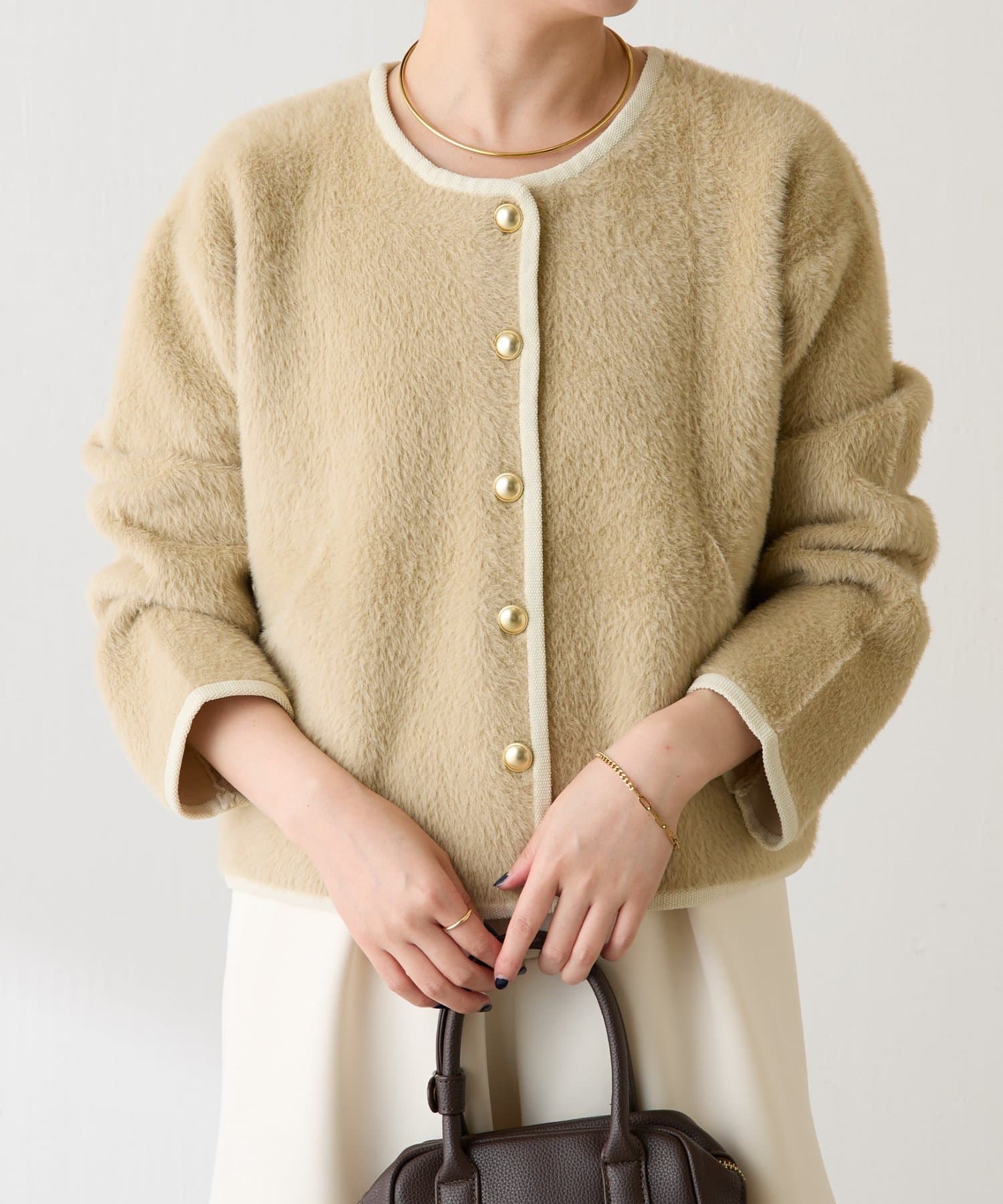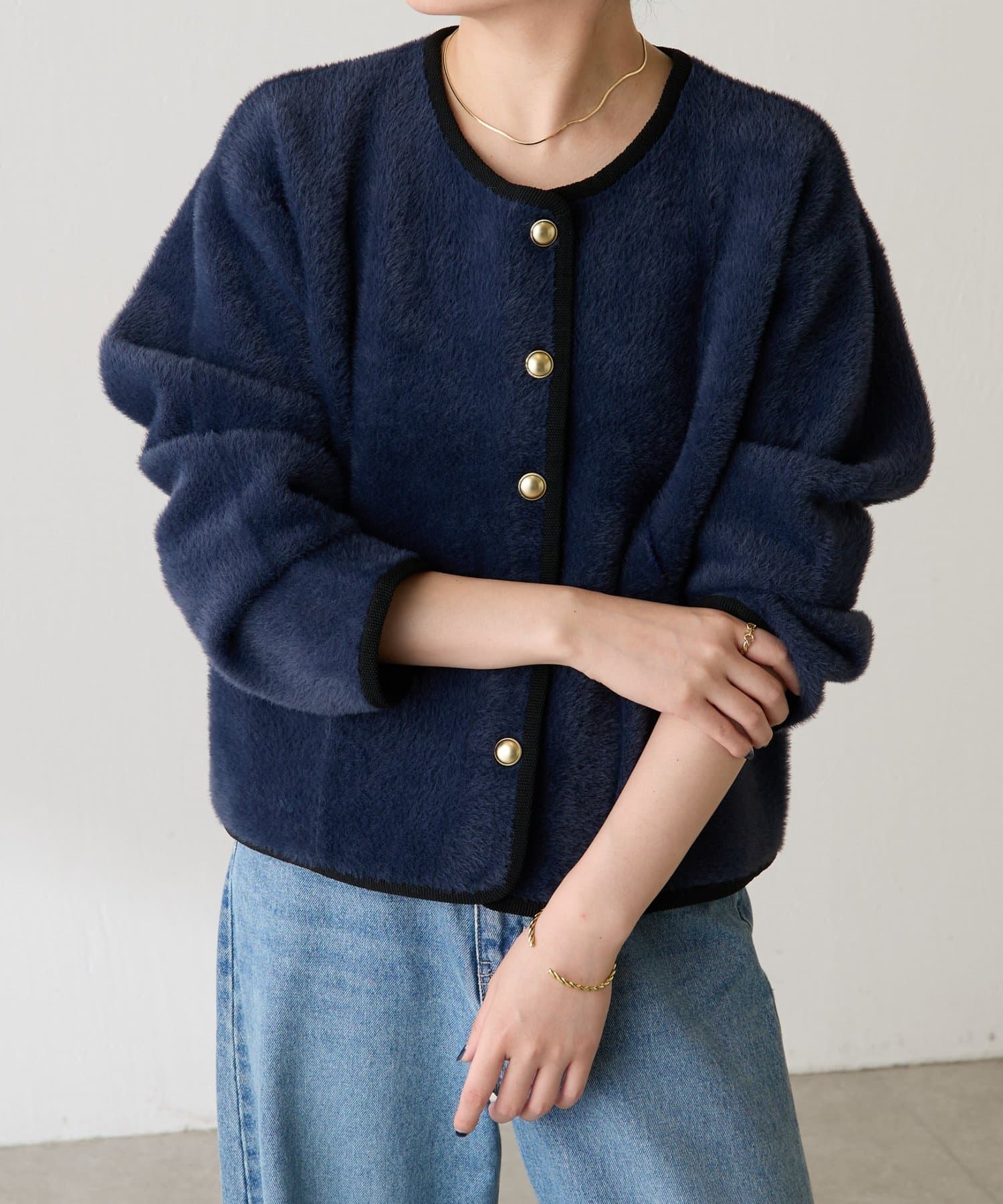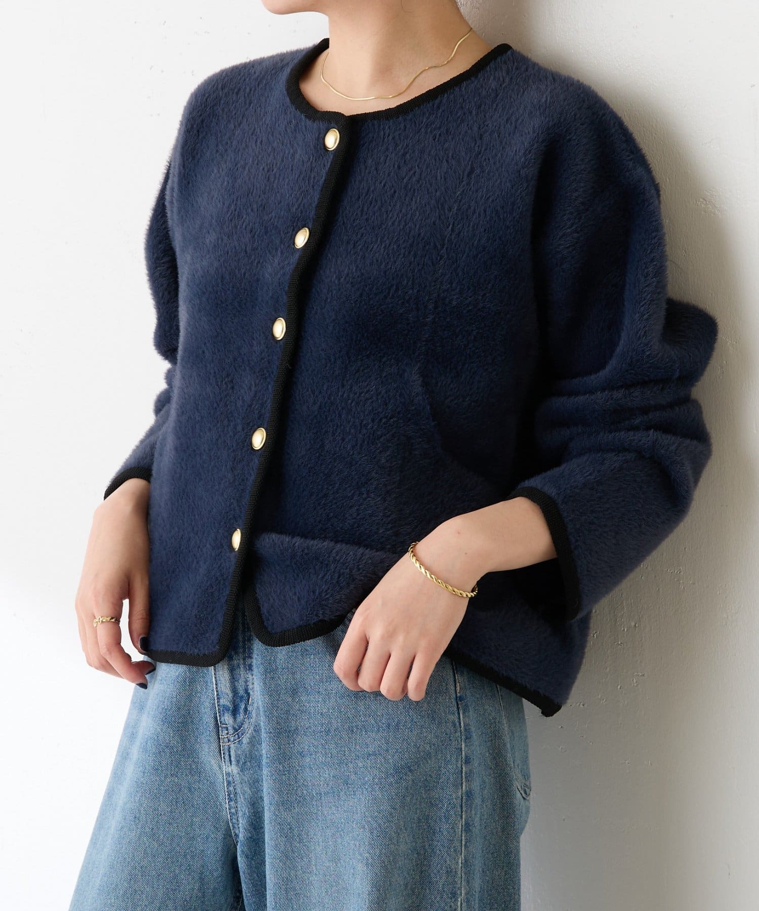 ・シャギー素材のパイピングディティールのデザインでツイードジャケット風に着られるカーディガン。