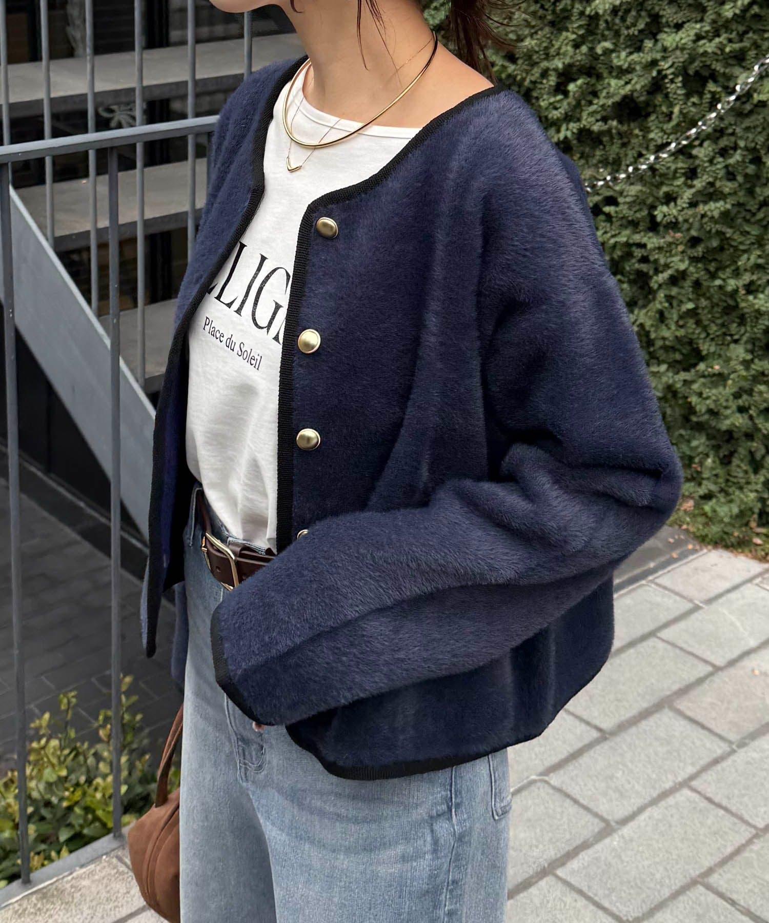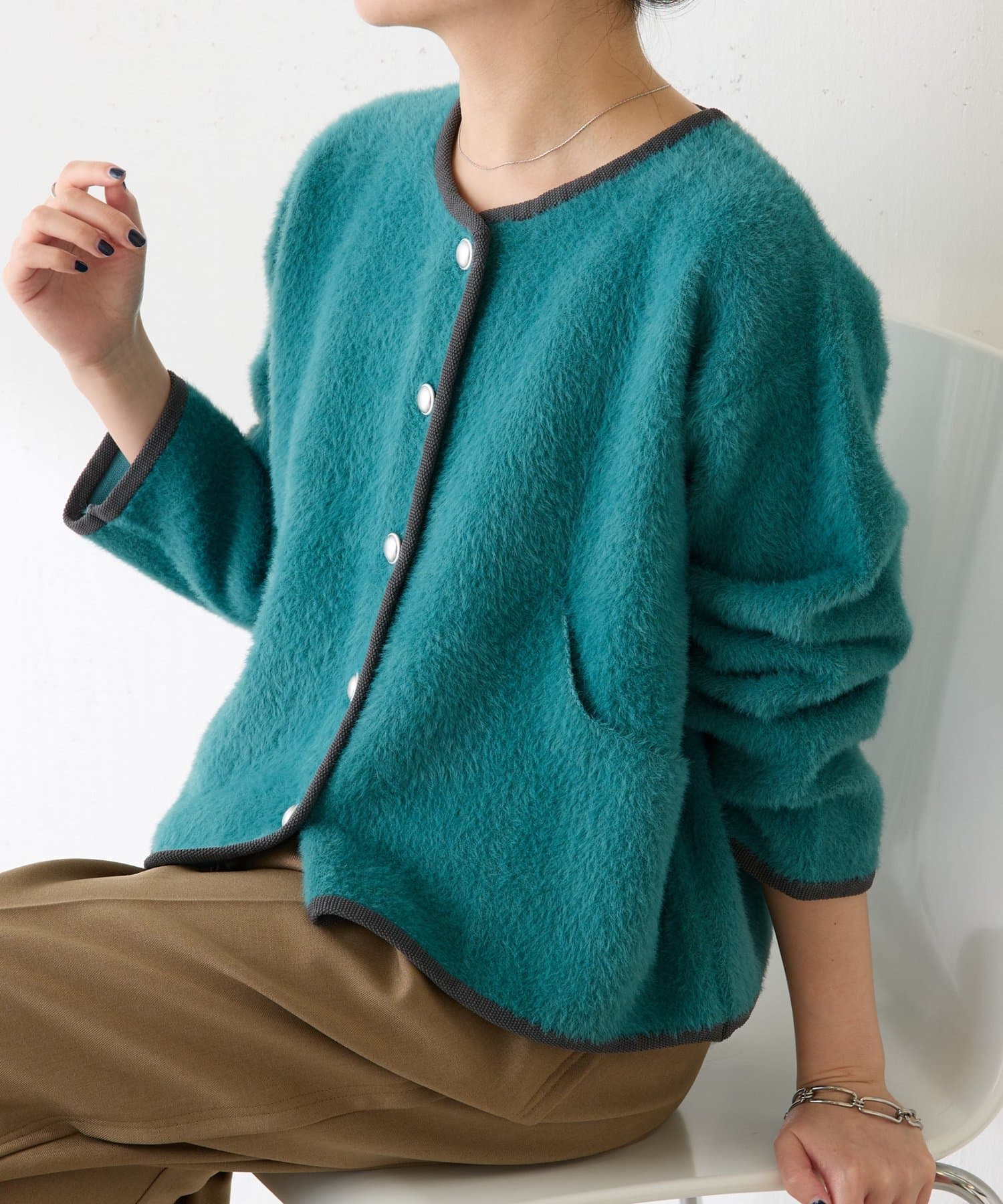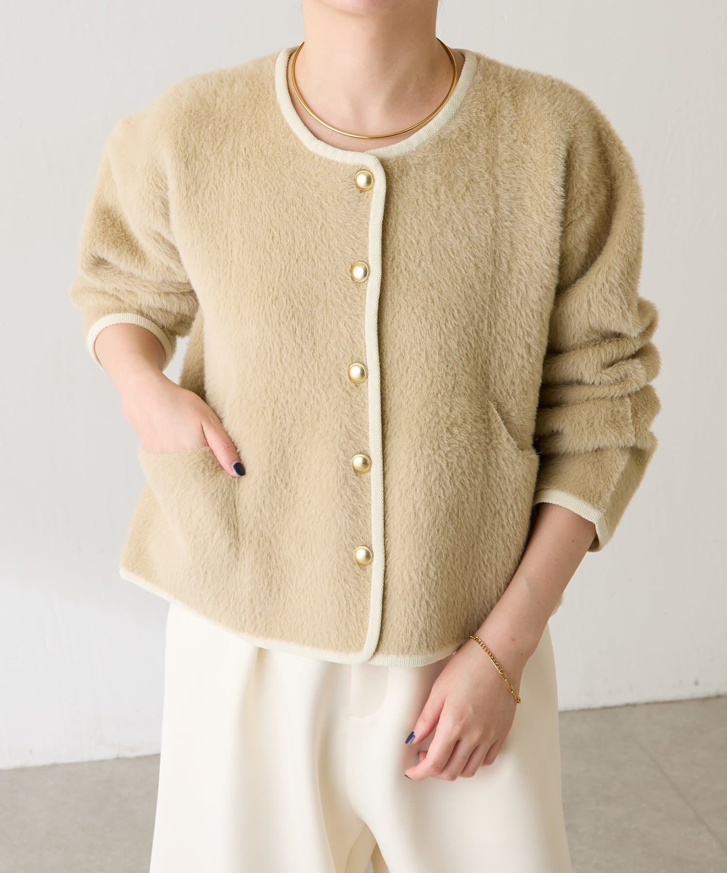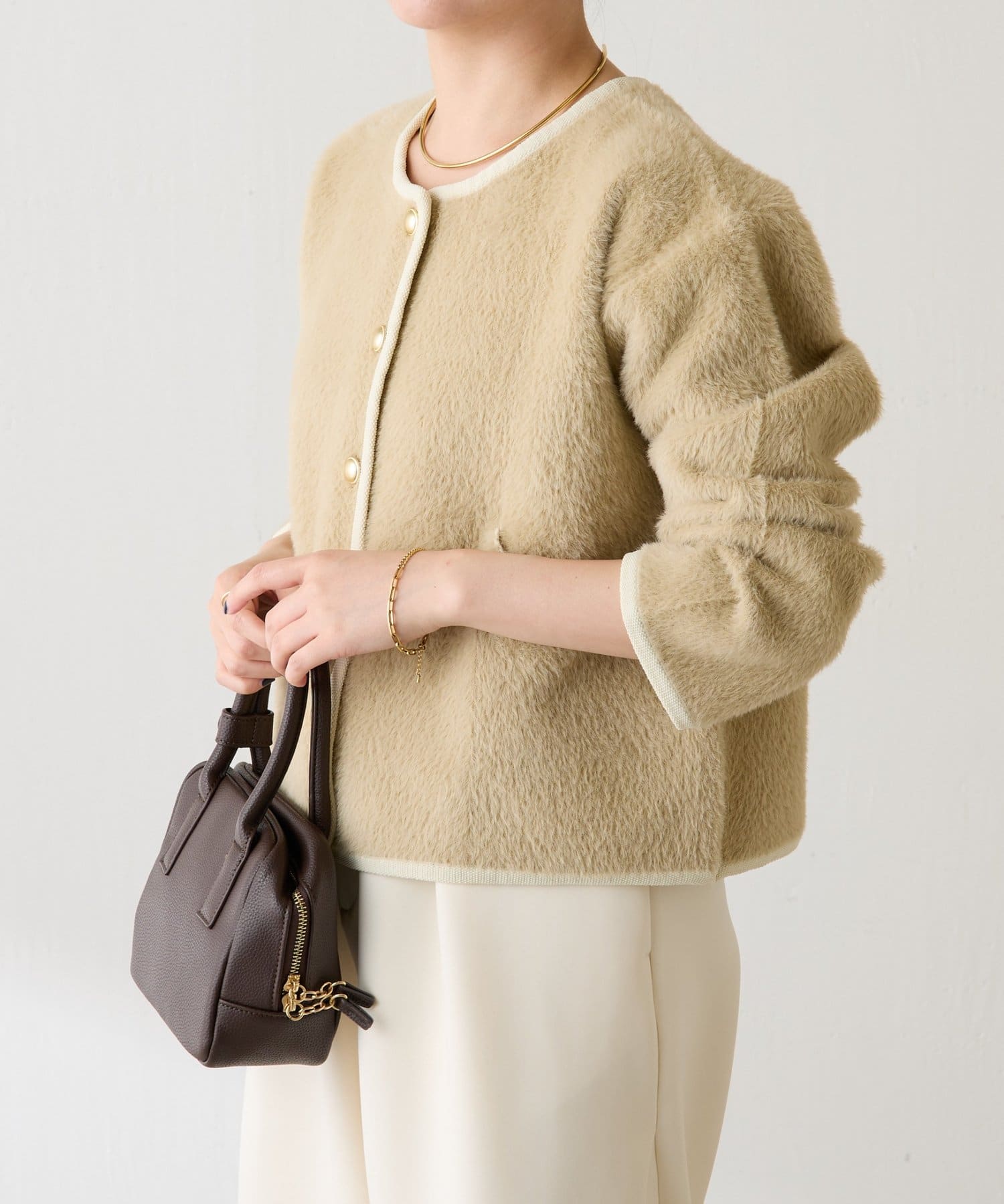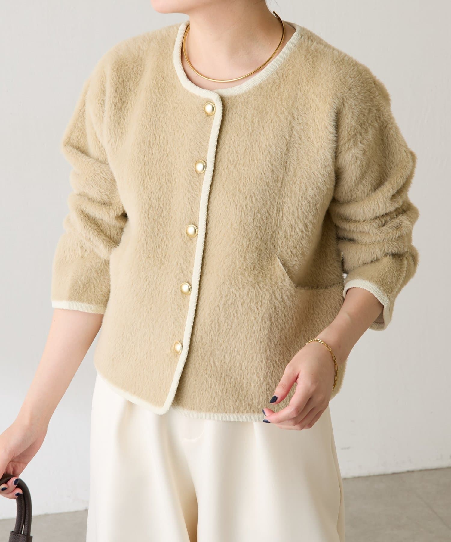 ・シャギー素材のパイピングディティールのデザインでツイードジャケット風に着られるカーディガン。