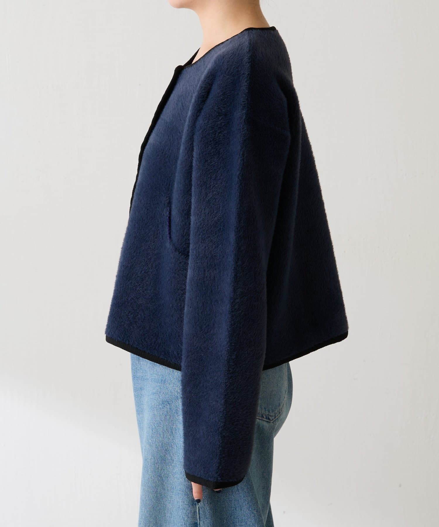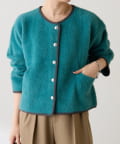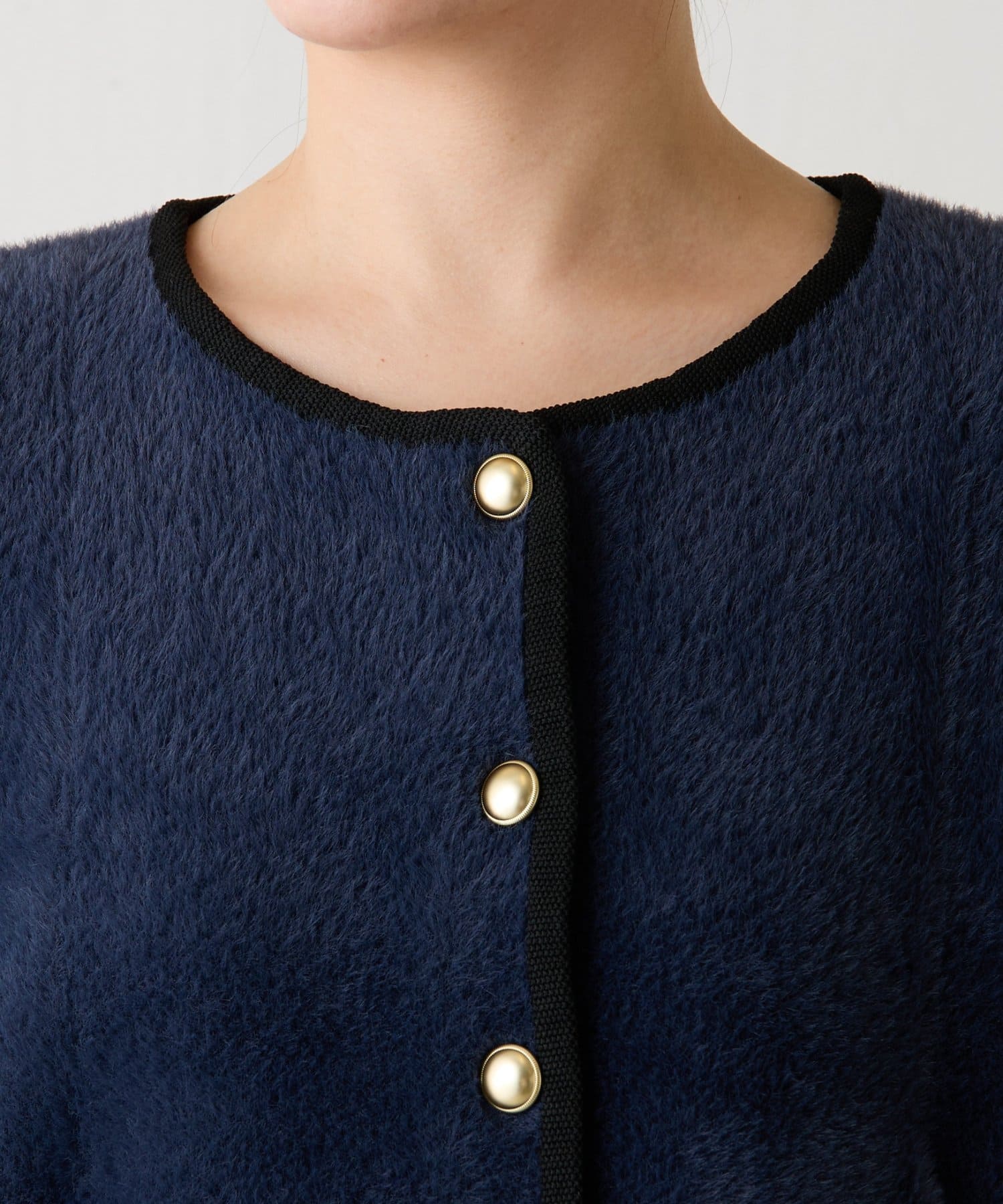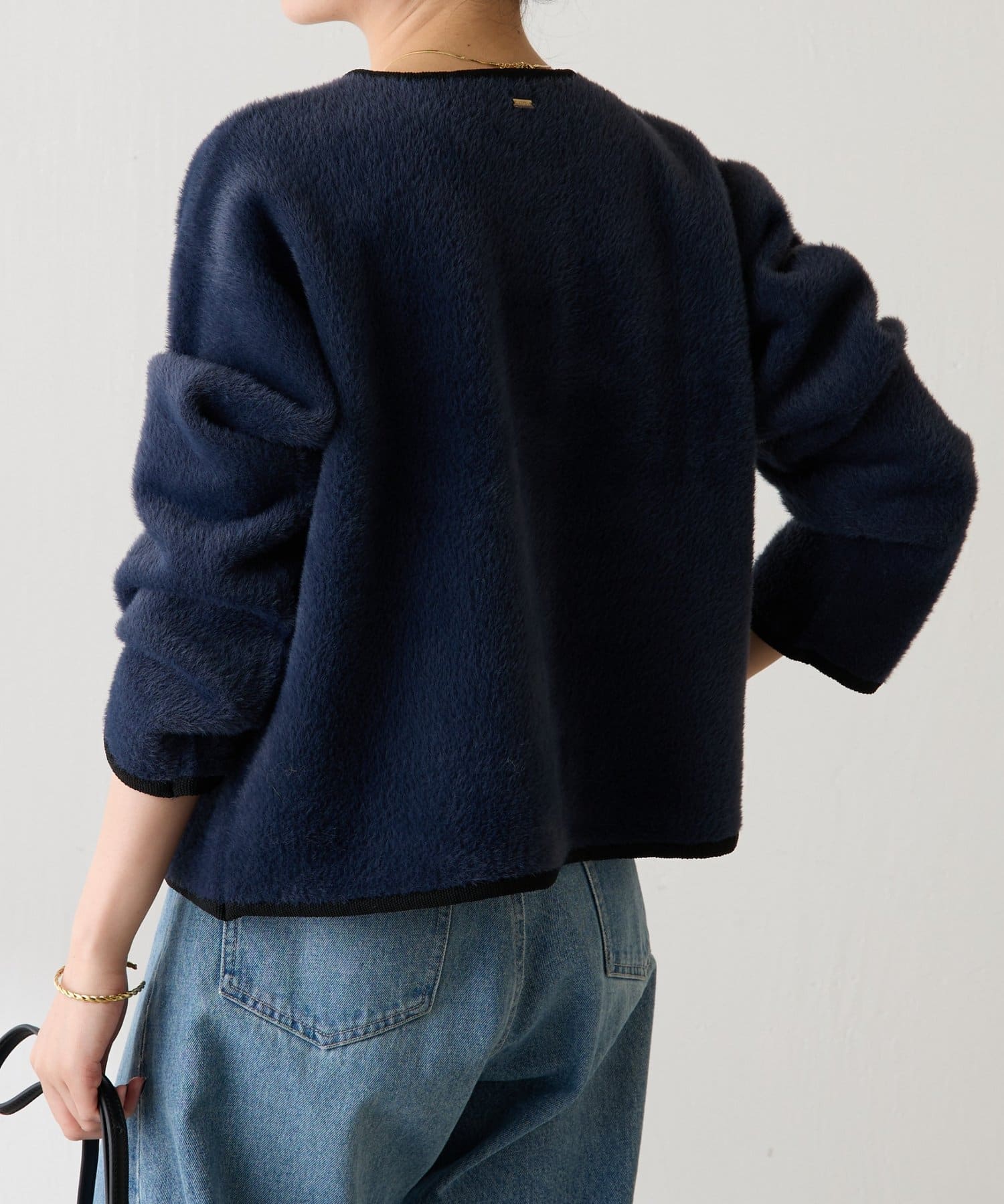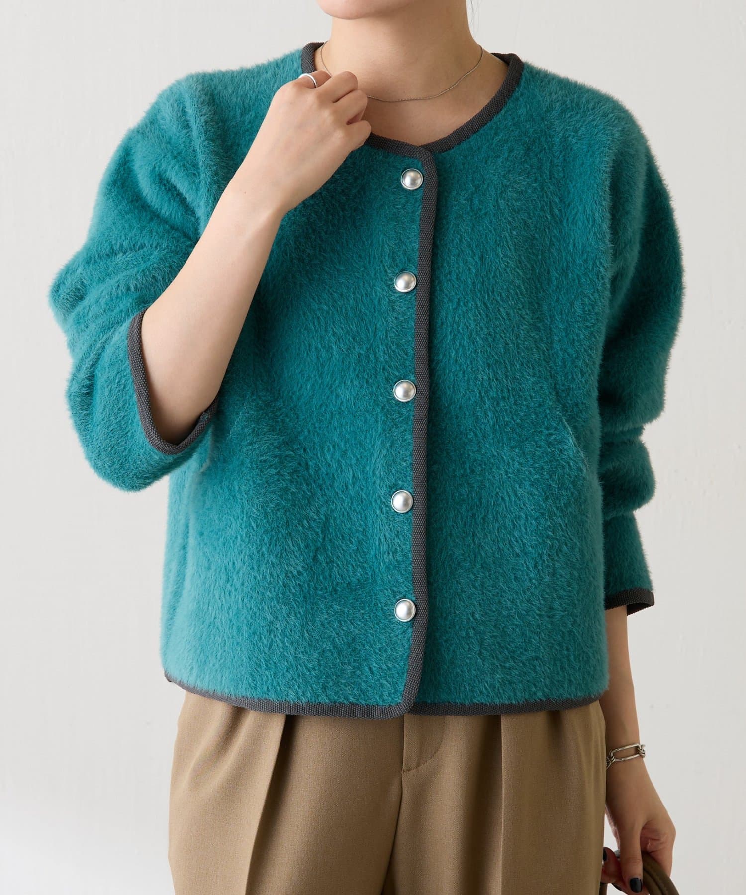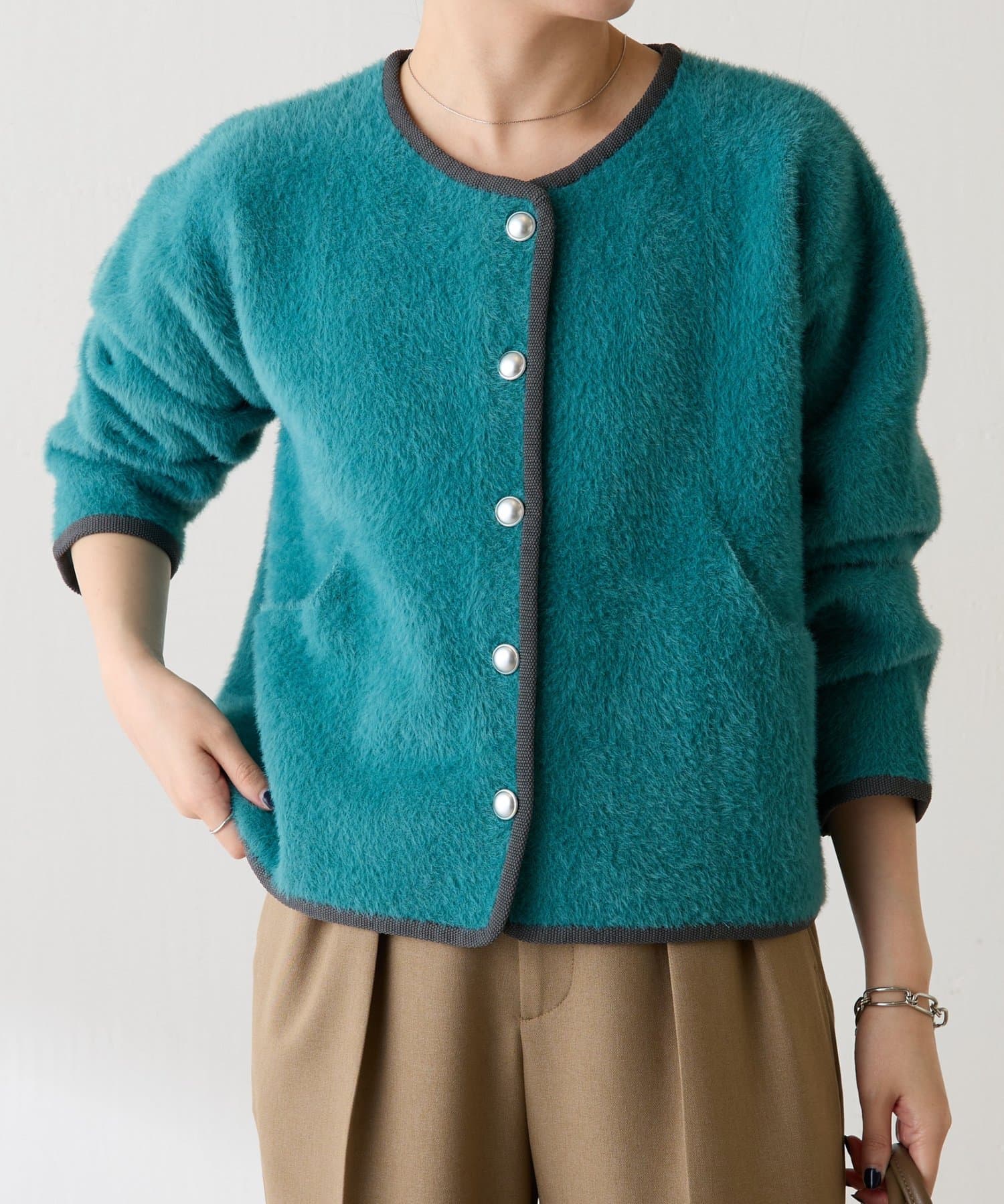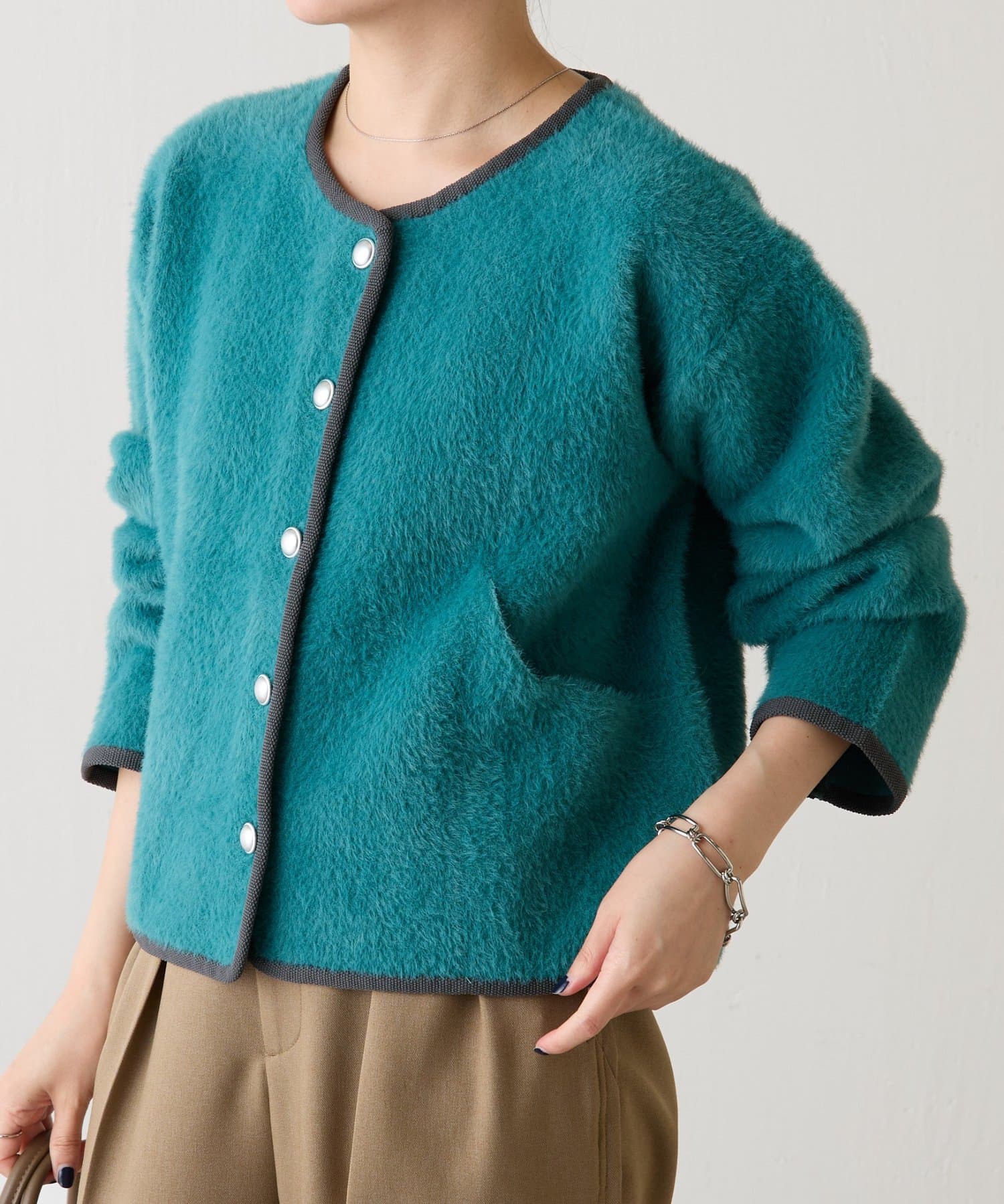・シャギー素材のパイピングディティールのデザインでツイードジャケット風に着られるカーディガン。