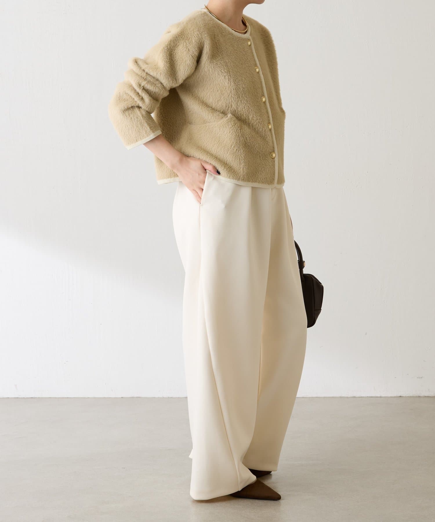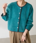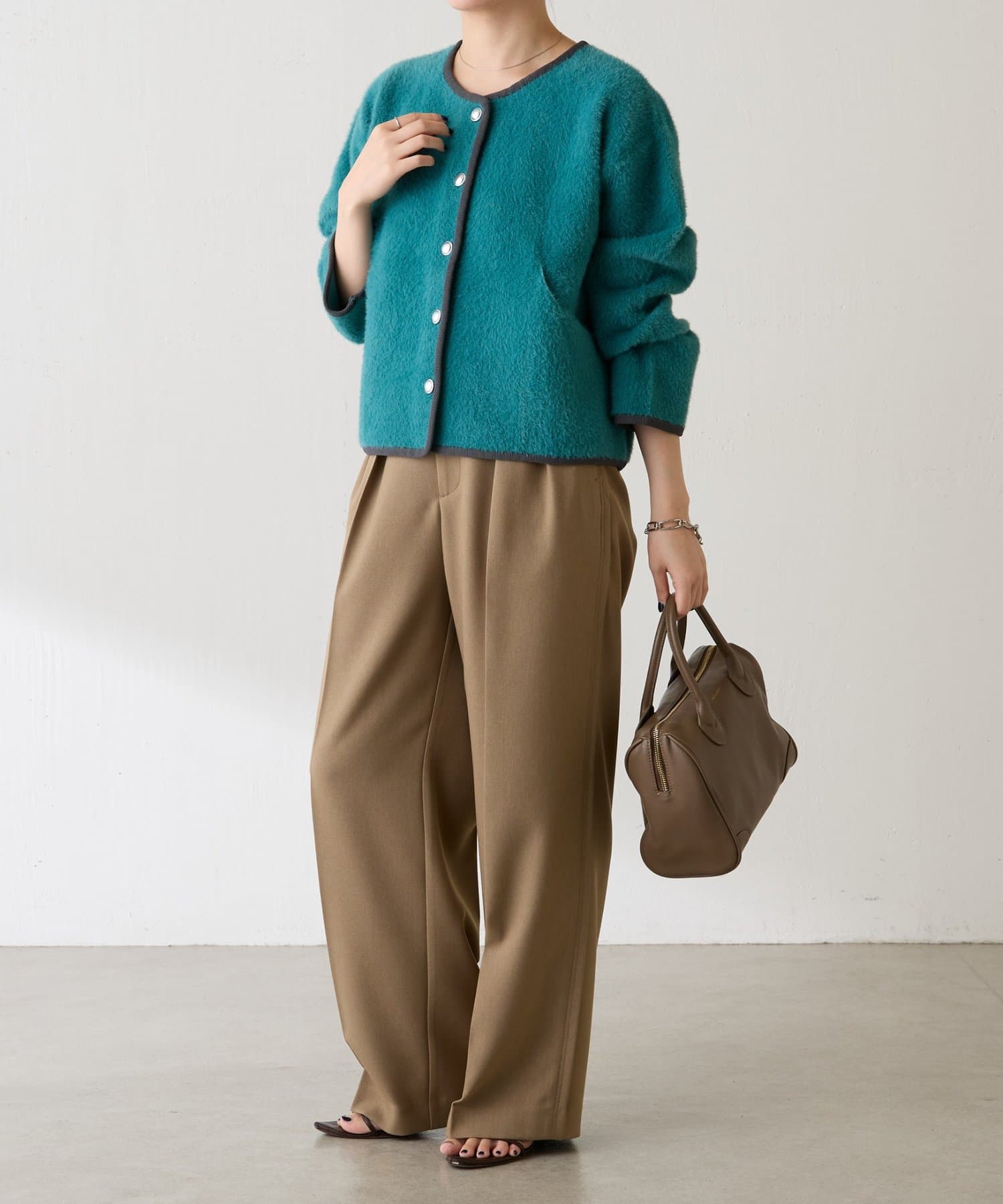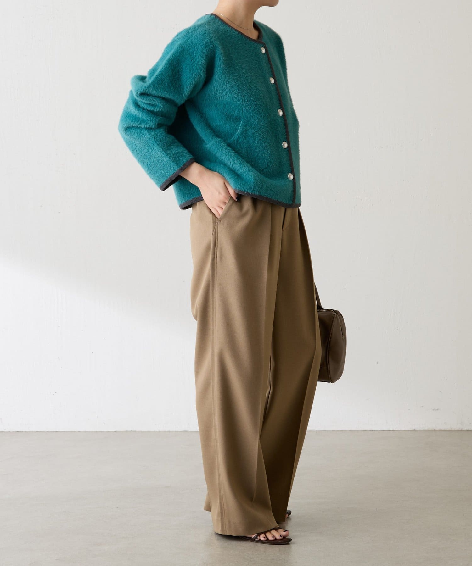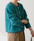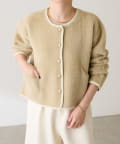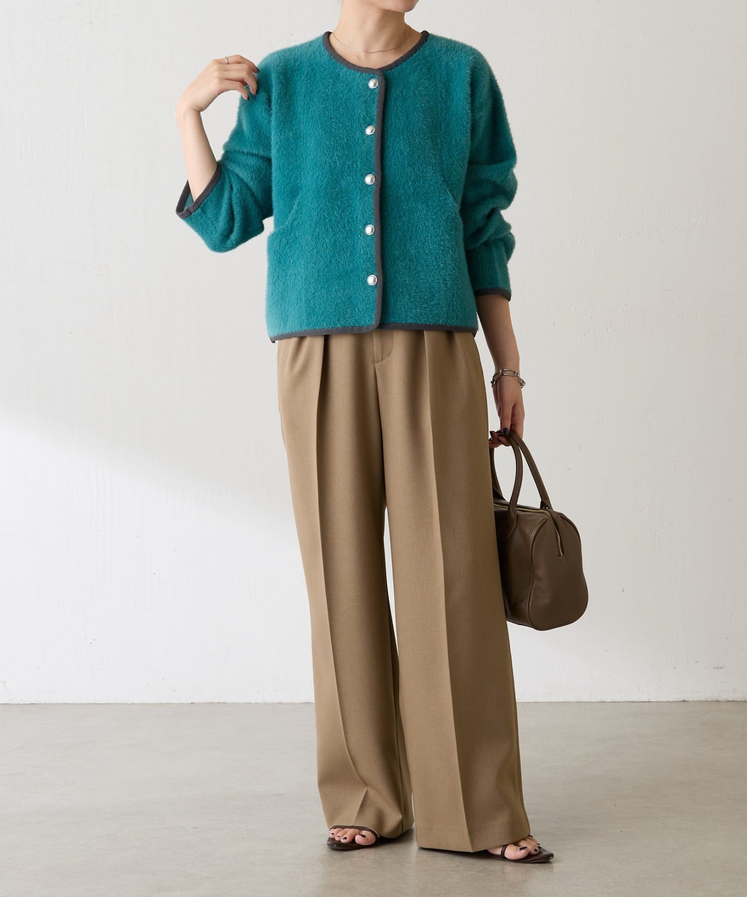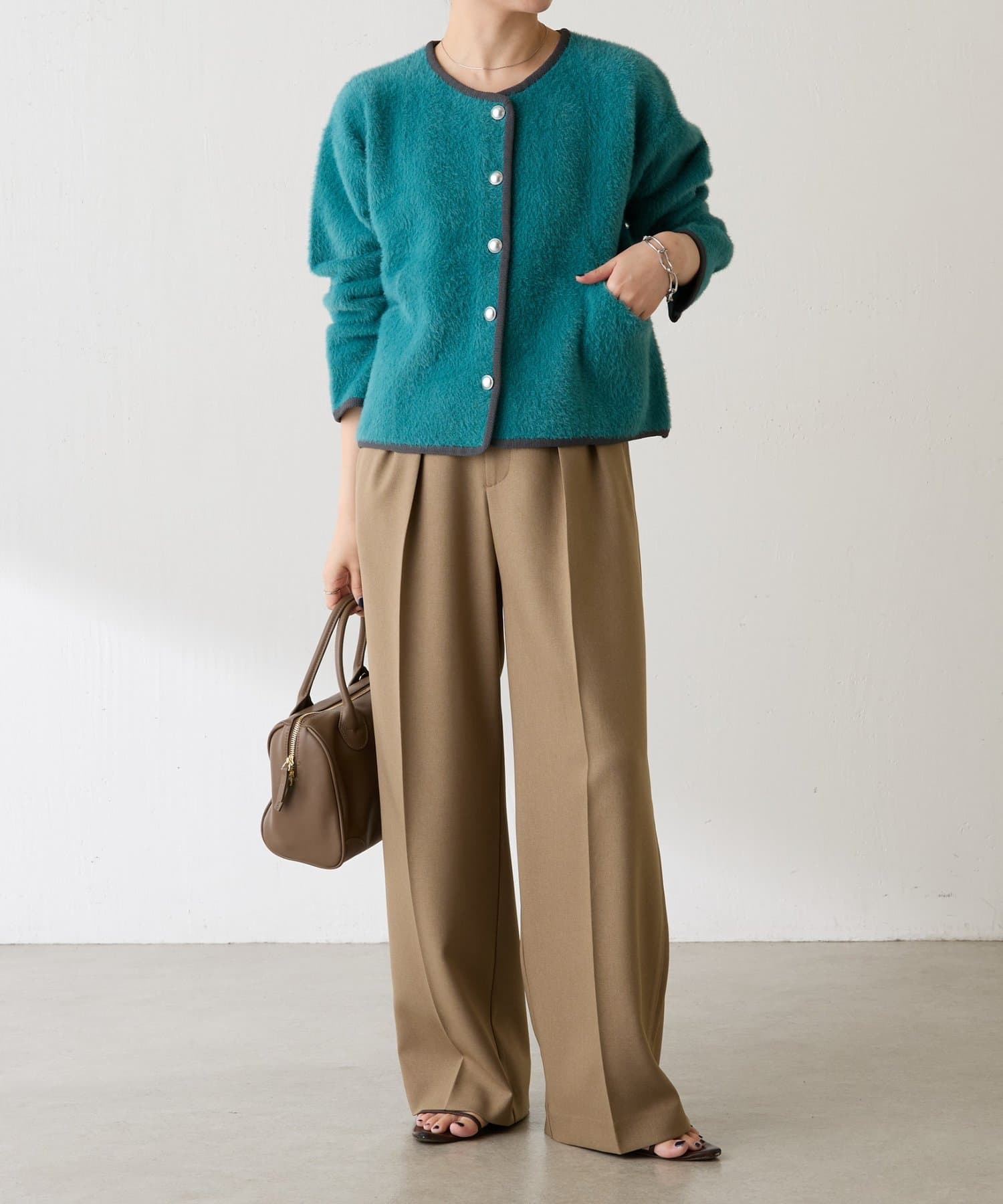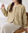 ・シャギー素材のパイピングディティールのデザインでツイードジャケット風に着られるカーディガン。