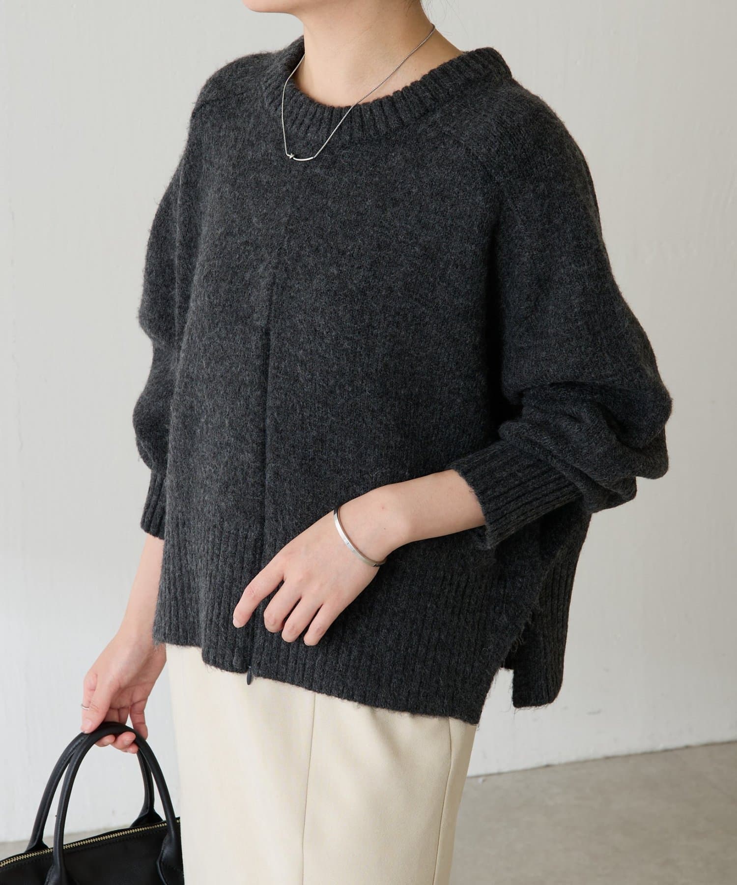 コンパクトな着丈なのでワイドパンツ、フレアスカートとも相性が良いです。