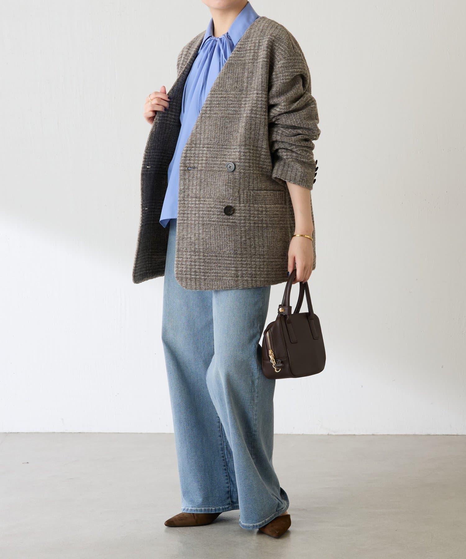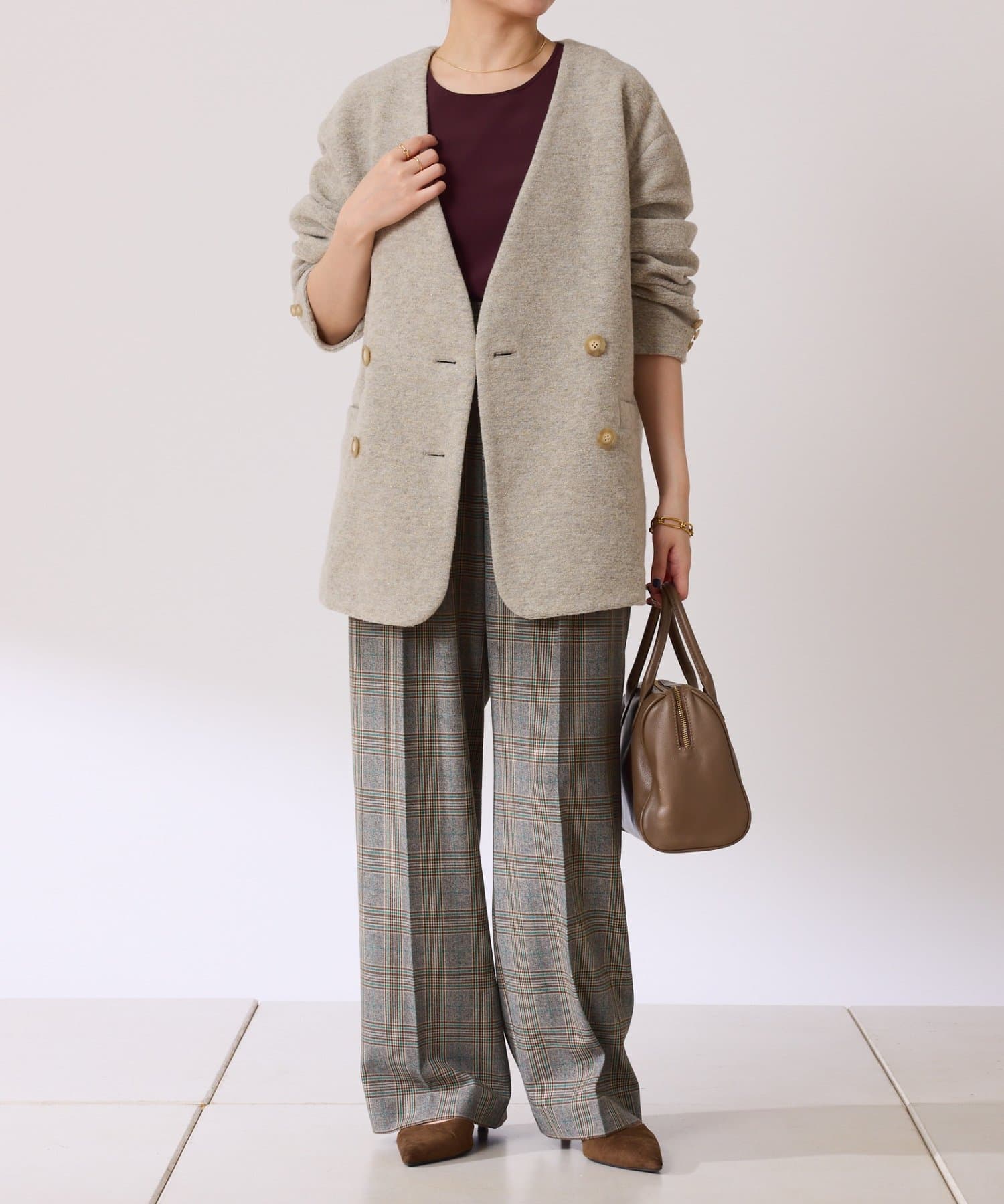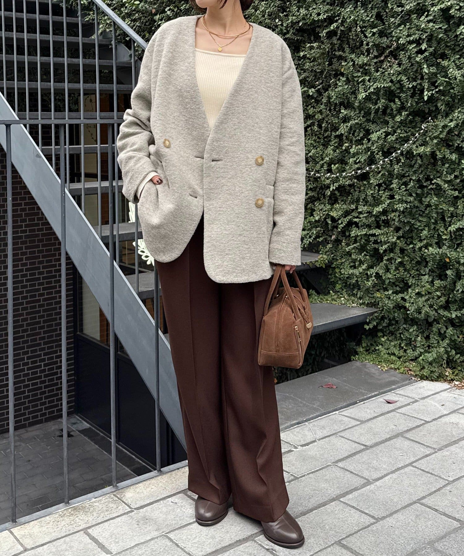 ノーカラーなのでハイネックのお洋服やブラウス、マフラー、大ぶりなネックレスで首元にアクセントを出すとバランスが良いです。