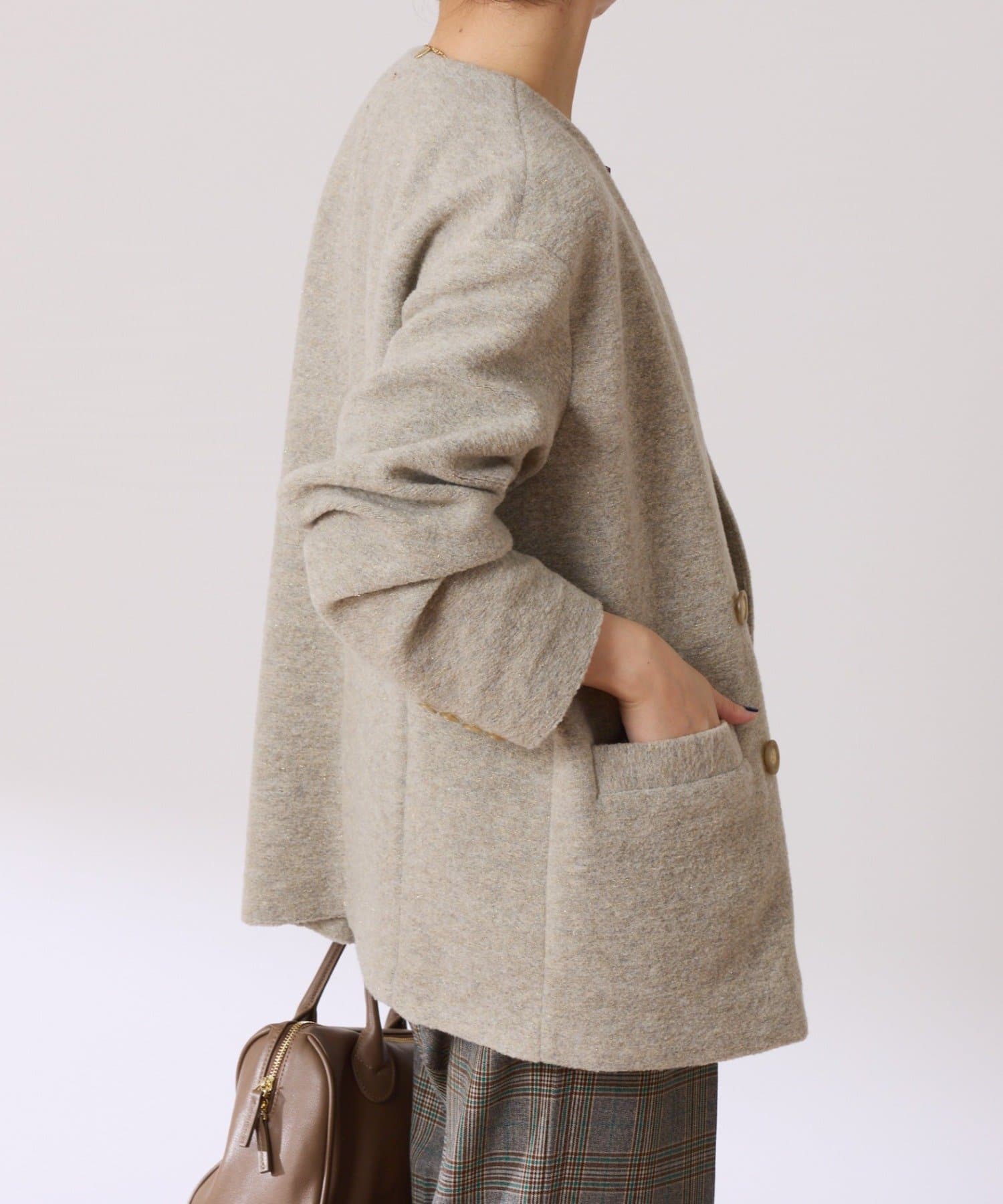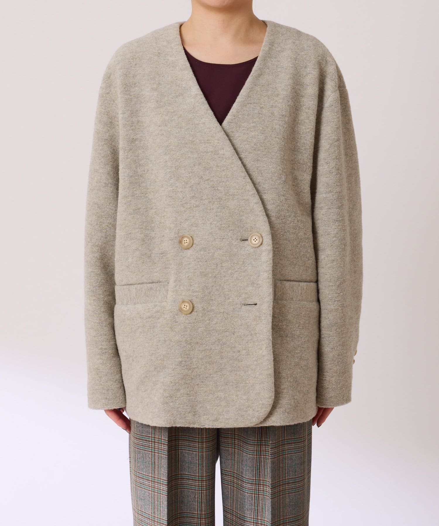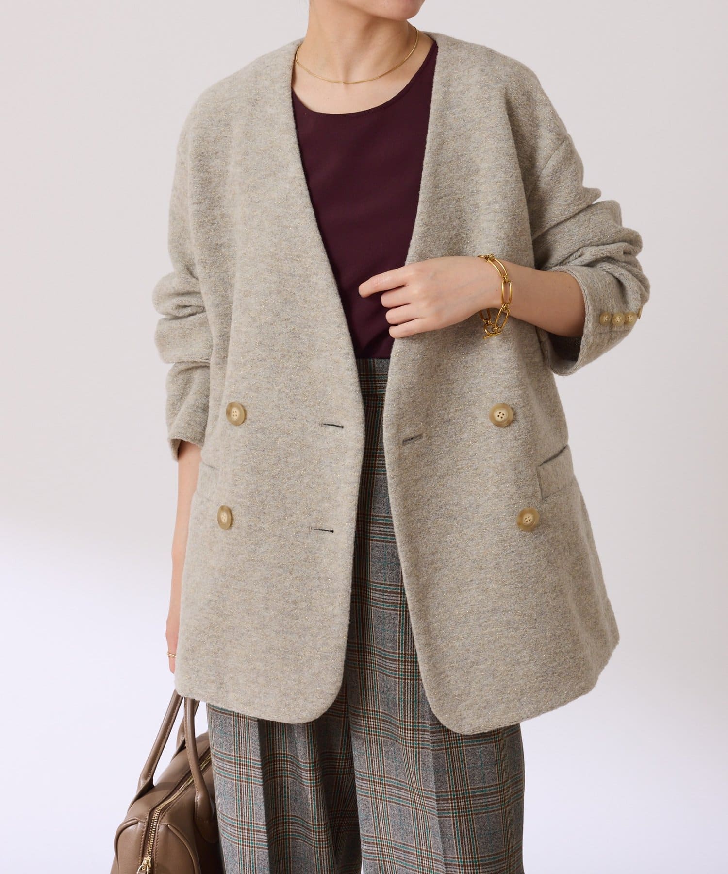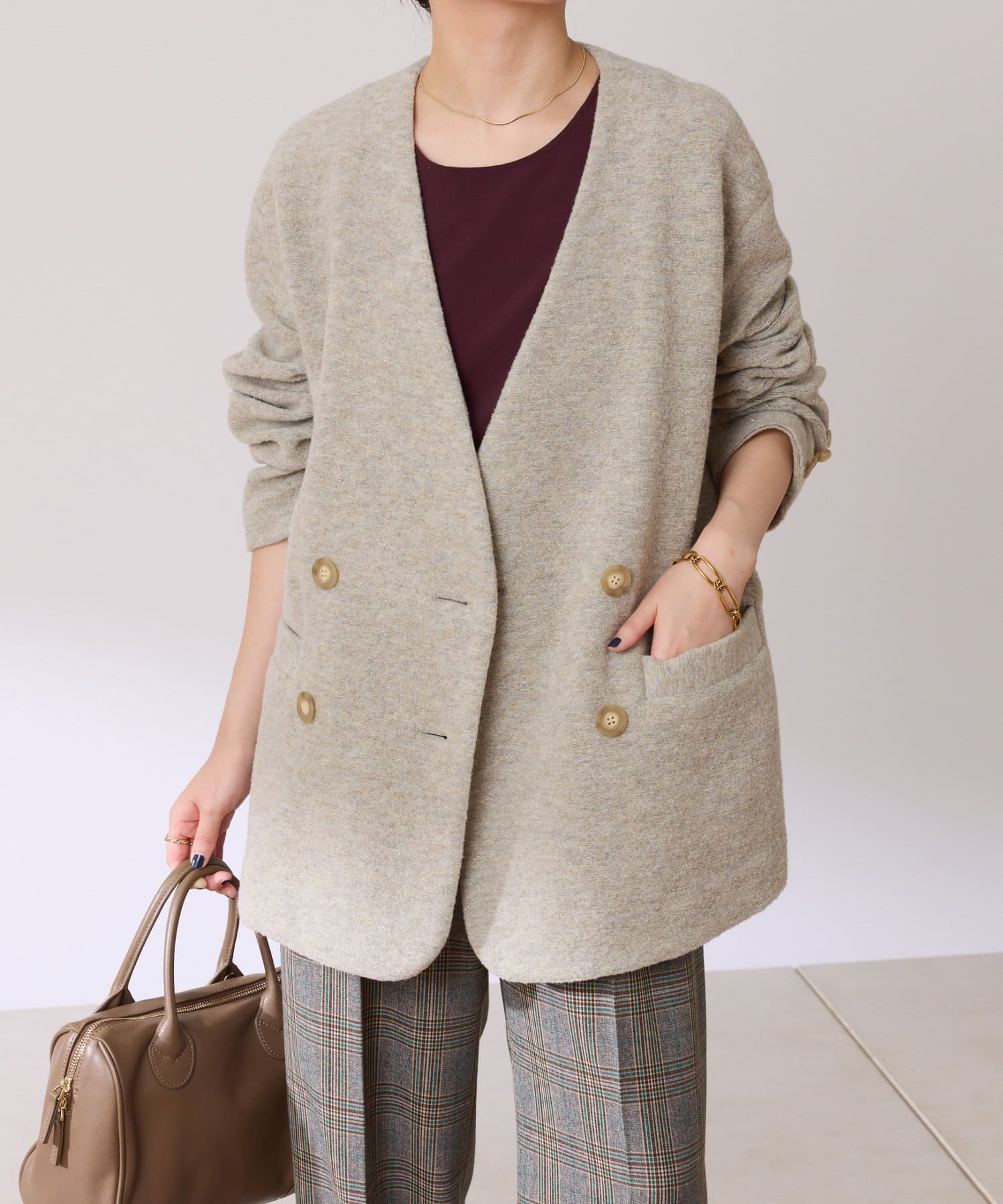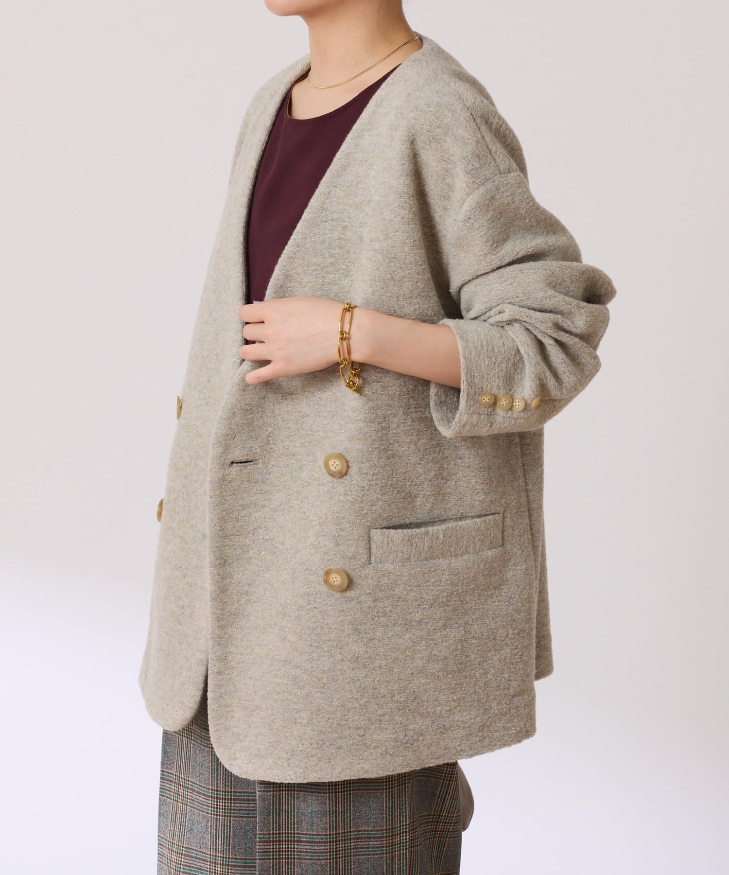 ・イタリアのスライバー素材を使用した、カーディガン感覚で羽織れるノーカラージャケット。