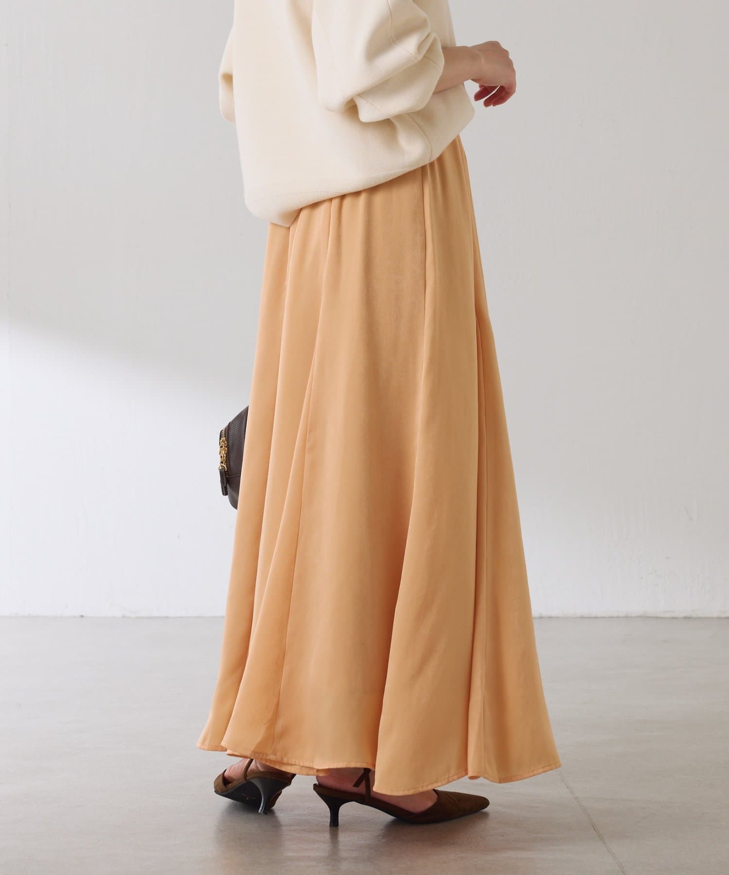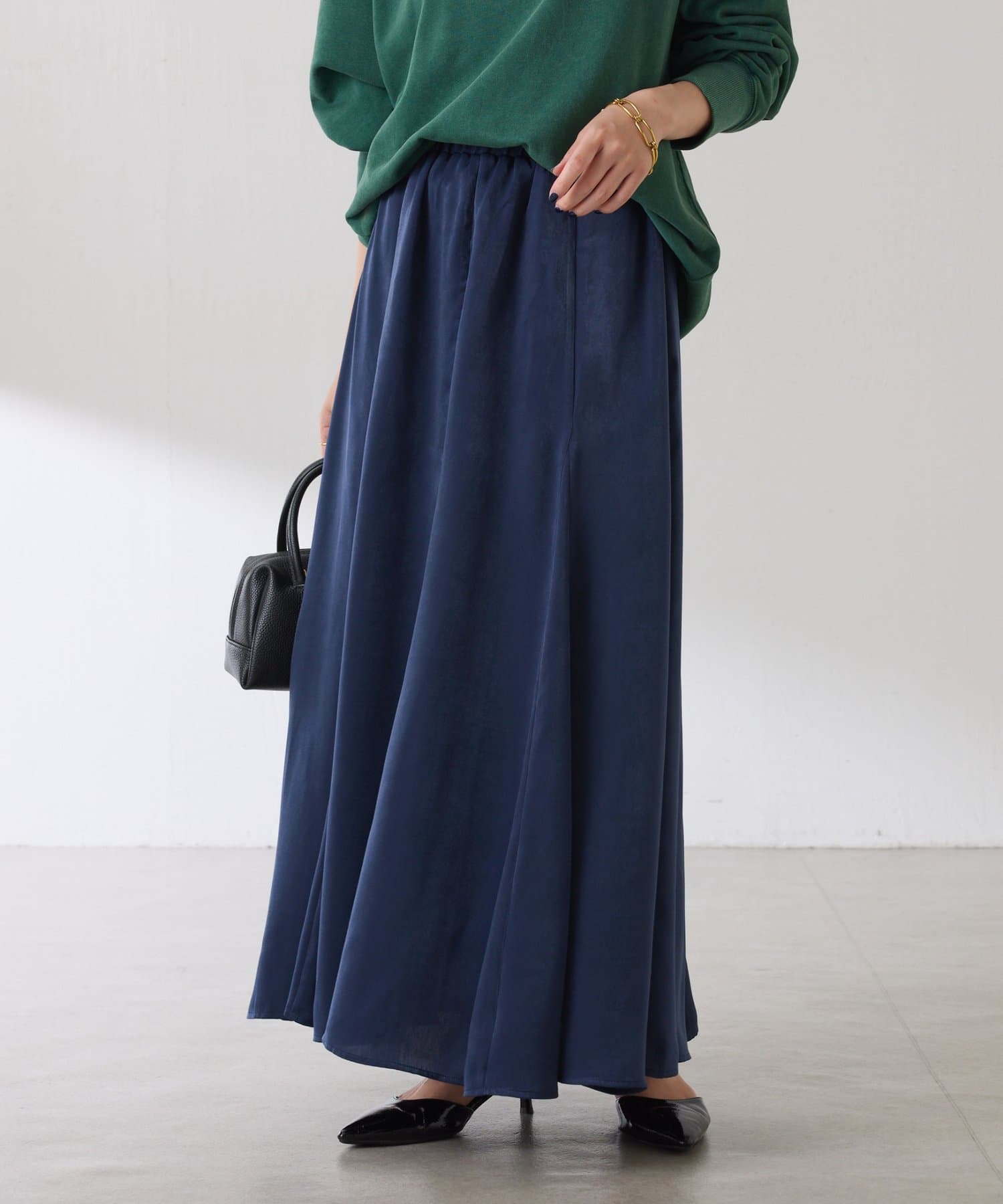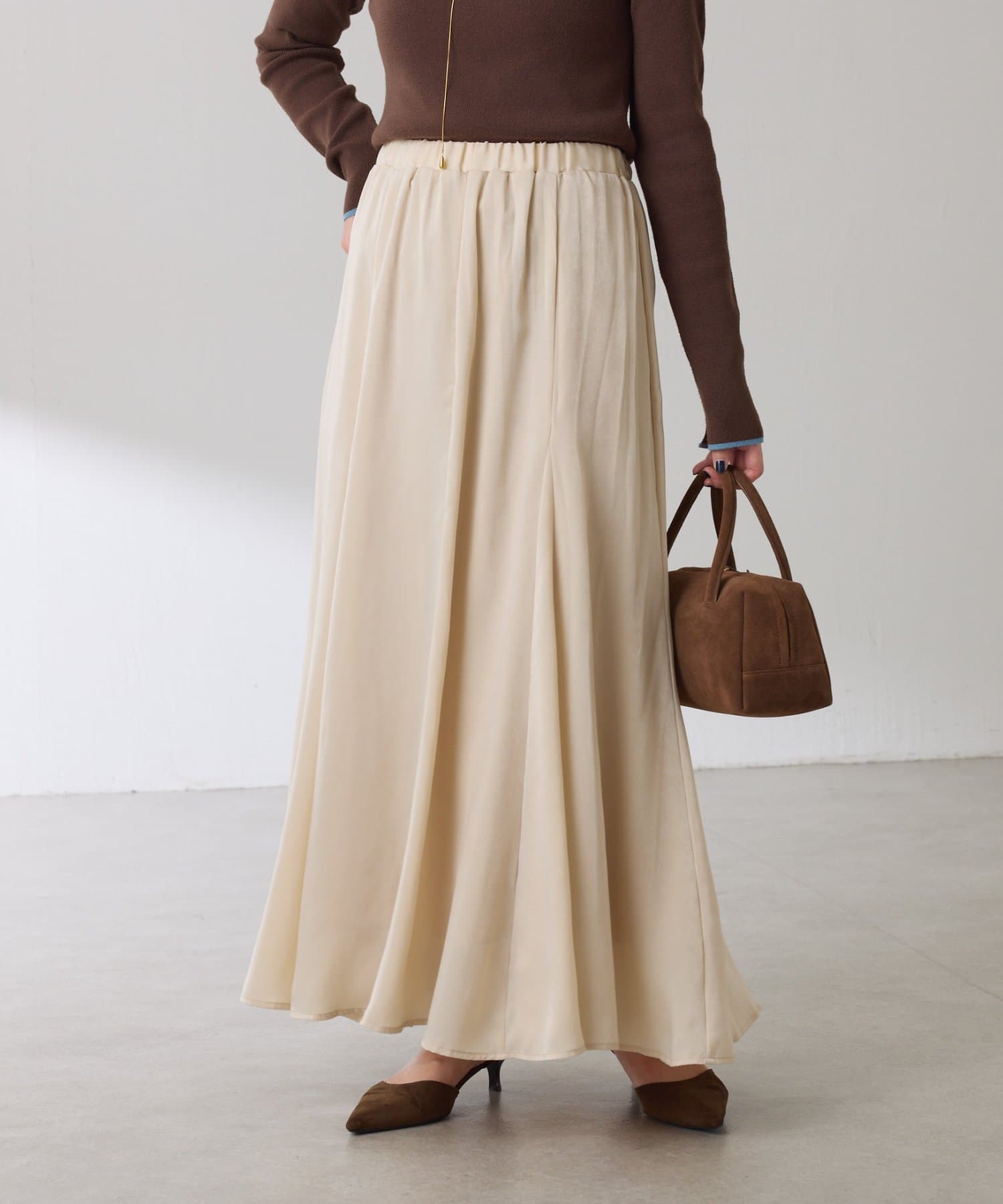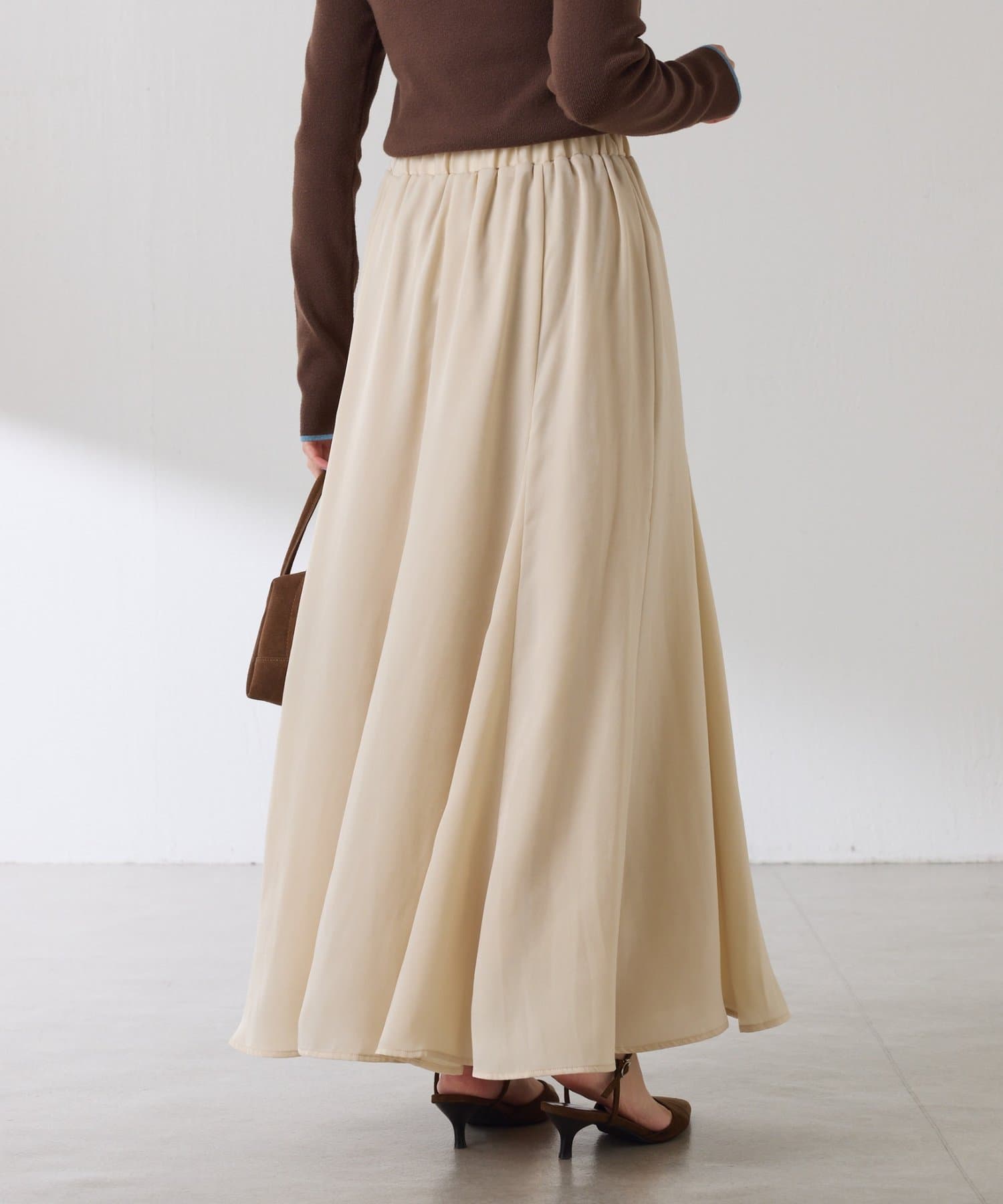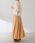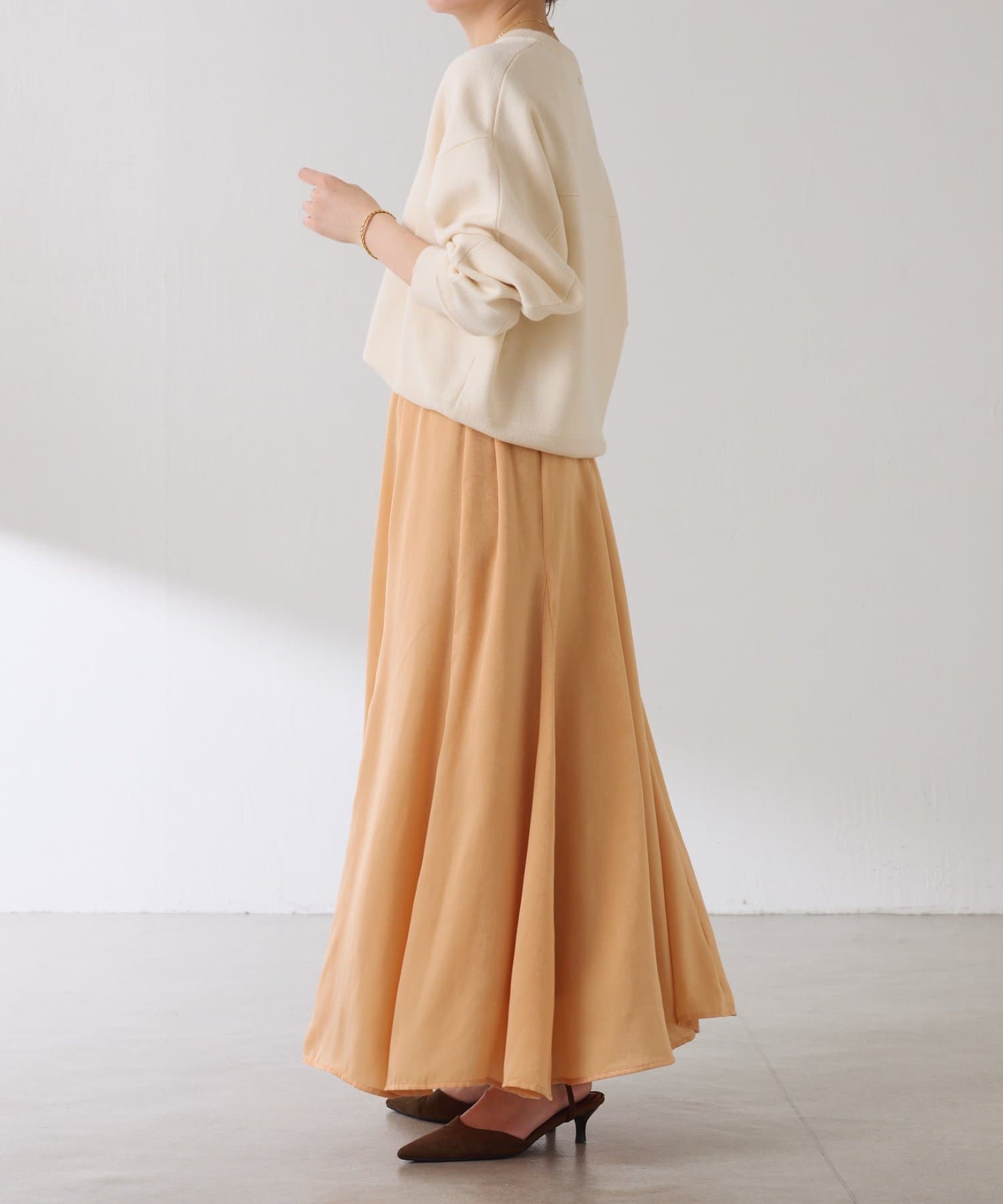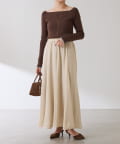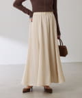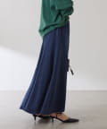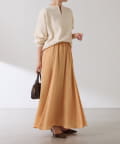 フレアデザインですが、落ち感のある生地なのでトップスは長めのスウェットや毛足の長いニットともバランスが良いです◎