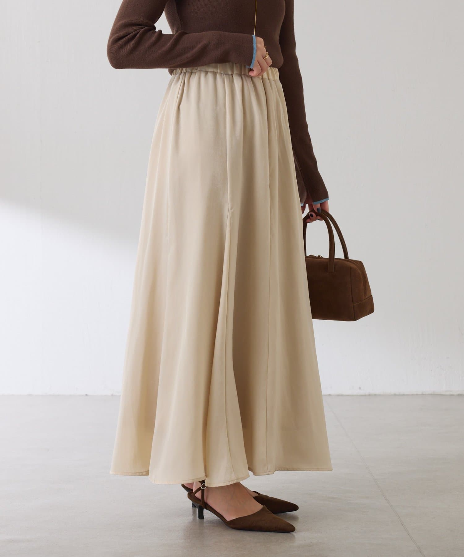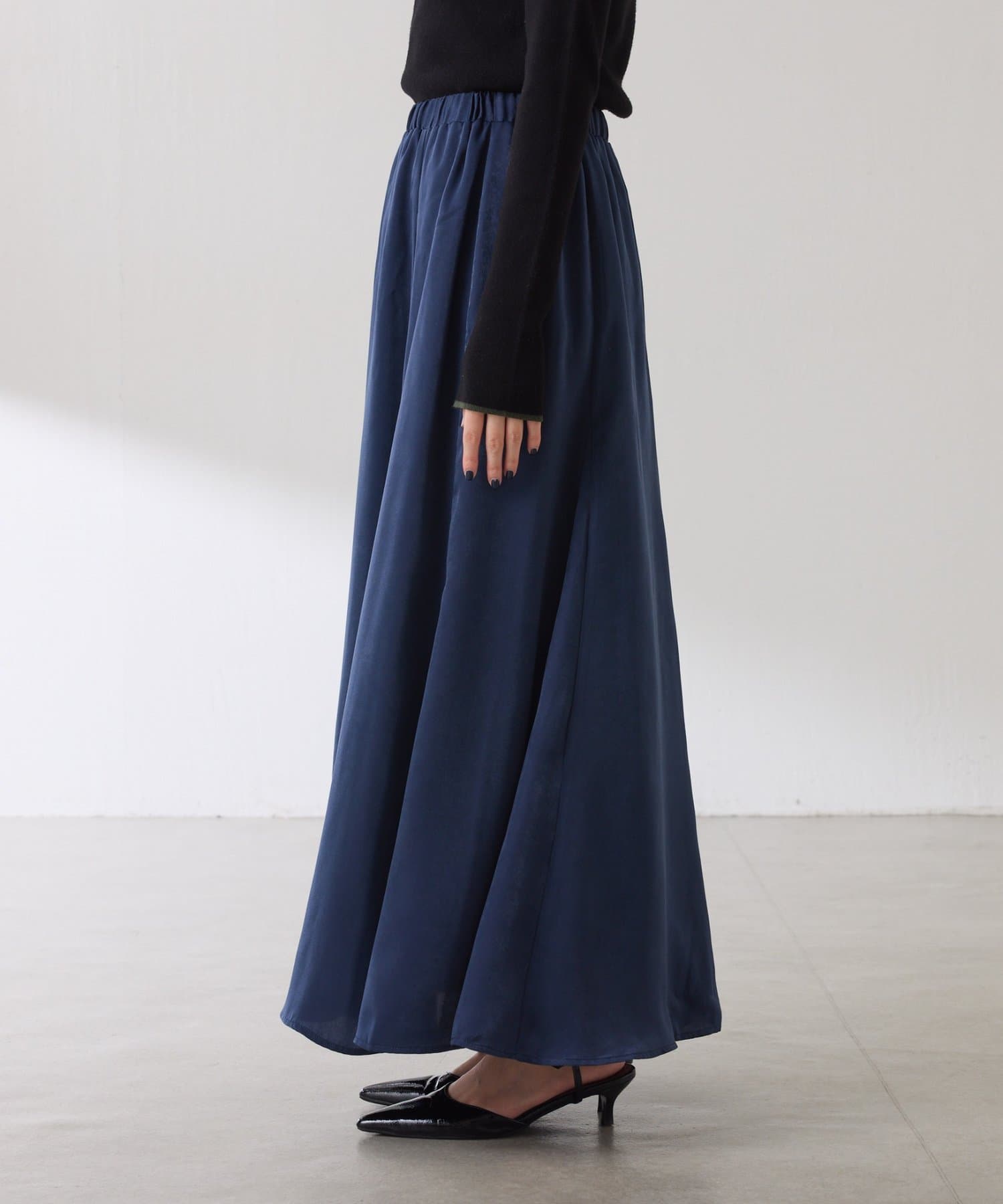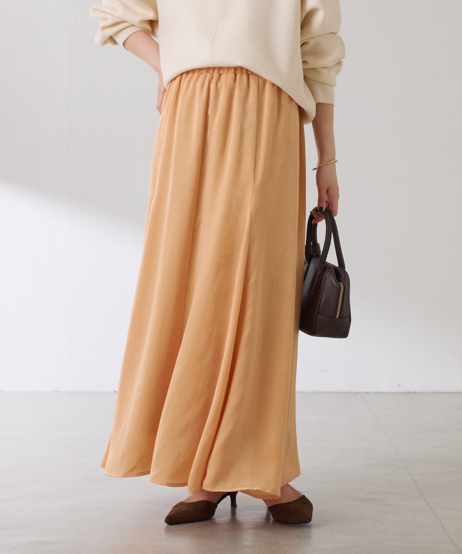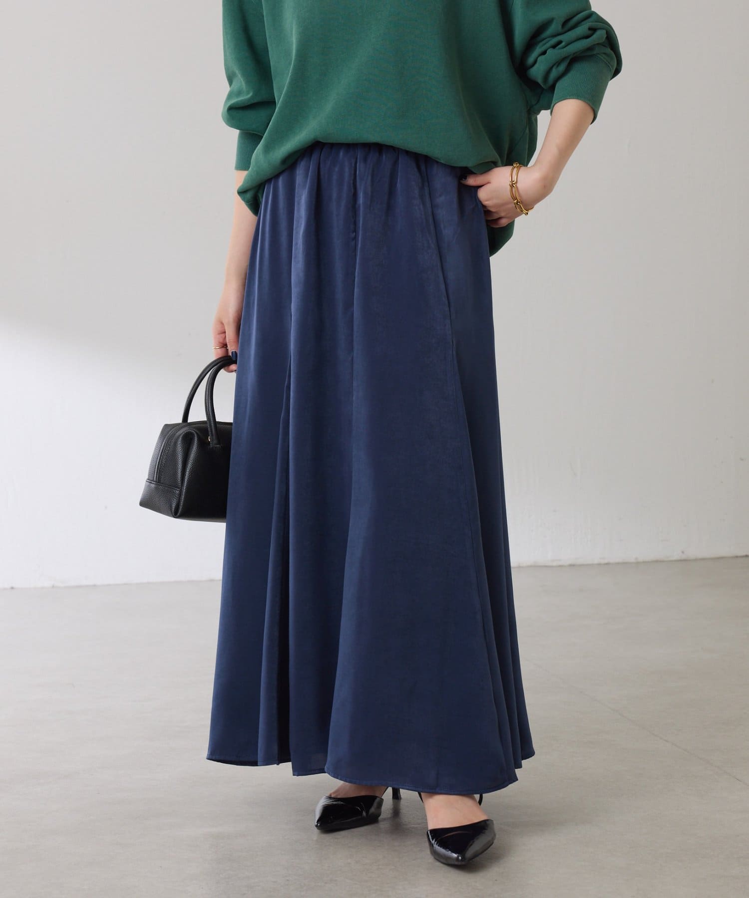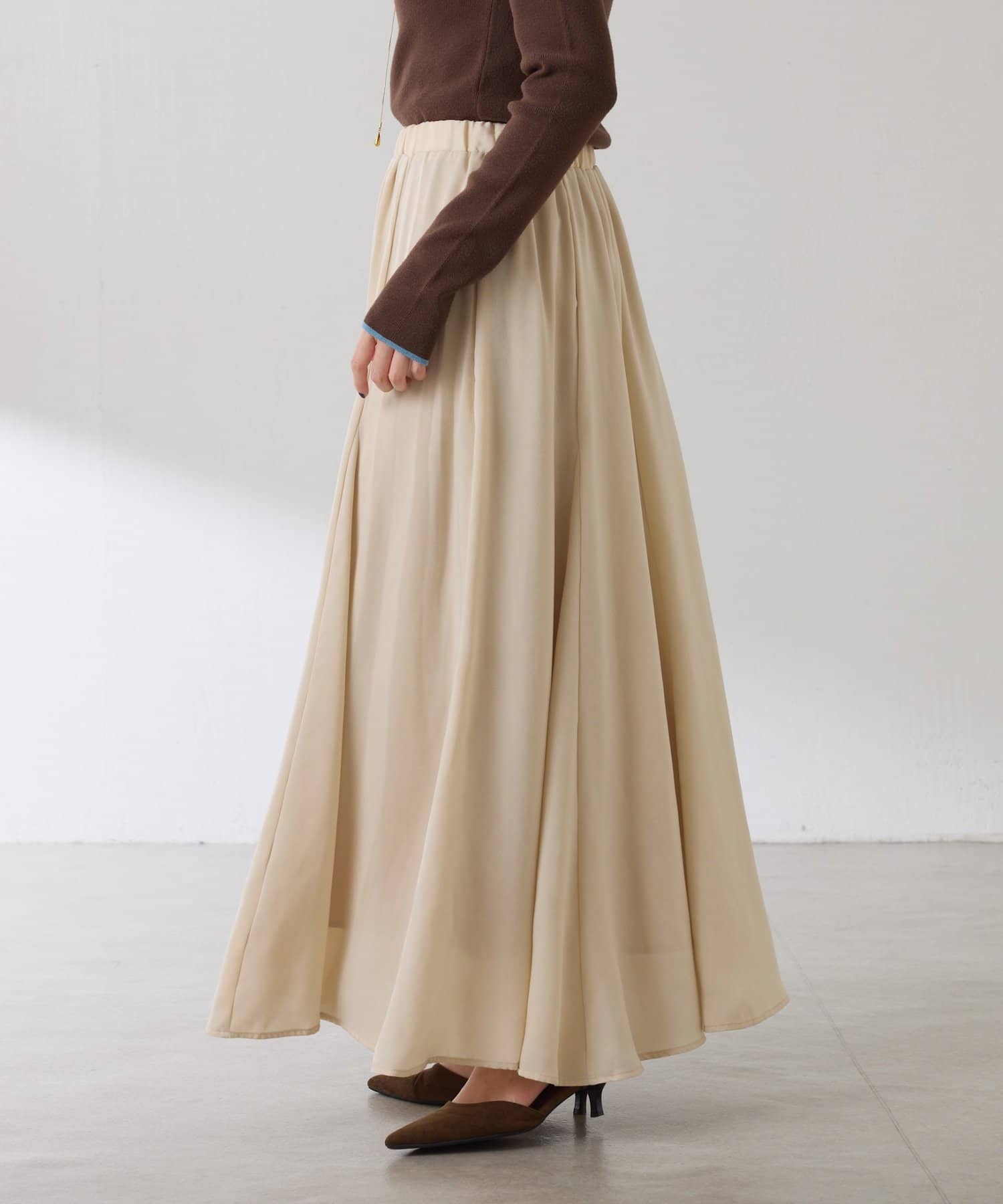 フレアデザインですが、落ち感のある生地なのでトップスは長めのスウェットや毛足の長いニットともバランスが良いです◎