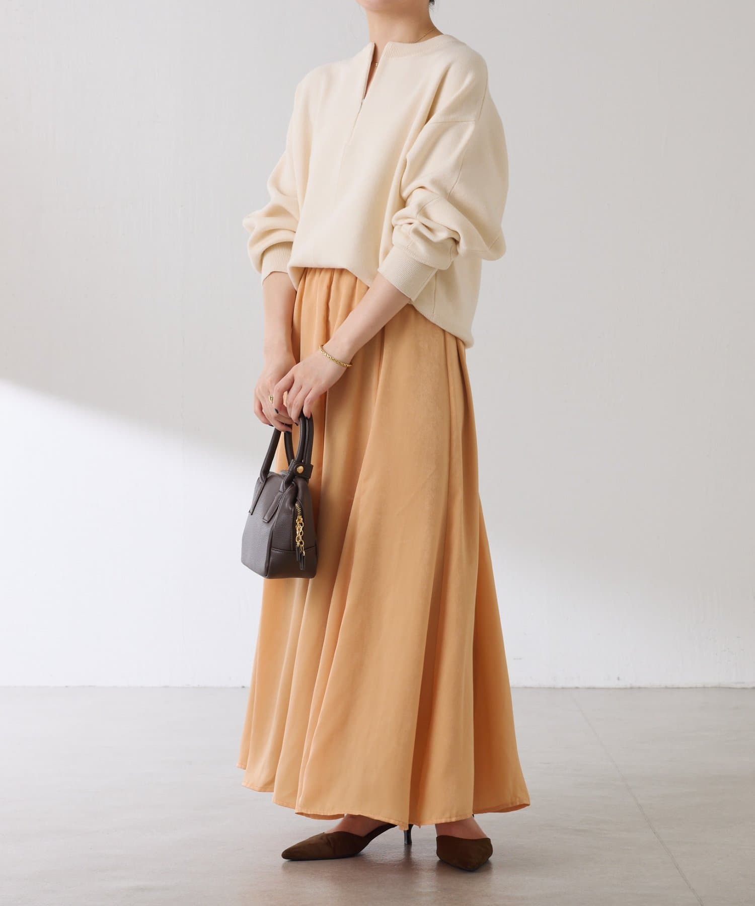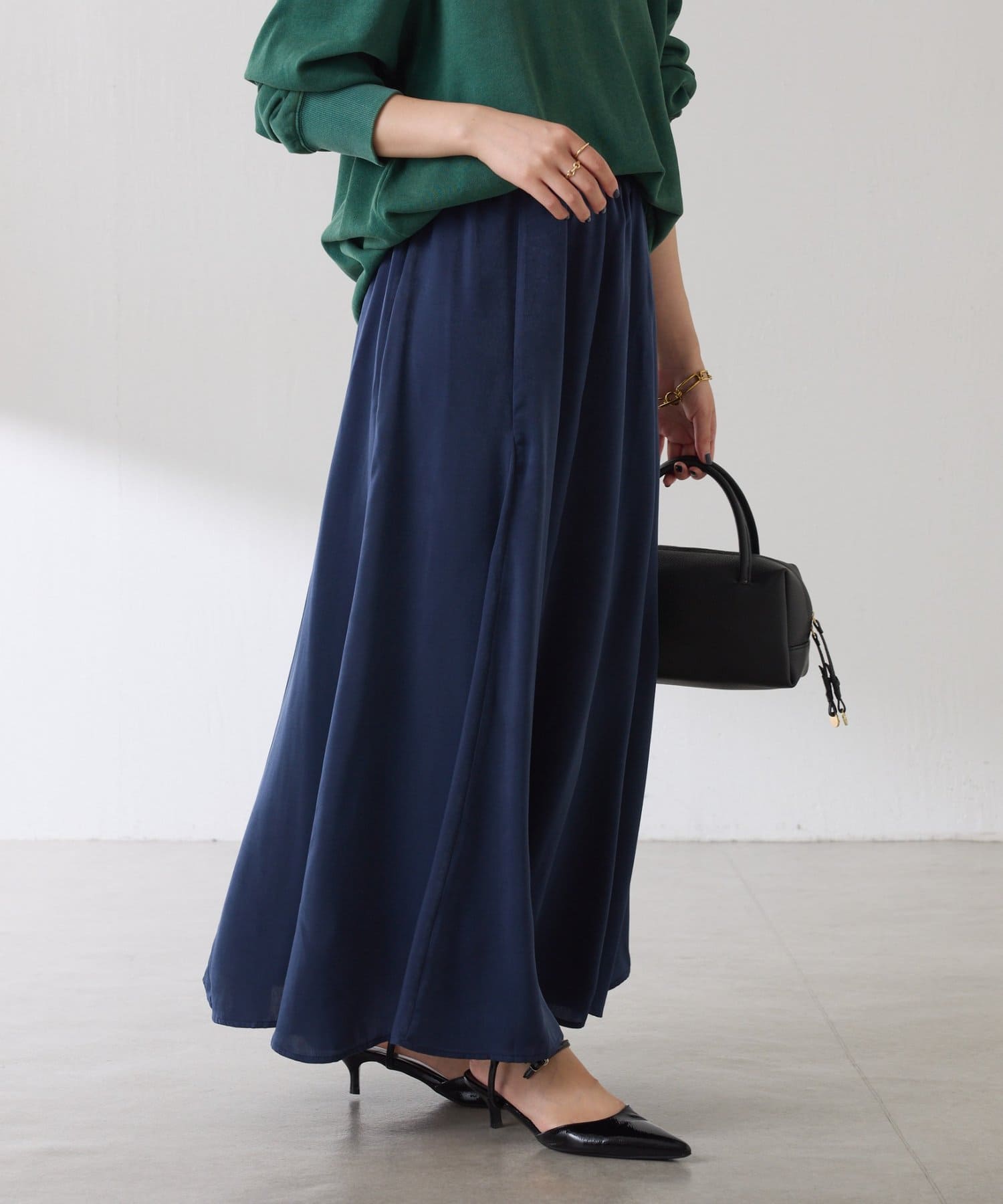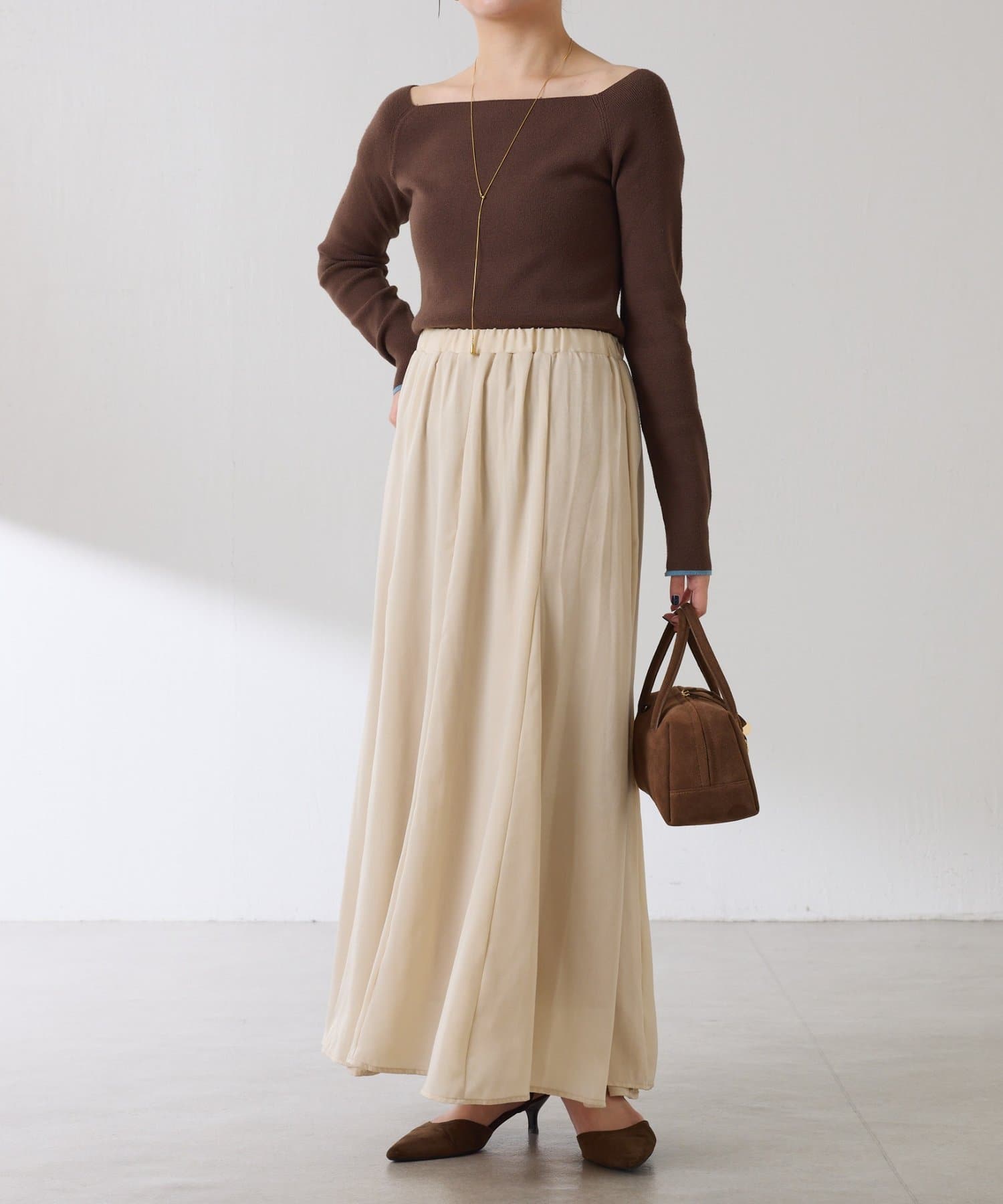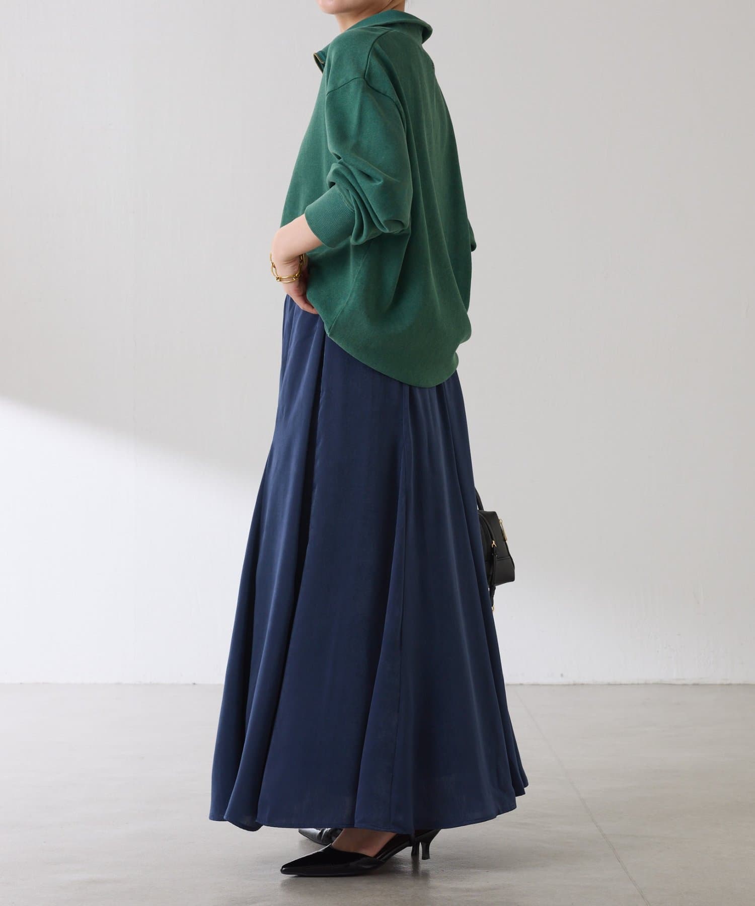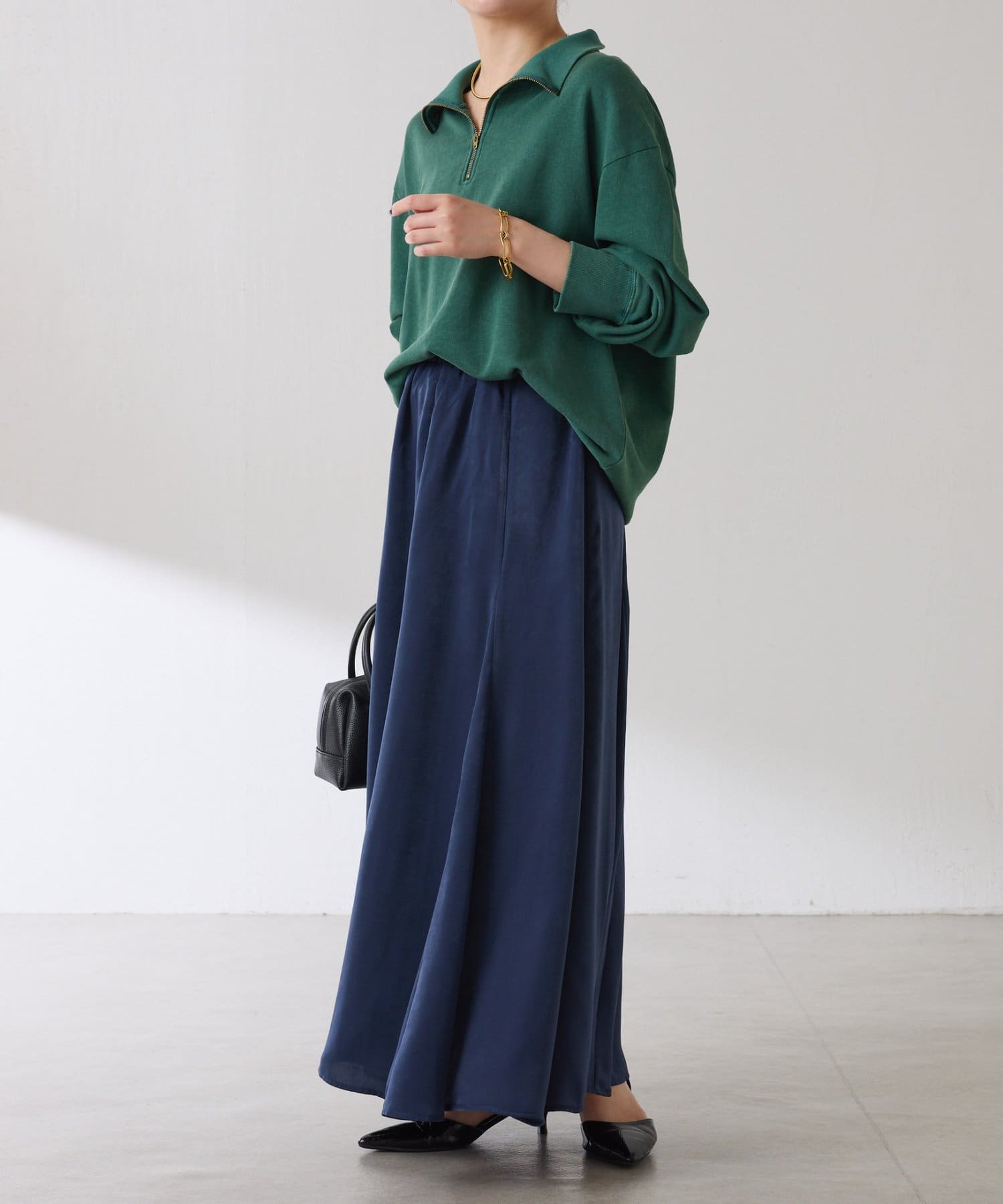 フレアデザインですが、落ち感のある生地なのでトップスは長めのスウェットや毛足の長いニットともバランスが良いです◎