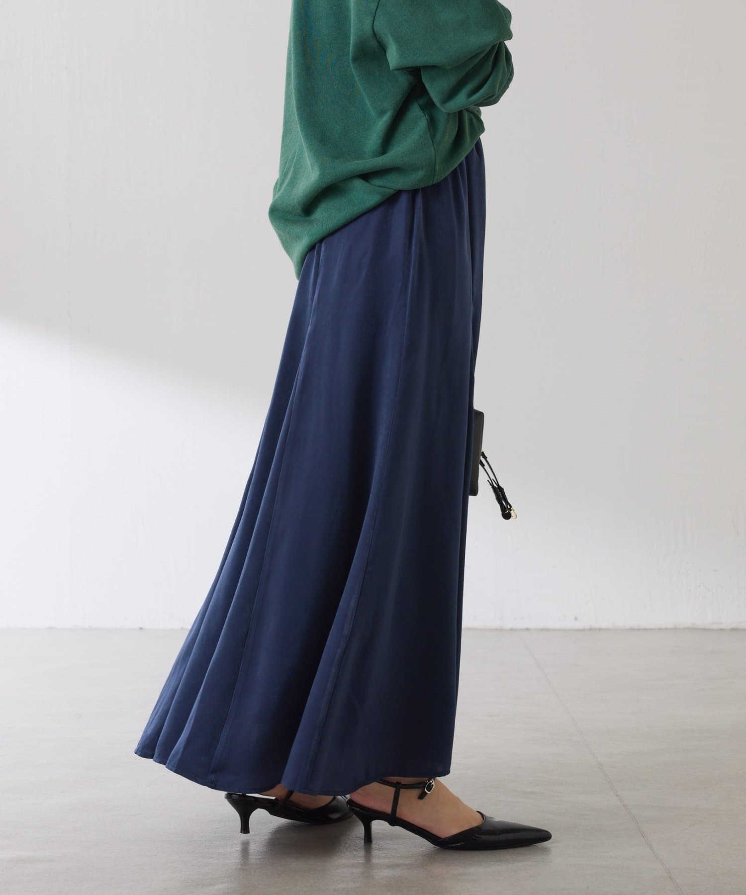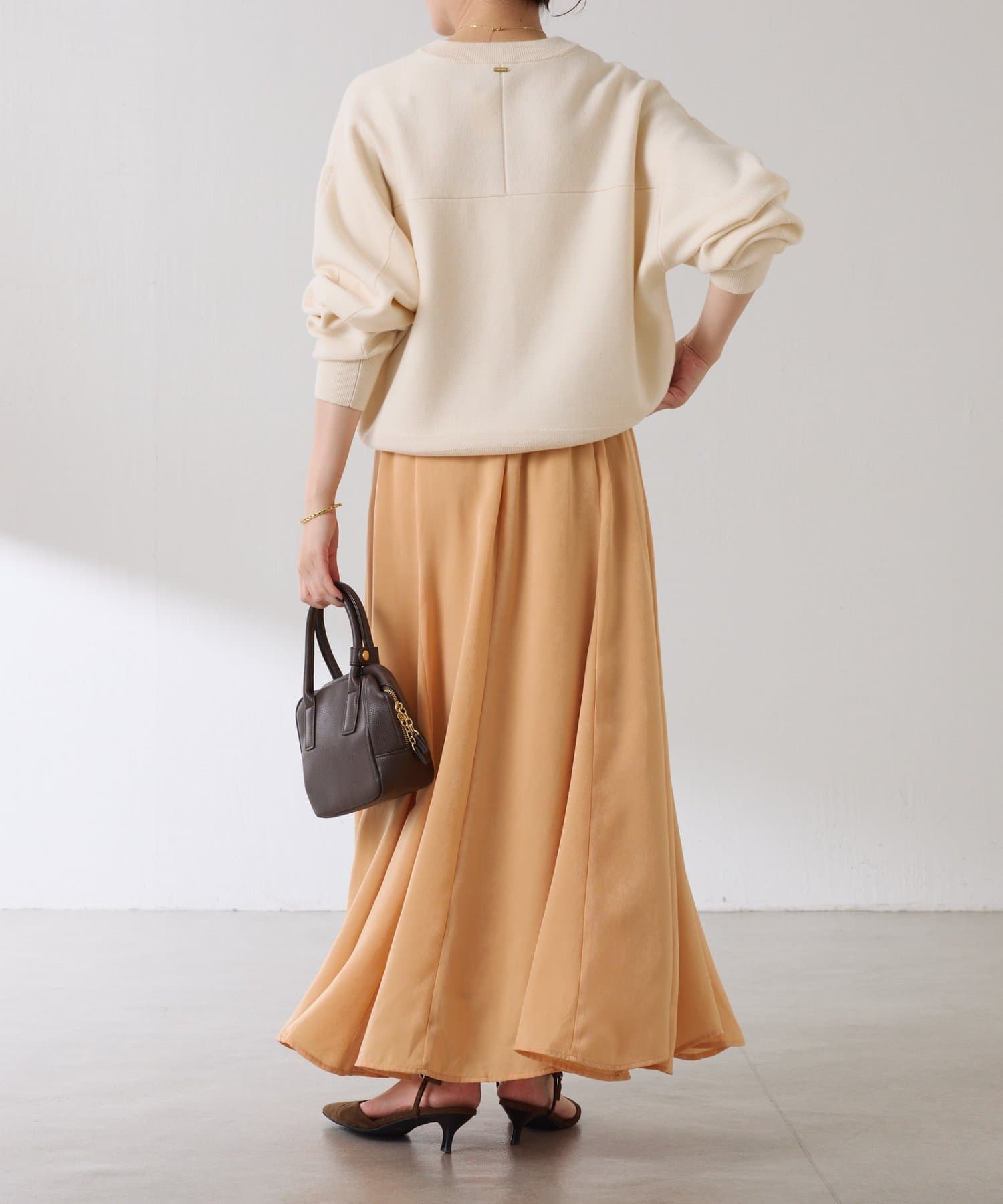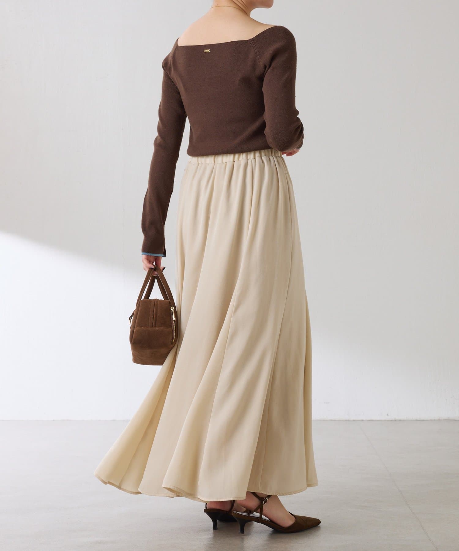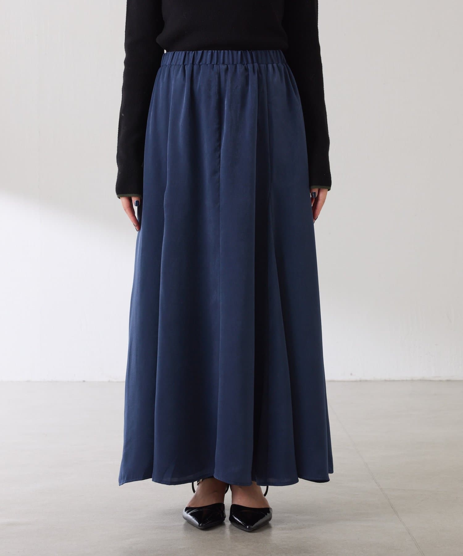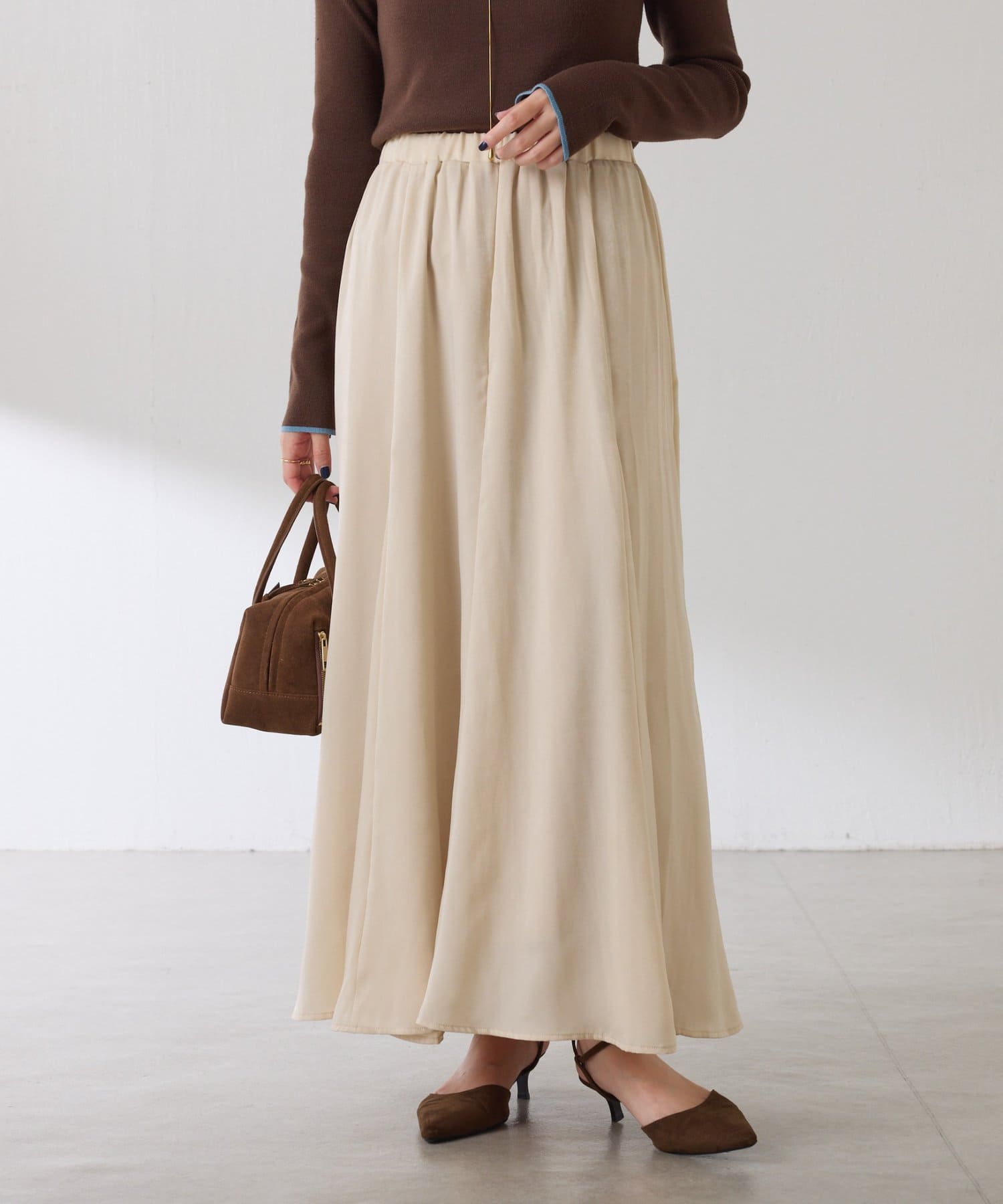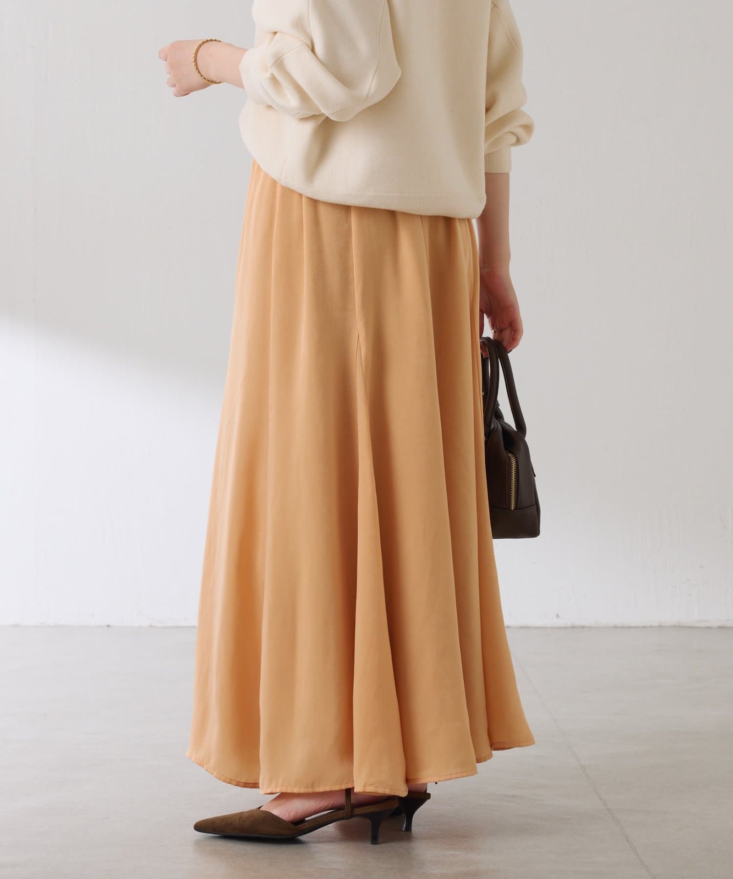フレアデザインですが、落ち感のある生地なのでトップスは長めのスウェットや毛足の長いニットともバランスが良いです◎