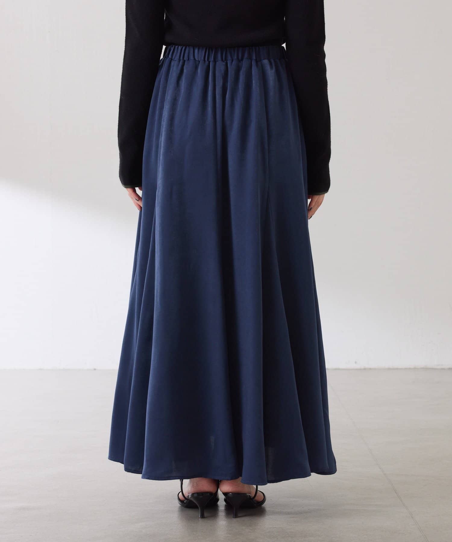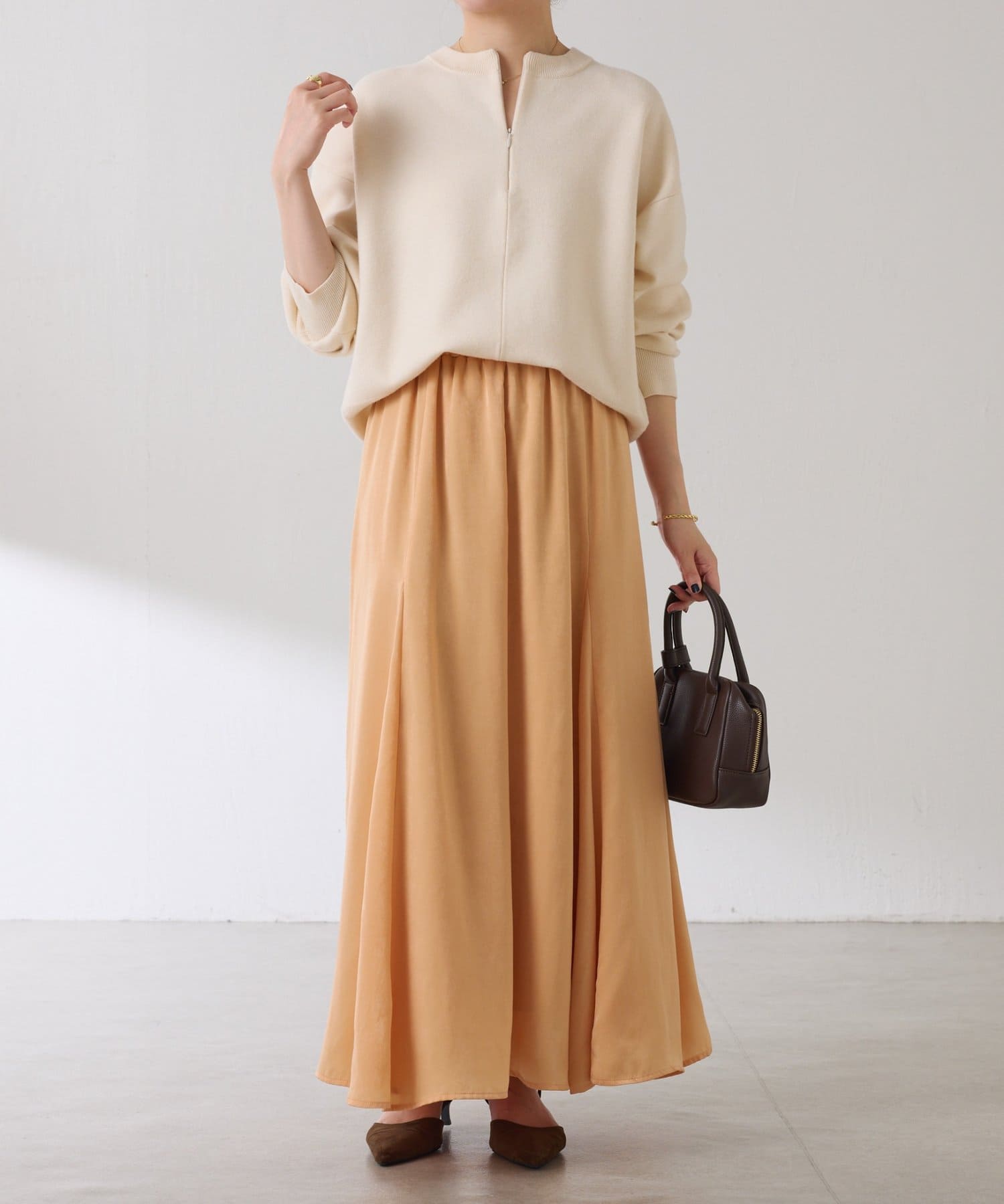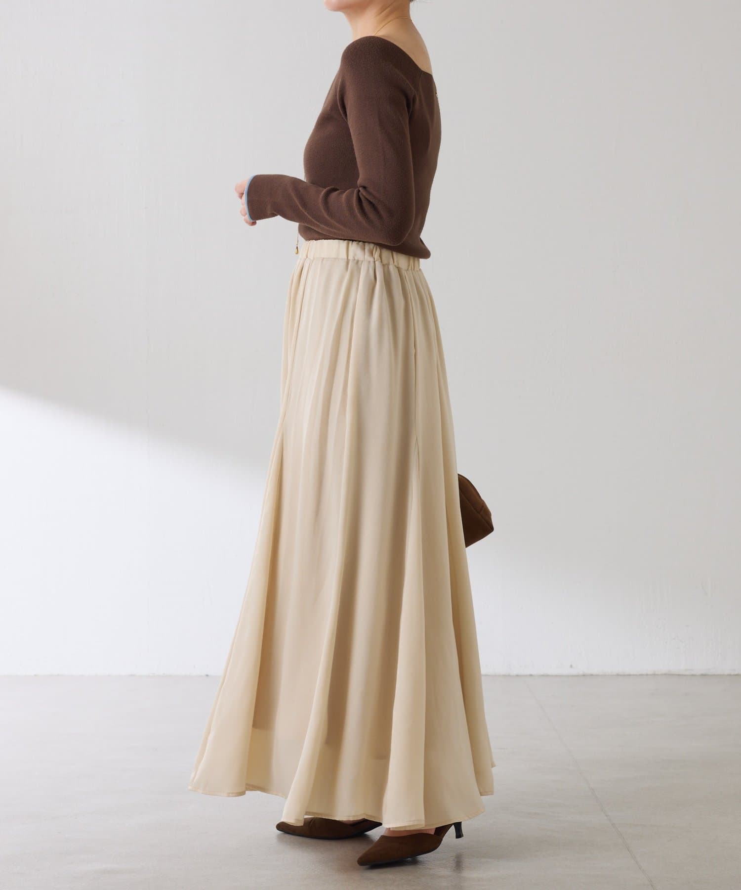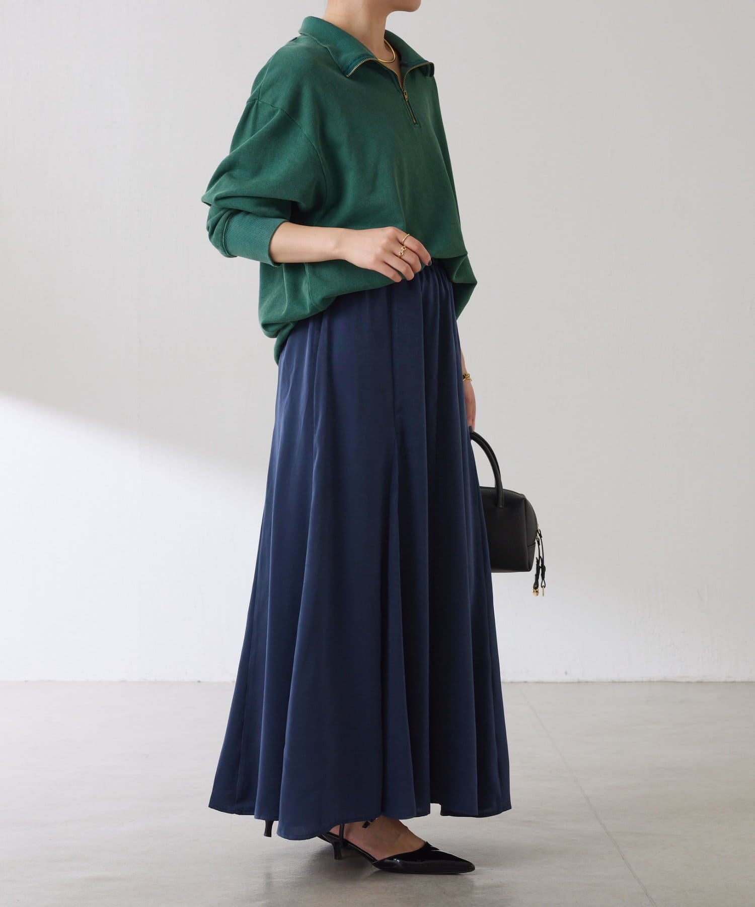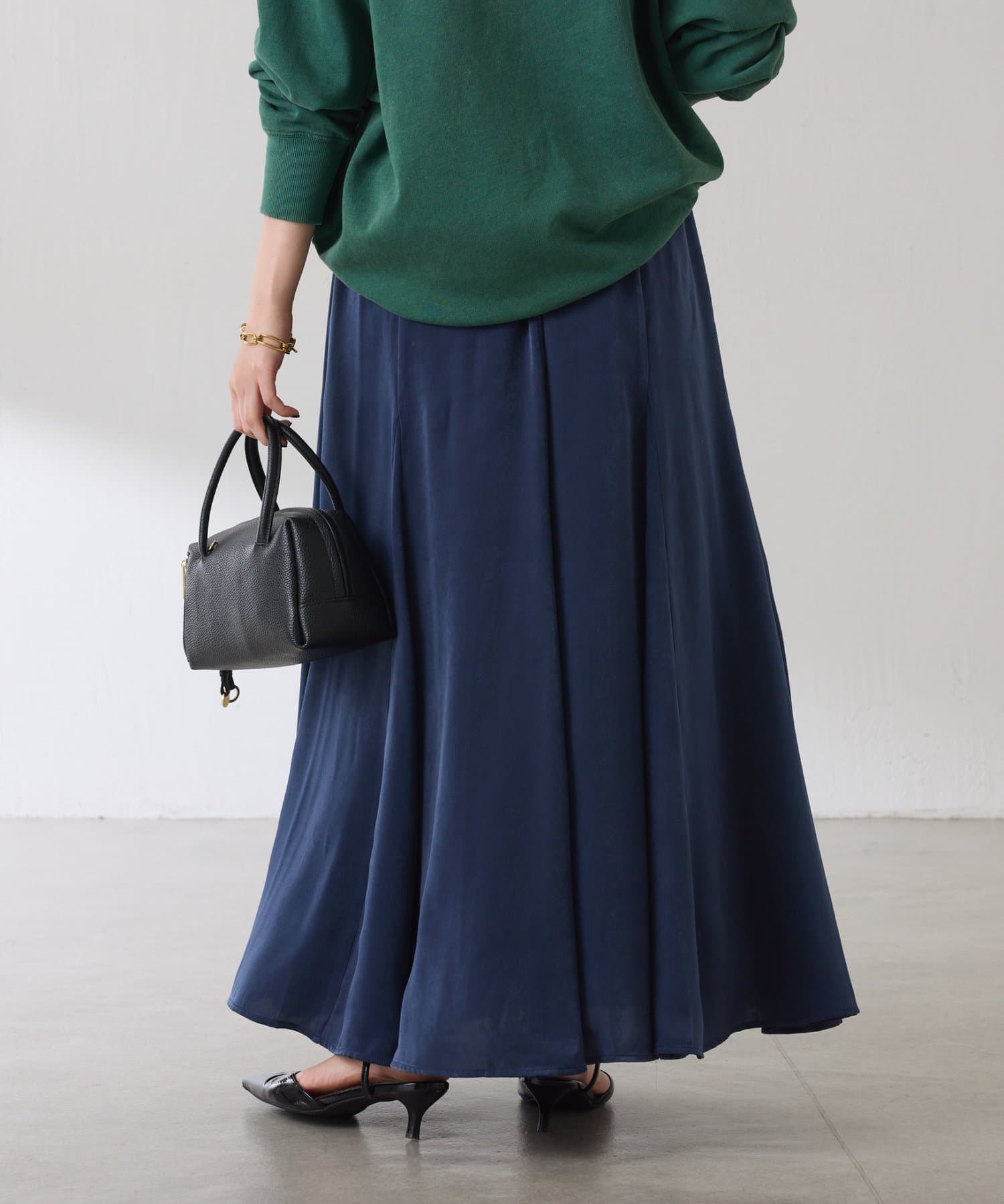 フレアデザインですが、落ち感のある生地なのでトップスは長めのスウェットや毛足の長いニットともバランスが良いです◎