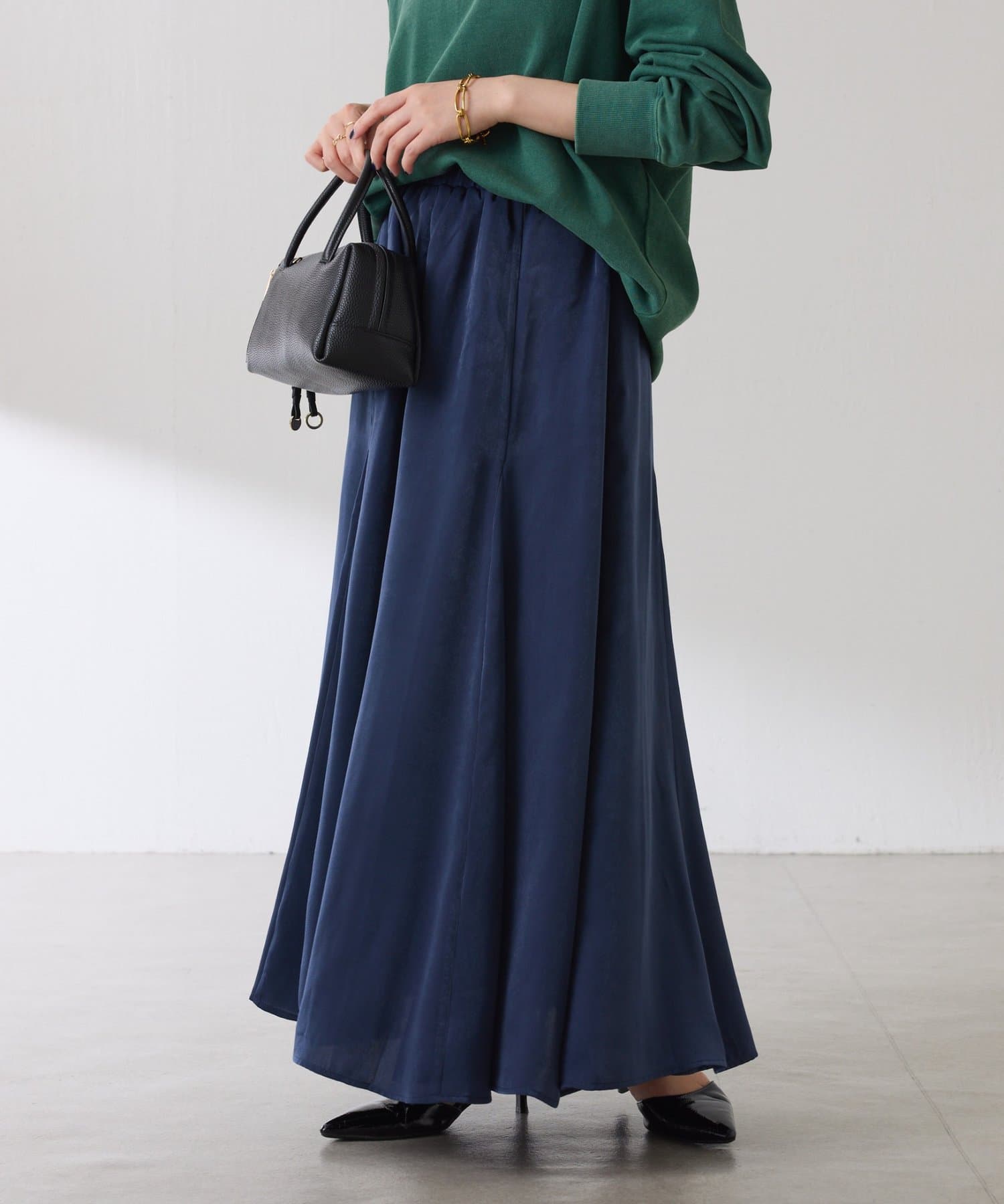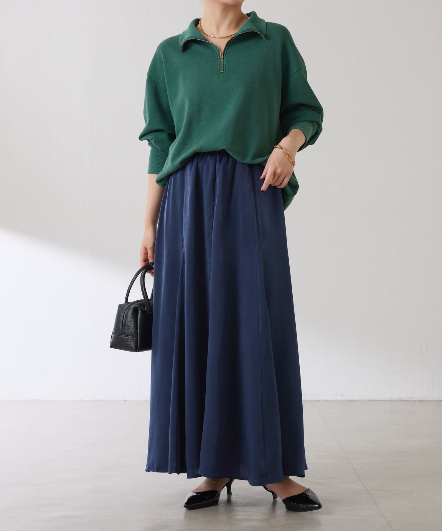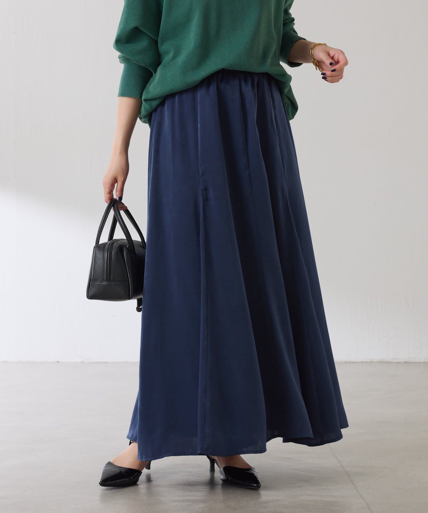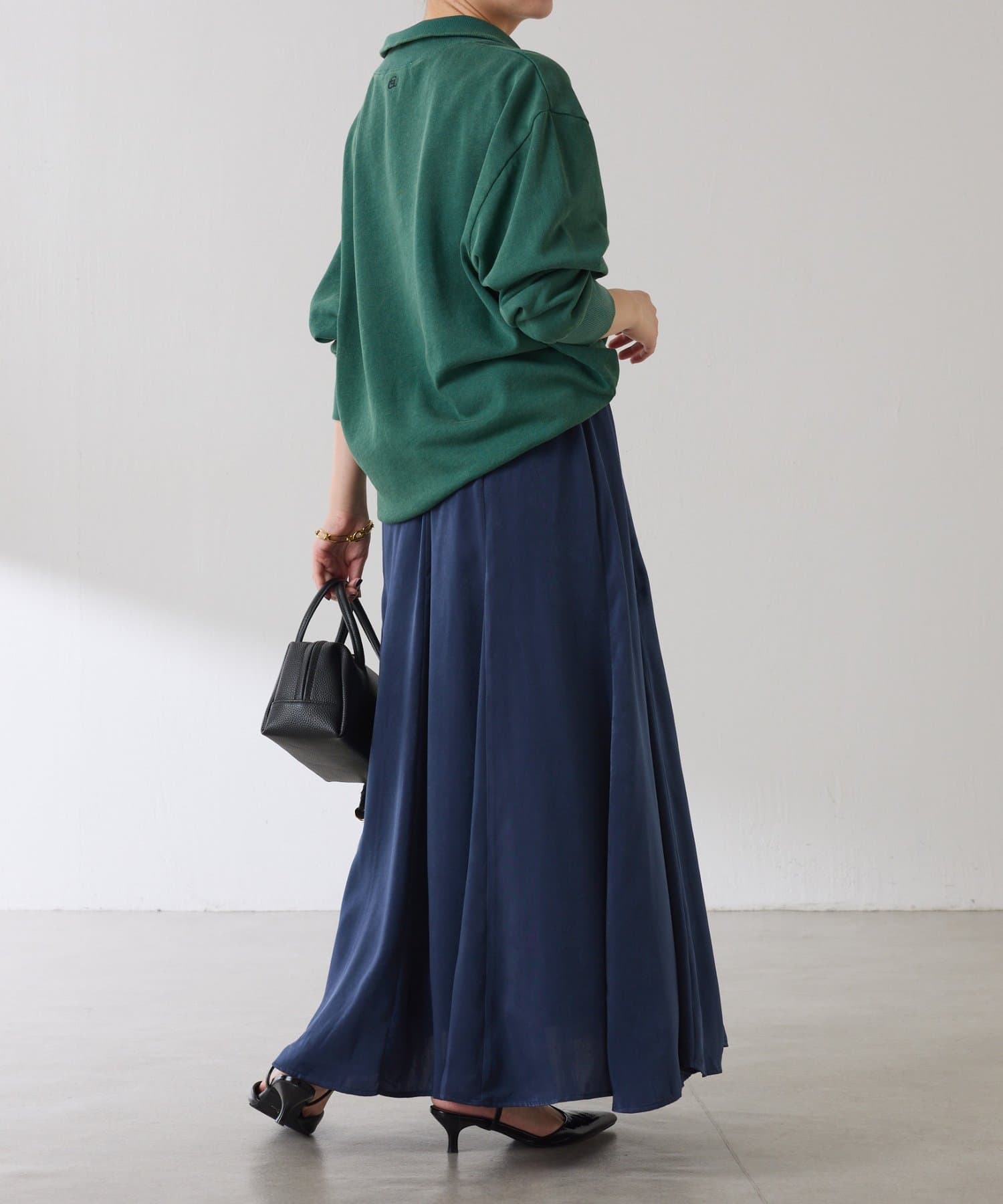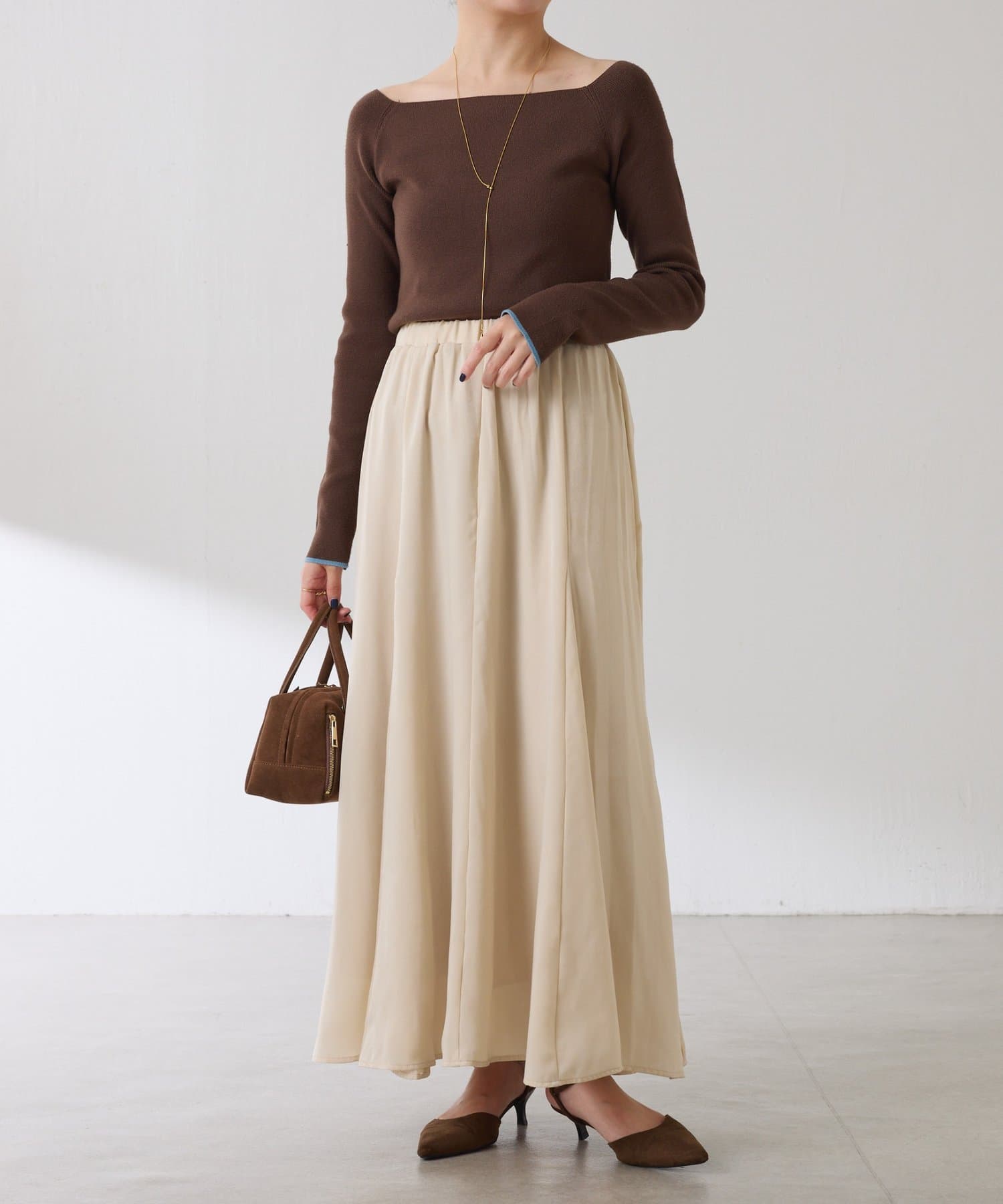 フレアデザインですが、落ち感のある生地なのでトップスは長めのスウェットや毛足の長いニットともバランスが良いです◎