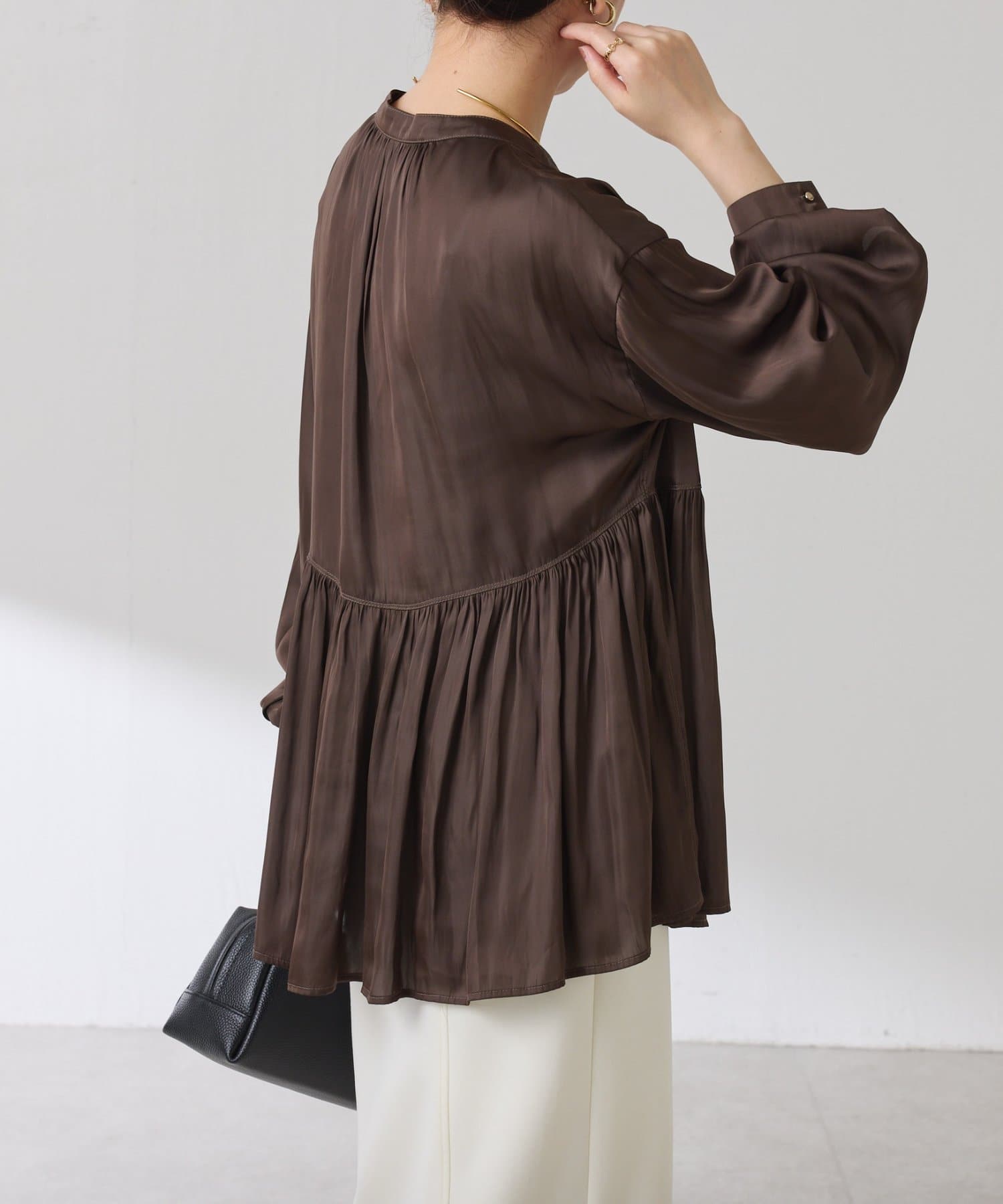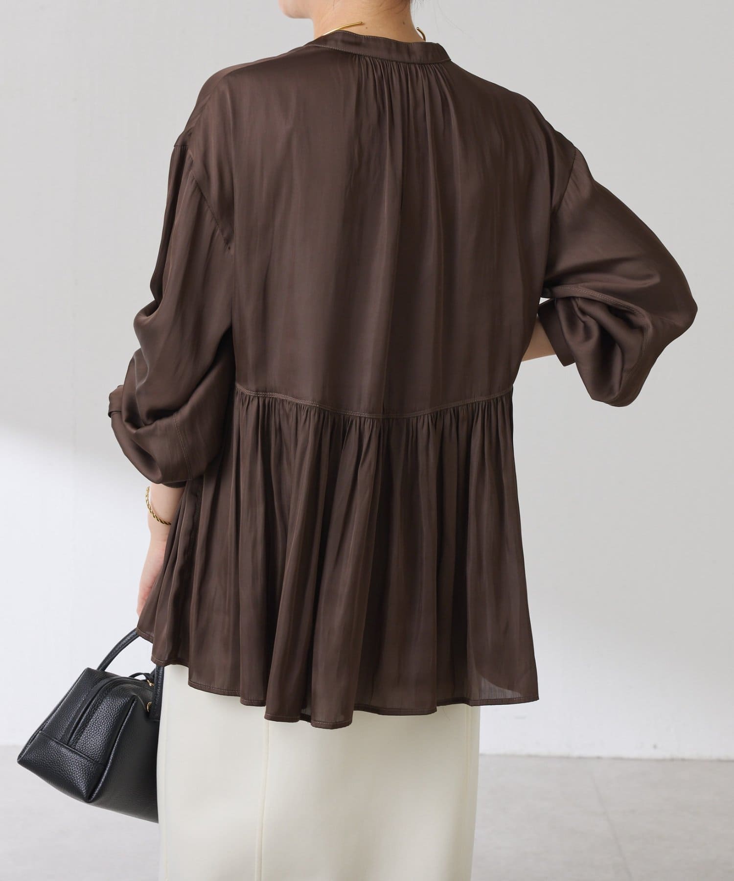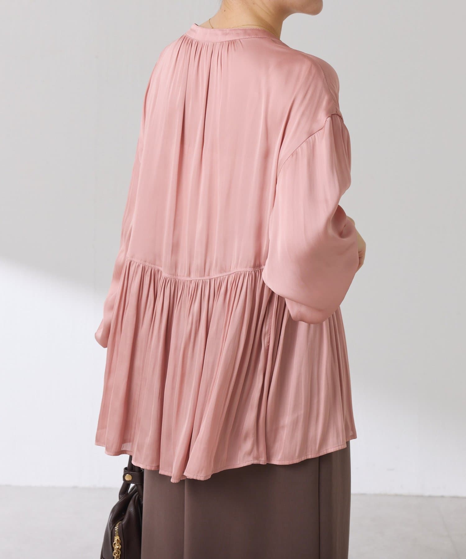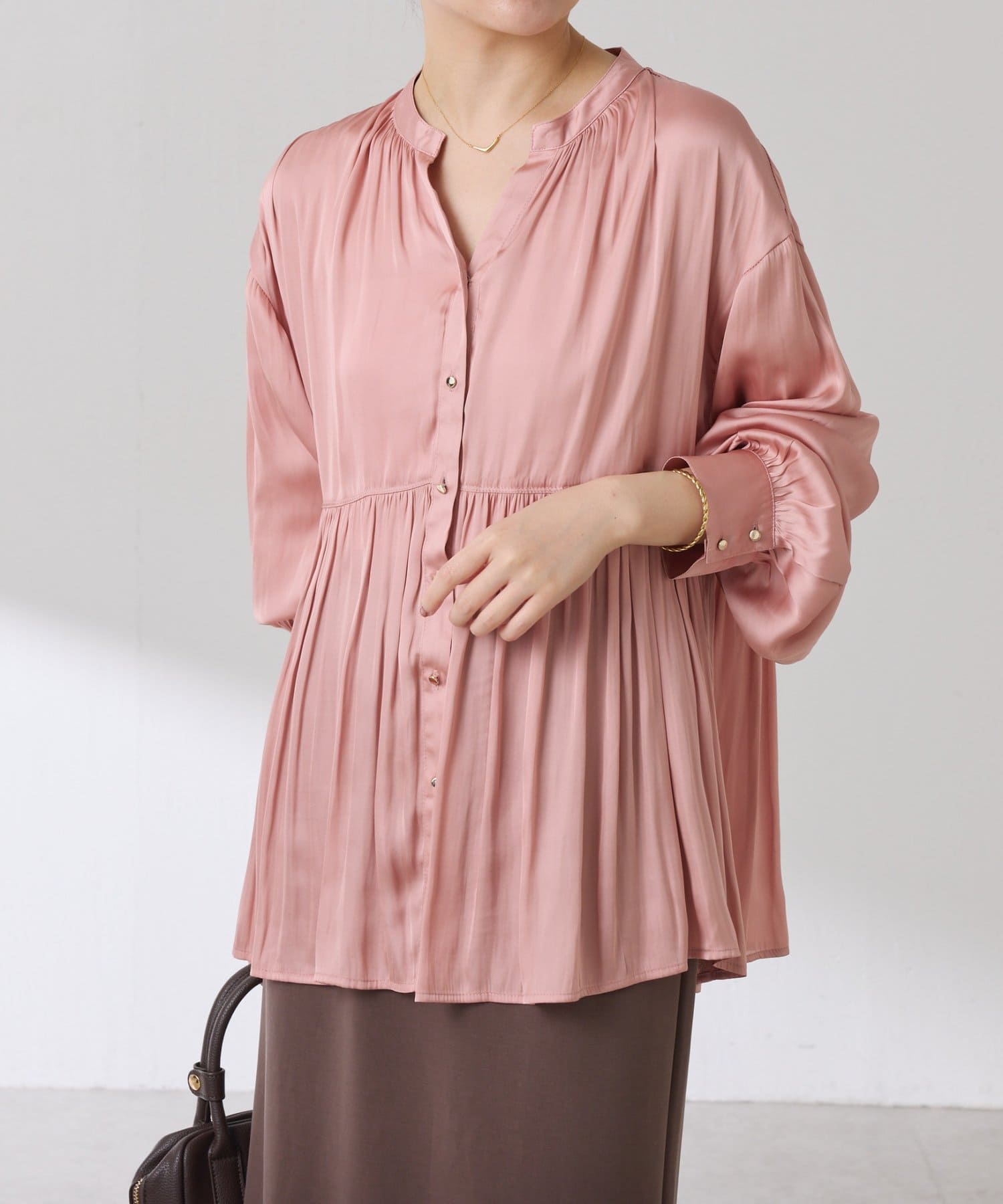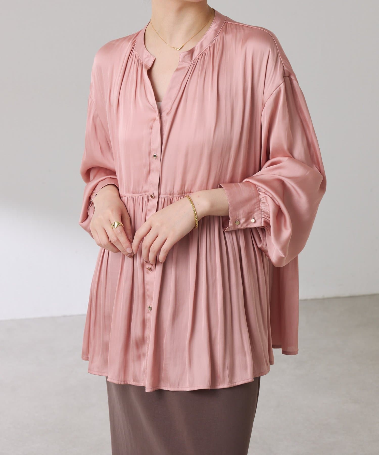 ・繊細な光沢感と柔らかな風合いが魅力のサテンブラウス。