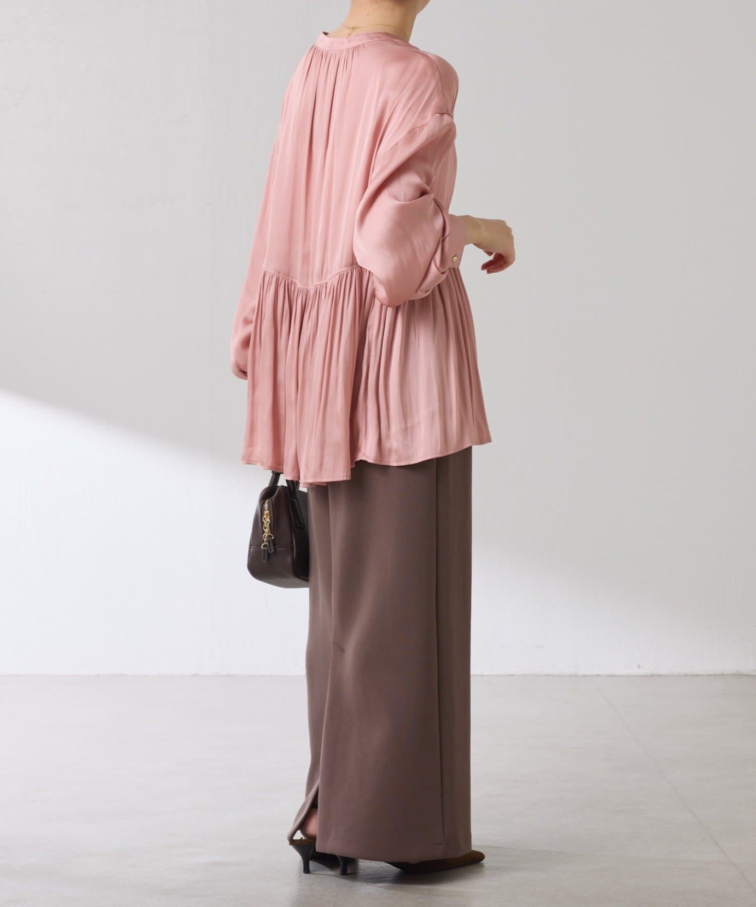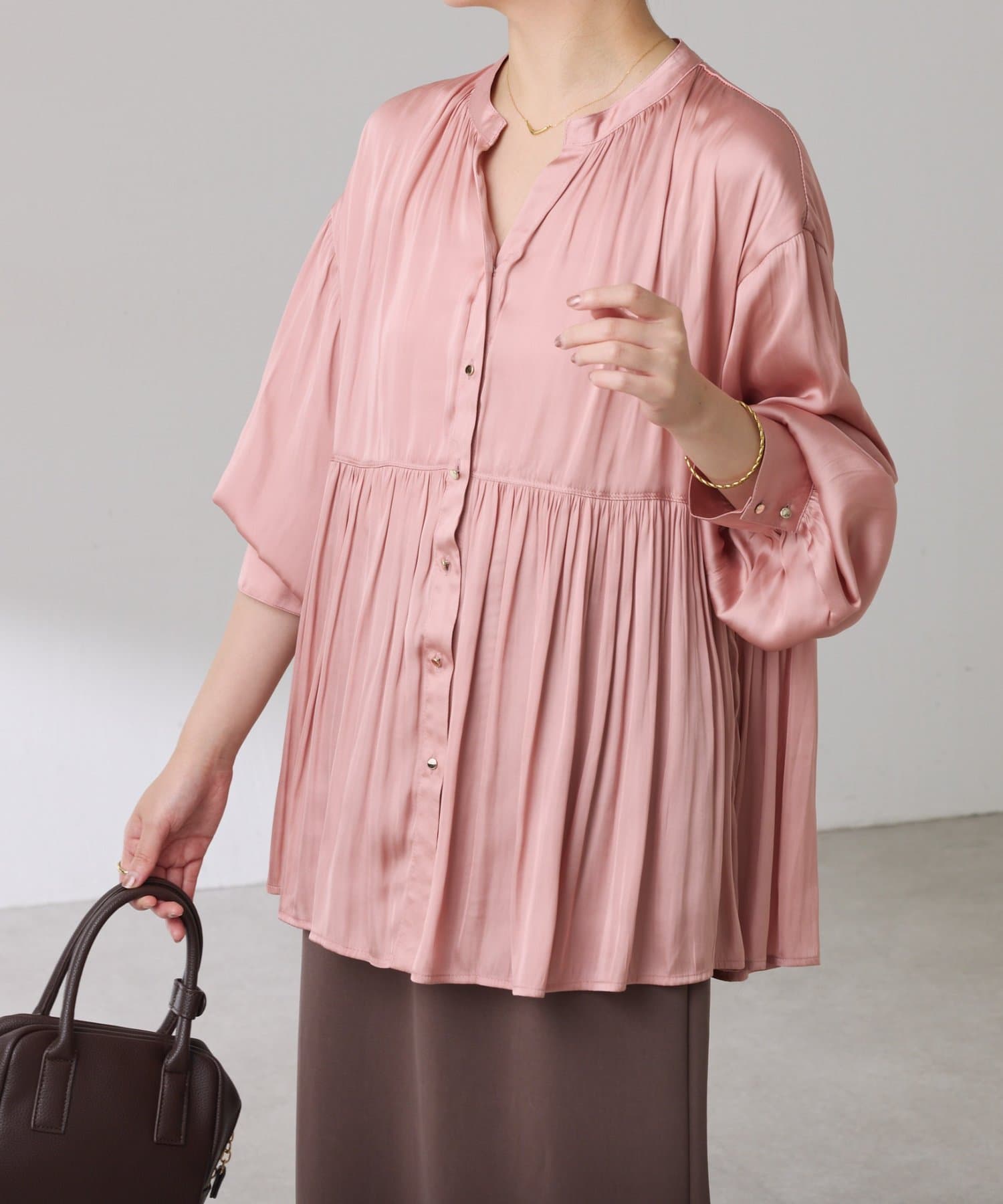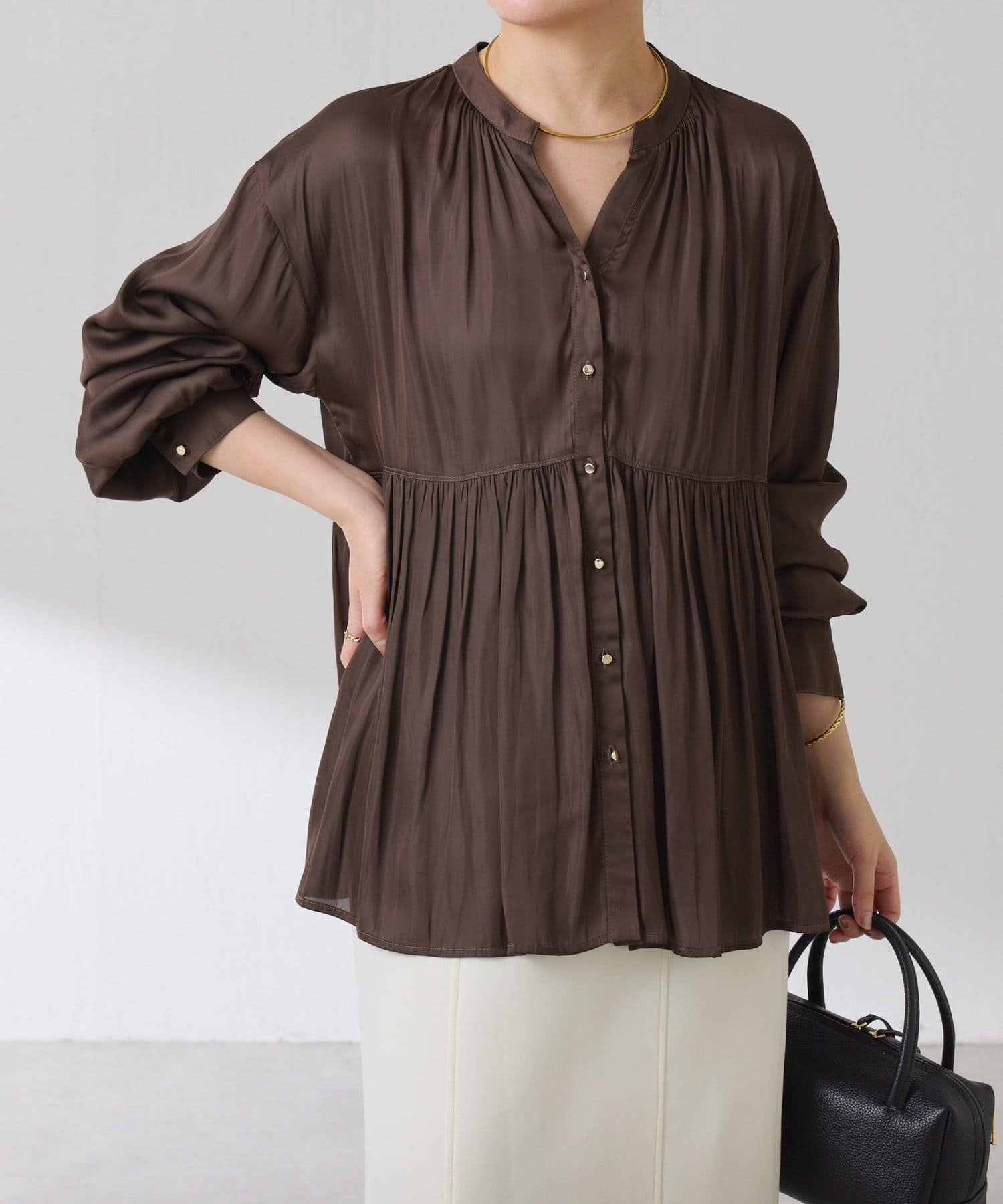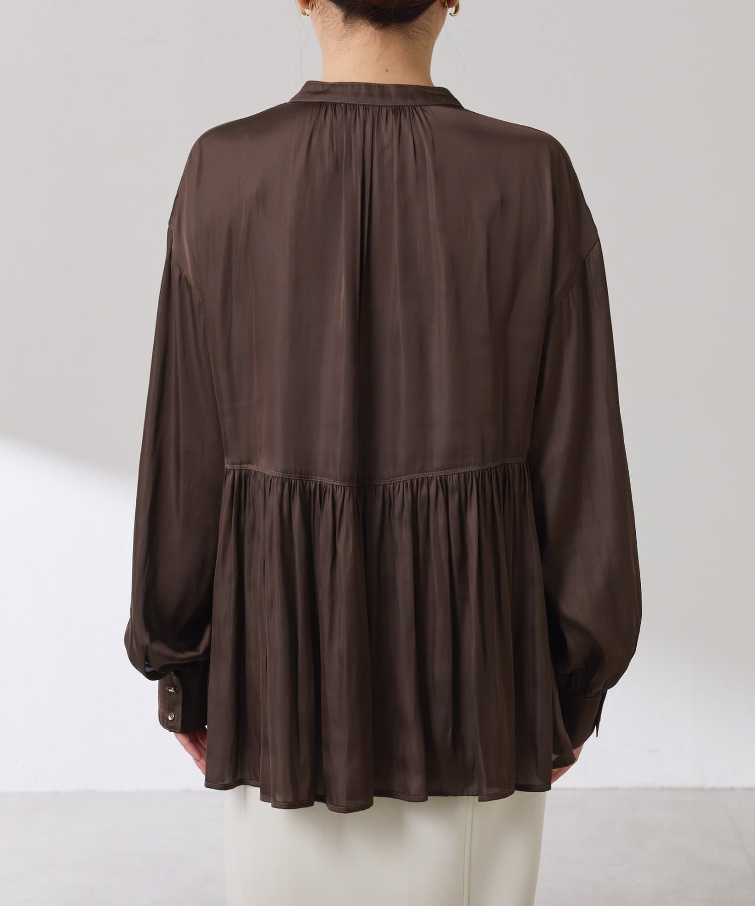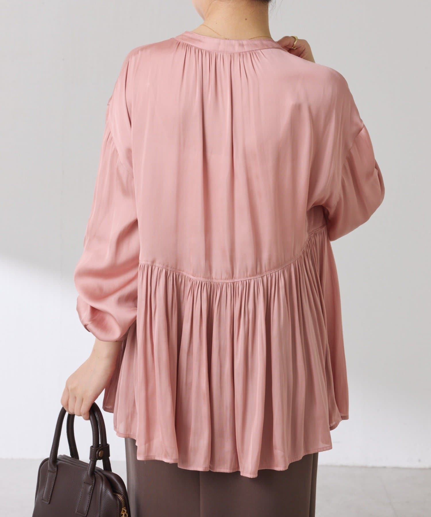 ・繊細な光沢感と柔らかな風合いが魅力のサテンブラウス。