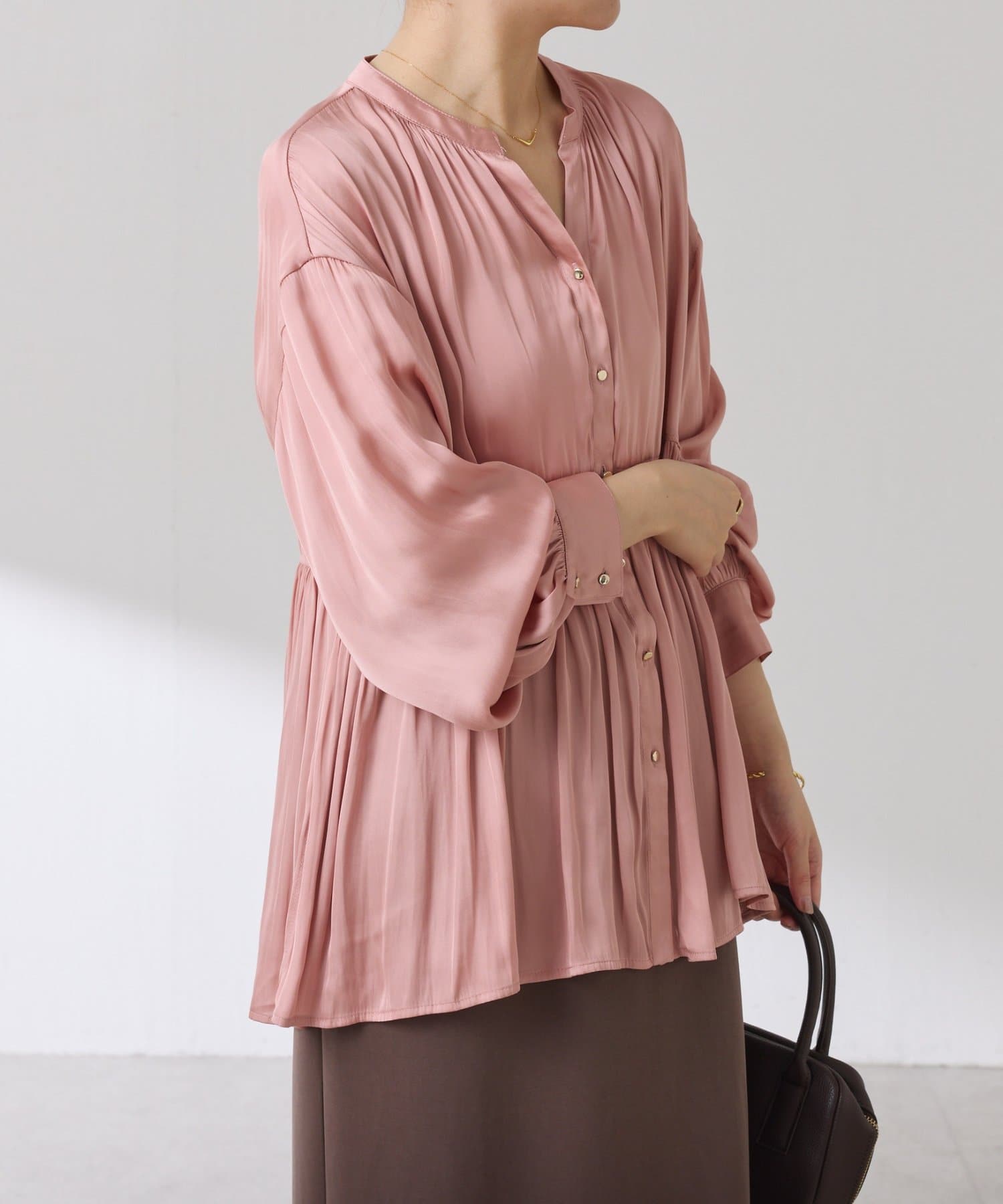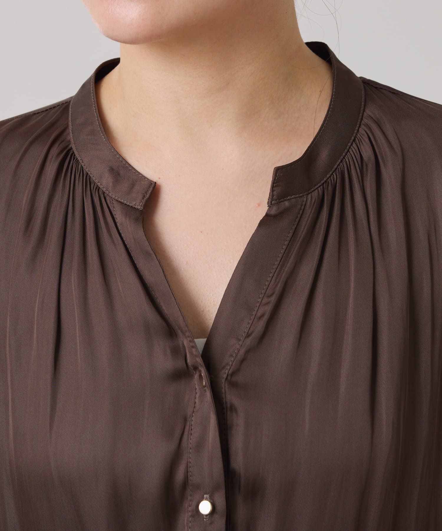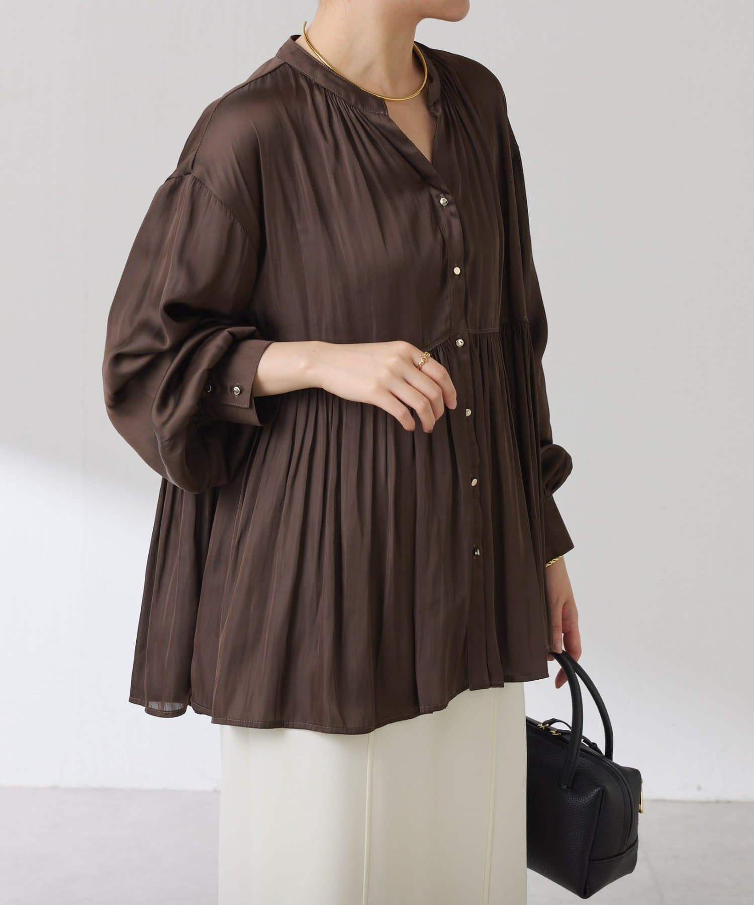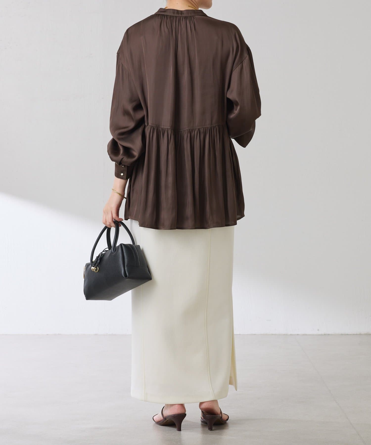・繊細な光沢感と柔らかな風合いが魅力のサテンブラウス。