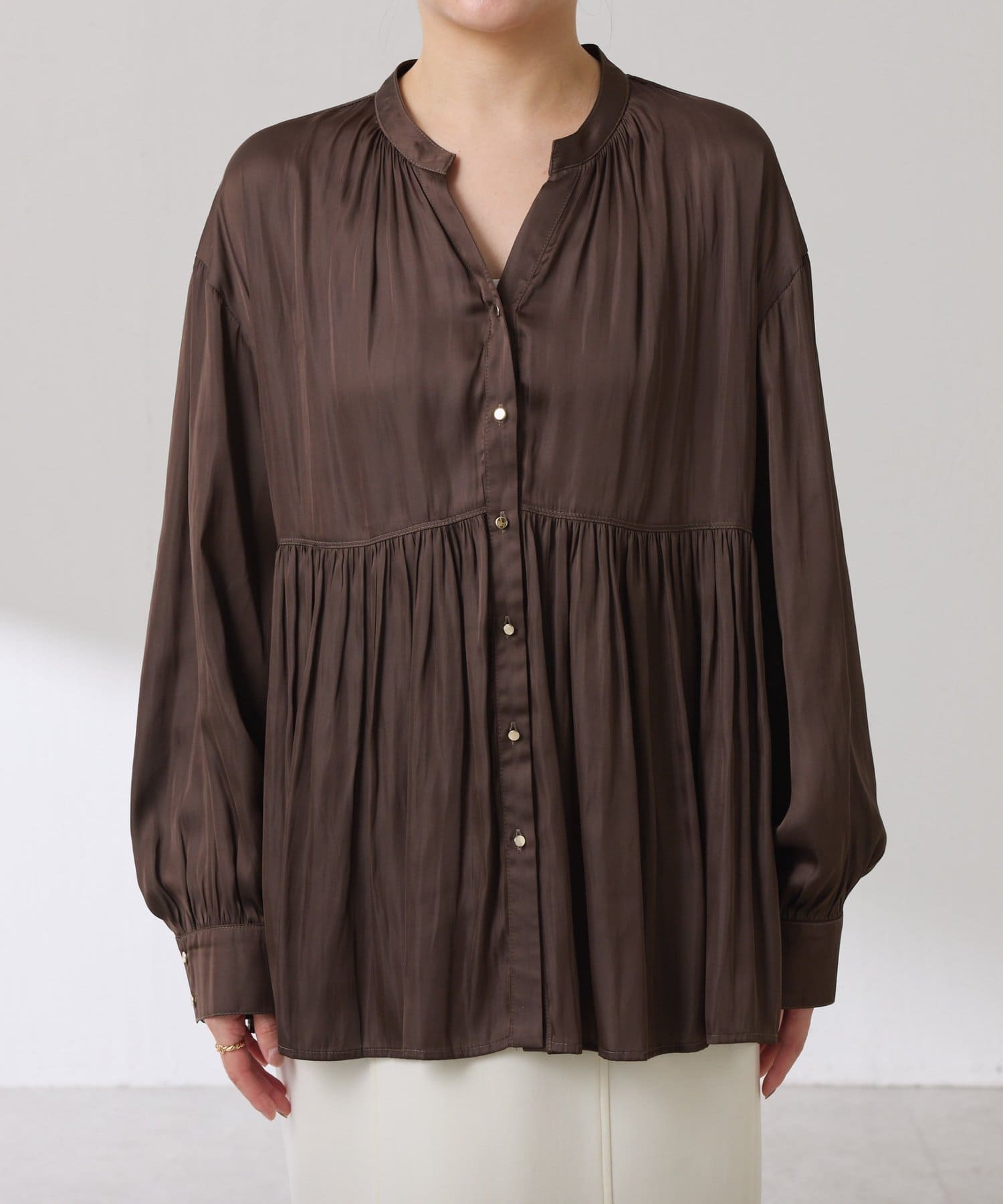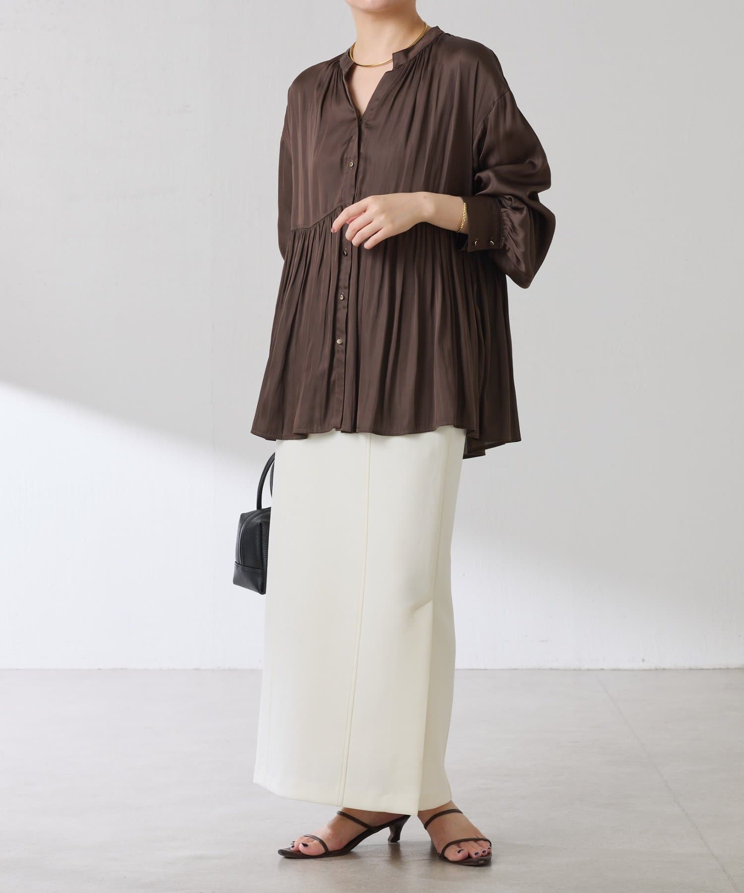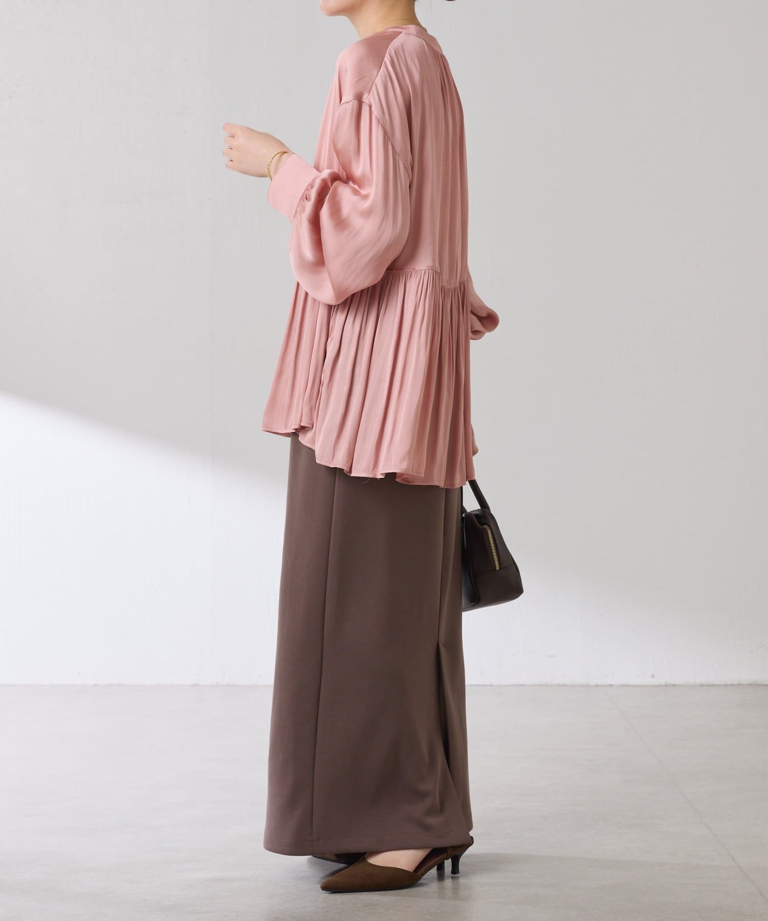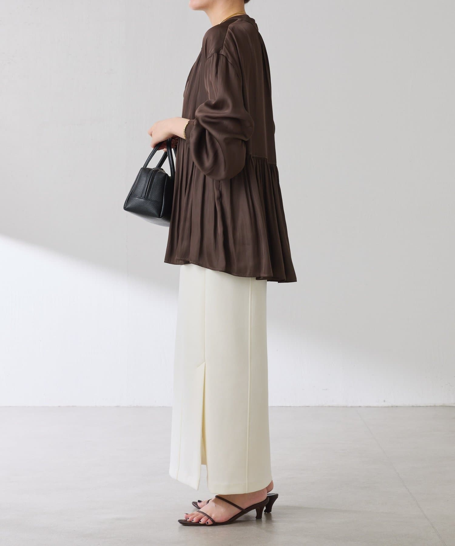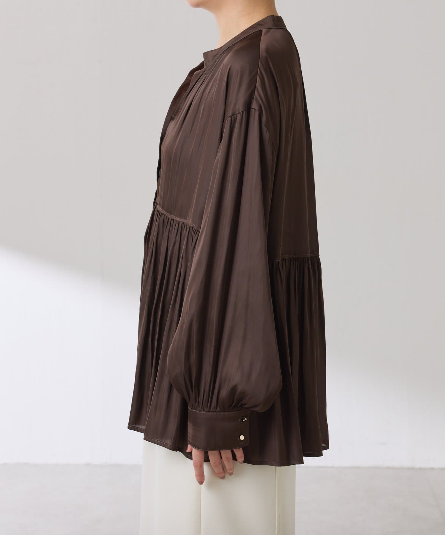 ・繊細な光沢感と柔らかな風合いが魅力のサテンブラウス。