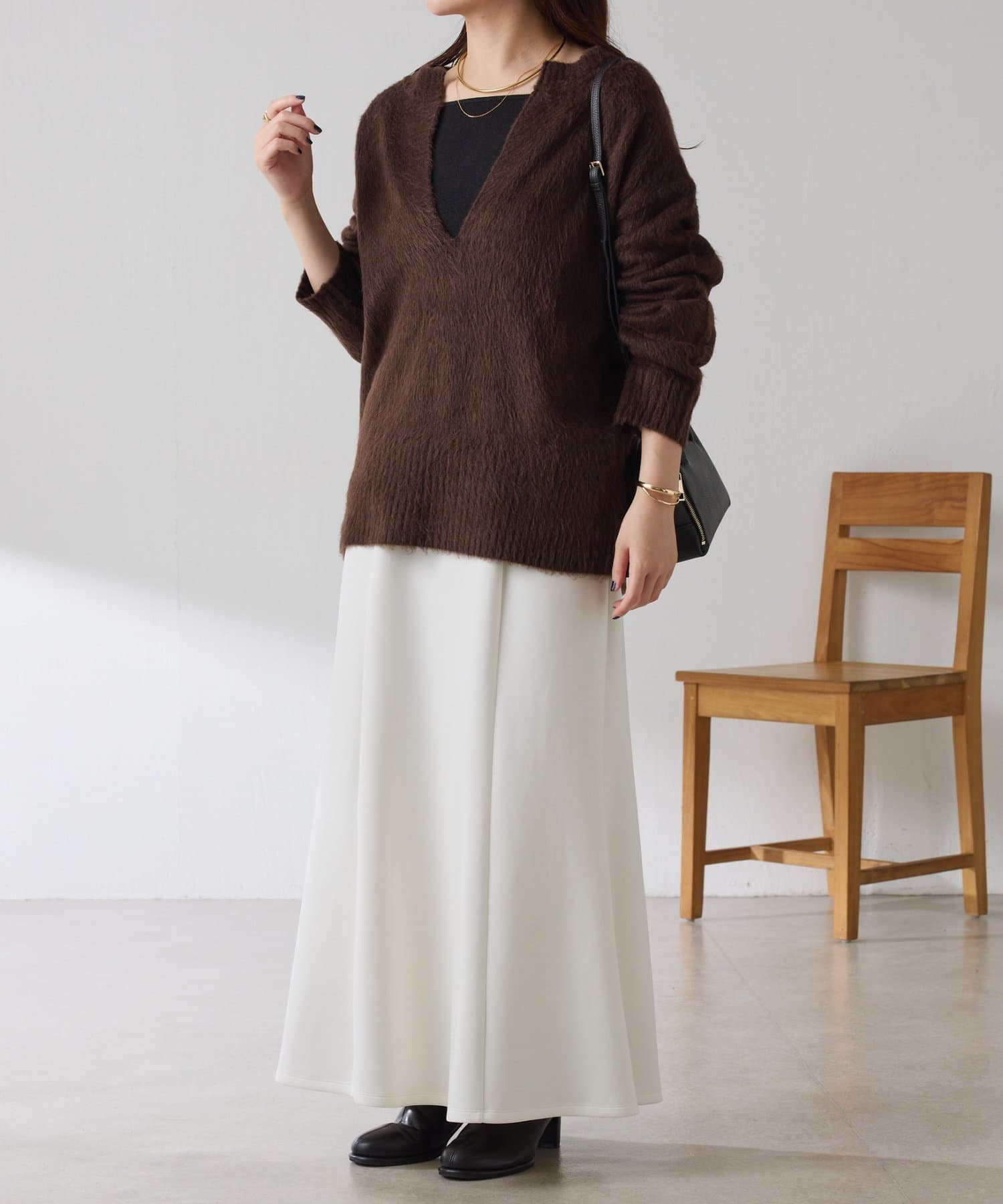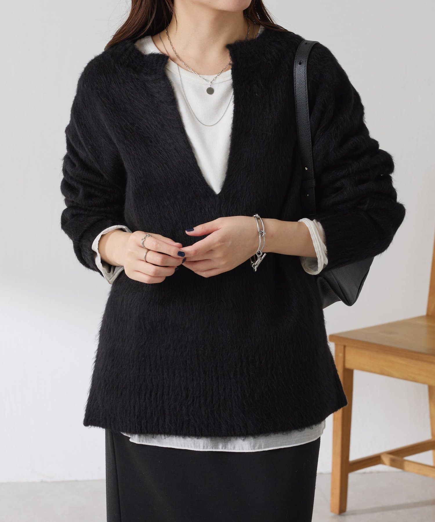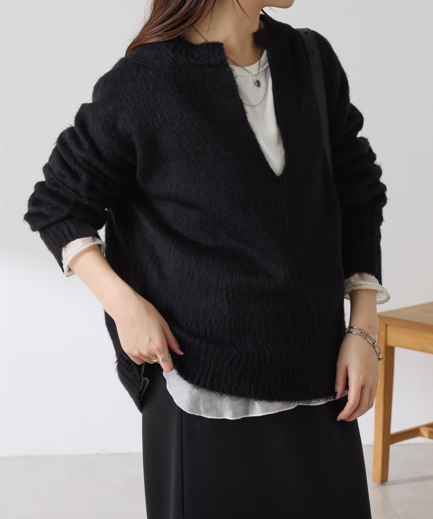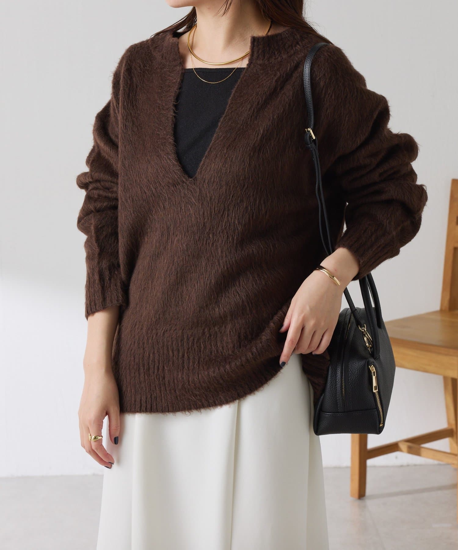 ・とにかく軽いエアリーな糸を使用した深Vニット。着ぶくれ感もなく、ストレスフリーな着心地です。